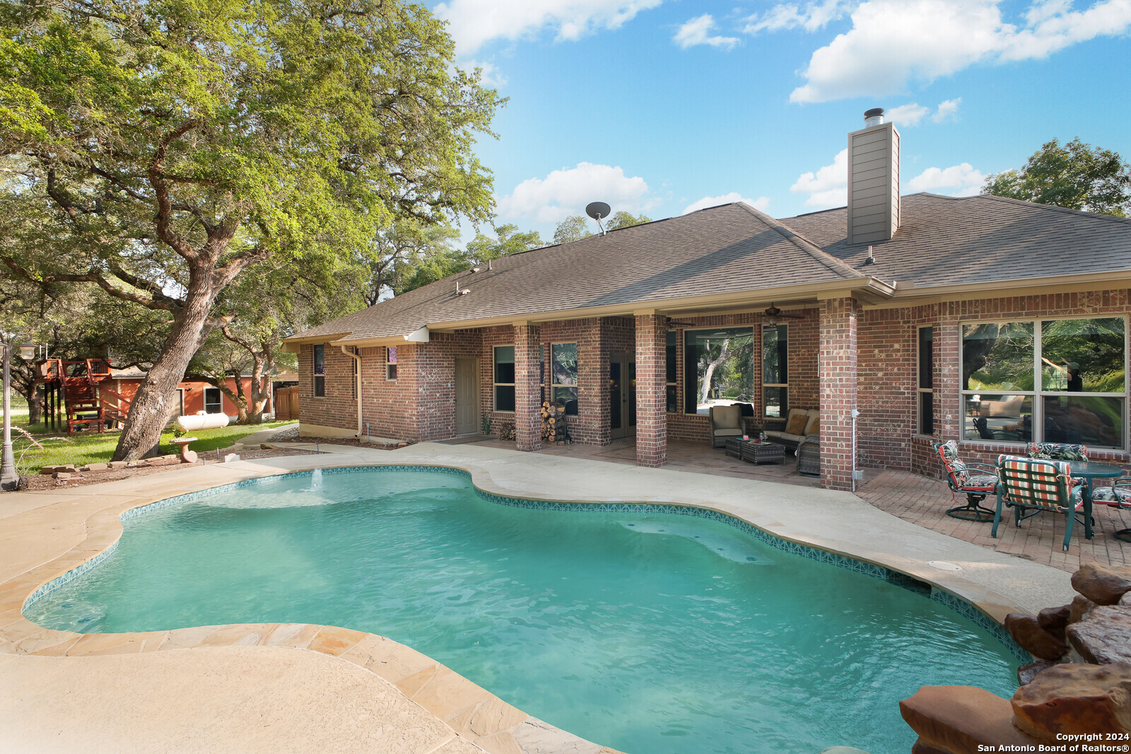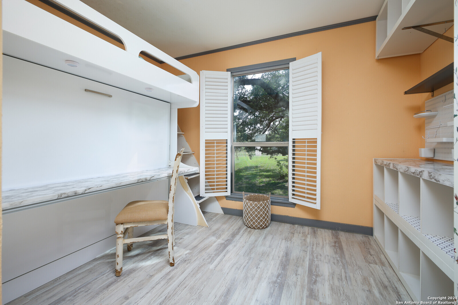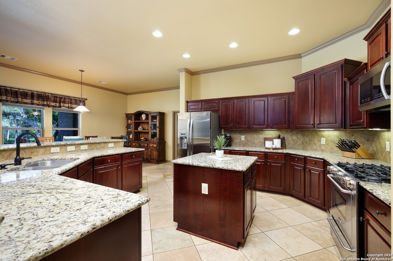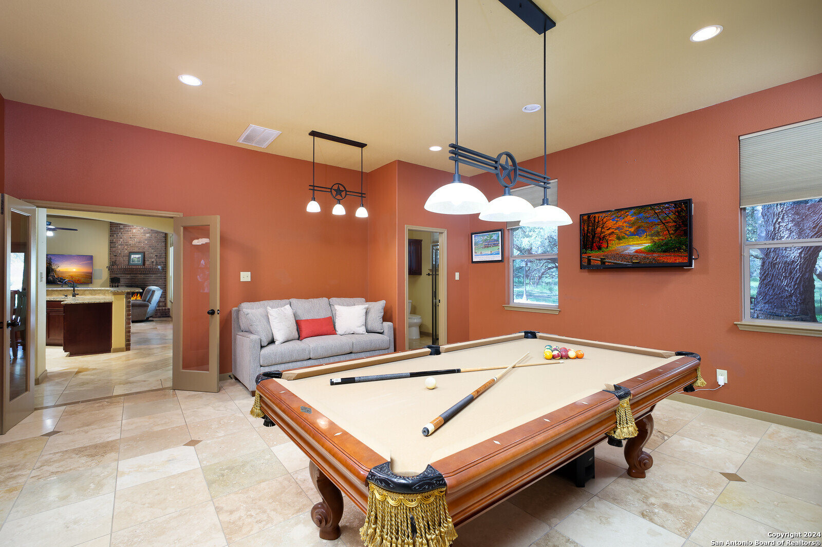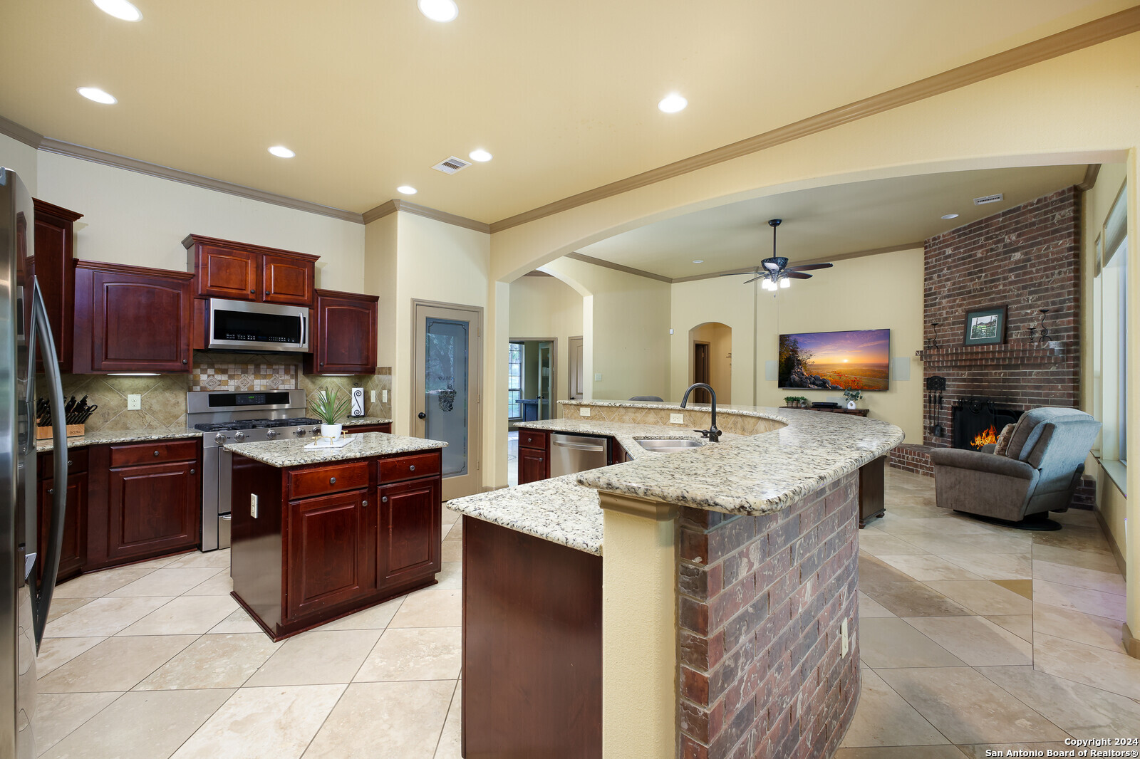 Discover luxury living on a stunning 45-acre ranch estate, perfectly located just moments from downtown Floresville. This exceptional property offers a rare wildlife exemption, making it both easy to maintain and tax-efficient. The custom-built home exudes superior craftsmanship and enduring quality. Step inside to find hand-scraped bamboo flooring, a cozy wood-burning fireplace, and an inviting layout. The gourmet kitchen is a chef's dream, featuring granite countertops, gas cooking, and a spacious walk-i