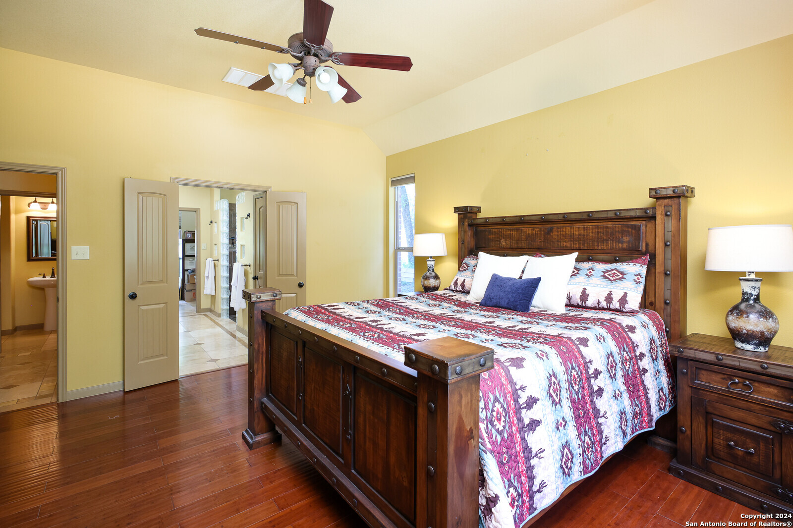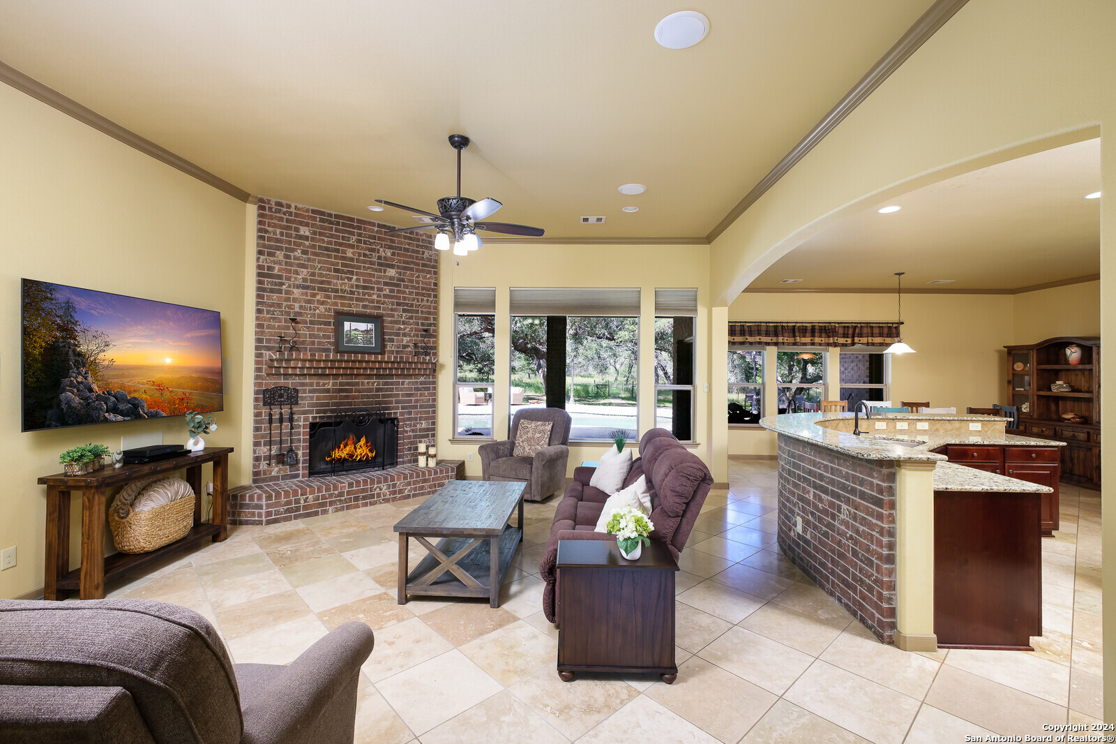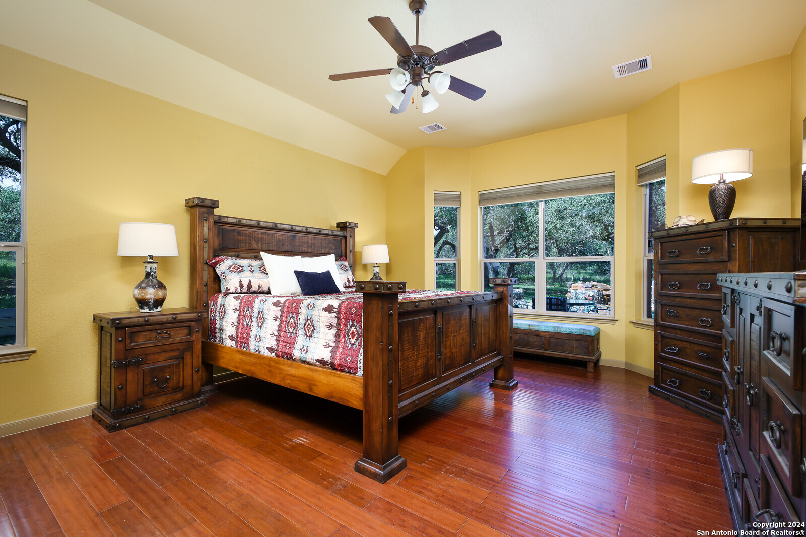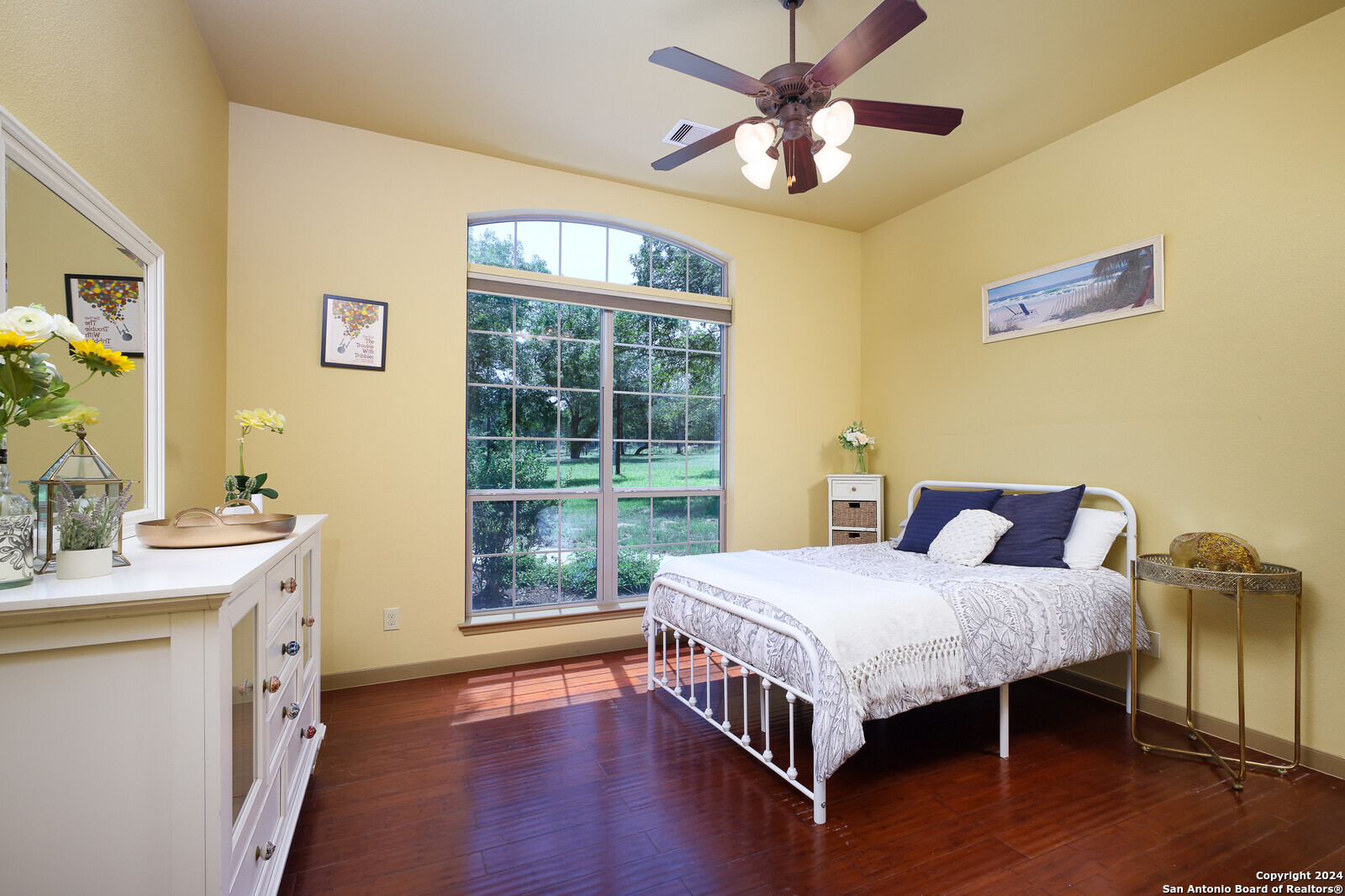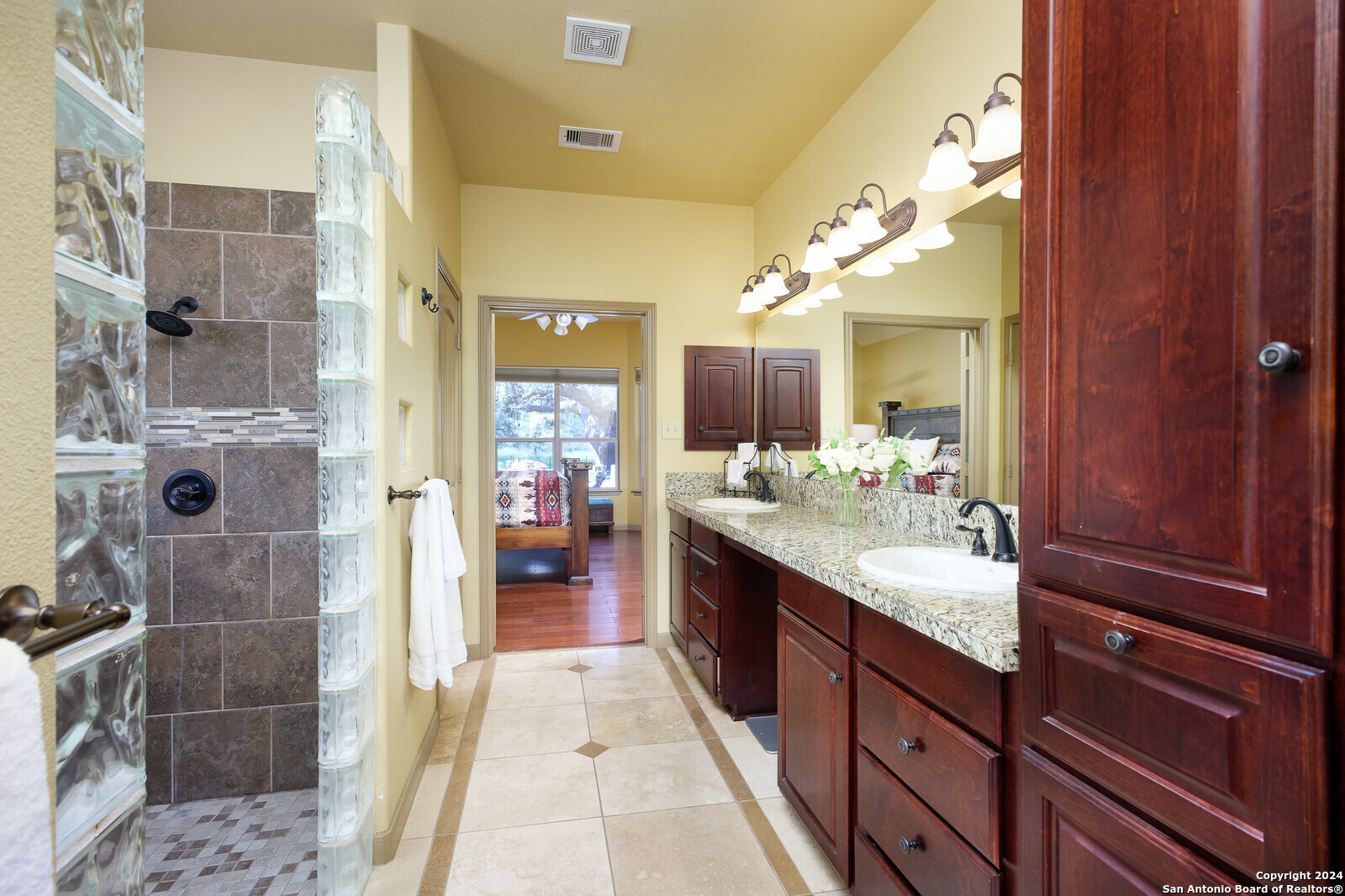 Discover luxury living on a stunning 45-acre ranch estate, perfectly located just moments from downtown Floresville. This exceptional property offers a rare wildlife exemption, making it both easy to maintain and tax-efficient. The custom-built home exudes superior craftsmanship and enduring quality. Step inside to find hand-scraped bamboo flooring, a cozy wood-burning fireplace, and an inviting layout. The gourmet kitchen is a chef's dream, featuring granite countertops, gas cooking, and a spacious walk-i