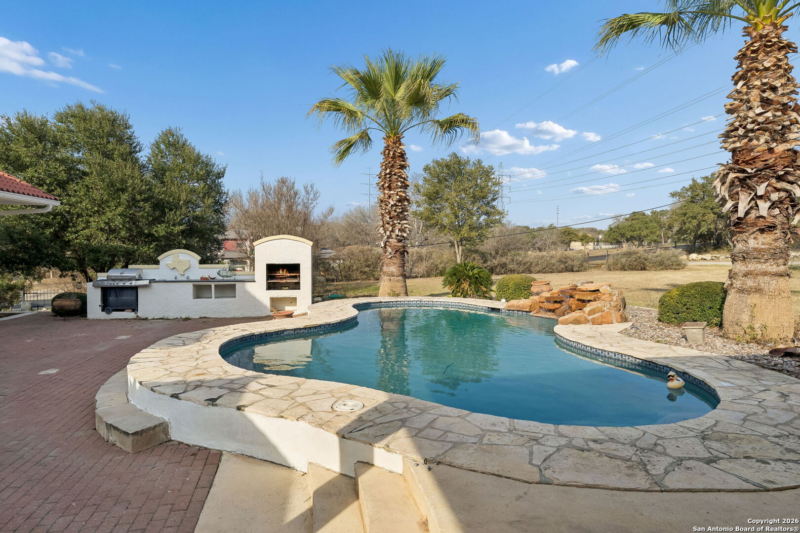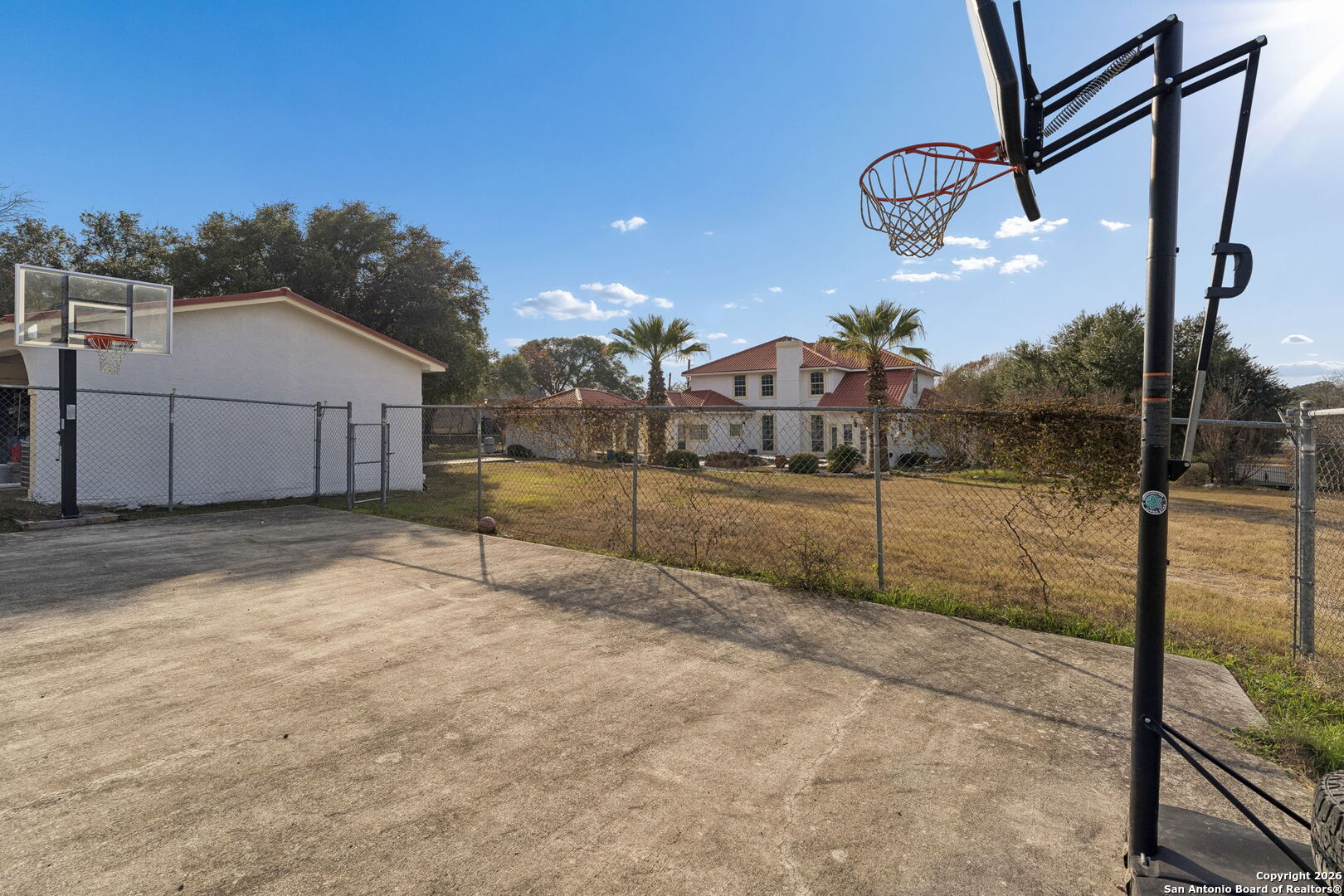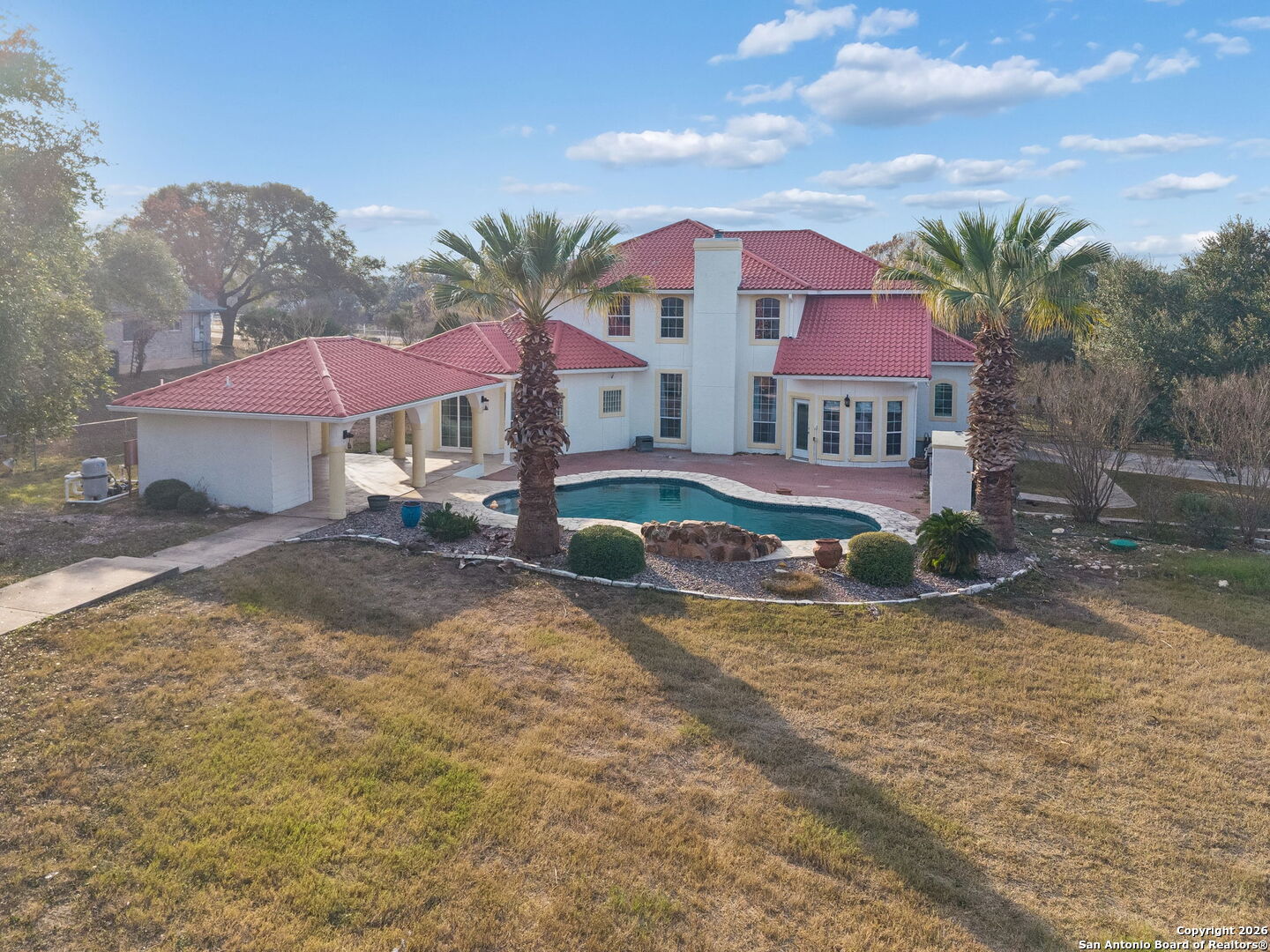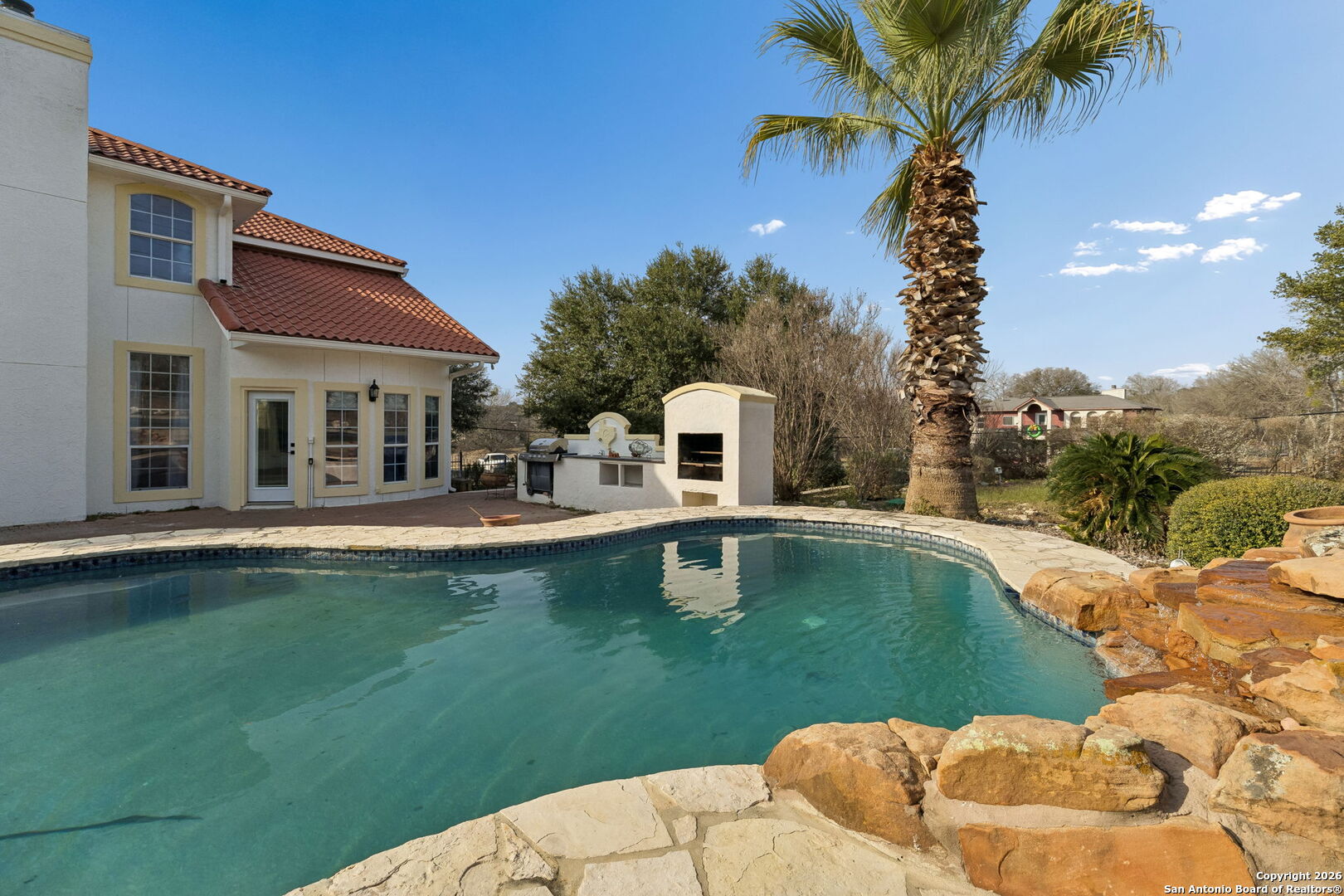Welcome to 3438 Sunnydell Dr, an elegantly refreshed two-story estate set on a private 1.20-acre corner lot with a circular driveway and multiple points of entry. This exceptional property offers a peaceful, country-like atmosphere while remaining conveniently located within the city, with no HOA and easy access to Loop 1604 and Highway 151. The home has been thoughtfully updated with fresh interior and exterior paint, all new lighting, ceiling fans, faucets, toilets, shower fixtures, door hardware, baseboards, and a striking iron front door. Tall ceilings enhance the open feel, while walk-in closets, a beautiful fireplace, and a wet bar provide both comfort and functionality. The layout includes a private study and a spacious primary suite located on the first floor. A durable metal Spanish-style roof adds architectural character and long-term value. Designed for both everyday living and entertaining, the outdoor space features an underground pool, basketball court, gazebo, and a built-in outdoor kitchen with BBQ and sink, along with an irrigation system, water softener, and mature palm trees that create a resort-style backyard. The property offers five bedrooms total, a two-car garage, and a separate back building that can be used as a guest suite, workshop, or flexible space. Conveniently located near shopping, grocery stores, restaurants, hospitals, and entertainment such as Casa Blanca Theatre and The Shops at Alamo Ranch, this home delivers the rare combination of accessibility and privacy-offering a true country living experience without sacrificing city conveniences. This unique property blends luxury, space, and versatility in a truly rare setting.