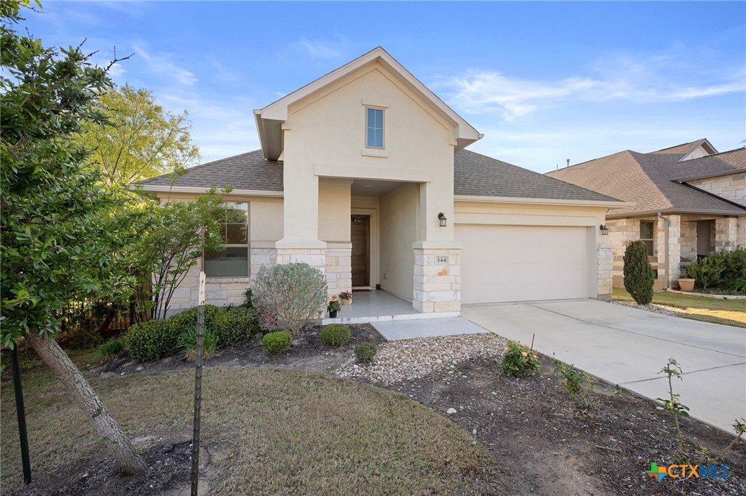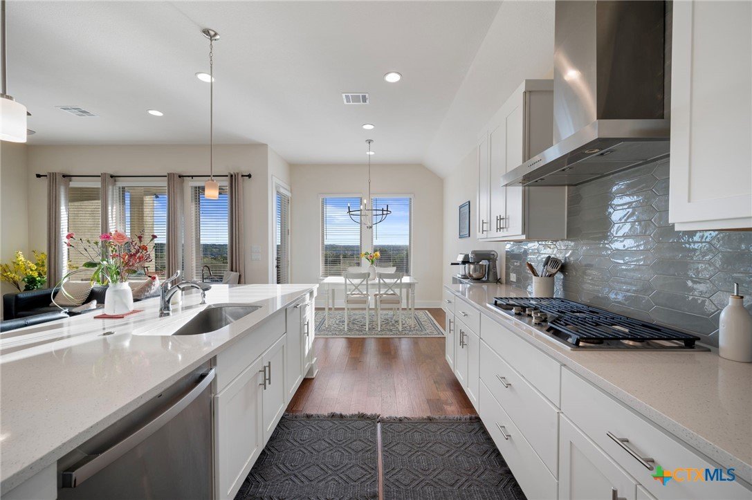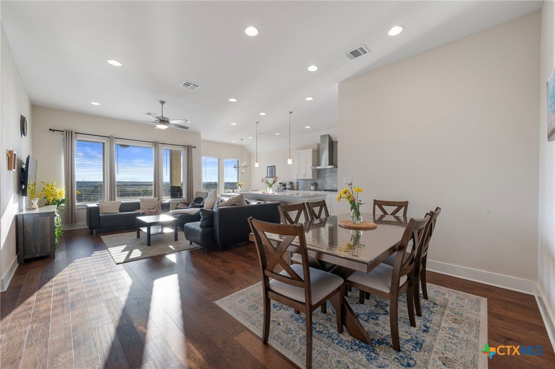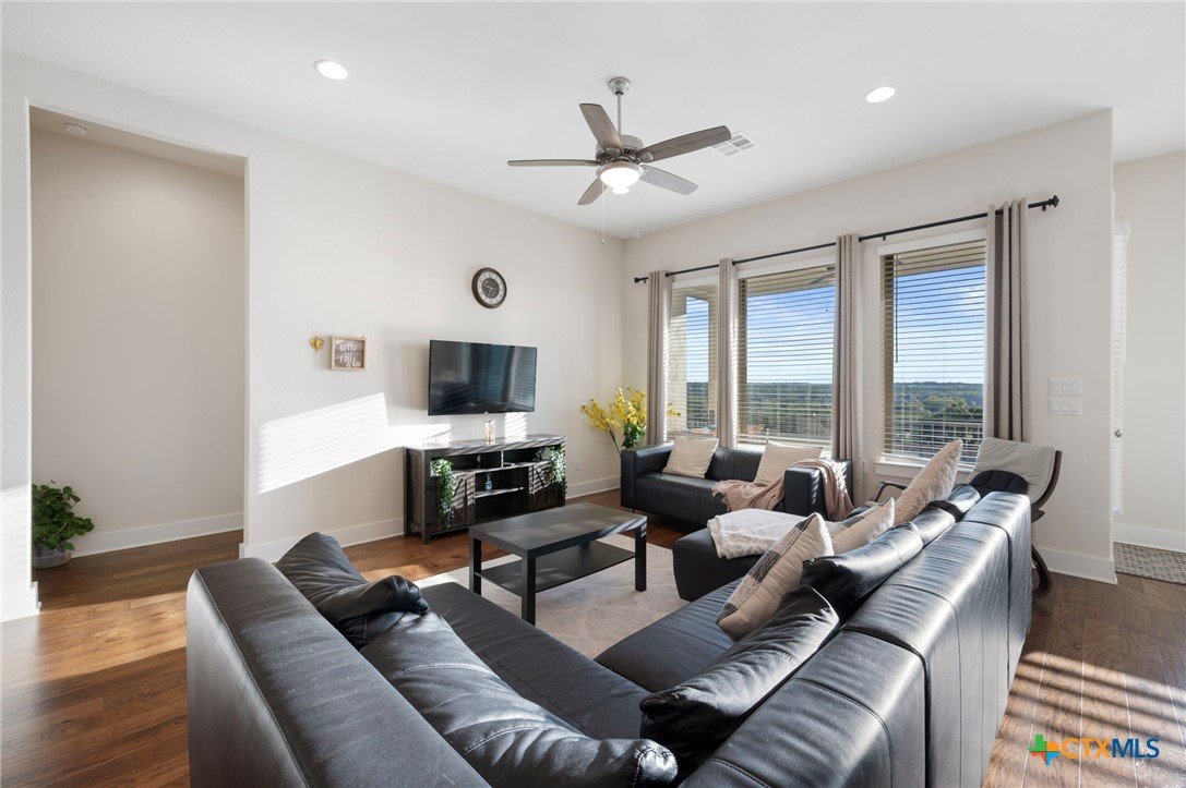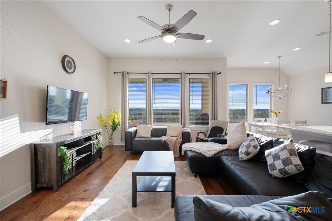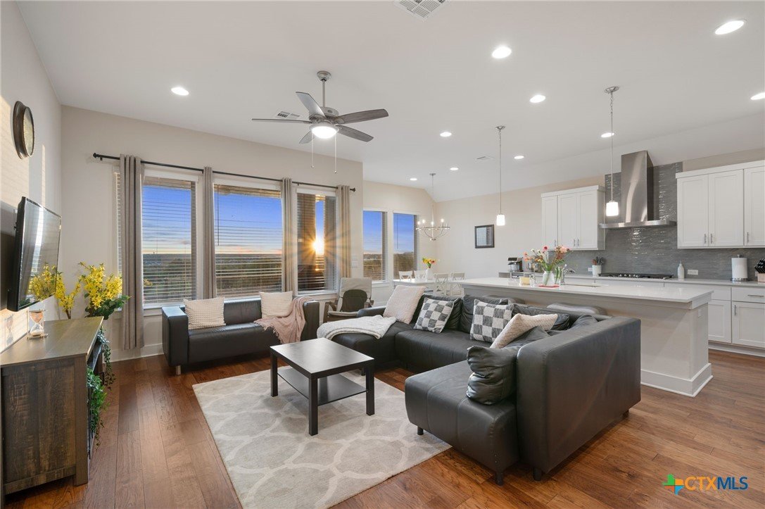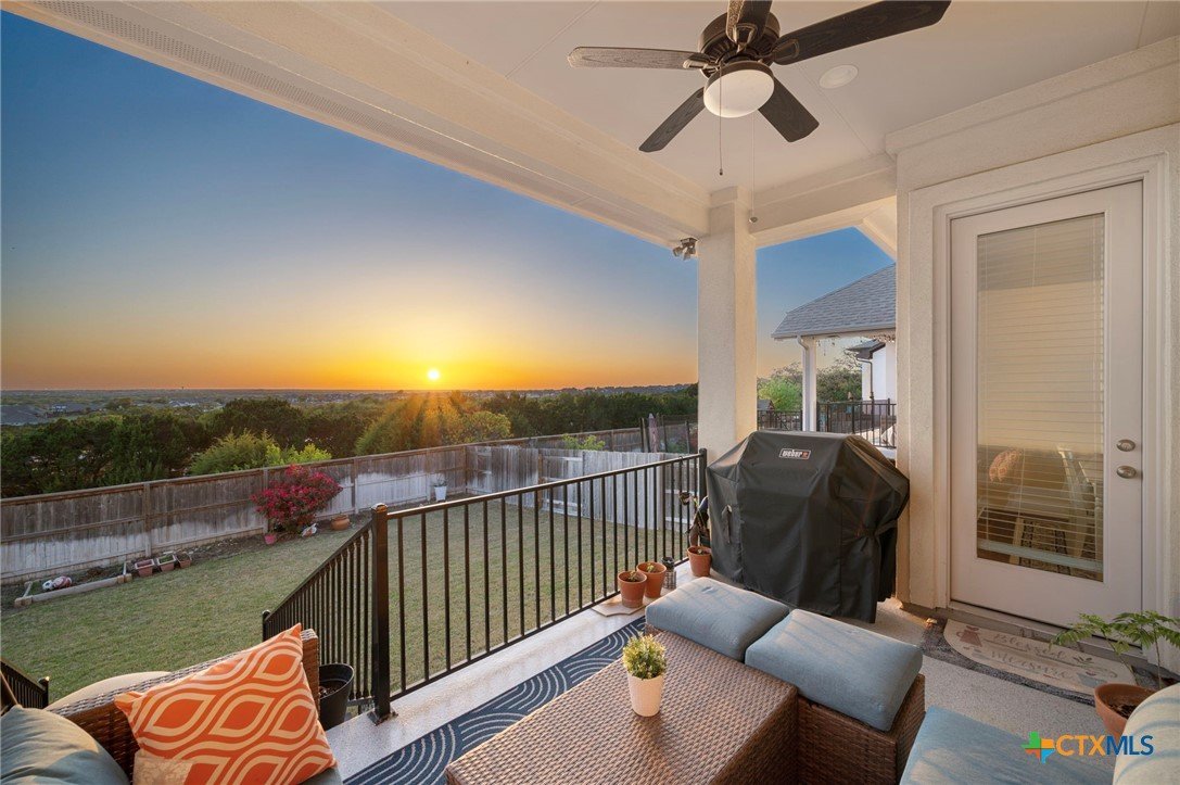 This beautifully maintained single-story home features 3 bedrooms, 2.5 baths, and a dedicated office, all set against a stunning backdrop of Hill Country and sunset views. An open floor plan with soaring ceilings and large windows fills the home with natural light, creating an inviting and airy atmosphere throughout. The gourmet kitchen boasts upgraded white cabinetry, sleek quartz countertops, and flows seamlessly into the living and breakfast areas, where you can enjoy breathtaking views from nearly every angle. Gorgeous wood flooring extends through the entire home, including all bedrooms and closets, adding warmth and elegance. The spacious primary suite offers a serene retreat, while the additional bedrooms and office provide flexibility and comfort. Step outside to a large backyard with no rear neighbors and take in the unobstructed views or explore the nearby scenic walking trails. Additional highlights include a 2.5-car garage with metallic epoxy flooring, a whole-house water softener and reverse osmosis system, and a separate, roomy laundry area. This home is a rare find combining privacy, upgrades, and natural beauty in a highly desirable community.