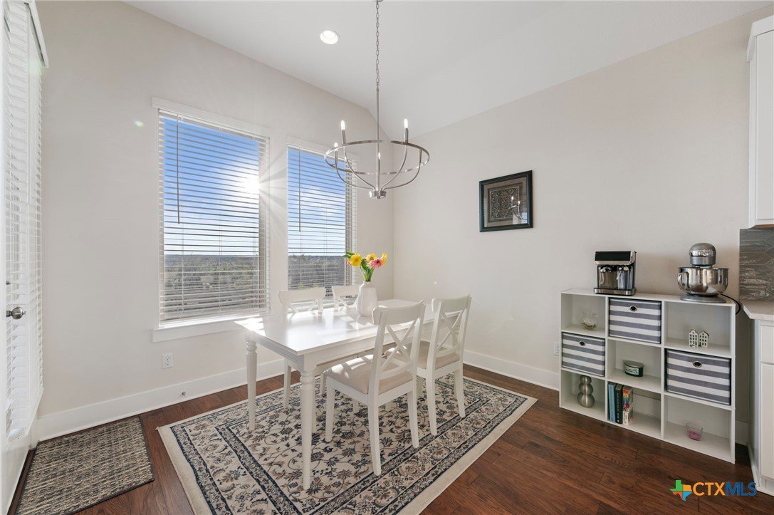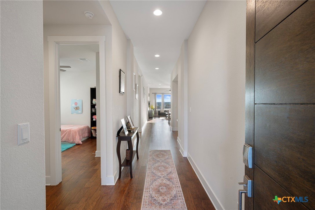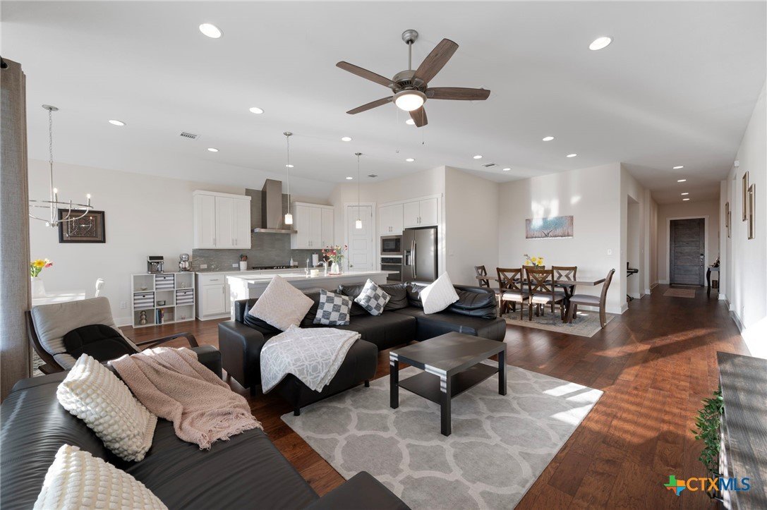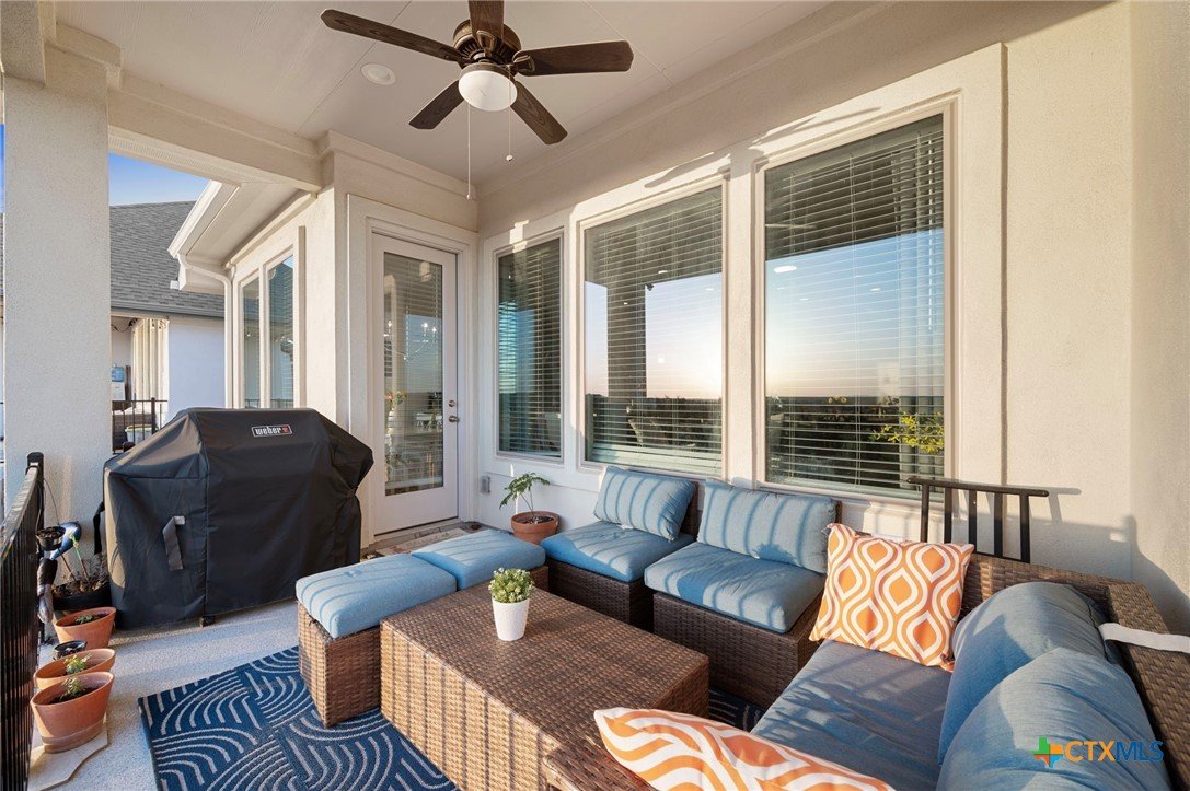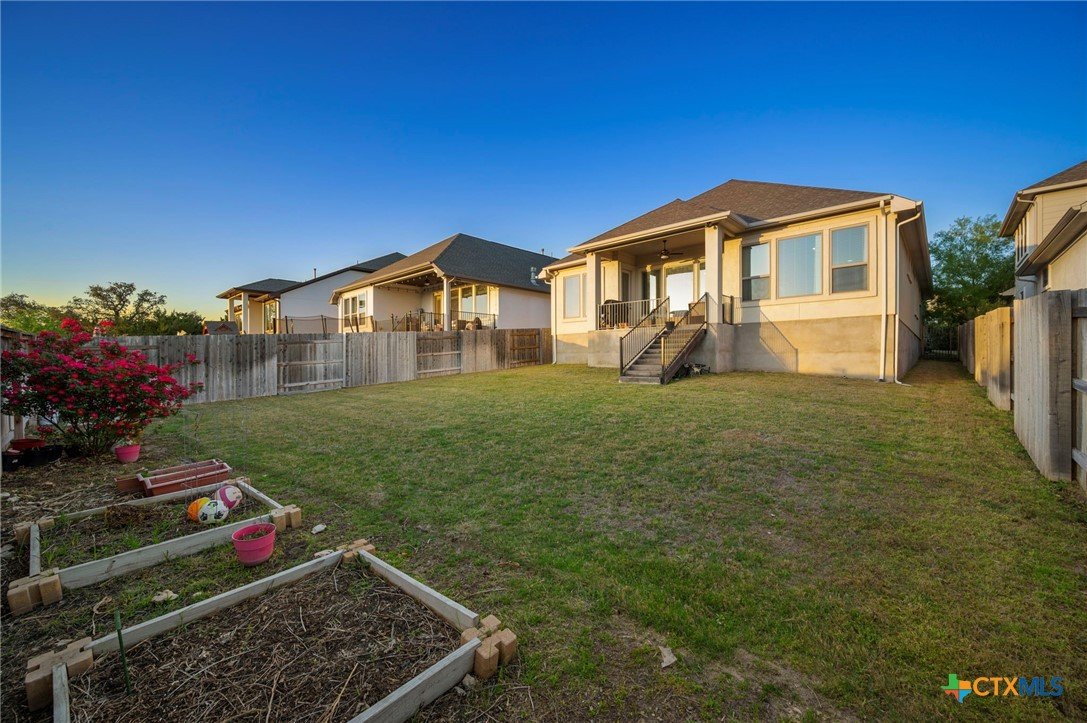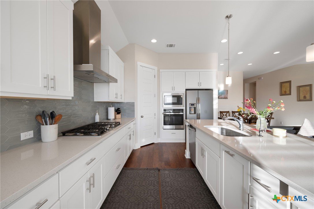 This beautifully maintained single-story home features 3 bedrooms, 2.5 baths, and a dedicated office, all set against a stunning backdrop of Hill Country and sunset views. An open floor plan with soaring ceilings and large windows fills the home with natural light, creating an inviting and airy atmosphere throughout. The gourmet kitchen boasts upgraded white cabinetry, sleek quartz countertops, and flows seamlessly into the living and breakfast areas, where you can enjoy breathtaking views from nearly every angle. Gorgeous wood flooring extends through the entire home, including all bedrooms and closets, adding warmth and elegance. The spacious primary suite offers a serene retreat, while the additional bedrooms and office provide flexibility and comfort. Step outside to a large backyard with no rear neighbors and take in the unobstructed views or explore the nearby scenic walking trails. Additional highlights include a 2.5-car garage with metallic epoxy flooring, a whole-house water softener and reverse osmosis system, and a separate, roomy laundry area. This home is a rare find combining privacy, upgrades, and natural beauty in a highly desirable community.