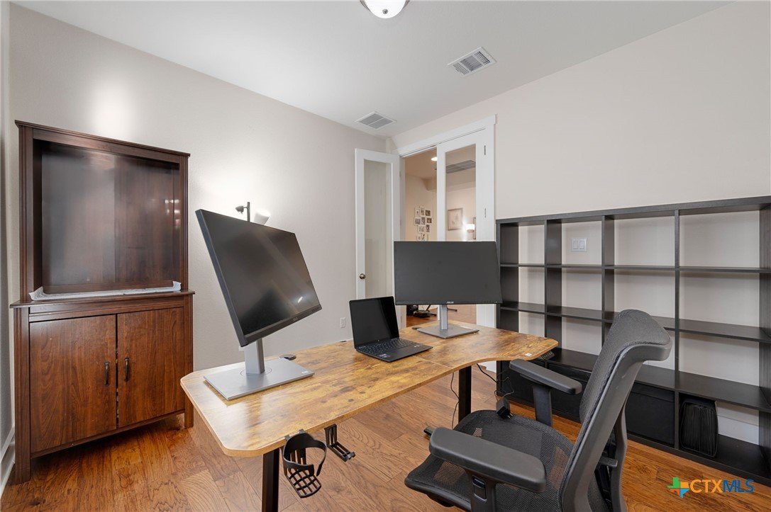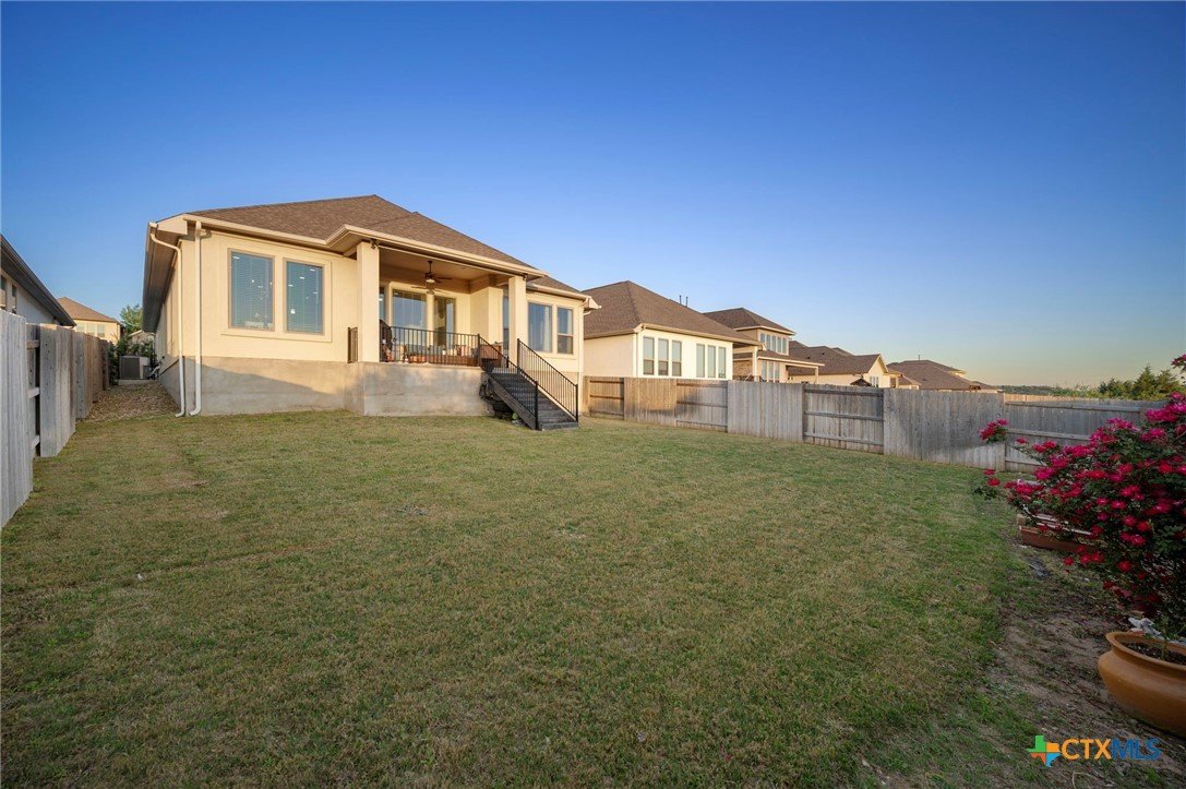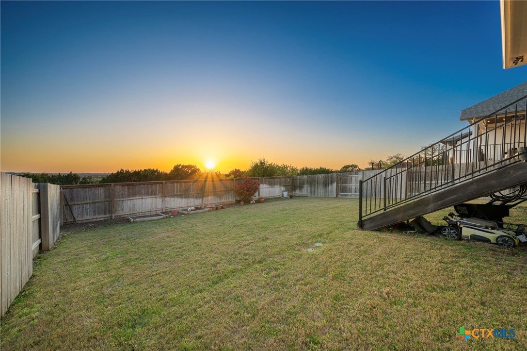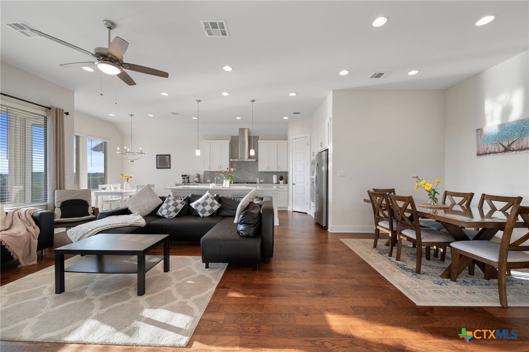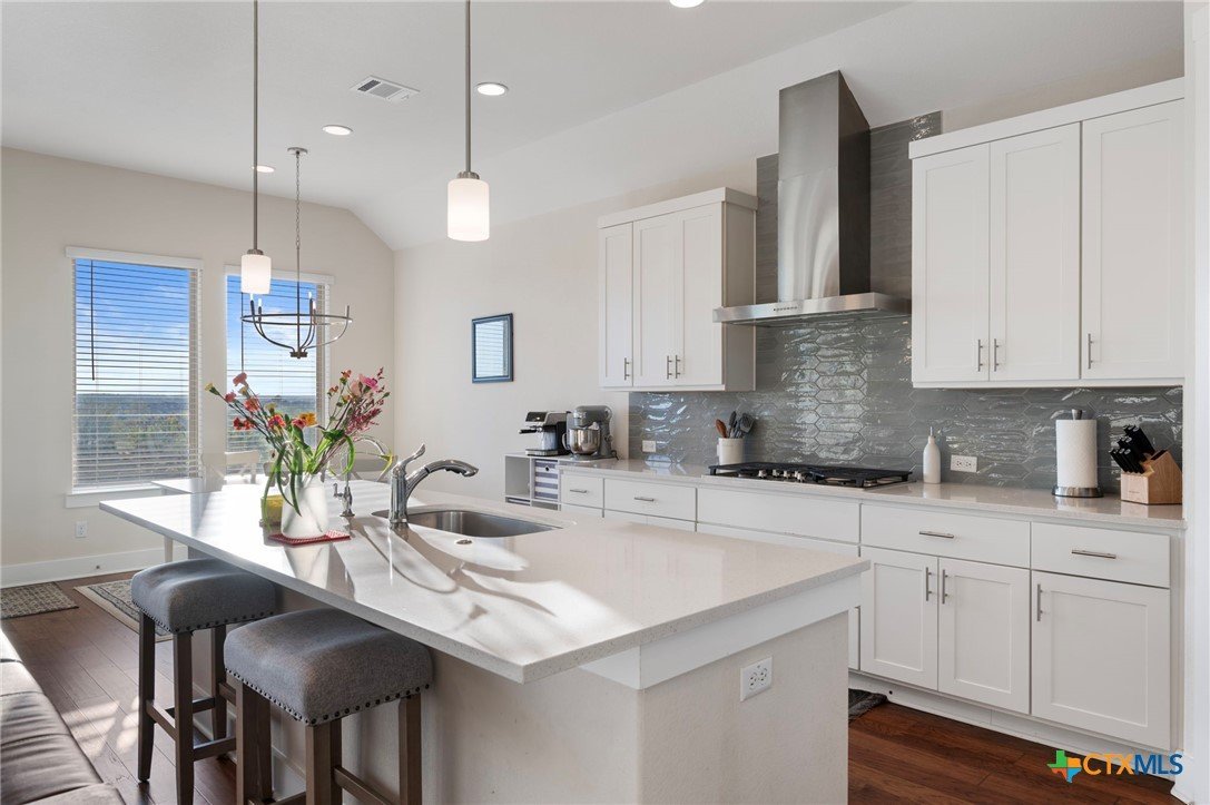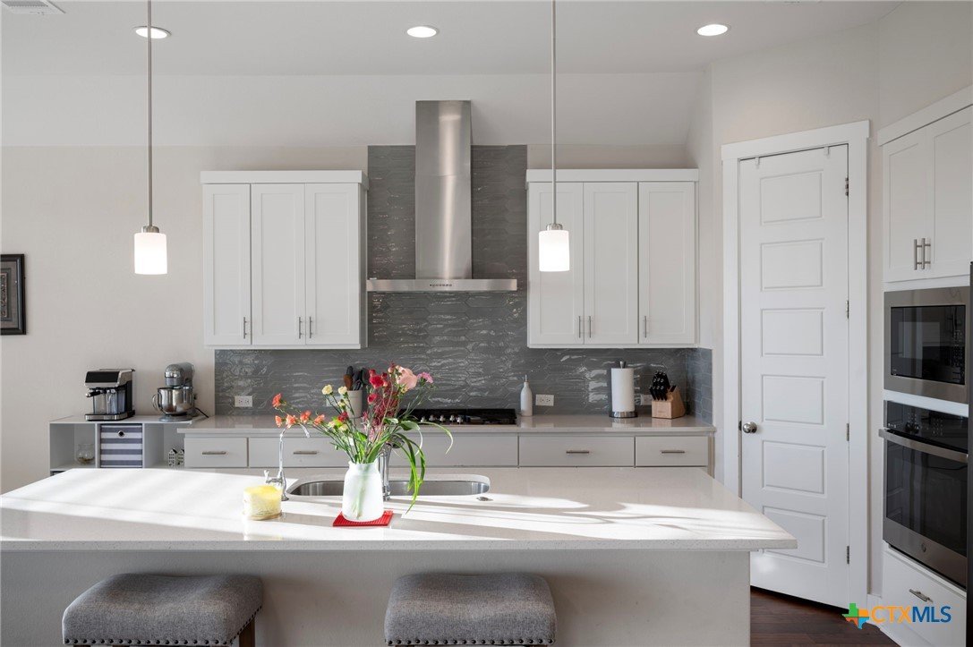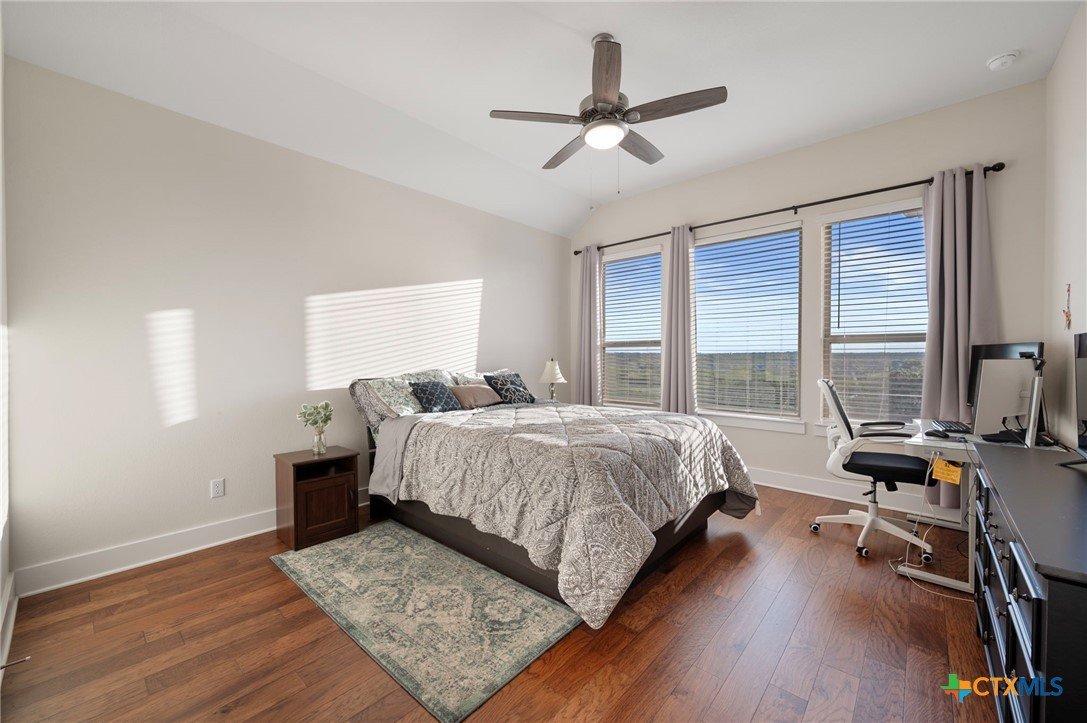 This beautifully maintained single-story home features 3 bedrooms, 2.5 baths, and a dedicated office, all set against a stunning backdrop of Hill Country and sunset views. An open floor plan with soaring ceilings and large windows fills the home with natural light, creating an inviting and airy atmosphere throughout. The gourmet kitchen boasts upgraded white cabinetry, sleek quartz countertops, and flows seamlessly into the living and breakfast areas, where you can enjoy breathtaking views from nearly every angle. Gorgeous wood flooring extends through the entire home, including all bedrooms and closets, adding warmth and elegance. The spacious primary suite offers a serene retreat, while the additional bedrooms and office provide flexibility and comfort. Step outside to a large backyard with no rear neighbors and take in the unobstructed views or explore the nearby scenic walking trails. Additional highlights include a 2.5-car garage with metallic epoxy flooring, a whole-house water softener and reverse osmosis system, and a separate, roomy laundry area. This home is a rare find combining privacy, upgrades, and natural beauty in a highly desirable community.