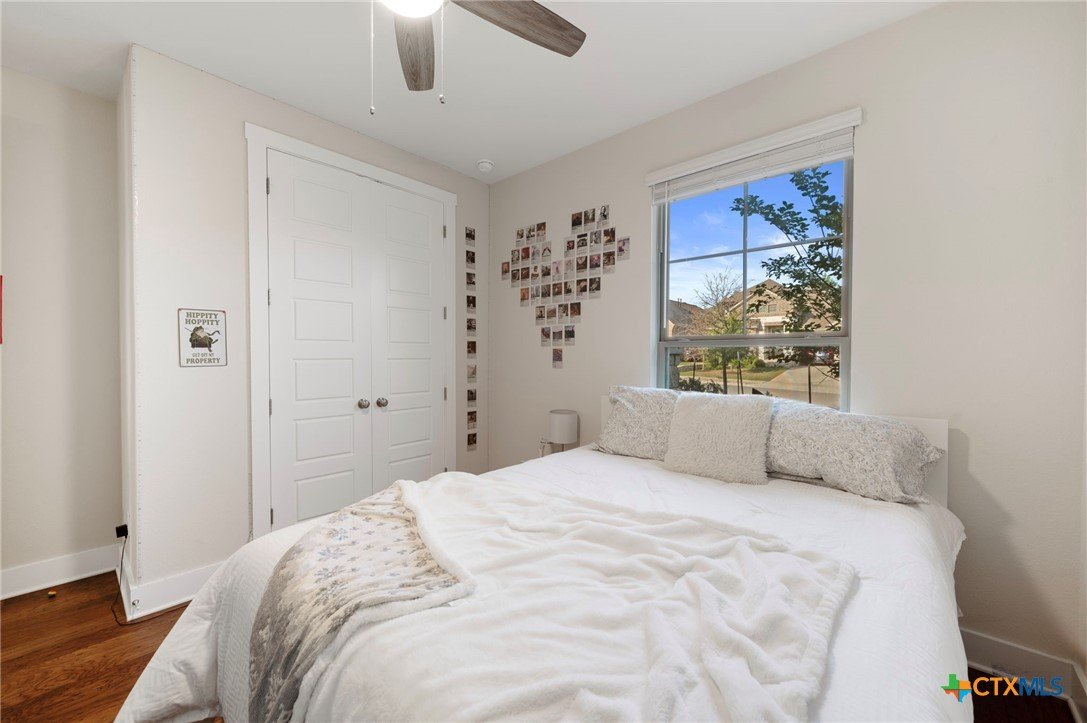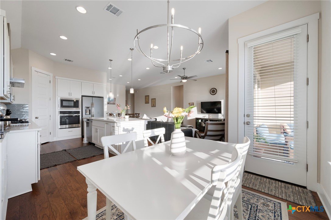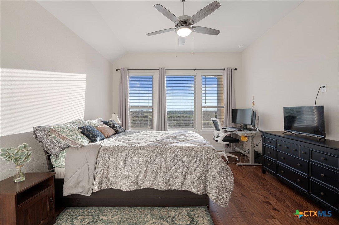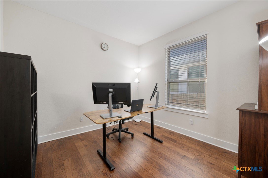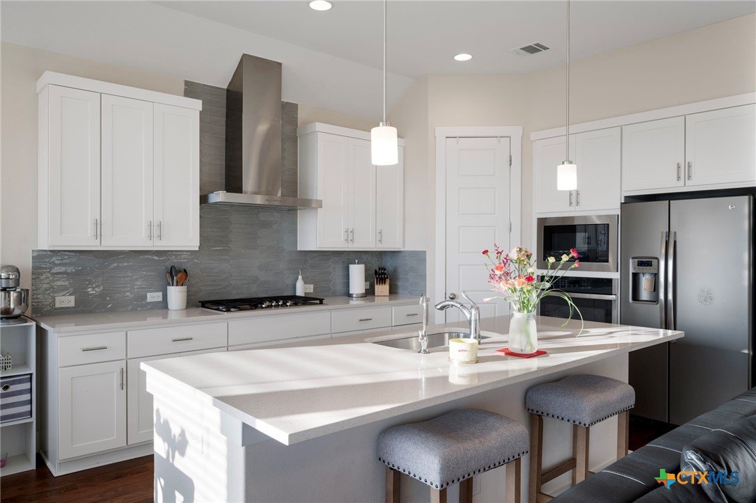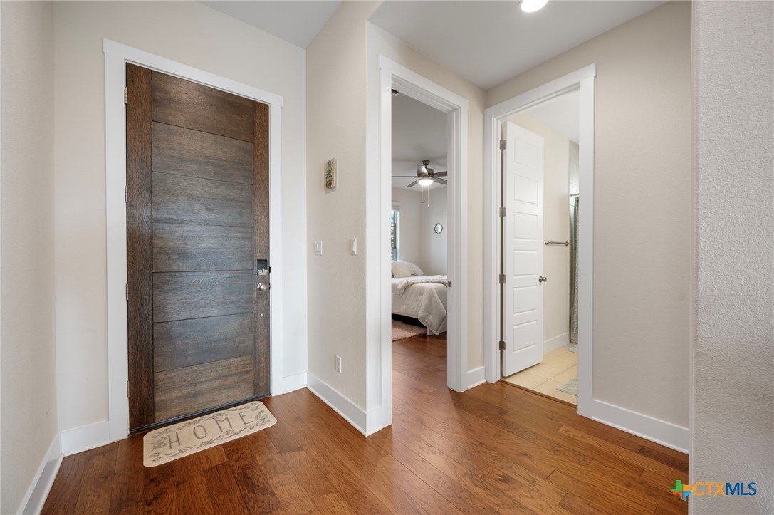 This beautifully maintained single-story home features 3 bedrooms, 2.5 baths, and a dedicated office, all set against a stunning backdrop of Hill Country and sunset views. An open floor plan with soaring ceilings and large windows fills the home with natural light, creating an inviting and airy atmosphere throughout. The gourmet kitchen boasts upgraded white cabinetry, sleek quartz countertops, and flows seamlessly into the living and breakfast areas, where you can enjoy breathtaking views from nearly every angle. Gorgeous wood flooring extends through the entire home, including all bedrooms and closets, adding warmth and elegance. The spacious primary suite offers a serene retreat, while the additional bedrooms and office provide flexibility and comfort. Step outside to a large backyard with no rear neighbors and take in the unobstructed views or explore the nearby scenic walking trails. Additional highlights include a 2.5-car garage with metallic epoxy flooring, a whole-house water softener and reverse osmosis system, and a separate, roomy laundry area. This home is a rare find combining privacy, upgrades, and natural beauty in a highly desirable community.
