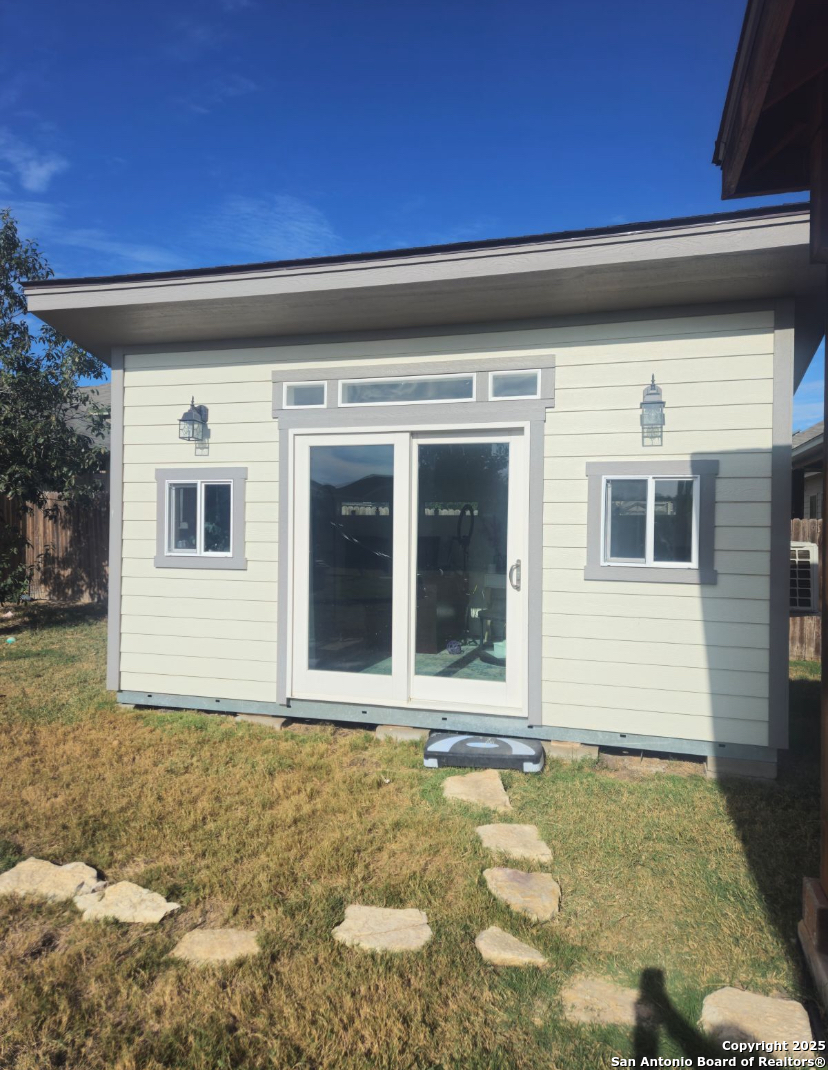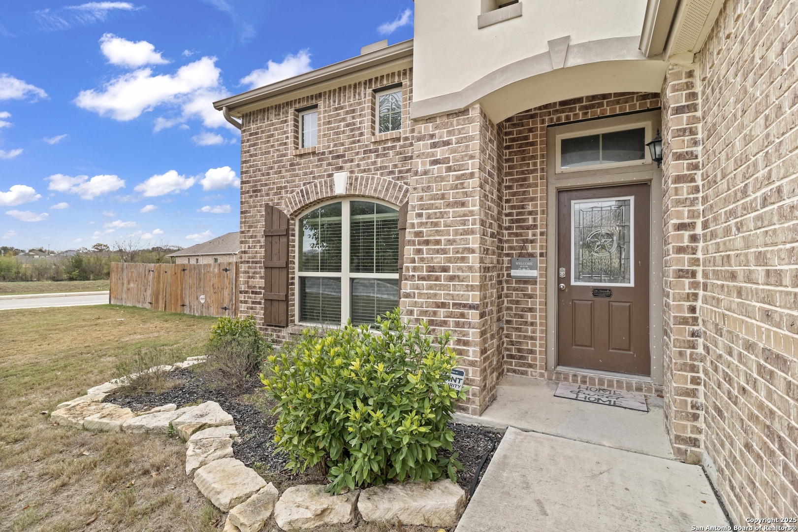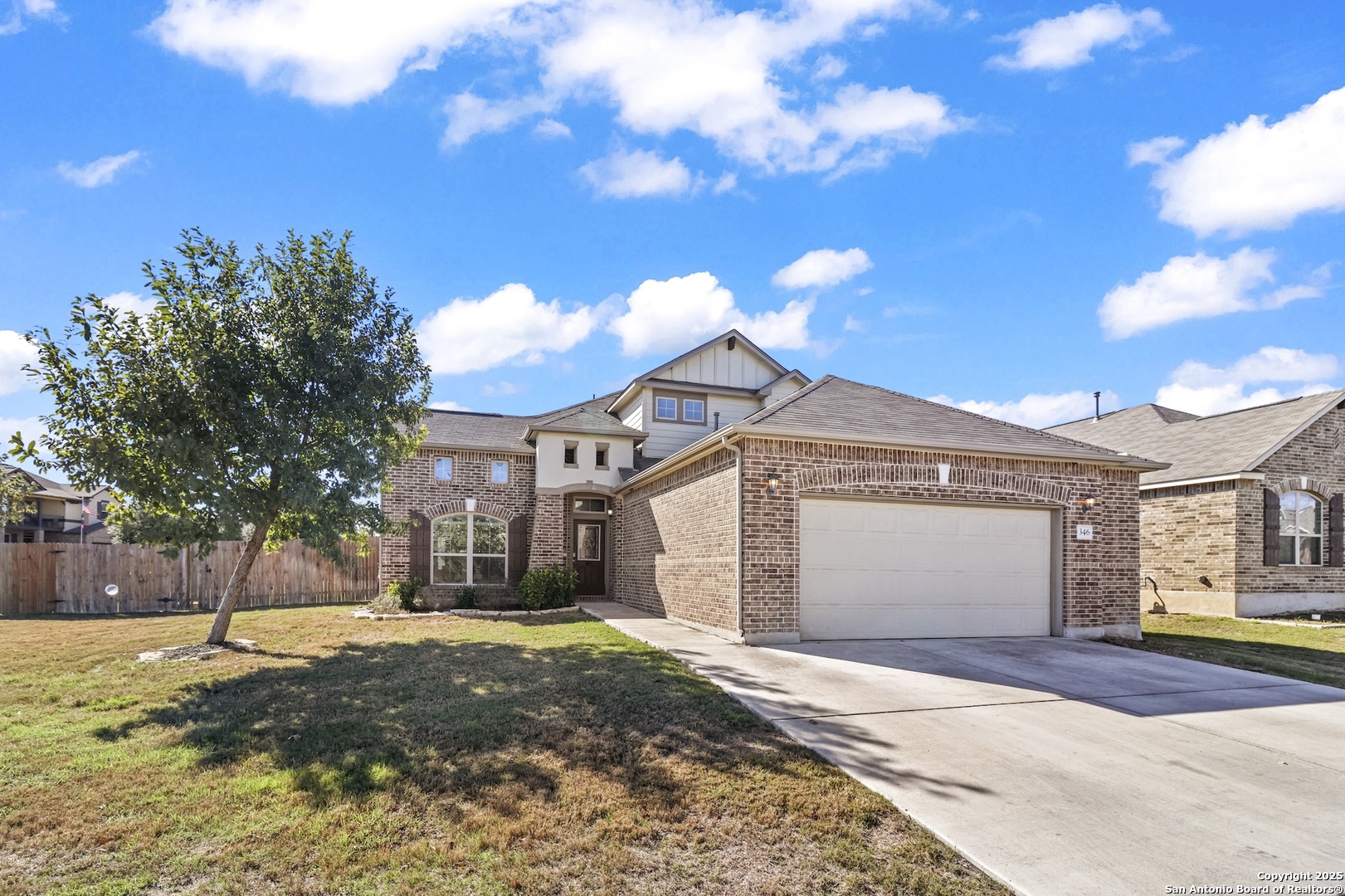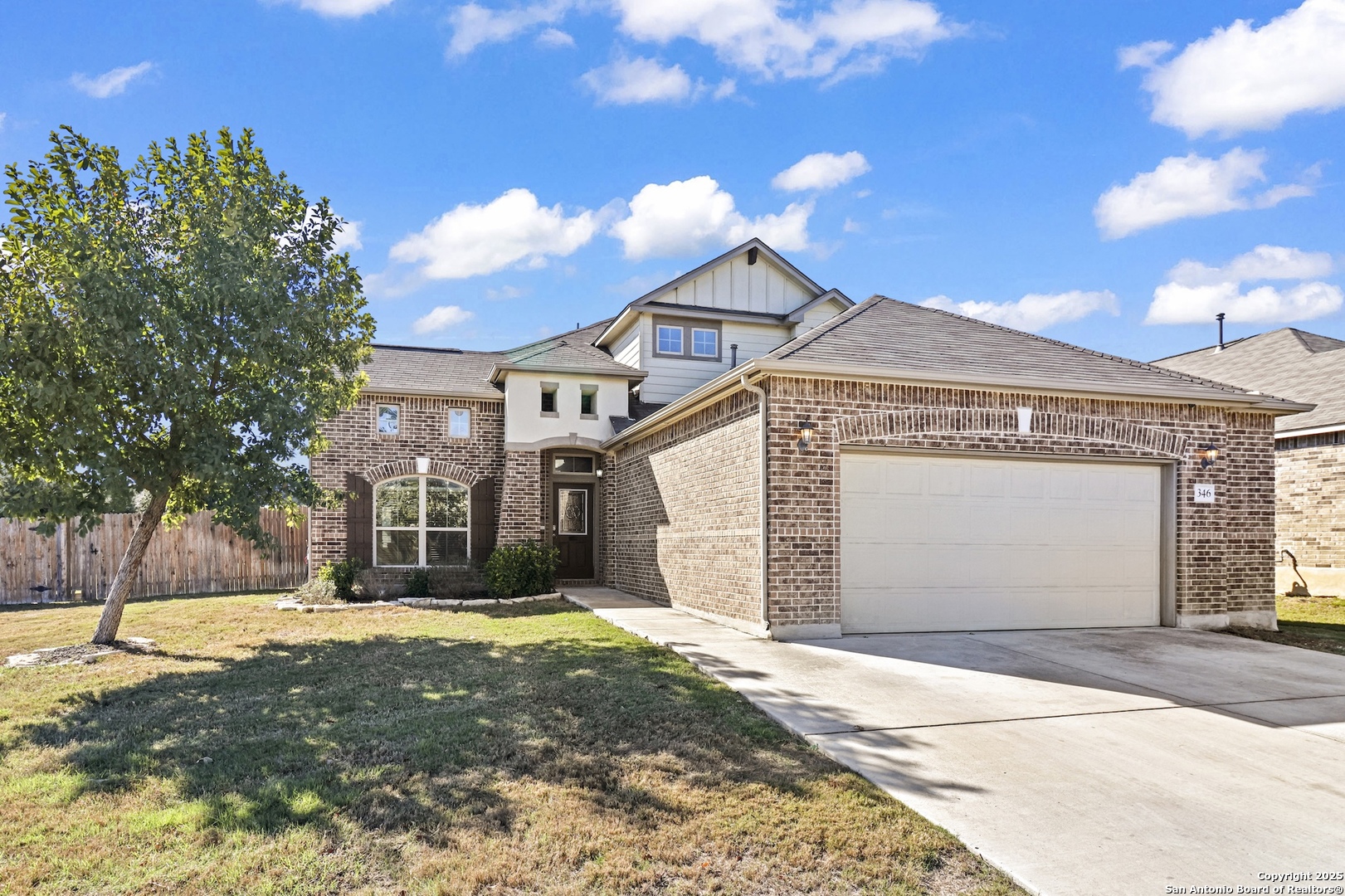 CORNER LOT WITH airconditioned SHE-SHED/outdoor office space on an ENORMOUS BACKYARD! This stunning 1.5-story home nestled in the charming community of Mockingbird Heights in New Braunfels, just a short drive from San Antonio. This home combines modern comfort with timeless appeal, designed to blend seamlessly into its tranquil surroundings while offering an open, inviting atmosphere inside. As you approach, the home exudes warmth and character, featuring a welcoming front porch invites you to relax and enjoy the neighborhood's peaceful vibe. The house sits on a spacious corner lot, allowing for abundant natural light and plenty of room for outdoor activities. Upon entering, you're greeted by a spacious, open-concept living area with soaring ceilings that enhance the sense of airiness. The large open living area is the heart of the home, perfect for both intimate family gatherings and larger social events. The kitchen is a masterpiece, truly the showstopper of this home. Massive in size, it features expansive granite counter tops. A large central island serves as both a workspace and a gathering spot, ideal for cooking, entertaining, or casual meals. Whether you're hosting friends or simply preparing a quiet dinner, the kitchen makes every culinary endeavor a delight. Adjacent to the kitchen is a breakfast/dining area, with ample space for a large table, and panoramic windows that flood the space with natural light. The flow from the kitchen to the living room and dining area creates an inviting open-plan layout, perfect for both daily living and entertaining. On the main floor, you'll also find the spacious master suite, offering a serene retreat at the end of the day. The room is generously sized, with large windows looking out onto the backyard and allowing for plenty of natural light. The en-suite bathroom features a spa-like atmosphere, complete with dual vanities, a soaking tub, a separate walk-in shower, and a walk-in closet that's as large as a room itself. The other bedrooms are conveniently located away from the master for additional privacy. Upstairs, you'll find the guest bedroom and bathroom, perfect for hosting visitors or creating a private space for family members with a sitting area. The bedroom is cozy yet spacious, with large windows offering views of the surrounding area. One of the unique features of this home is the charming she-shed tucked away in the backyard. Located on the corner lot, the she-shed is a perfect sanctuary for hobbies, creative projects, or a peaceful reading nook. With its own electricity, it can be transformed into whatever you desire-a craft room, home office, or private retreat. It offers a sense of tranquility and seclusion, yet is still conveniently close to the house. The backyard is an extension of the home's beauty and function. A covered patio provides the perfect space for outdoor dining and relaxation, while the large lawn offers plenty of room for outdoor activities. Whether you're enjoying a quiet morning coffee, hosting a barbecue, or simply relaxing under the Texas sky, this backyard serves as a private oasis. Other added features include: finished air conditioned garage with plenty of shelving, water softener with reverse osmosis, and solar panels, and new carpet. Make your appointment today to make this house a place you call home!