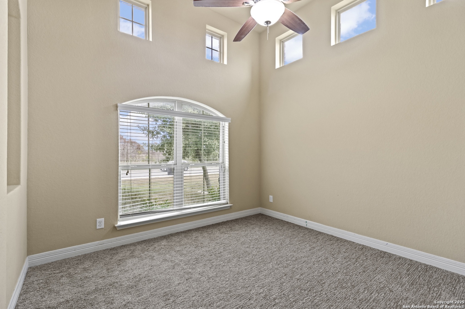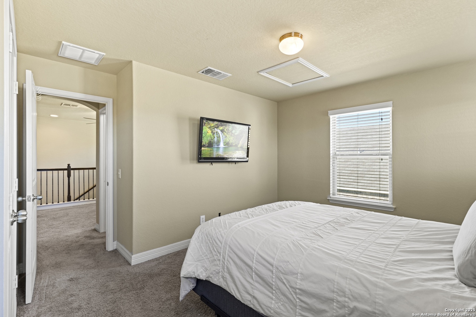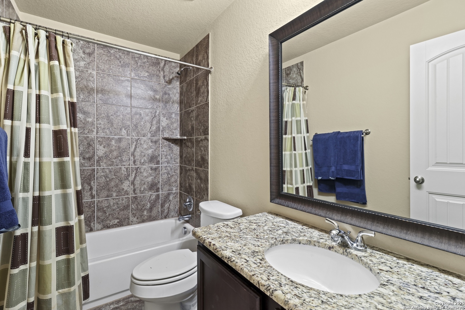 CORNER LOT WITH airconditioned SHE-SHED/outdoor office space on an ENORMOUS BACKYARD! This stunning 1.5-story home nestled in the charming community of Mockingbird Heights in New Braunfels, just a short drive from San Antonio. This home combines modern comfort with timeless appeal, designed to blend seamlessly into its tranquil surroundings while offering an open, inviting atmosphere inside. As you approach, the home exudes warmth and character, featuring a welcoming front porch invites you to relax and enjoy the neighborhood's peaceful vibe. The house sits on a spacious corner lot, allowing for abundant natural light and plenty of room for outdoor activities. Upon entering, you're greeted by a spacious, open-concept living area with soaring ceilings that enhance the sense of airiness. The large open living area is the heart of the home, perfect for both intimate family gatherings and larger social events. The kitchen is a masterpiece, truly the showstopper of this home. Massive in size, it features expansive granite counter tops. A large central island serves as both a workspace and a gathering spot, ideal for cooking, entertaining, or casual meals. Whether you're hosting friends or simply preparing a quiet dinner, the kitchen makes every culinary endeavor a delight. Adjacent to the kitchen is a breakfast/dining area, with ample space for a large table, and panoramic windows that flood the space with natural light. The flow from the kitchen to the living room and dining area creates an inviting open-plan layout, perfect for both daily living and entertaining. On the main floor, you'll also find the spacious master suite, offering a serene retreat at the end of the day. The room is generously sized, with large windows looking out onto the backyard and allowing for plenty of natural light. The en-suite bathroom features a spa-like atmosphere, complete with dual vanities, a soaking tub, a separate walk-in shower, and a walk-in closet that's as large as a room itself. The other bedrooms are conveniently located away from the master for additional privacy. Upstairs, you'll find the guest bedroom and bathroom, perfect for hosting visitors or creating a private space for family members with a sitting area. The bedroom is cozy yet spacious, with large windows offering views of the surrounding area. One of the unique features of this home is the charming she-shed tucked away in the backyard. Located on the corner lot, the she-shed is a perfect sanctuary for hobbies, creative projects, or a peaceful reading nook. With its own electricity, it can be transformed into whatever you desire-a craft room, home office, or private retreat. It offers a sense of tranquility and seclusion, yet is still conveniently close to the house. The backyard is an extension of the home's beauty and function. A covered patio provides the perfect space for outdoor dining and relaxation, while the large lawn offers plenty of room for outdoor activities. Whether you're enjoying a quiet morning coffee, hosting a barbecue, or simply relaxing under the Texas sky, this backyard serves as a private oasis. Other added features include: finished air conditioned garage with plenty of shelving, water softener with reverse osmosis, and solar panels, and new carpet. Make your appointment today to make this house a place you call home!