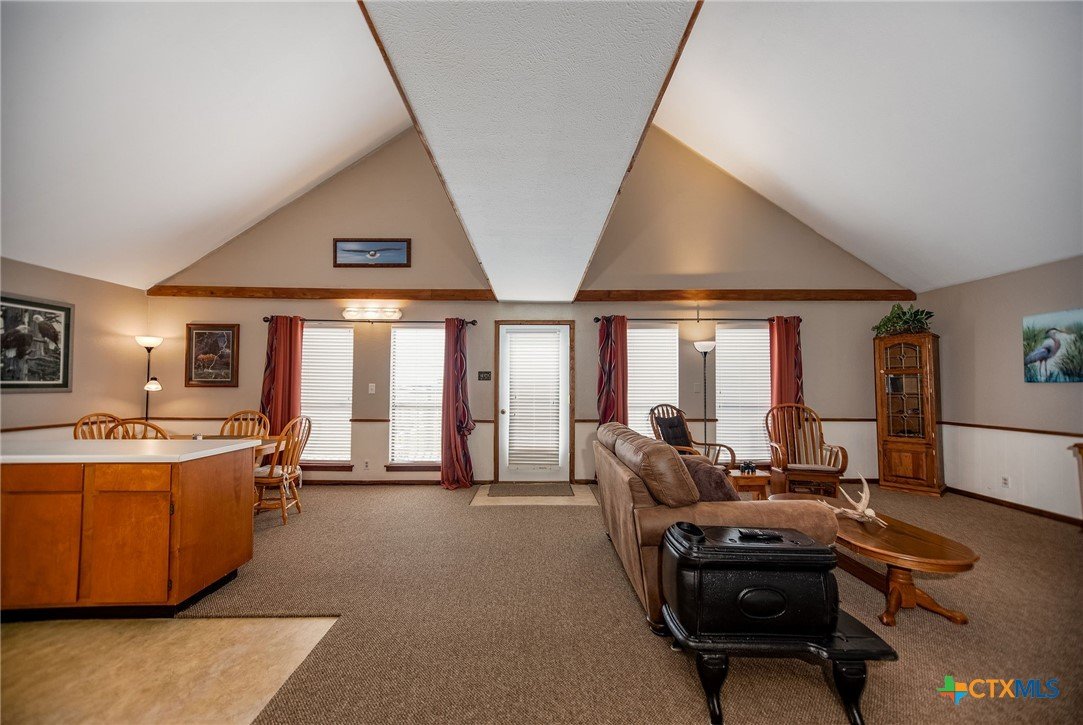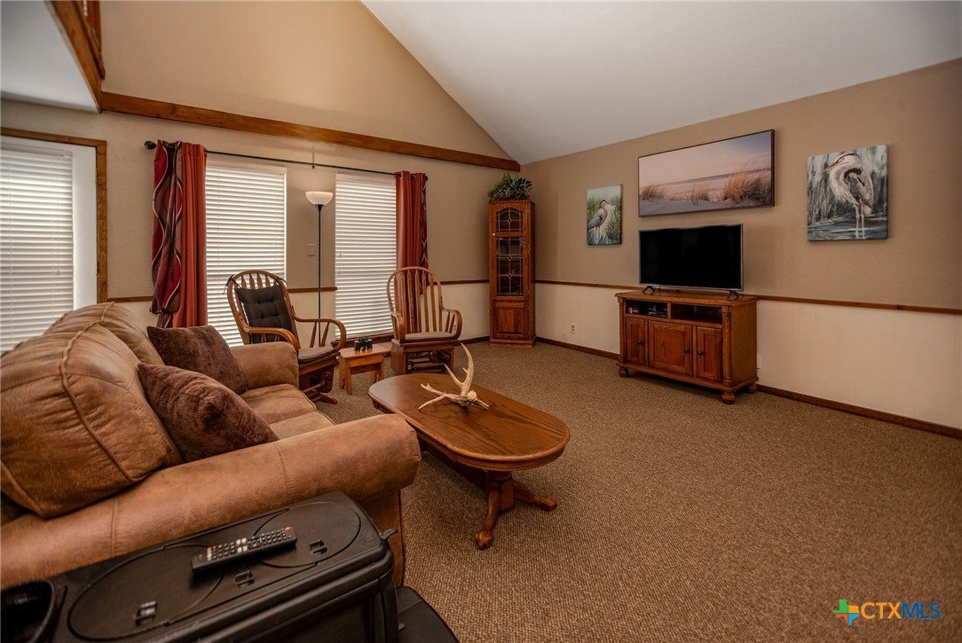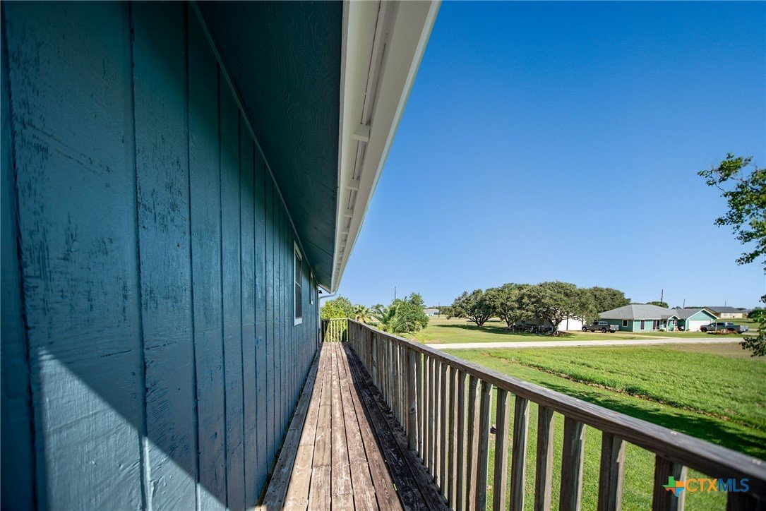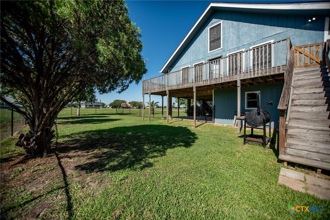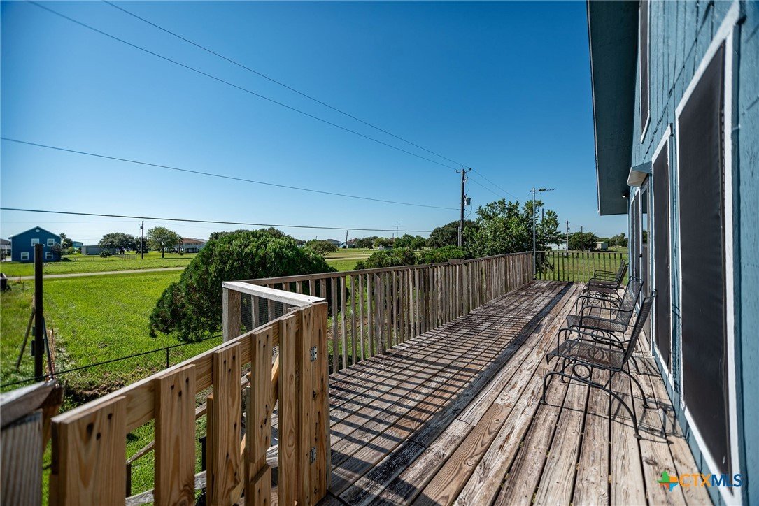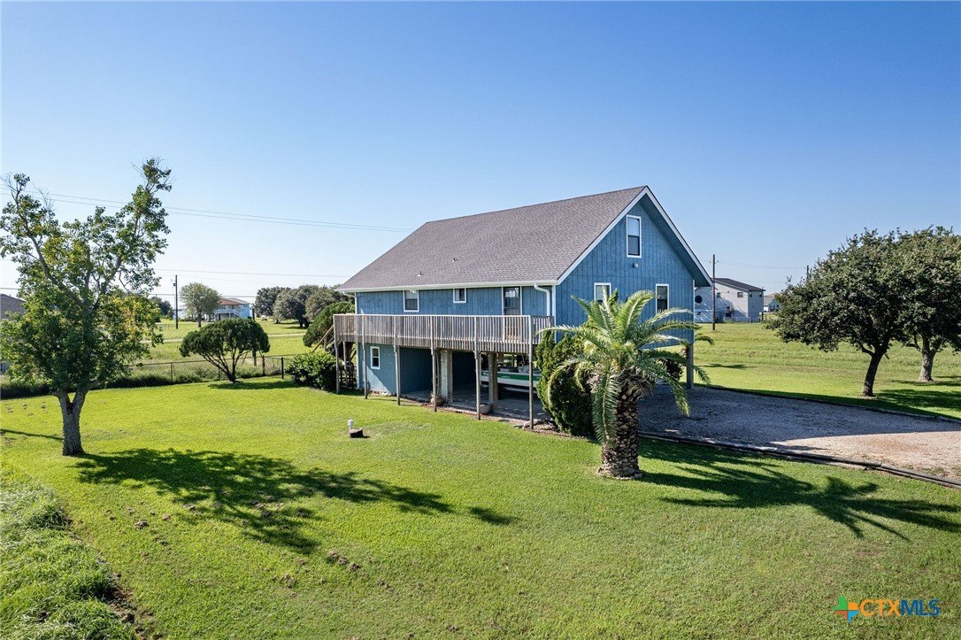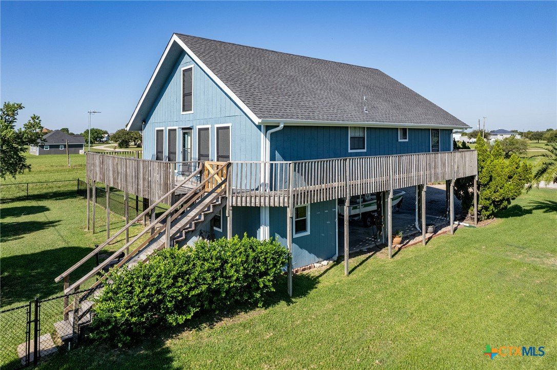 This beautiful 3 bedroom, 2 bathroom home offers the ultimate coastal lifestyle. Nestled in a gated waterfront community on 2 lots, this elevated home boasts breathtaking views of Carancahua Bay from its spacious balcony. The open-concept layout creates a bright and airy living space between the living room, kitchen and dining areas. Upstairs, you will find a private third bedroom connected to a unique catwalk that adds a touch of character and charm and provides a bird's-eye view of the main living space. Enjoy the community's amenities, including two swimming pools, tennis court, boat ramp, pier, and festive holiday events.