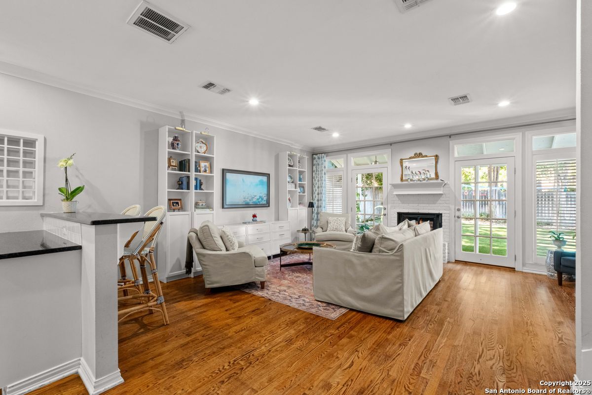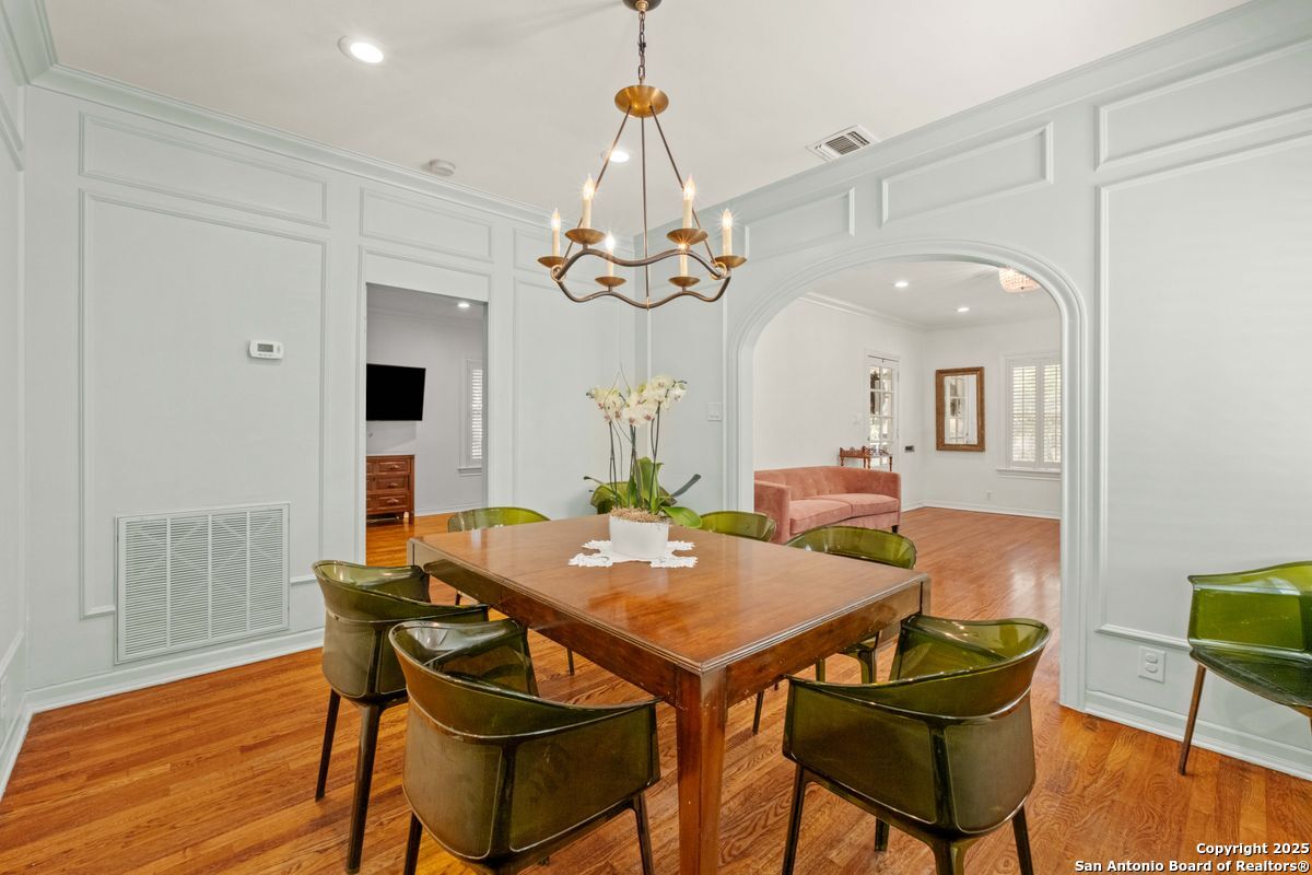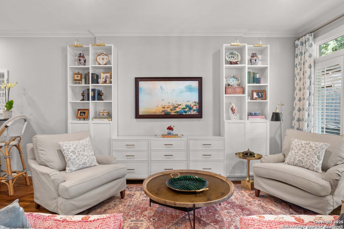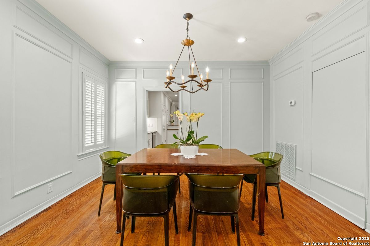 This Alamo Heights jewel has been exquisitely renovated and refined to perfection. The home welcomes you with a gracious formal living room, highlighted by gleaming hardwood floors, plantation shutters, and elegant crown moldings. The adjacent formal dining room is elevated with richly paneled walls, creating a timeless setting for both intimate dinners and grand entertaining. The chef's kitchen, appointed with premium stainless steel appliances, opens seamlessly into a luminous family room designed for both comfort and sophistication. The downstairs primary suite serves as a private retreat, featuring dual vanities, a spacious walk-in closet, a luxurious soaking tub, and an elegant separate shower. A private office, thoughtfully designed for today's lifestyle, completes the main level. Upstairs, a versatile playroom is accompanied by two generously sized bedrooms, each with its own en suite bath. Outdoors, the residence offers a private rear-entry covered carport, along with a charming deck and porch-perfectly suited for both relaxed evenings and refined entertaining. Nestled on a family-friendly street within walking distance to premier shops and dining, this timeless estate seamlessly blends elegance, comfort, and convenience.