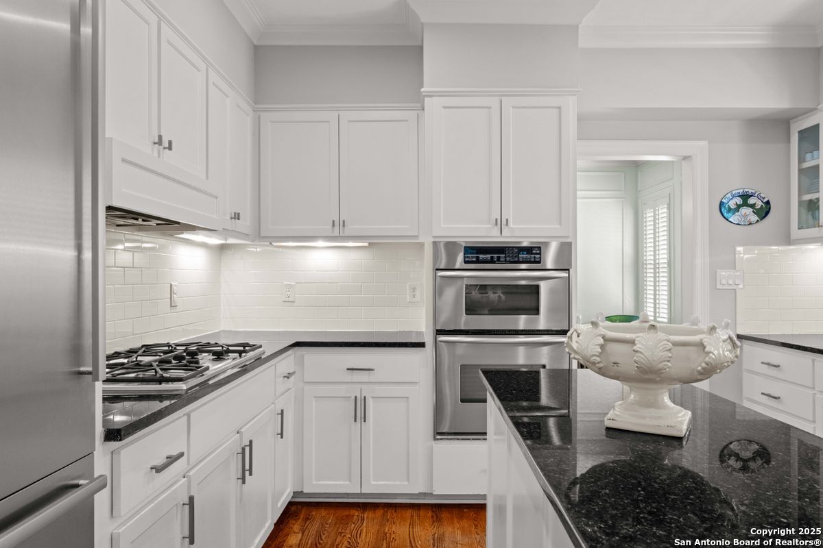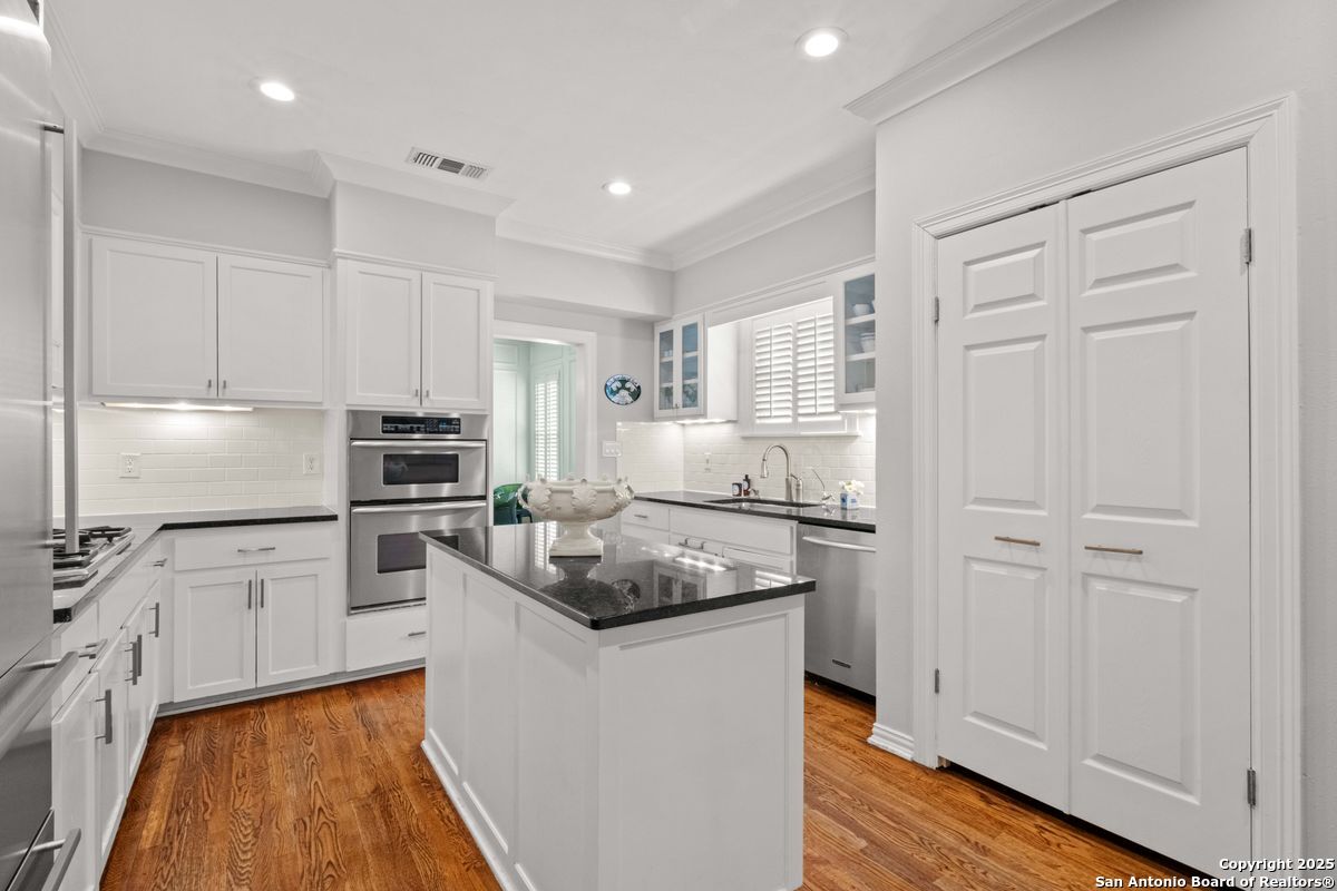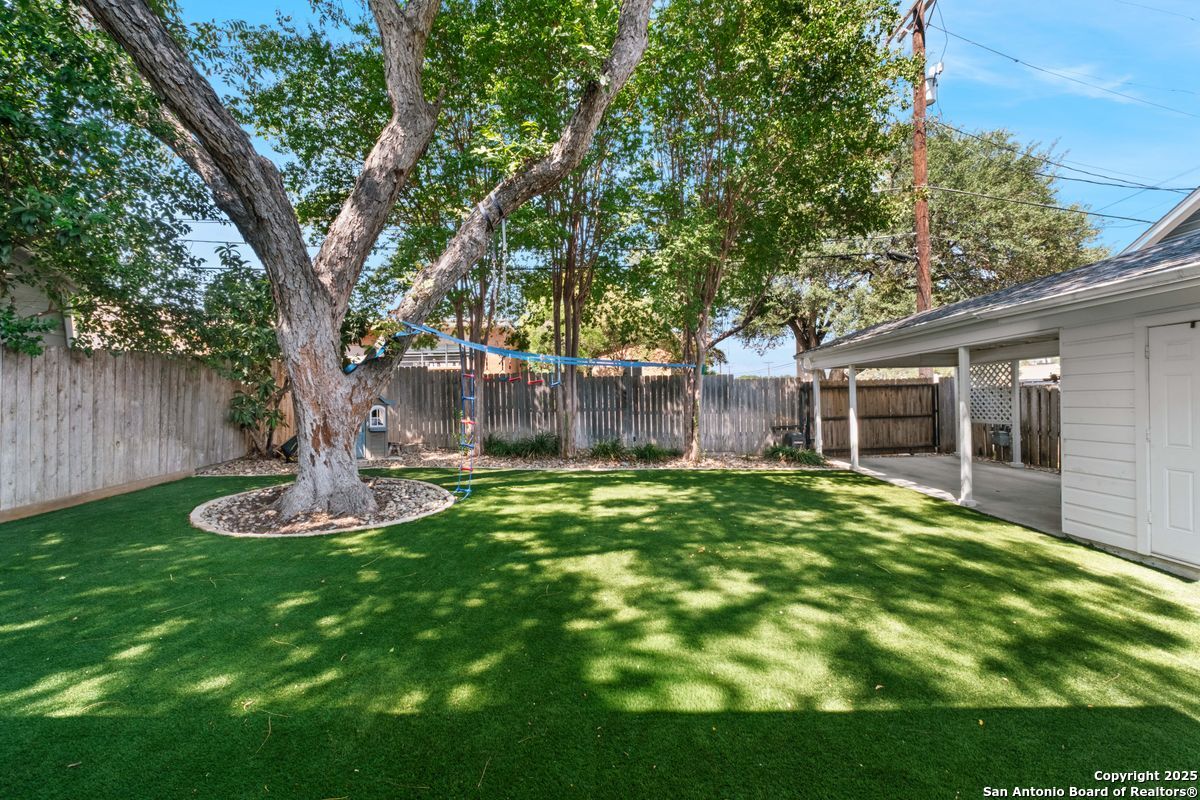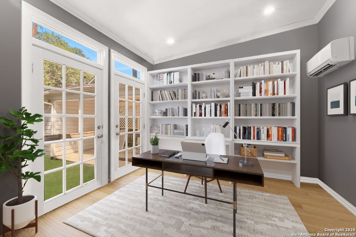 This Alamo Heights jewel has been exquisitely renovated and refined to perfection. The home welcomes you with a gracious formal living room, highlighted by gleaming hardwood floors, plantation shutters, and elegant crown moldings. The adjacent formal dining room is elevated with richly paneled walls, creating a timeless setting for both intimate dinners and grand entertaining. The chef's kitchen, appointed with premium stainless steel appliances, opens seamlessly into a luminous family room designed for both comfort and sophistication. The downstairs primary suite serves as a private retreat, featuring dual vanities, a spacious walk-in closet, a luxurious soaking tub, and an elegant separate shower. A private office, thoughtfully designed for today's lifestyle, completes the main level. Upstairs, a versatile playroom is accompanied by two generously sized bedrooms, each with its own en suite bath. Outdoors, the residence offers a private rear-entry covered carport, along with a charming deck and porch-perfectly suited for both relaxed evenings and refined entertaining. Nestled on a family-friendly street within walking distance to premier shops and dining, this timeless estate seamlessly blends elegance, comfort, and convenience.