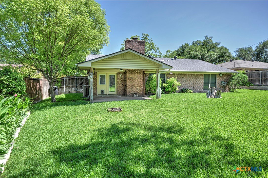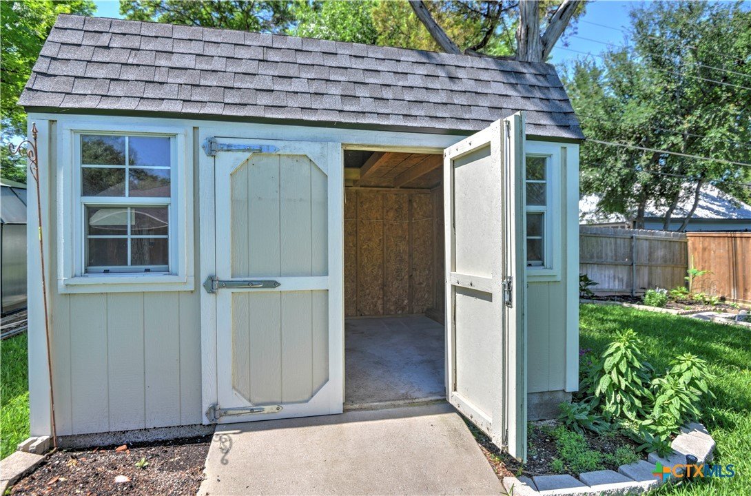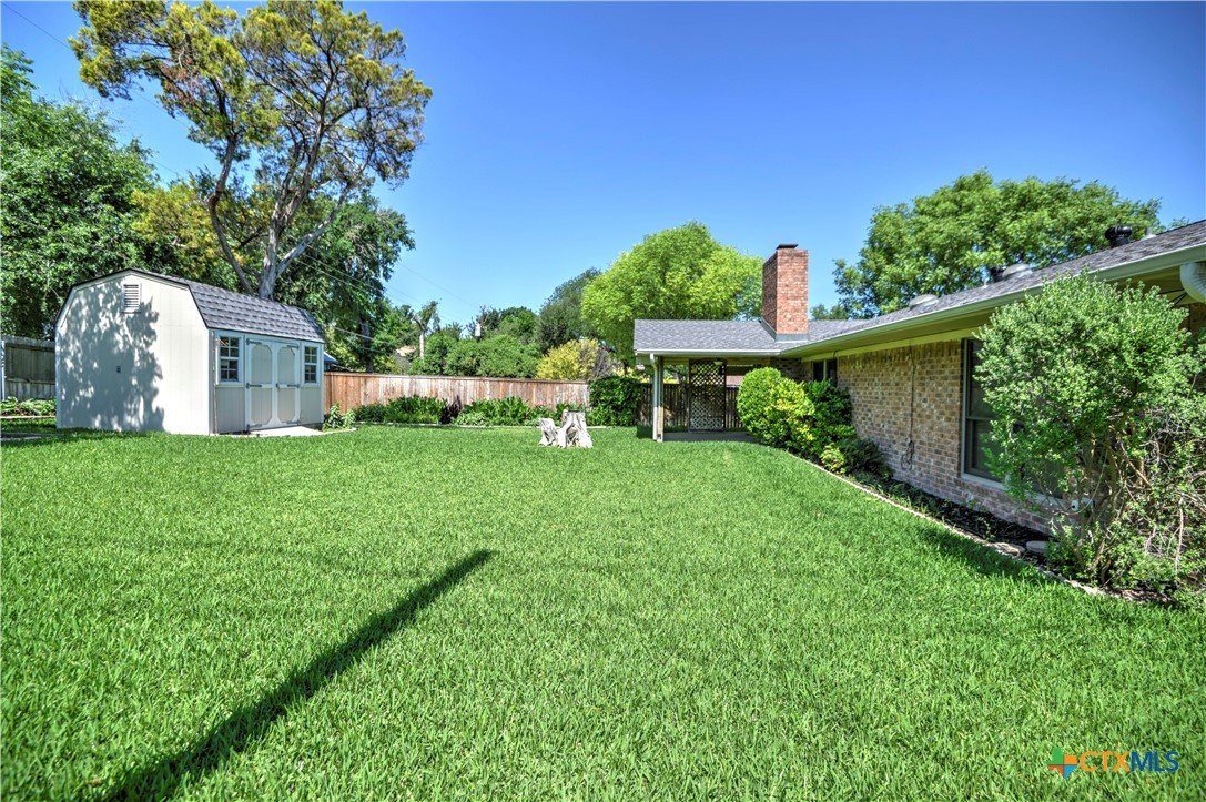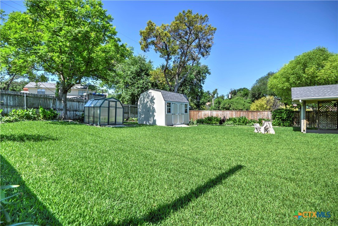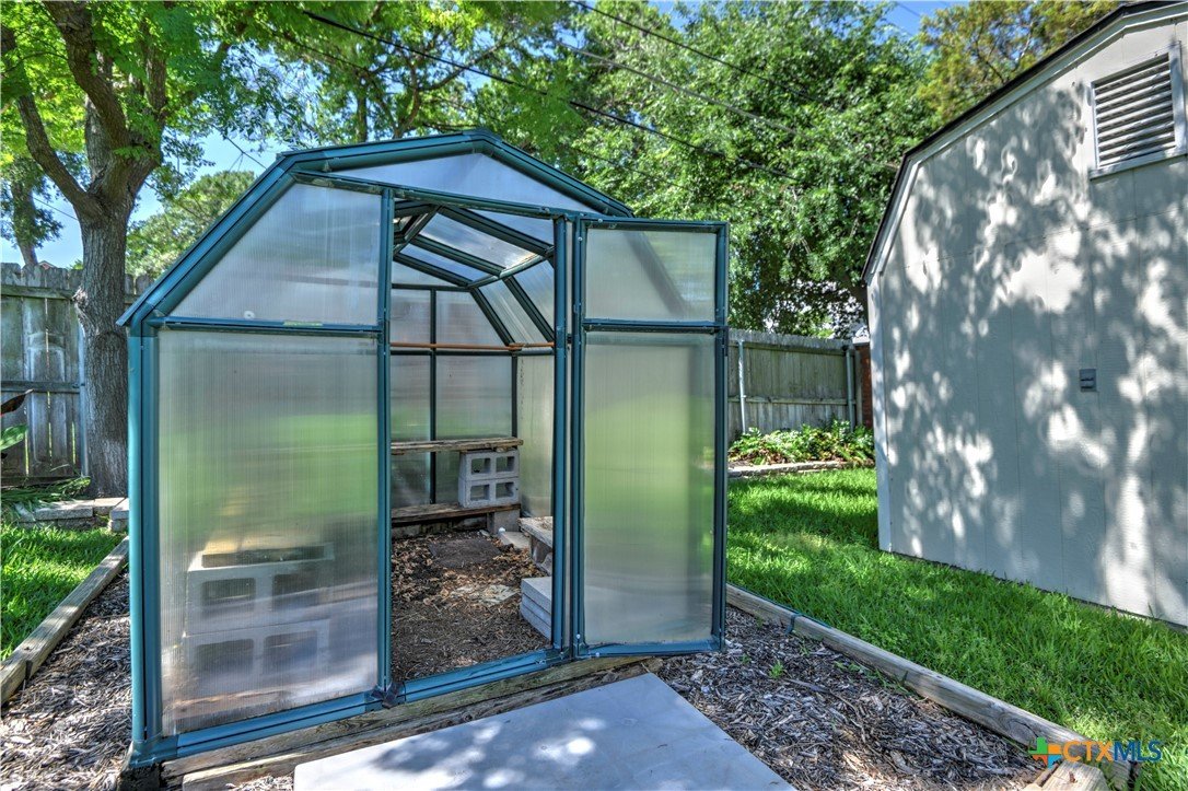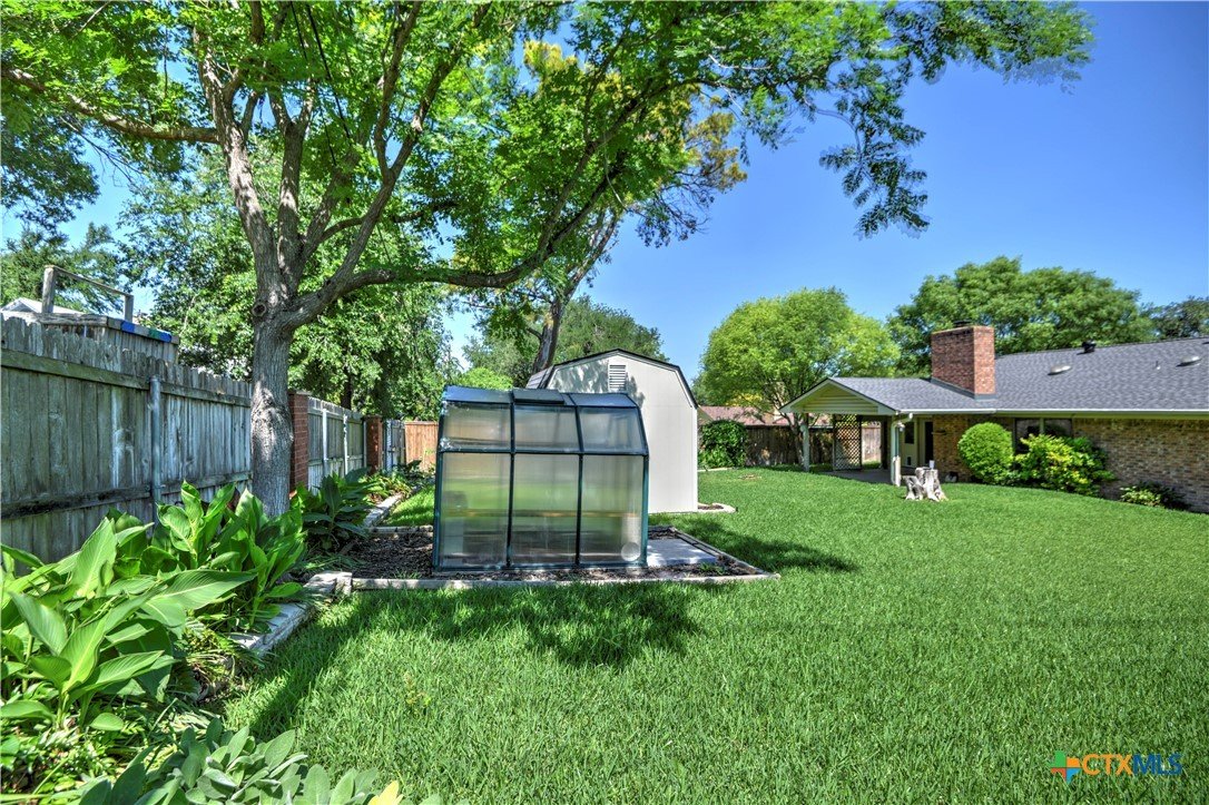This well-maintained home is conveniently located just off Hickory in SW Temple with easy access to I-35 or the amenities of Temple. It has ceramic tile floors in the living area, kitchen, and hallway. The living room has a lovely white fireplace and mantel with French doors on one side for easy access to the covered patio. Two bedrooms are carpeted and two bedrooms have laminate flooring, which works well for an office. The primary bedroom at the rear of the house has an updated bathroom with a large shower and high sink. The large kitchen is open to the great room/living room and has lots of counterspace. Stainless steel appliances are in the kitchen and there's an integrated sink with the off-white, solid-surface countertops. The laundry room is between the kitchen and the garage with room for an extra refrigerator. The garage has a nice workshop room. There are 5 cylindrical skylights (chunnels) in the house for added light. The backyard is a real bonus with a workshop approx. 10' x 15' with electricity, plus a greenhouse for plants. The perimeter of the yard is full of perennials which will bloom throughout the year. Additional bonus features include Andersen windows, Leaf-guard gutters, a 35-year architectural roof put on in Oct. 2024, and a Hunter irrigation system with its own meter. This house is move-in ready.