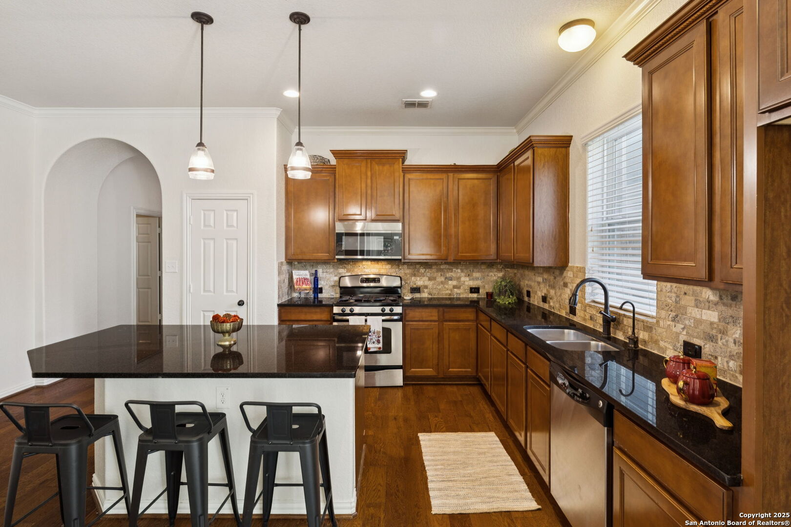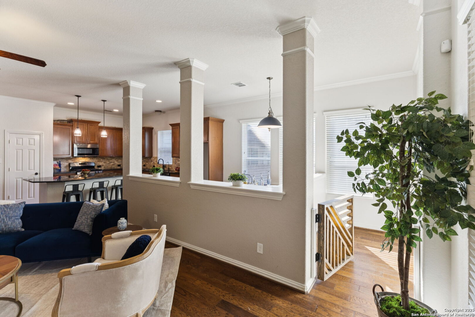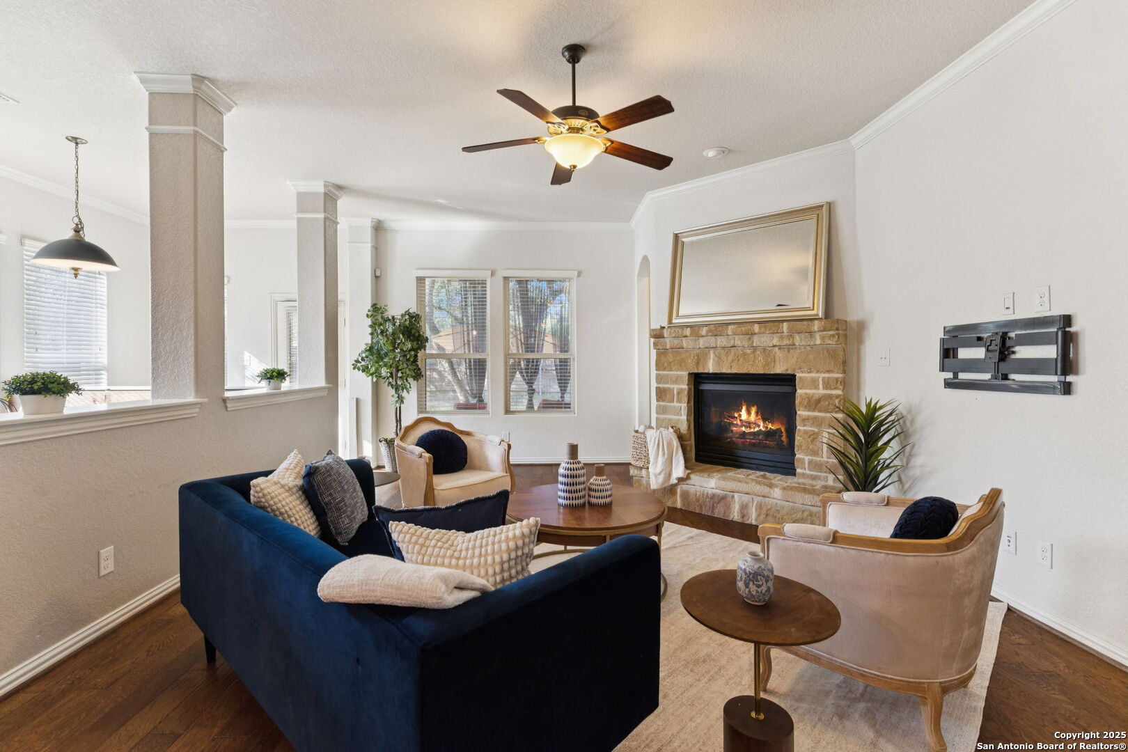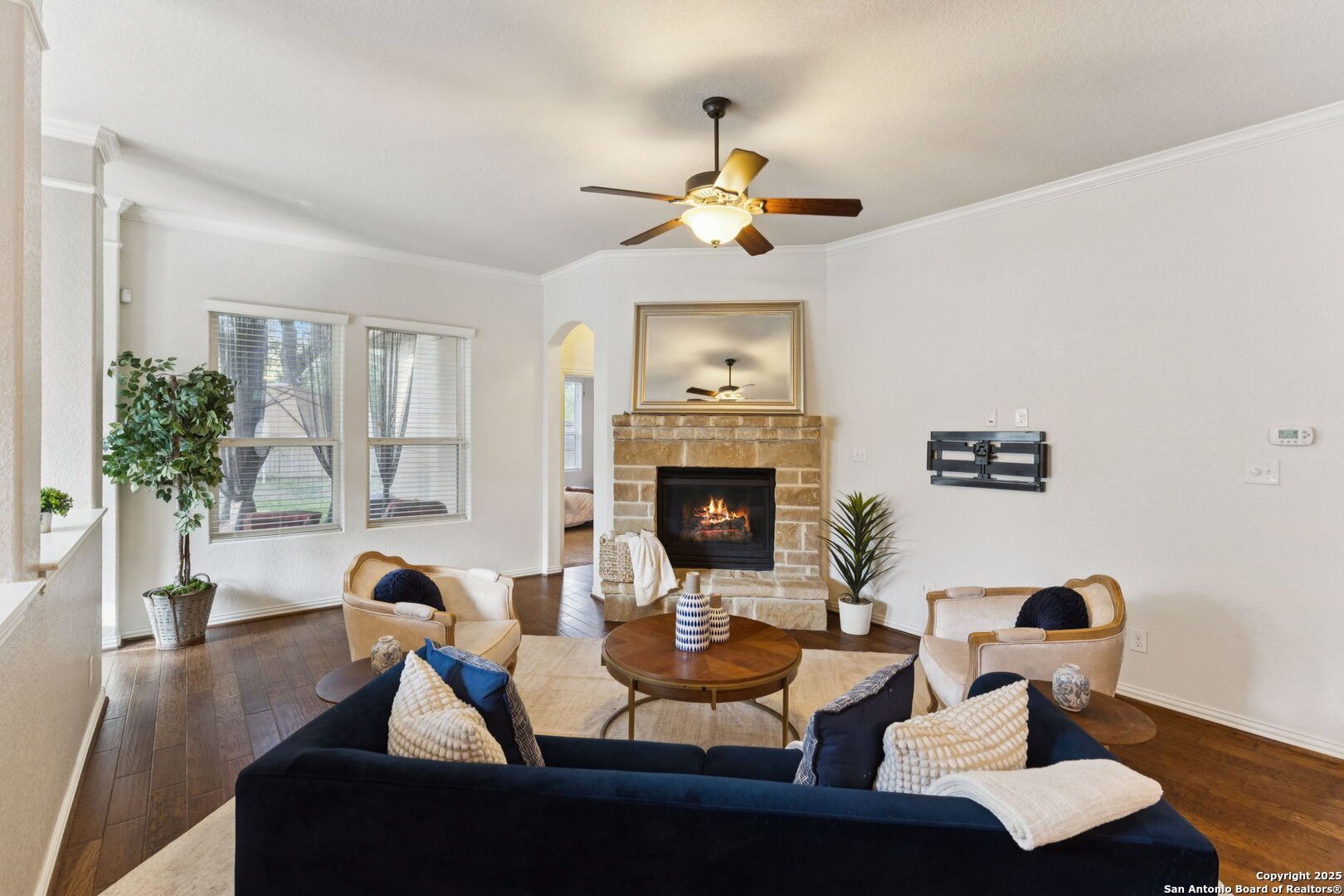 Welcome to 3539 Arroyo Grande in The Estates at Arroyo Crossing, a gated enclave of Alamo Ranch. Built by David Weekley, this home features 4 bedrooms, 2.5 bathrooms, plus a dedicated office, flex room, formal dining, breakfast nook, and an upstairs "game room" or "4th bedroom". The open layout highlights a granite island kitchen with gas cooking, a spacious living room with stone fireplace, and a private primary suite on the main floor. Outdoors, enjoy the covered patio, stone firepit, and mature trees creating a private retreat. Conveniently located near shopping, dining, schools, and major highways.