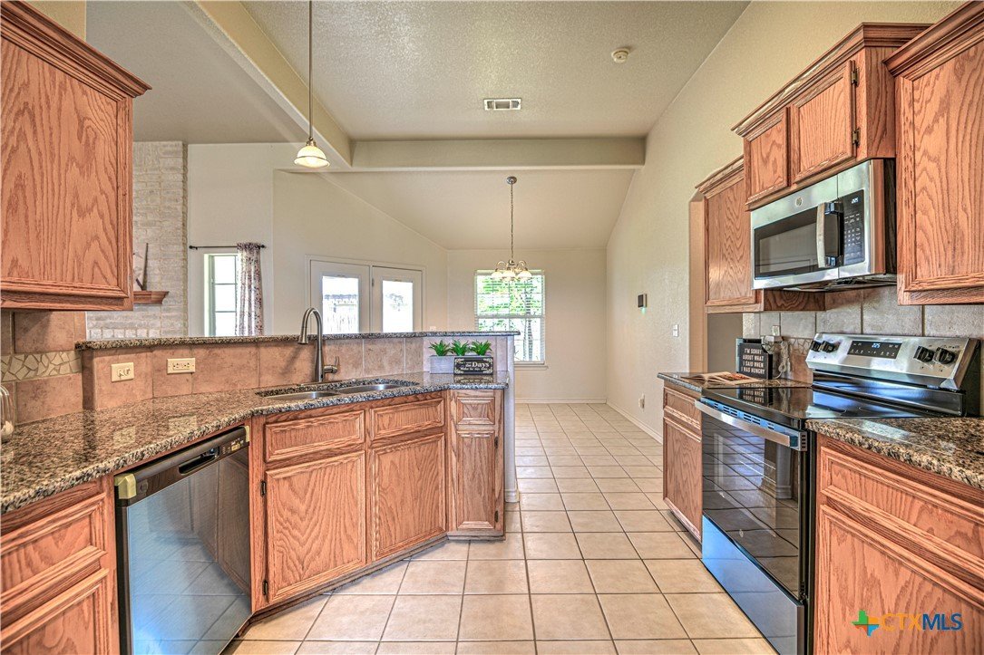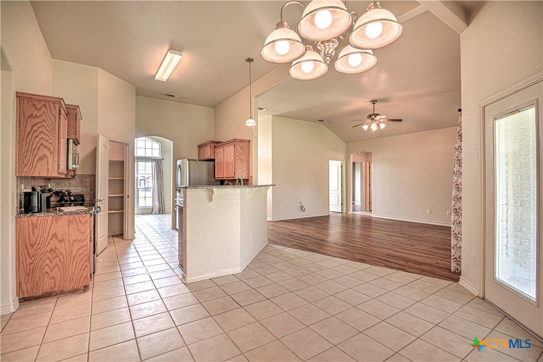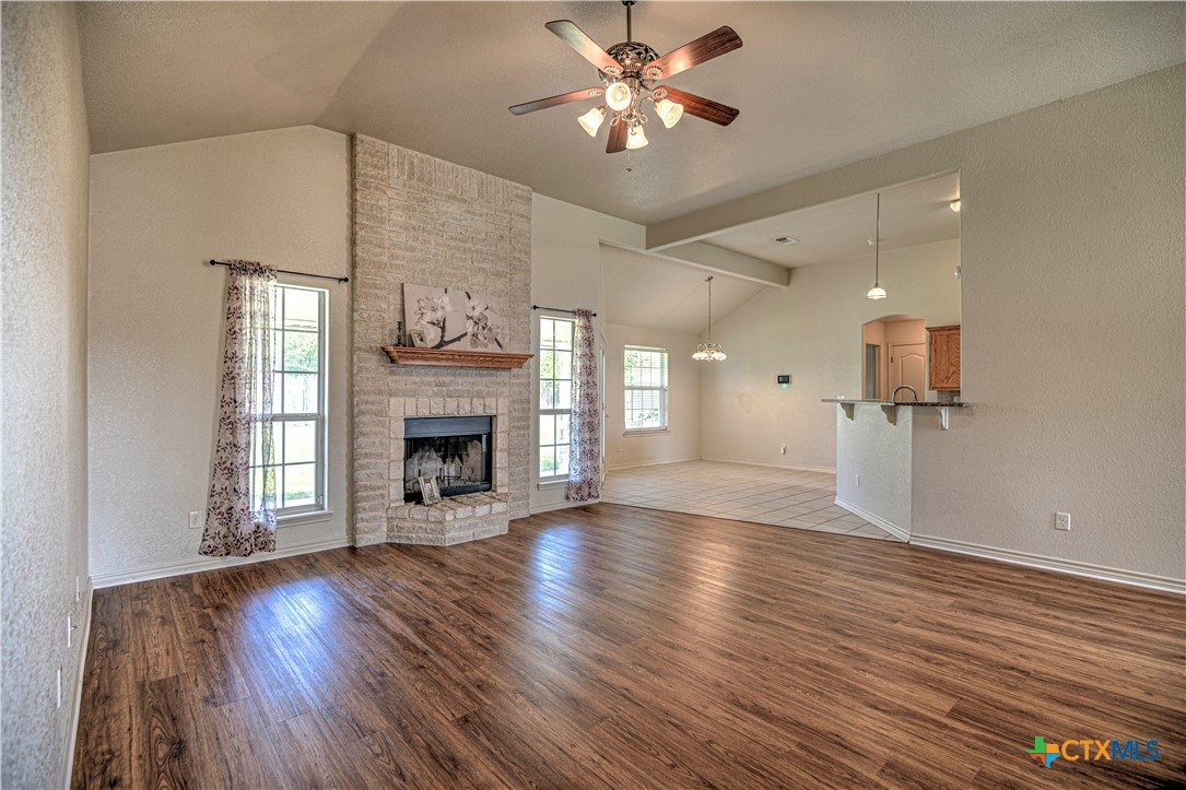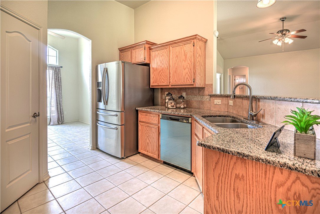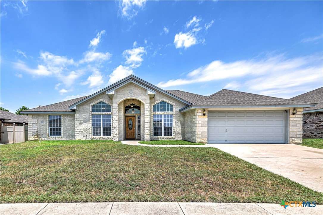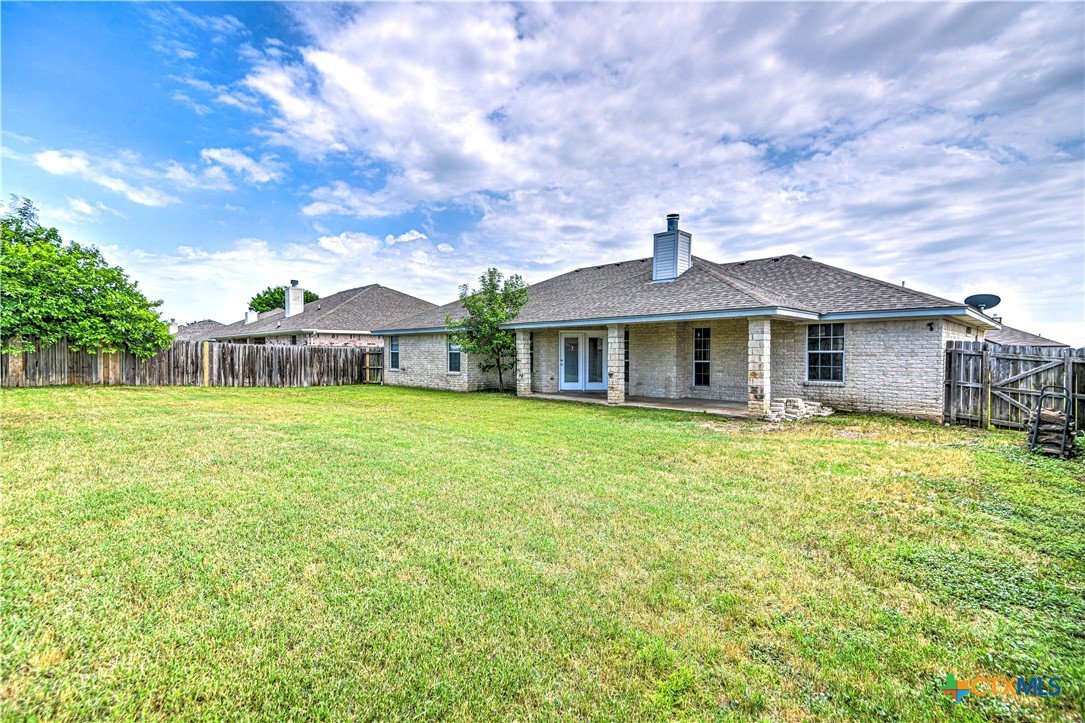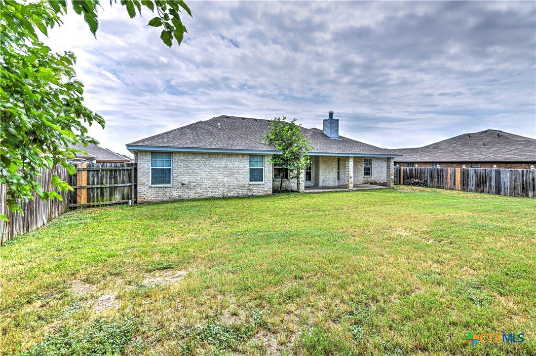 Welcome home to comfort, space, and style in the highly desirable Goodnight Ranch subdivision. This beautifully maintained 4-bedroom, 2-bath home offers everything today’s buyers are looking for—modern finishes, spacious living, and a flexible floor plan designed for both everyday living and entertaining. With 2,075 square feet of open and inviting space, this single-story home sits on a large 0.21-acre lot. The layout includes a spacious main living area, a flex space that can serve as a formal dining room or home office, and a split-bedroom design that ensures privacy. A cozy wood-burning fireplace adds warmth and charm to the main living space, making it ideal for relaxing evenings or gathering with guests. The kitchen features granite countertops, a tile backsplash, a breakfast bar, and NEW stainless steel appliances. The private owner’s suite includes an oversized walk-in closet and a luxurious bathroom with a jetted tub, separate shower, and double vanity. Three additional bedrooms provide plenty of space for guests, family, or hobbies. Only one room has carpet, while the rest of the home offers easy-to-maintain tile and vinyl flooring. Step outside to a covered back patio that overlooks a fully fenced backyard—perfect for pets, play, or outdoor entertaining. The attached 2-car garage provides secure parking and additional storage. Located in a quiet, sidewalk-lined neighborhood within Killeen city limits, this home offers full city utilities and no HOA. All major appliances convey, including the refrigerator, range, dishwasher, and microwave. Just minutes from schools, shopping, dining, and Fort Cavazos, this move-in-ready home offers the perfect blend of value, location, and comfort.