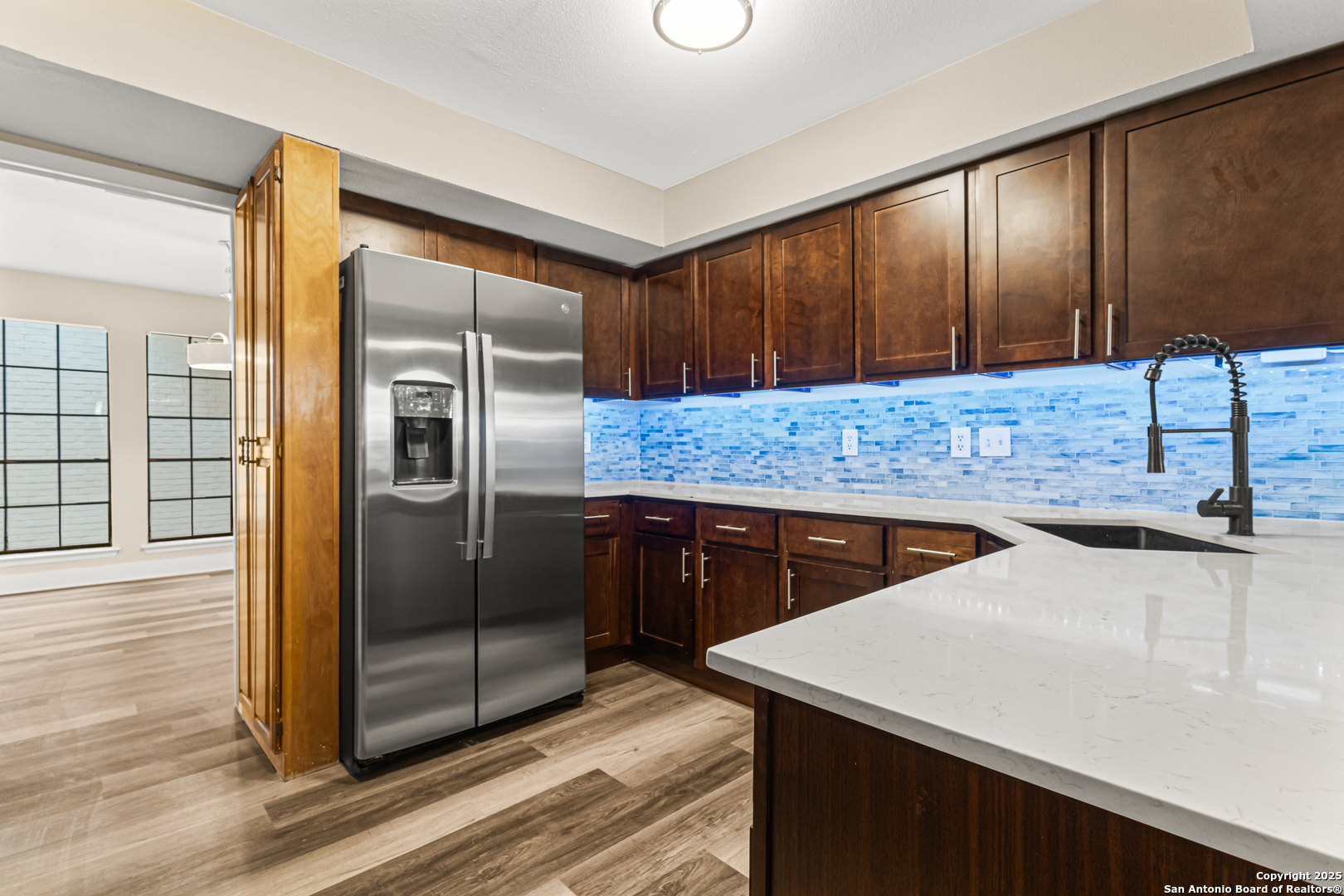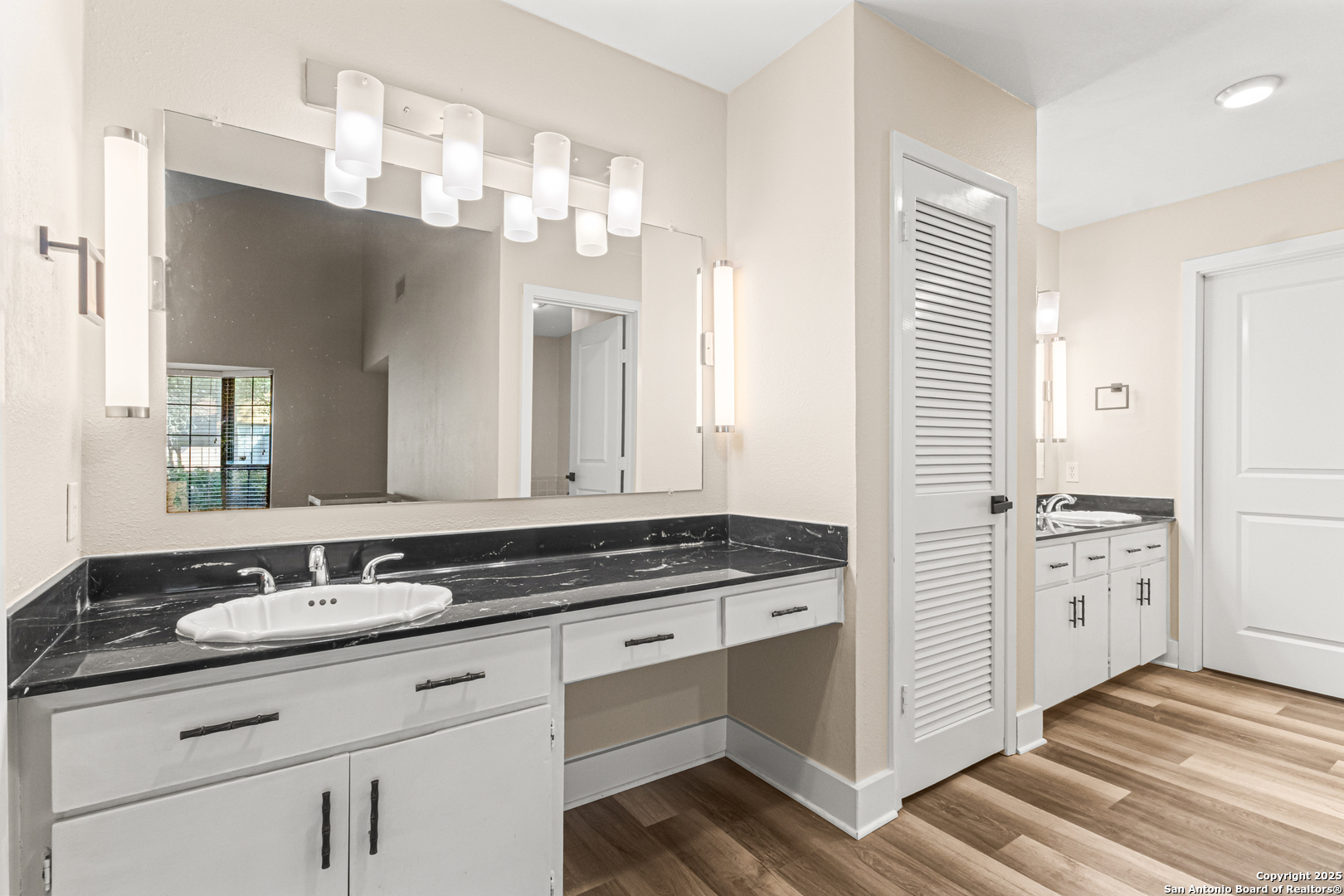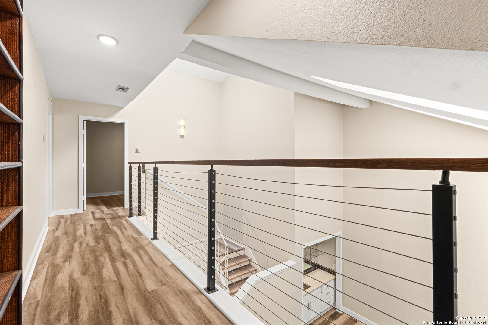 A rare, fully modernized townhouse in gated Idlewood within NEISD, offering unparalleled style and sophistication. The first-floor PRIMARY BEDROOM, dramatic living room with vaulted ceilings, fireplace, wet bar, and a stunning sunroom/terrace create the perfect setting for refined living. The chef-ready kitchen boasts custom cabinetry, granite countertops, and luxury vinyl plank flooring for effortless elegance. Upstairs features generous bedrooms and a versatile OFFICE / LOFT AREA ideal for work, media, or fitness. Skylights, bay windows, and an open layout flood the home with natural light, highlighting every high-end finish. Minutes from Northeast Baptist Hospital, about 8 miles to SAT, with quick access to Loop 410, Wurzbach Parkway, and U.S. 281 - schedule your private showing today and experience a one-of-a-kind residence.