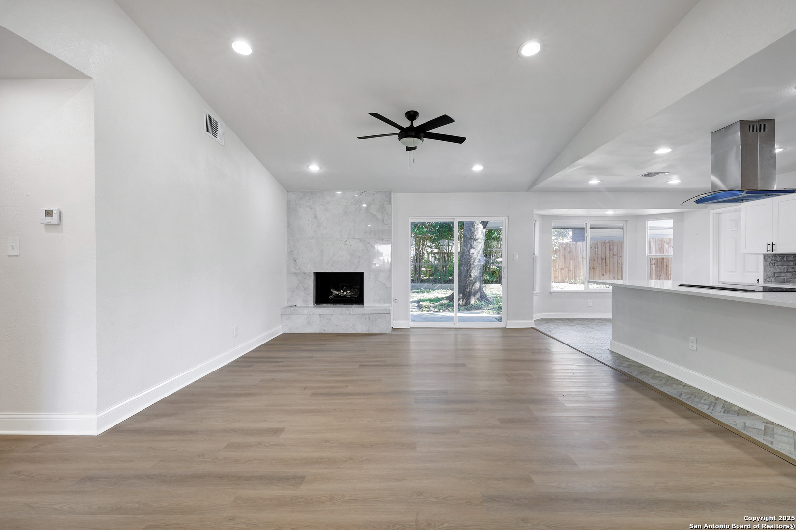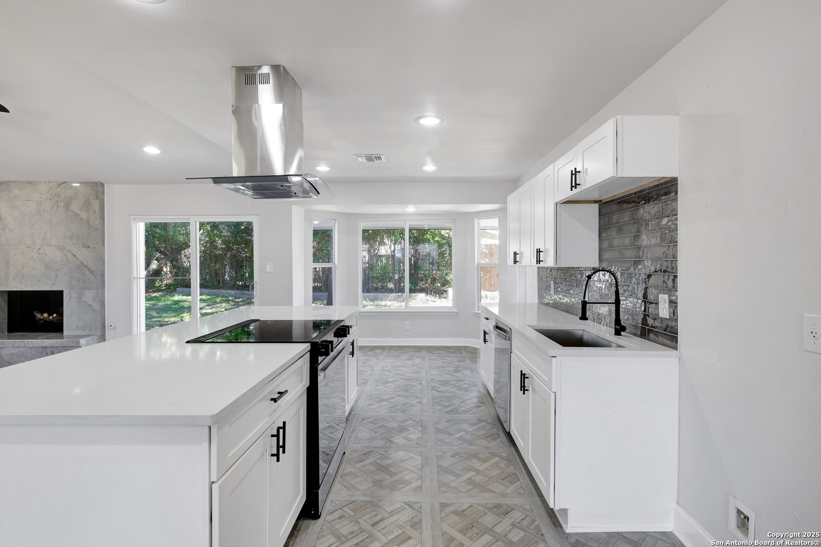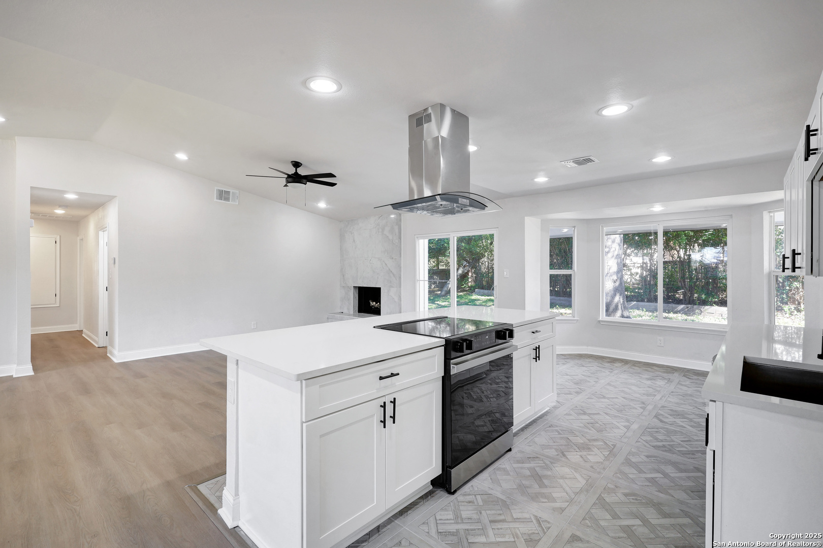 Single-story brick front residence showcasing a complete top-to-bottom renovation. Step inside to find a sleek, ultra-modern interior with luxury vinyl flooring throughout and tile flooring in the kitchen and breakfast nook-no carpet anywhere. The kitchen is a standout, offering an oversized island ideal for additional seating, complemented by contemporary countertops, stainless steel appliances, and a stylish free-standing vent hood. A spacious living room centers around an eye-catching fireplace, providing an impressive focal point. The primary suite features a refined en suite bathroom with a soaking tub and a separate walk-in shower for a spa-like experience. Outdoors, enjoy an expansive backyard shaded by mature trees, offering both relaxation and functionality. Conveniently located with easy access to downtown, the medical center, shopping, dining, and more. Every detail has been updated-fresh, modern, and move-in ready.