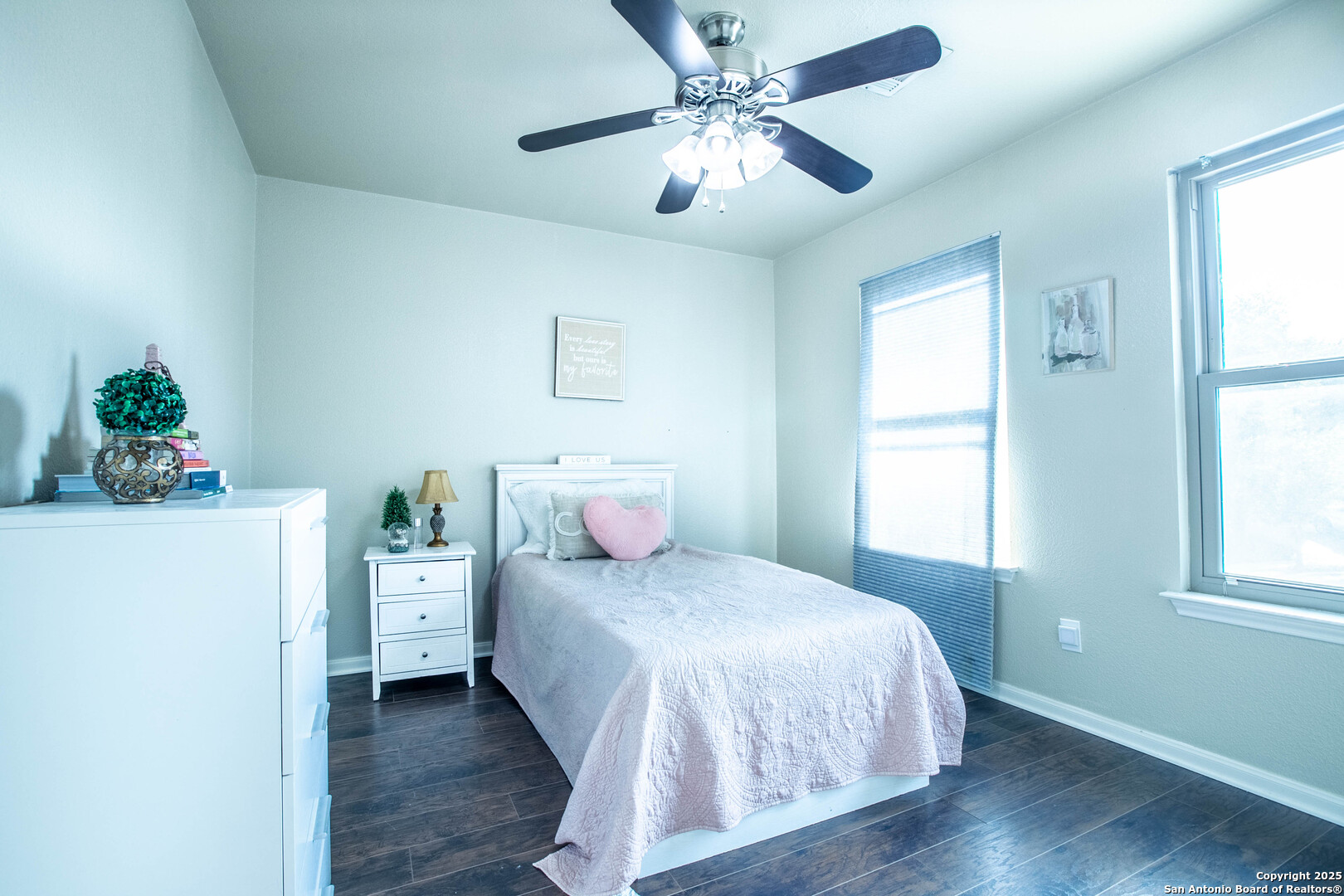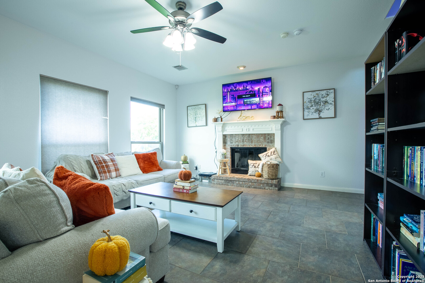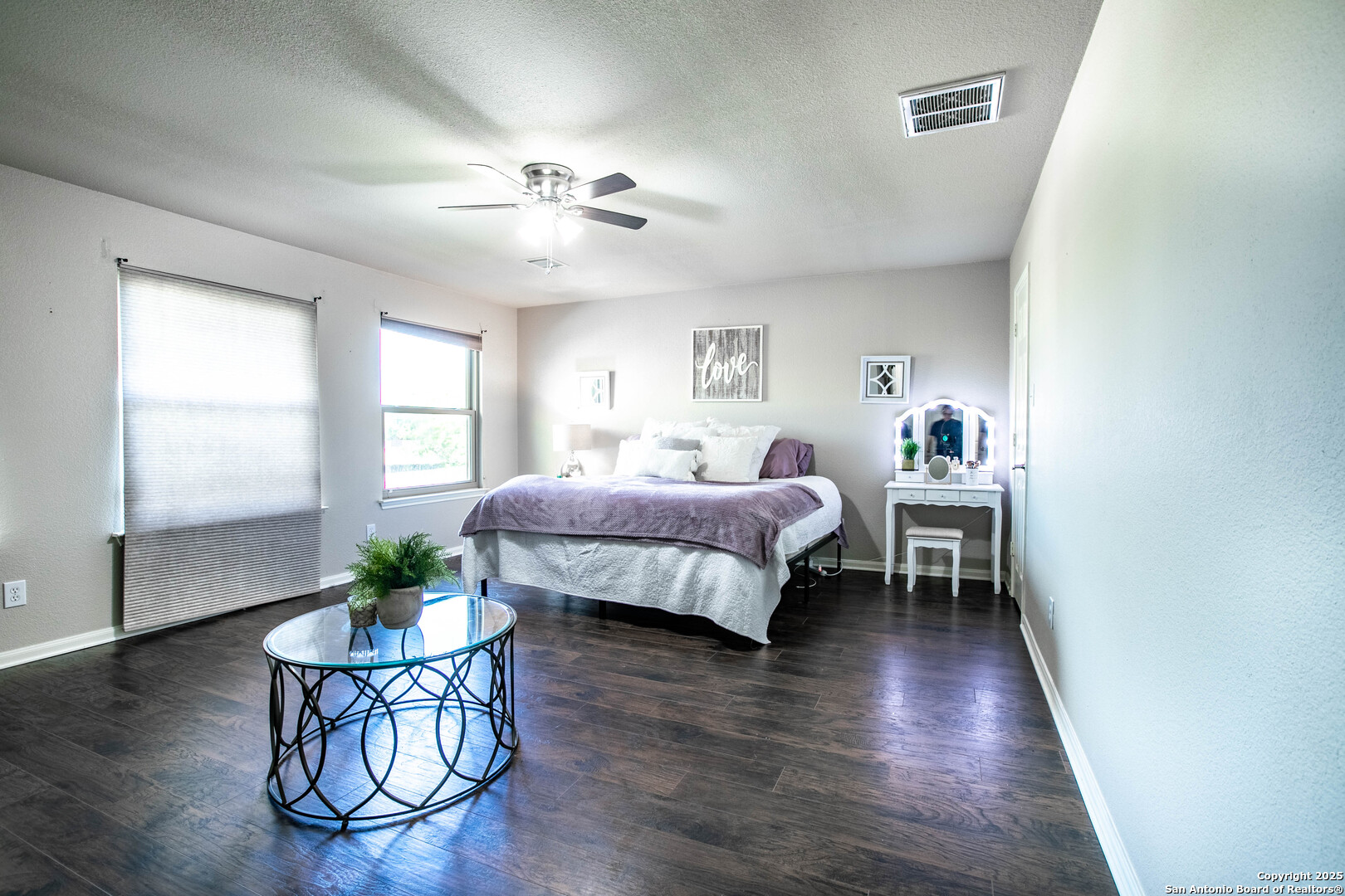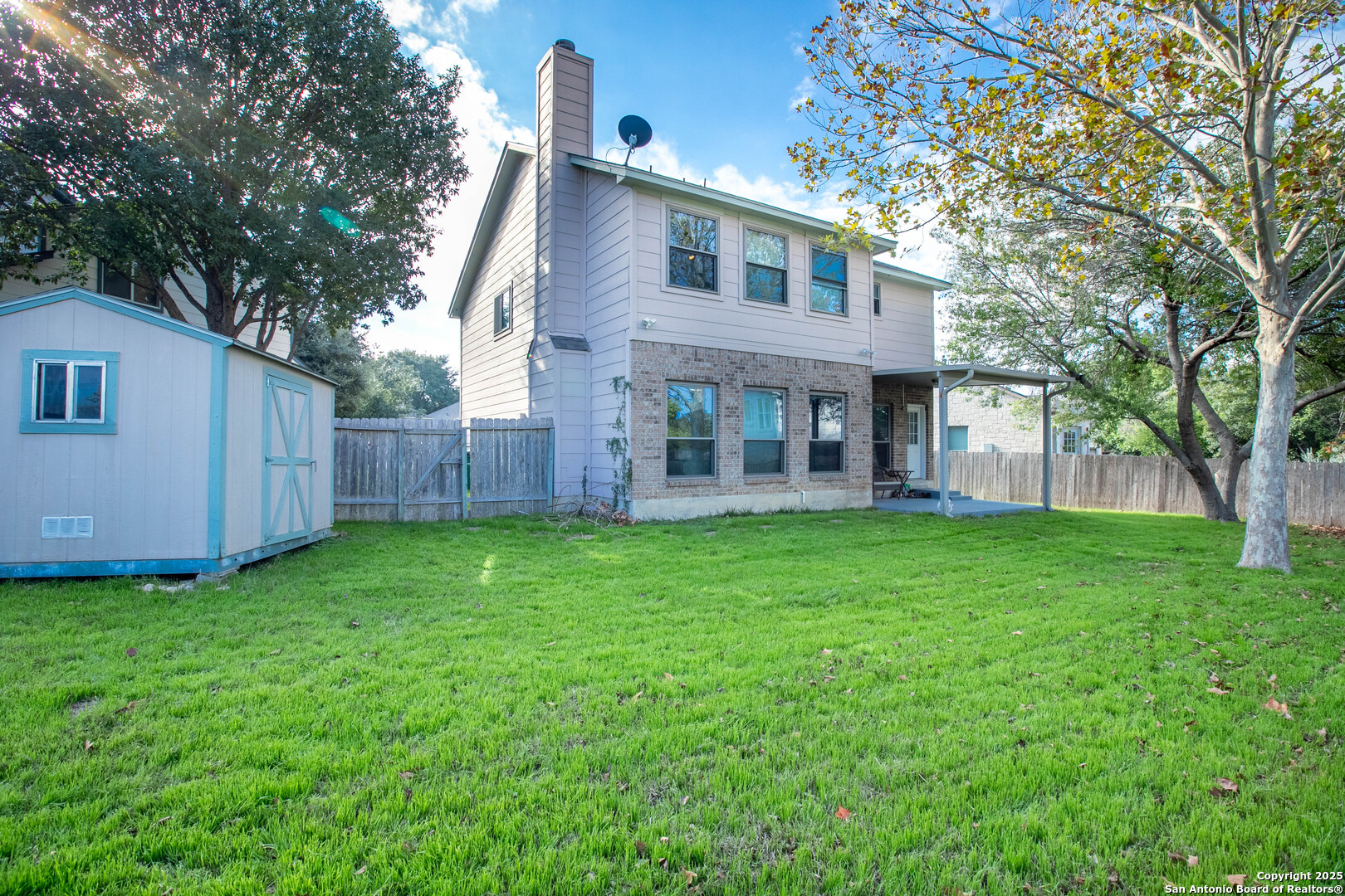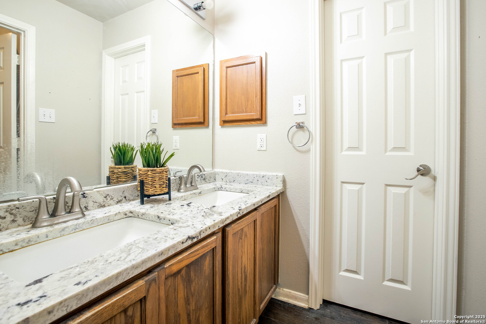 This lovely home is located in the beautiful subdivision of Oak Ridge Village. Nestled in a quiet cul-de-sac, this house has no carpet! The downstairs boasts a beautiful open floor plan, which is perfect for entertaining and relaxing after a long day. Your spacious living room also includes a cozy fireplace for those cold Texas nights. The kitchen offers granite counter tops and plenty of counter space for the chef in the family. The front room can be used as a formal dining room, office, or extra bedroom. The downstairs also offers a half bath. The upstairs features a second living area with plenty of natural light that can be used as an office, play area, or media room. Your extra large master bedroom offers stunning views of Thousand Oaks and is the perfect sanctuary at the end of the day. Your master bedroom offers a generous sized walk - in closet. The ensuite bathroom features granite counter tops and dual vanities. The upstairs includes three other bedrooms, so everyone can have their own room. The hall bath includes granite counter tops. The laundry room is conveniently located upstairs. The massive backyard is great for BBQs, family gatherings, and even a pool! Enjoy the community pool and other amenities the community has to offer.