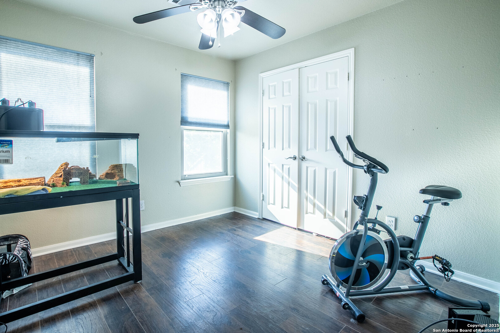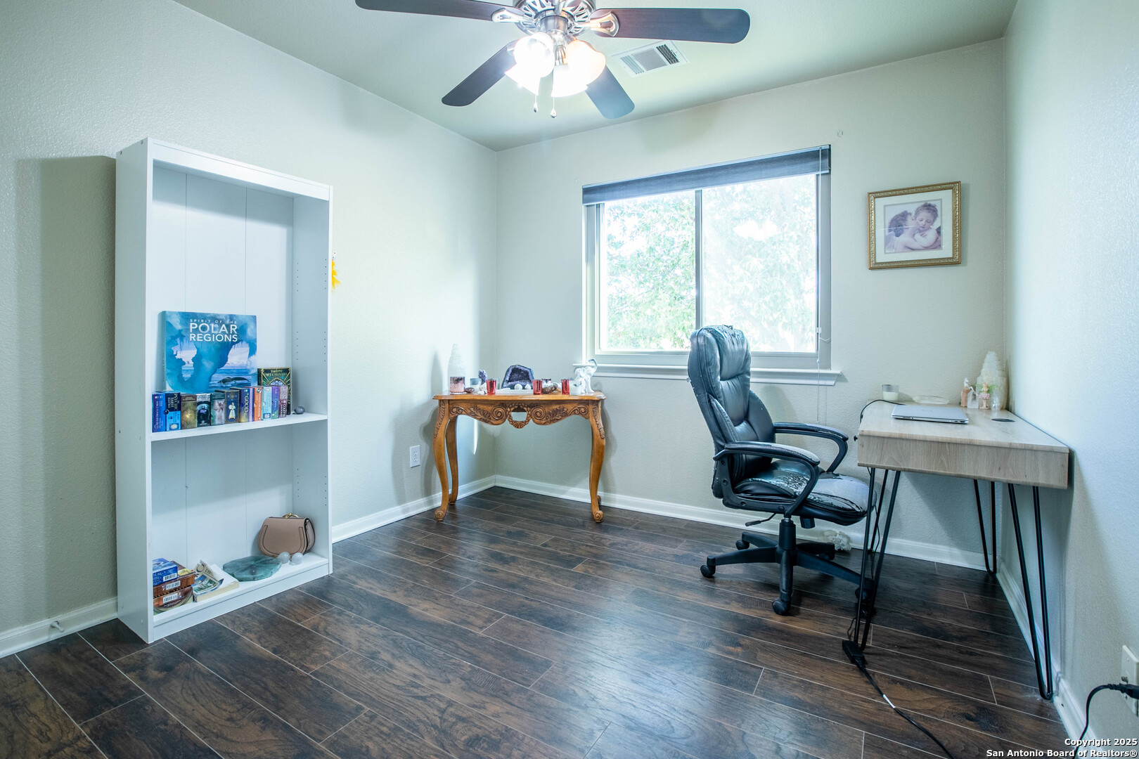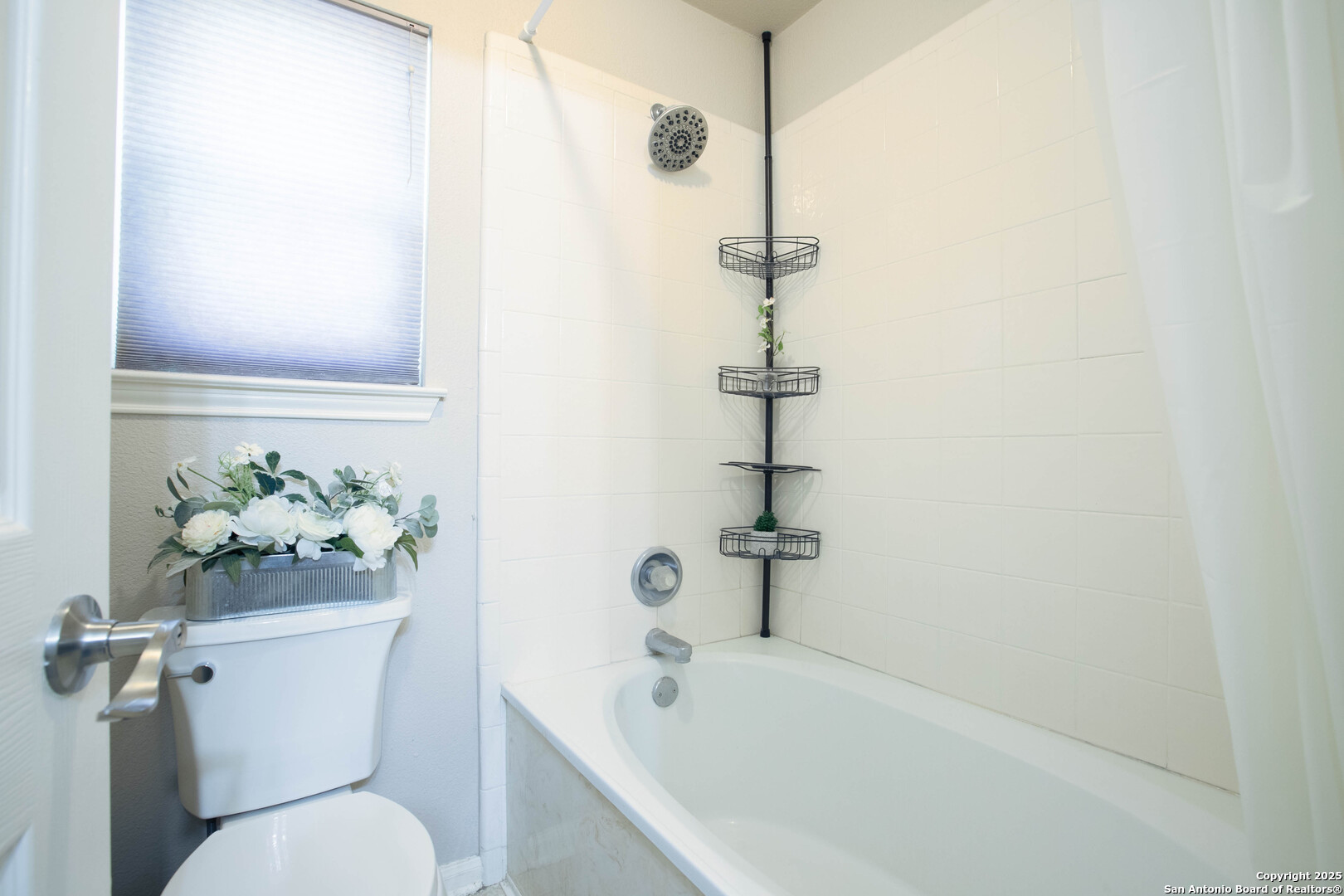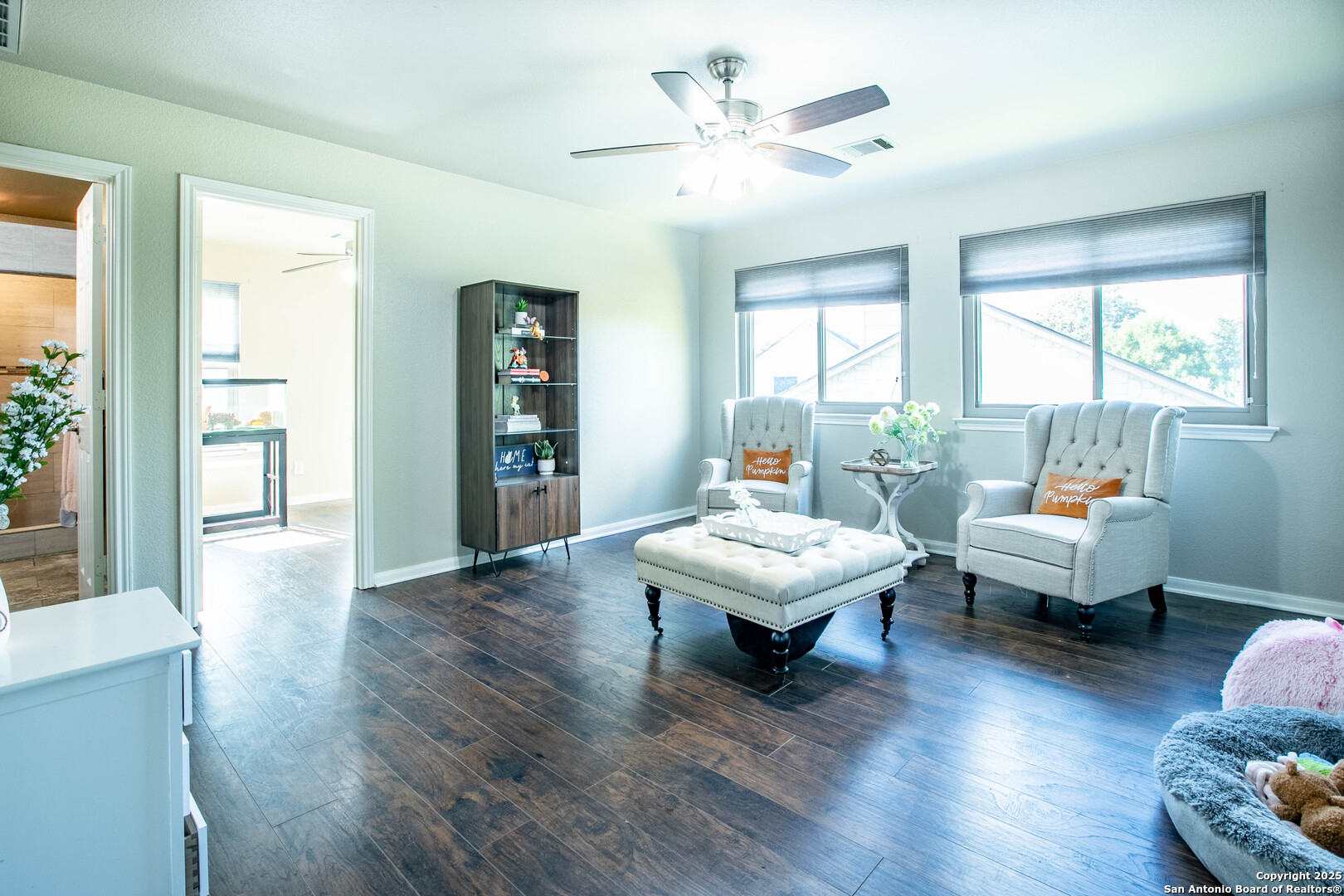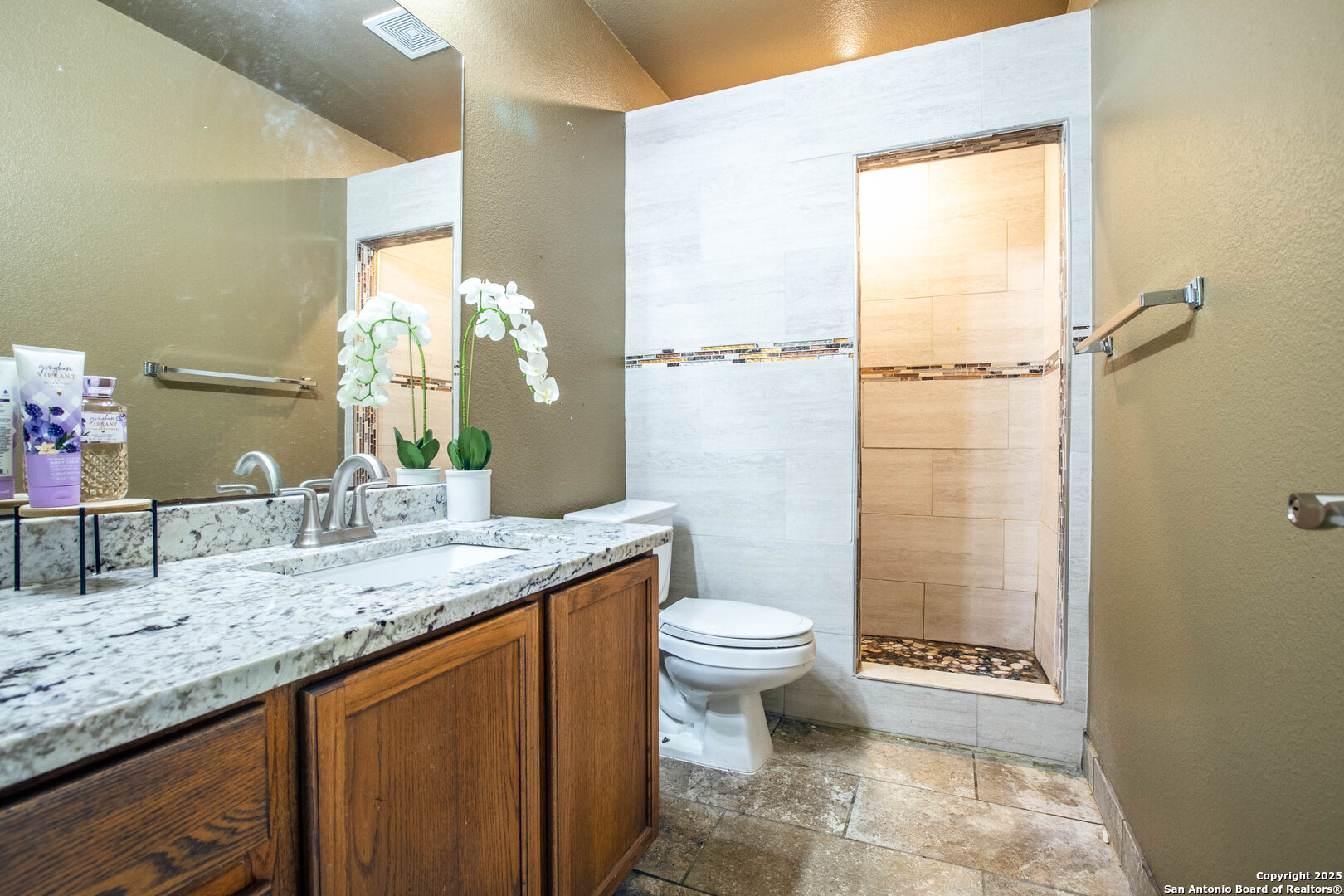 This lovely home is located in the beautiful subdivision of Oak Ridge Village. Nestled in a quiet cul-de-sac, this house has no carpet! The downstairs boasts a beautiful open floor plan, which is perfect for entertaining and relaxing after a long day. Your spacious living room also includes a cozy fireplace for those cold Texas nights. The kitchen offers granite counter tops and plenty of counter space for the chef in the family. The front room can be used as a formal dining room, office, or extra bedroom. The downstairs also offers a half bath. The upstairs features a second living area with plenty of natural light that can be used as an office, play area, or media room. Your extra large master bedroom offers stunning views of Thousand Oaks and is the perfect sanctuary at the end of the day. Your master bedroom offers a generous sized walk - in closet. The ensuite bathroom features granite counter tops and dual vanities. The upstairs includes three other bedrooms, so everyone can have their own room. The hall bath includes granite counter tops. The laundry room is conveniently located upstairs. The massive backyard is great for BBQs, family gatherings, and even a pool! Enjoy the community pool and other amenities the community has to offer.