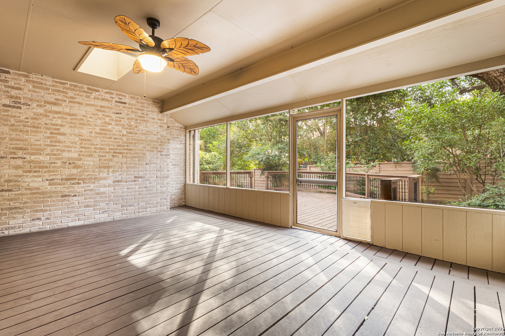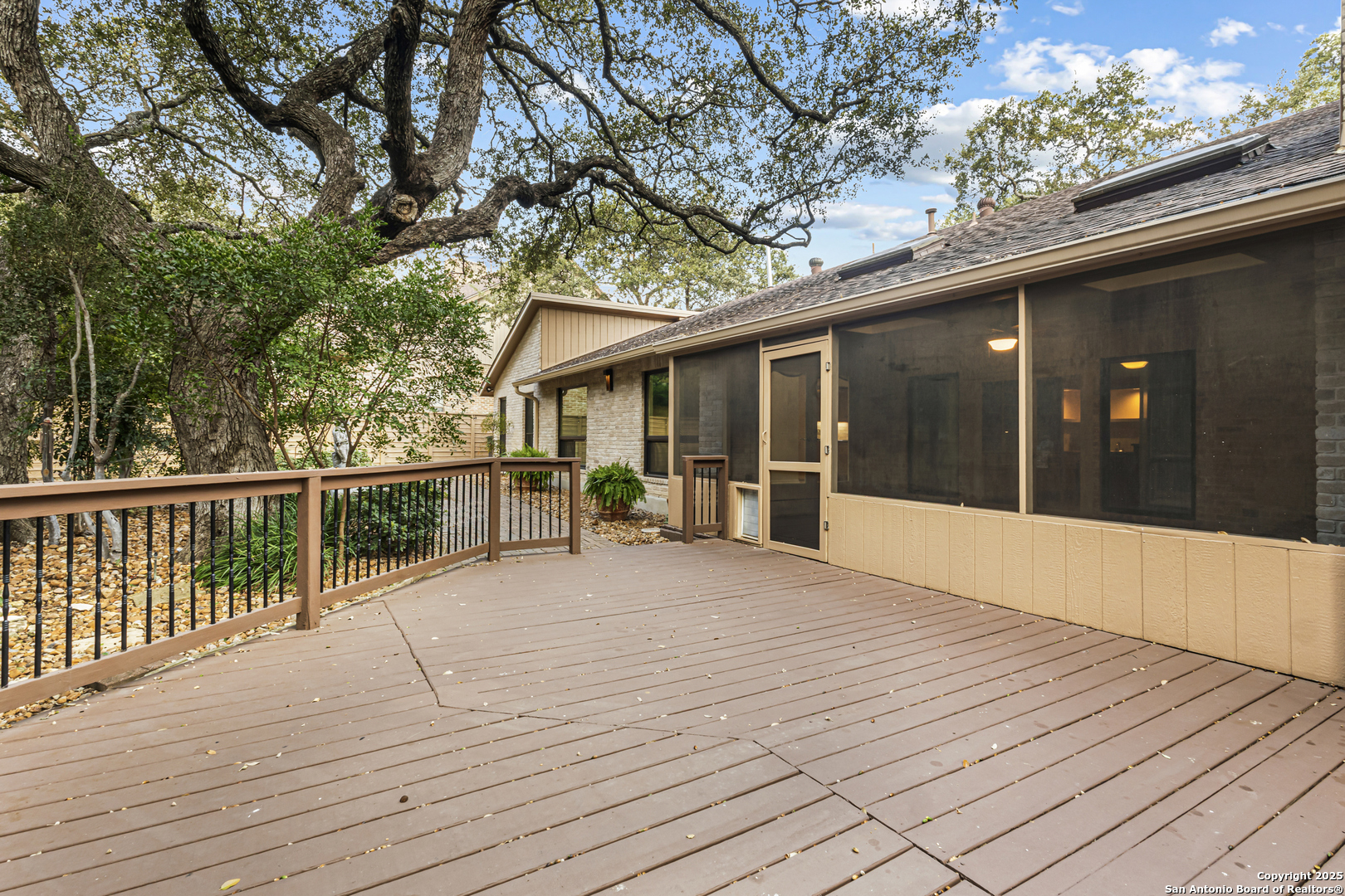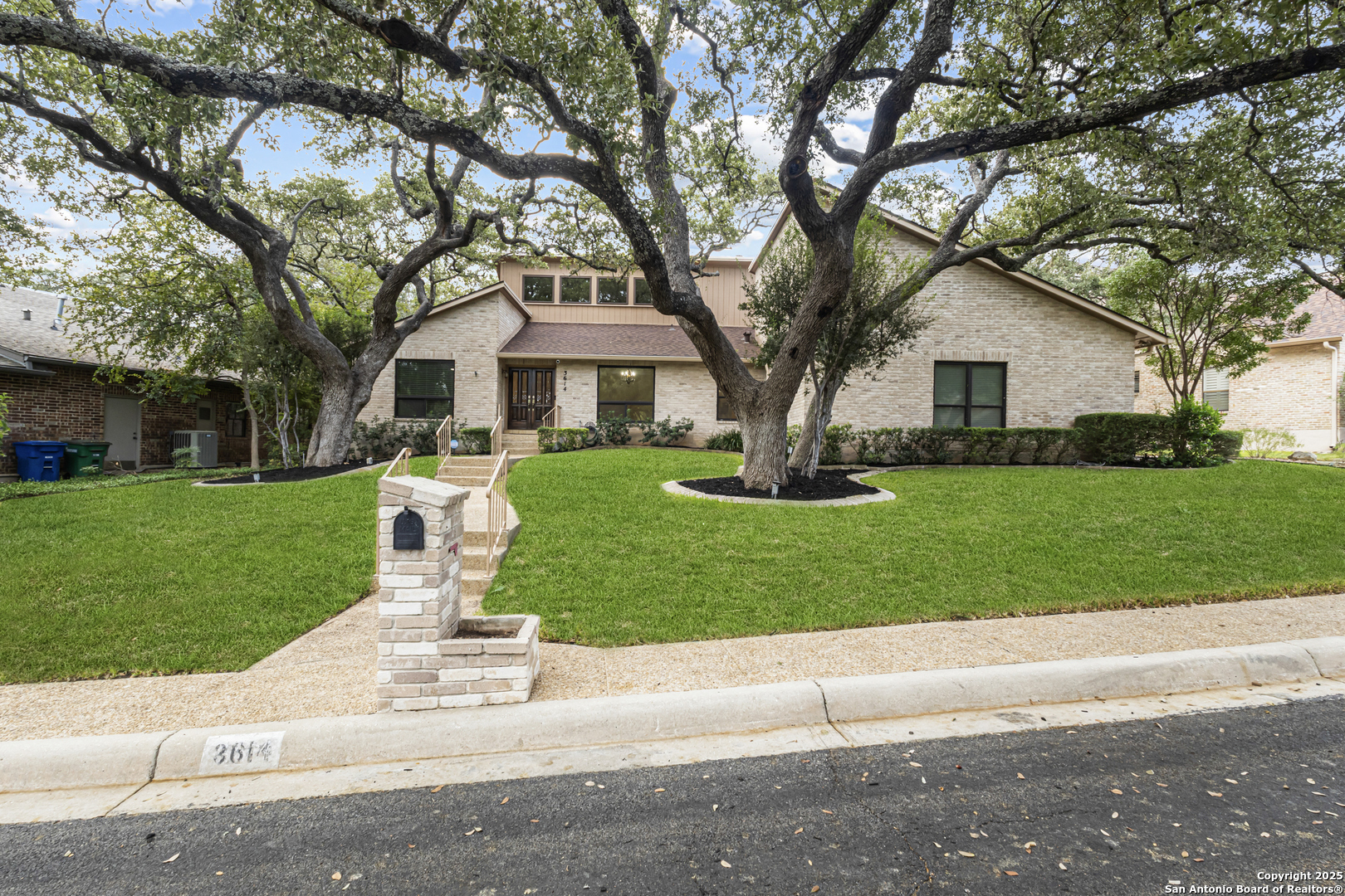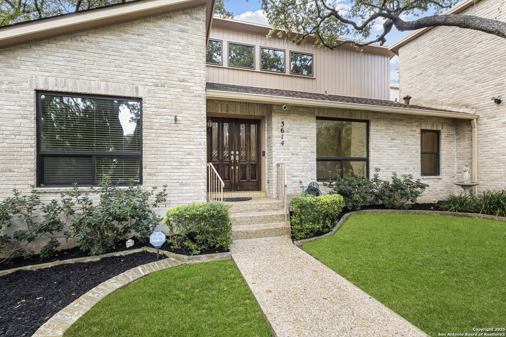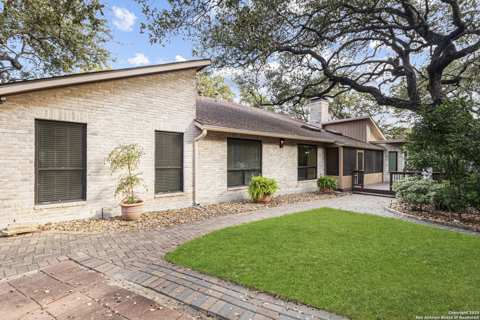 Exceptionally updated single-story home on a quiet cul-de-sac street. This stunning 4-bedroom, 2.5-bath home offers a split bedroom floorplan filled with natural light and recent upgrades throughout. The spacious living room features clerestory windows, built-in bookshelves, a wet bar, and a large fireplace - perfect for entertaining or relaxing. The remodeled primary suite spans the length of the home and showcases a luxurious, newly updated bath with a walk-in shower, dual vanities, and custom cabinetry. Enjoy modern comfort with two HVAC systems and new ductwork, updated roof, windows and doors, and Pergo flooring throughout. The kitchen features updated appliances, granite counters and opens to the breakfast area and screened-in porch - ideal for year-round outdoor enjoyment. You will find mature oak trees throughout, full sprinkler system, and yard lighting in both the front and back yards. Additional highlights include a side-entry garage, deck for entertaining, low-maintenance Fencecrete backyard fence, and freshly painted four-sides brick exterior. Located close to USAA, Medical Center, Alon Market and the convivences of North Central San Antonio.
