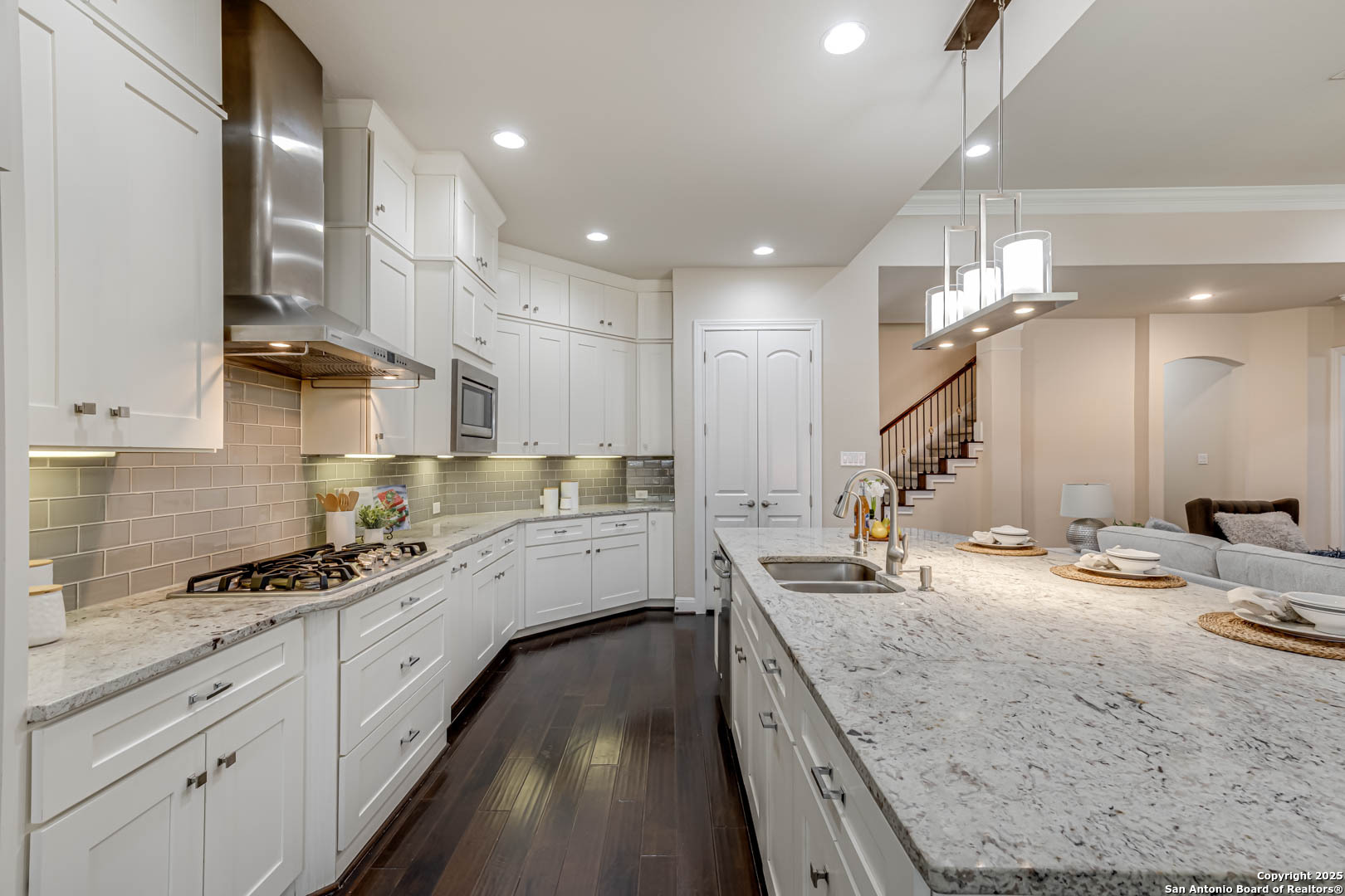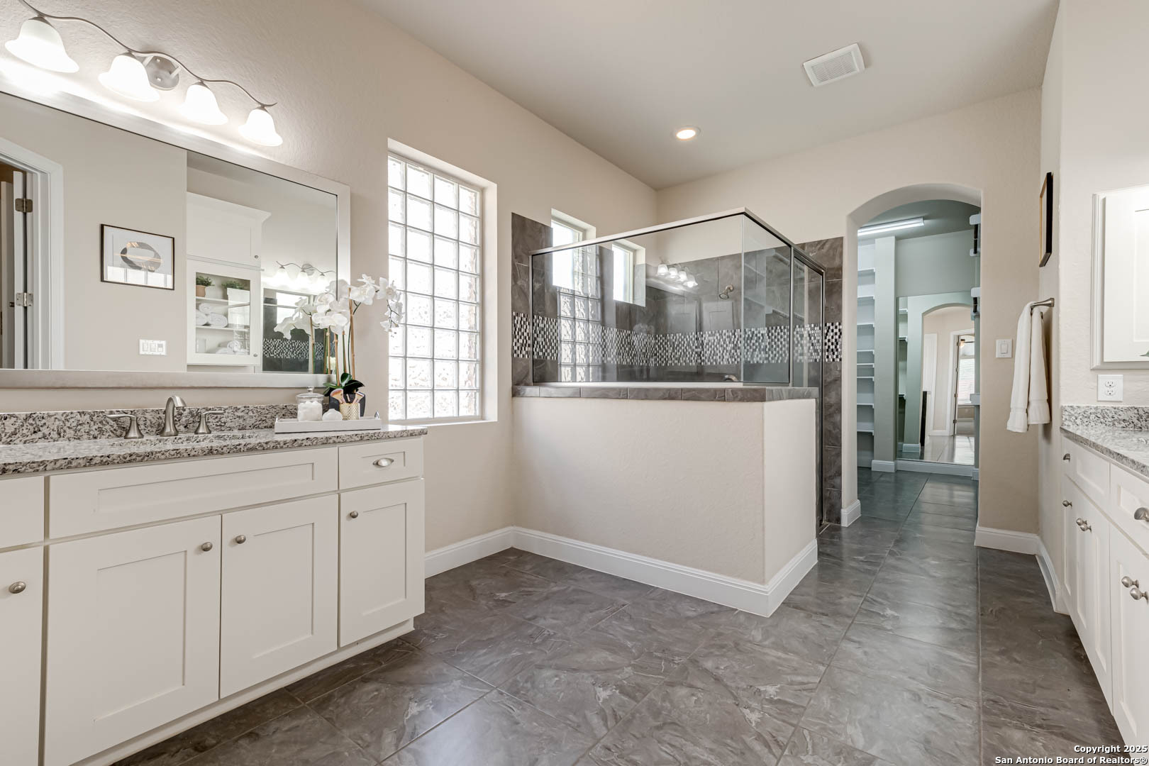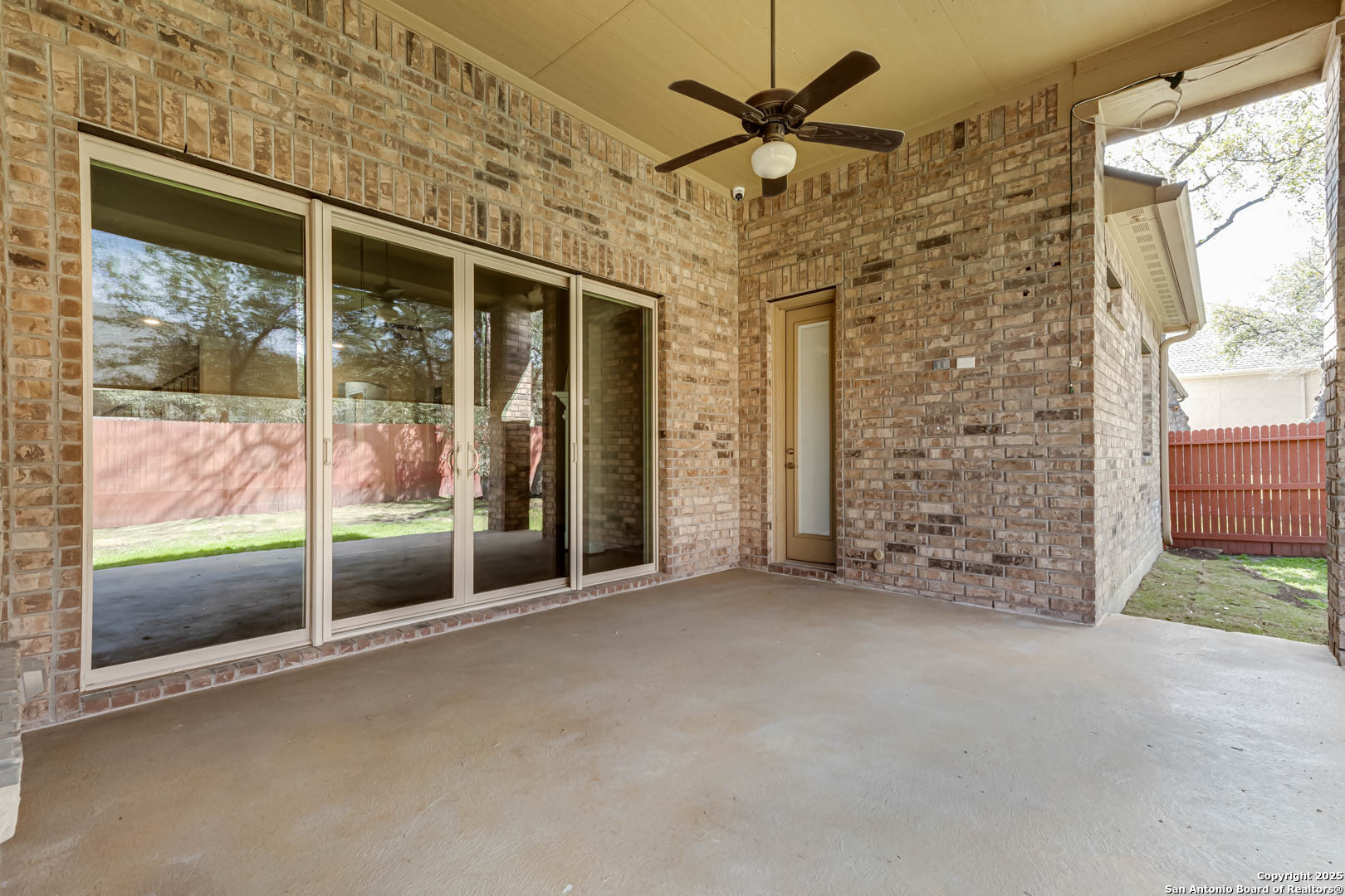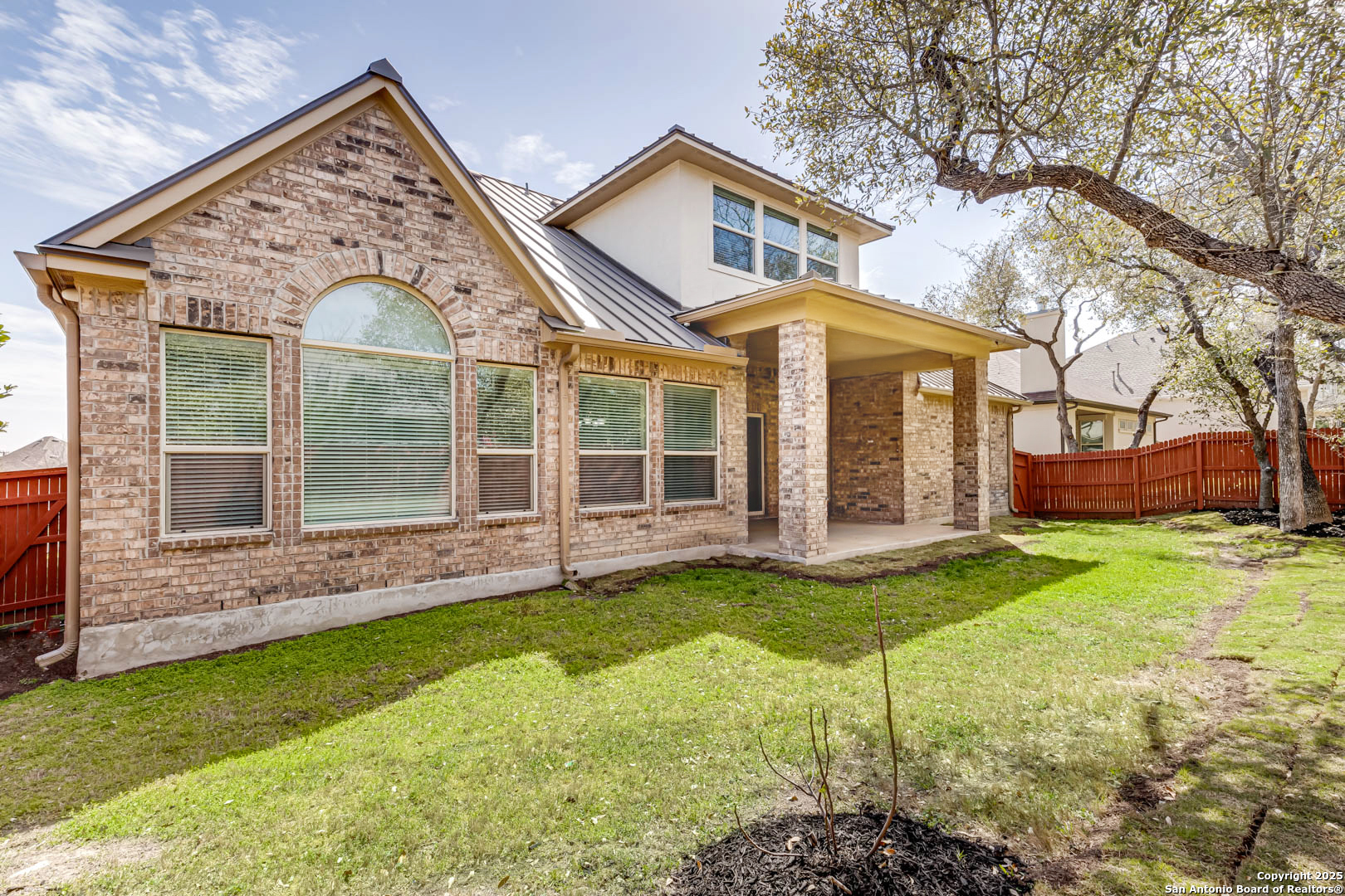 This architecturally distinct 1.5 custom David Weekly home is nestled in the exclusive gated community of Shavano Highlands & will take your breath away. Drive up to the manicured premium lot with metal roof, lush landscape, exquisite curb appeal & a 3 car garage. Features inc: Spacious rooms and efficient layout with, open floorplan, Dedicated office, Stunning hard wood flooring throughout traffic areas, Natural Sunlight flows through home, Gourmet chefs kitchen with upgraded granite counters, custom cabinets with lots of storage space, gas cooking, huge island, high-end stainless appliances and so much more! The large open family room is open to kitchen & perfect for entertaining with a custom sliding glass door out to the backyard. The master suite is split from the other bedrooms on its own private wing of the home and the ensuite adorns a huge dressing room and separate upgraded granite vanities & custom cabinetry. There is a dedicated media room that could also be used as a game room or 5th bedroom to accommodate family & guests. All bedrooms are downstairs and have their own bathroom. Upstairs features a HUGE game room & half bathroom. Walk out to your own private backyard paradise with an oversized covered patio on a quiet & serene culdesac lot. It couldn't get more perfect! Biking/jogging trails nearby, Very easy and quick access to great schools, major highways, RIM, La Cantera, UTSA, USAA, Medical Center etc. You must see it to appreciate all the exquisite details of this truly remarkable home!