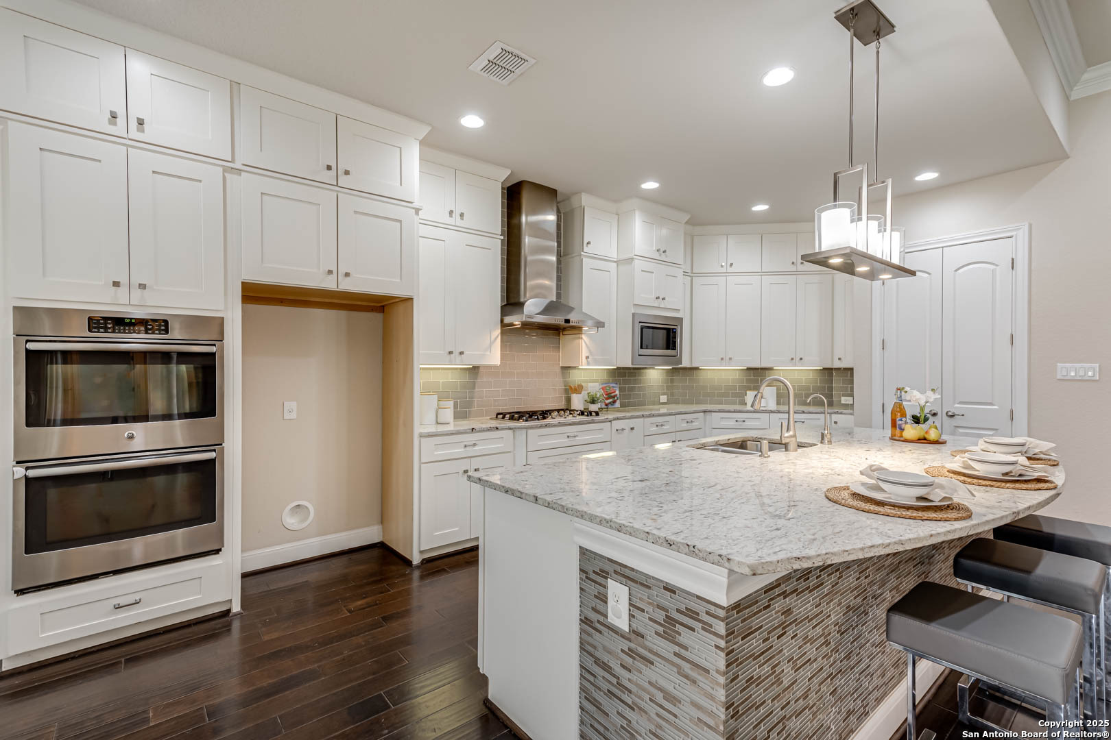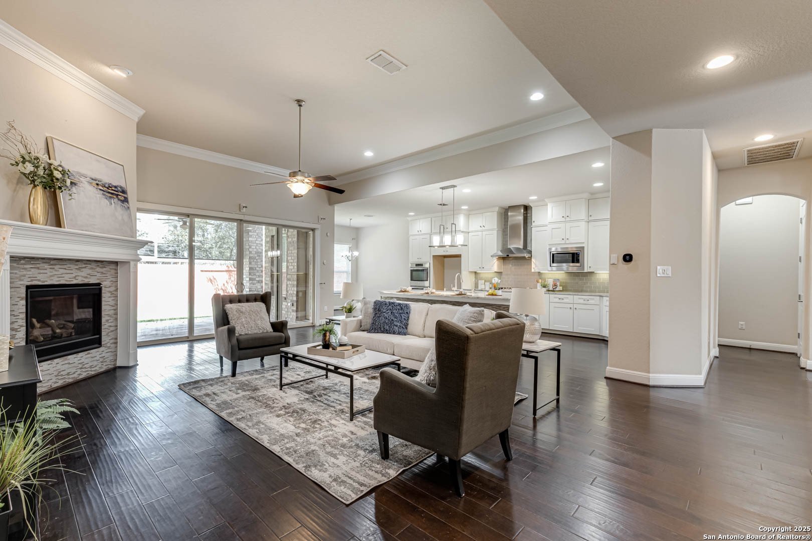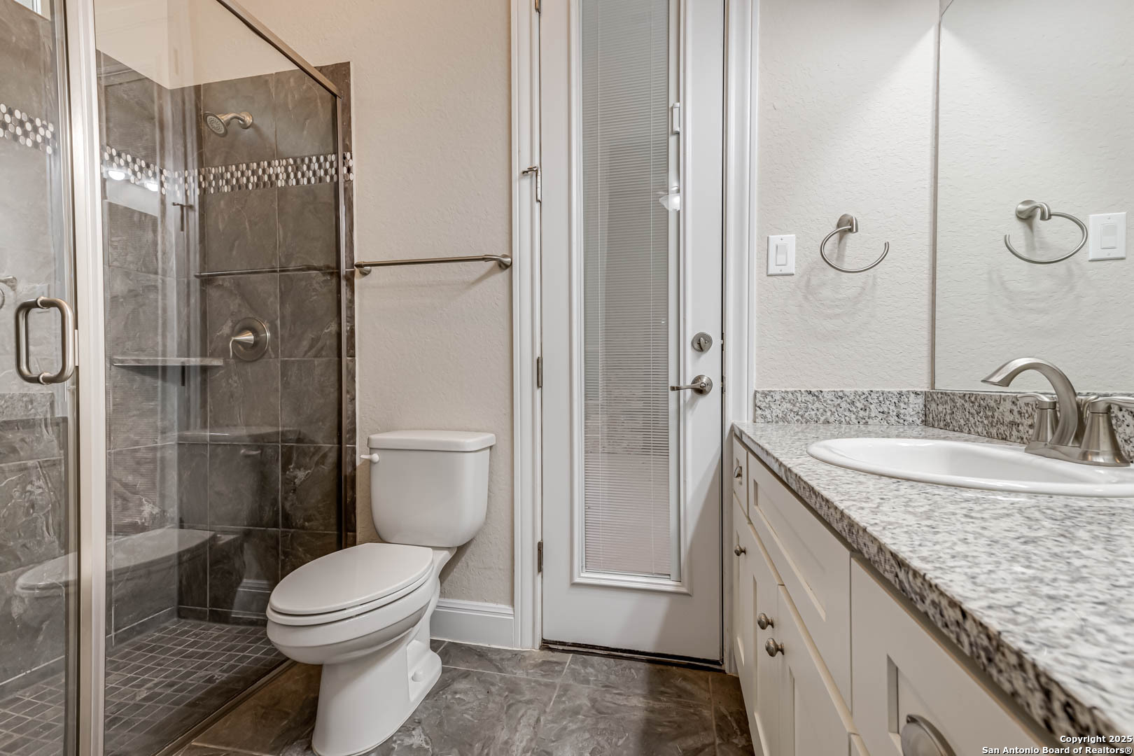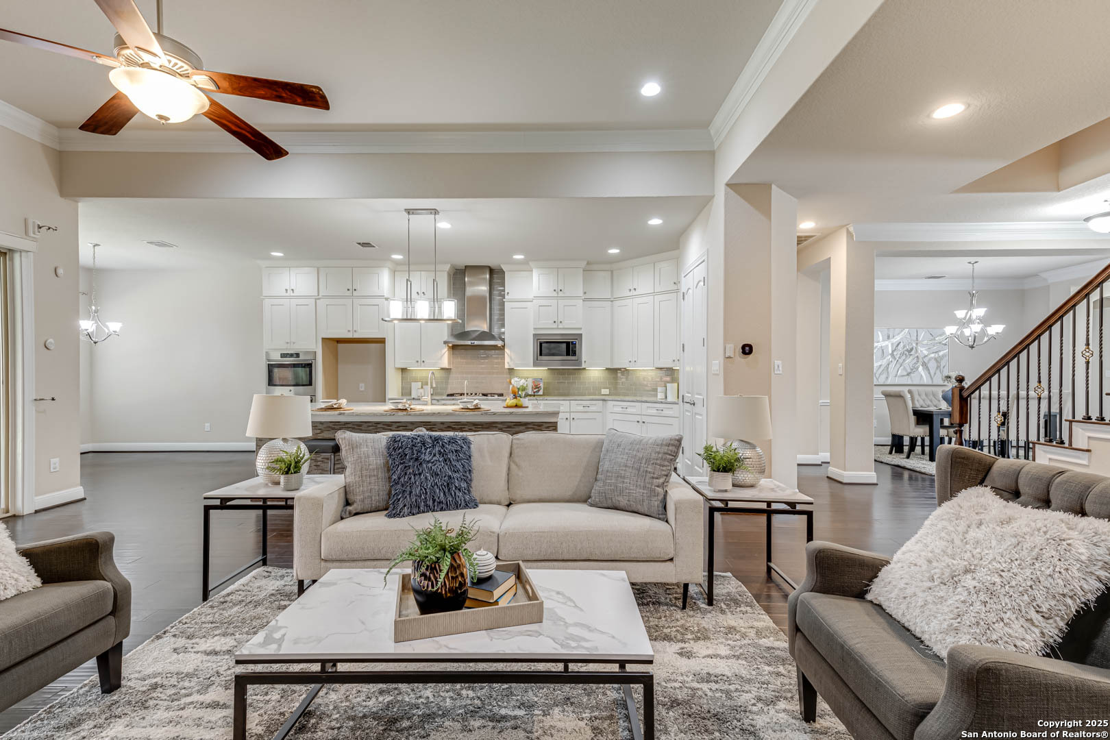 This architecturally distinct 1.5 custom David Weekly home is nestled in the exclusive gated community of Shavano Highlands & will take your breath away. Drive up to the manicured premium lot with metal roof, lush landscape, exquisite curb appeal & a 3 car garage. Features inc: Spacious rooms and efficient layout with, open floorplan, Dedicated office, Stunning hard wood flooring throughout traffic areas, Natural Sunlight flows through home, Gourmet chefs kitchen with upgraded granite counters, custom cabinets with lots of storage space, gas cooking, huge island, high-end stainless appliances and so much more! The large open family room is open to kitchen & perfect for entertaining with a custom sliding glass door out to the backyard. The master suite is split from the other bedrooms on its own private wing of the home and the ensuite adorns a huge dressing room and separate upgraded granite vanities & custom cabinetry. There is a dedicated media room that could also be used as a game room or 5th bedroom to accommodate family & guests. All bedrooms are downstairs and have their own bathroom. Upstairs features a HUGE game room & half bathroom. Walk out to your own private backyard paradise with an oversized covered patio on a quiet & serene culdesac lot. It couldn't get more perfect! Biking/jogging trails nearby, Very easy and quick access to great schools, major highways, RIM, La Cantera, UTSA, USAA, Medical Center etc. You must see it to appreciate all the exquisite details of this truly remarkable home!