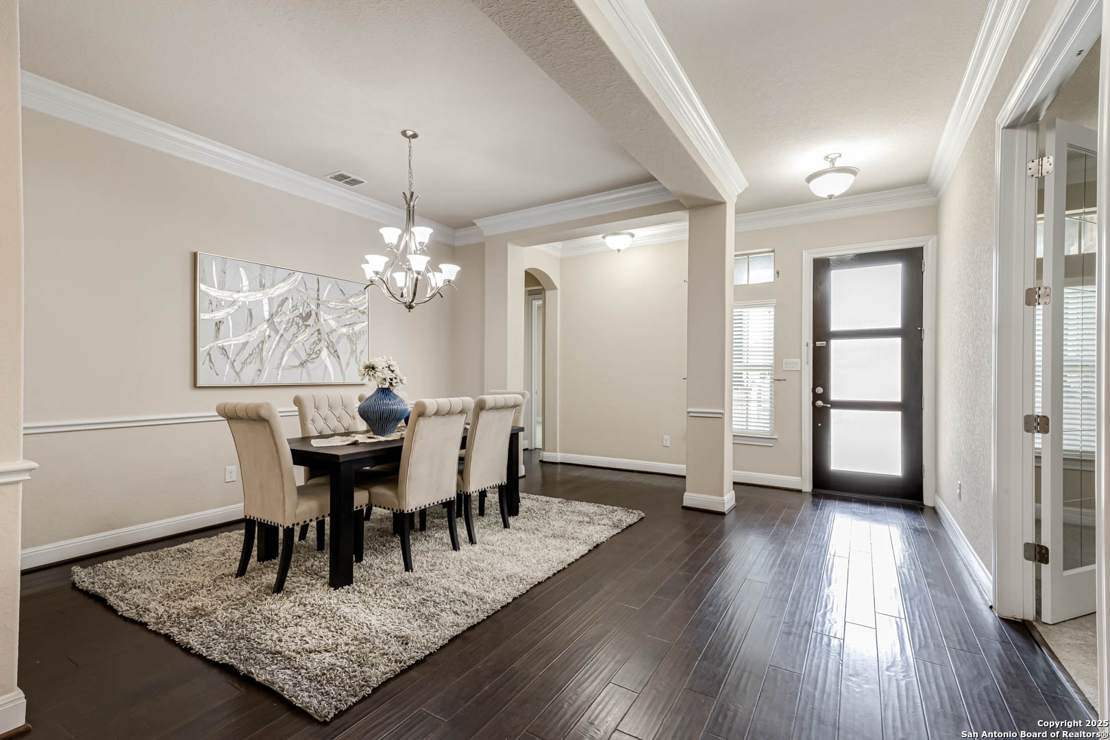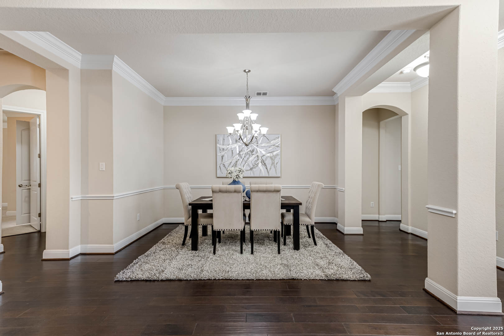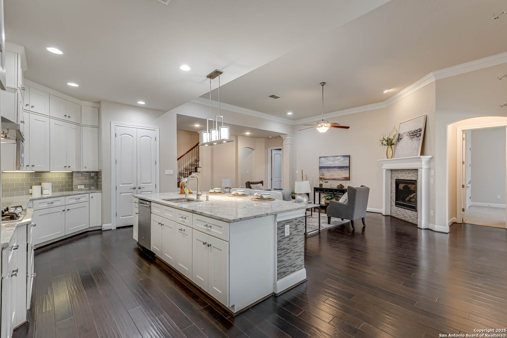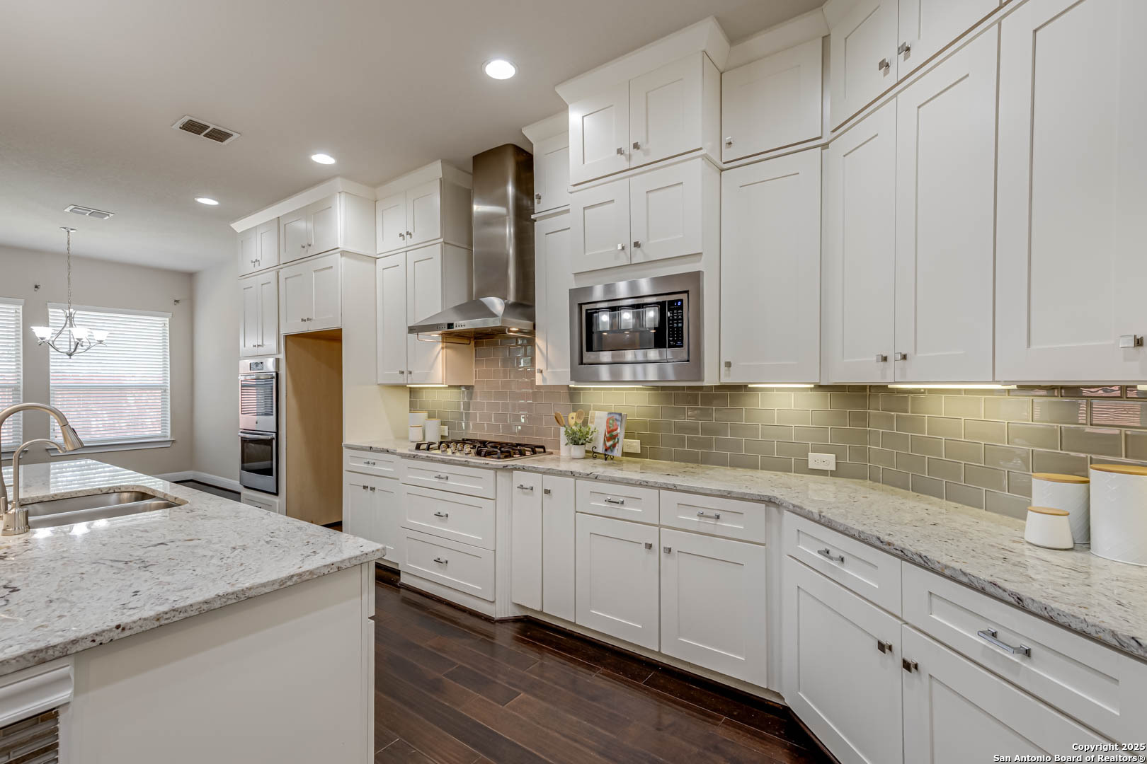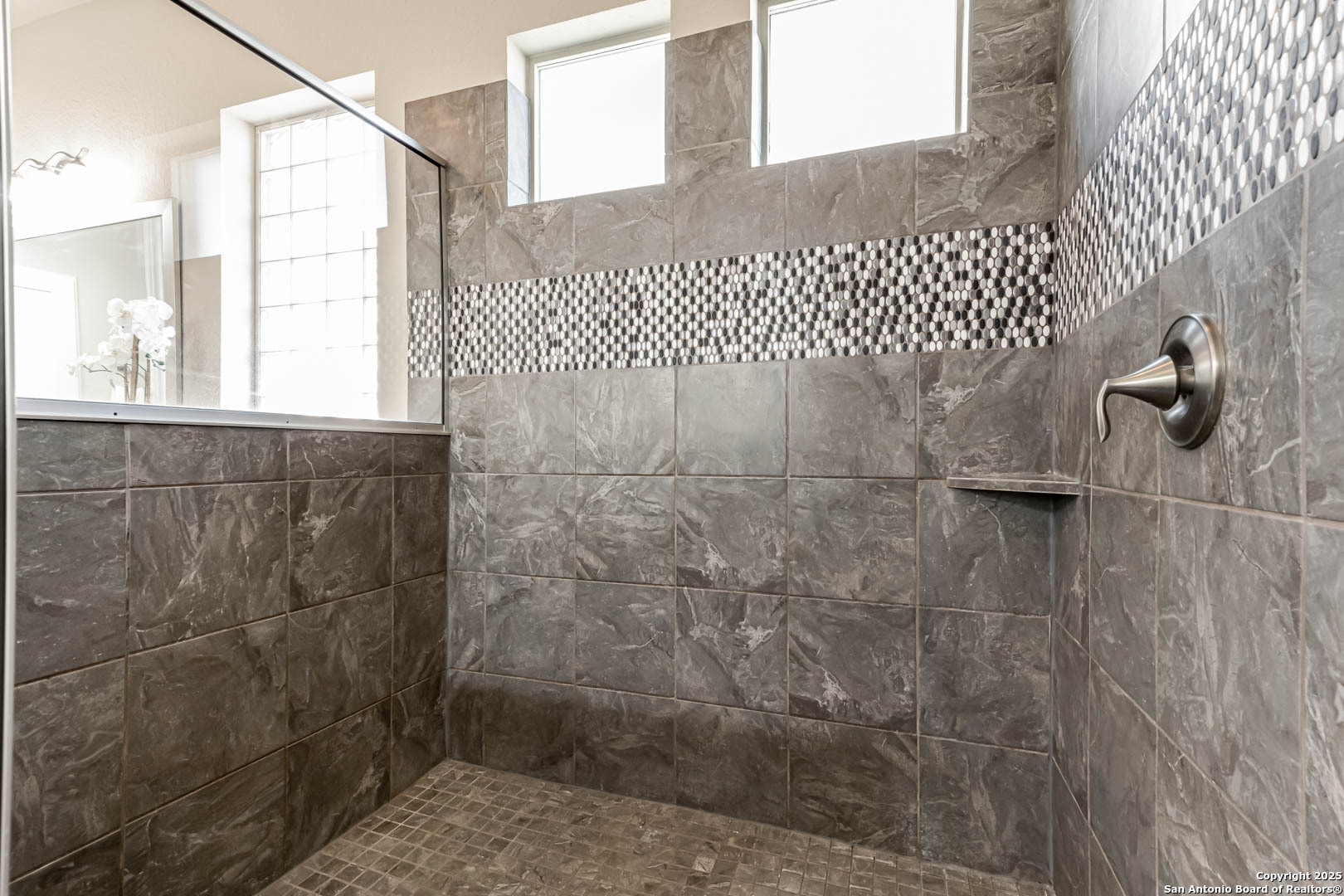 This architecturally distinct 1.5 custom David Weekly home is nestled in the exclusive gated community of Shavano Highlands & will take your breath away. Drive up to the manicured premium lot with metal roof, lush landscape, exquisite curb appeal & a 3 car garage. Features inc: Spacious rooms and efficient layout with, open floorplan, Dedicated office, Stunning hard wood flooring throughout traffic areas, Natural Sunlight flows through home, Gourmet chefs kitchen with upgraded granite counters, custom cabinets with lots of storage space, gas cooking, huge island, high-end stainless appliances and so much more! The large open family room is open to kitchen & perfect for entertaining with a custom sliding glass door out to the backyard. The master suite is split from the other bedrooms on its own private wing of the home and the ensuite adorns a huge dressing room and separate upgraded granite vanities & custom cabinetry. There is a dedicated media room that could also be used as a game room or 5th bedroom to accommodate family & guests. All bedrooms are downstairs and have their own bathroom. Upstairs features a HUGE game room & half bathroom. Walk out to your own private backyard paradise with an oversized covered patio on a quiet & serene culdesac lot. It couldn't get more perfect! Biking/jogging trails nearby, Very easy and quick access to great schools, major highways, RIM, La Cantera, UTSA, USAA, Medical Center etc. You must see it to appreciate all the exquisite details of this truly remarkable home!