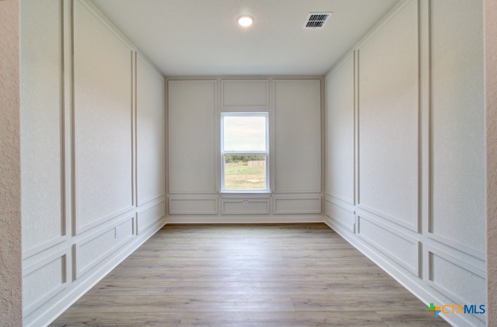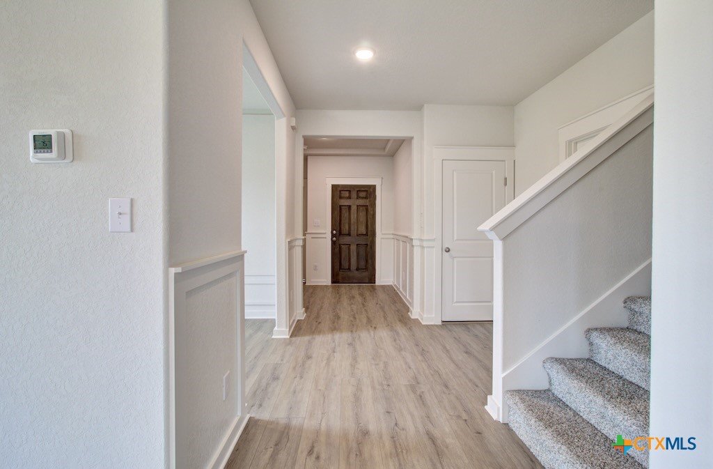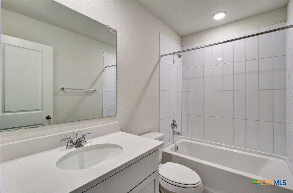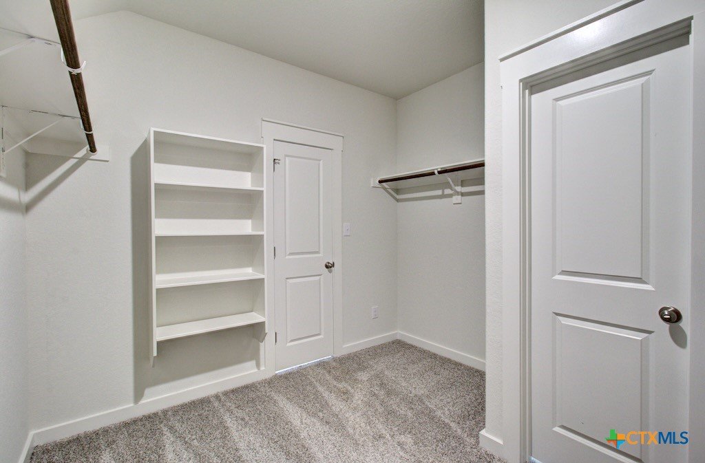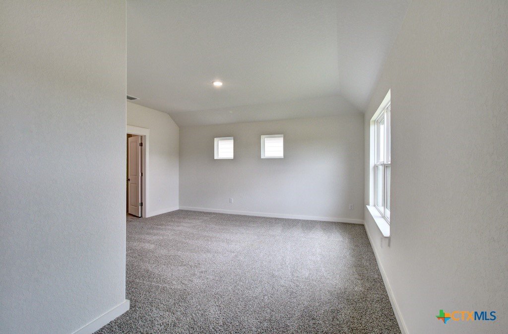 Greenbelt lot and Woodworking Details, this 2830 square foot two story home in the desirable Cloud Country community features 5 bedrooms and 3 full bathrooms. A secondary bedroom is located on the main level, perfect for guests or a home office. The kitchen offers white cabinetry, white countertops, a tile backsplash, pendant lighting, a stainless steel sink, and a large island that opens to the living area. A ceiling fan enhances comfort in the living room. The laundry room includes open shelving and a hanging bar for added function. The enlarged pantry provides excellent storage. Upstairs, enjoy a versatile game room and a convenient storage closet under the stairs. The private owner's suite is located at the back of the home, with an upgraded bathroom that includes a tiled shower, separate garden tub with natural light, double vanity, tall mirror, and linen closet. An extended covered patio offers outdoor living space for relaxing or entertaining.