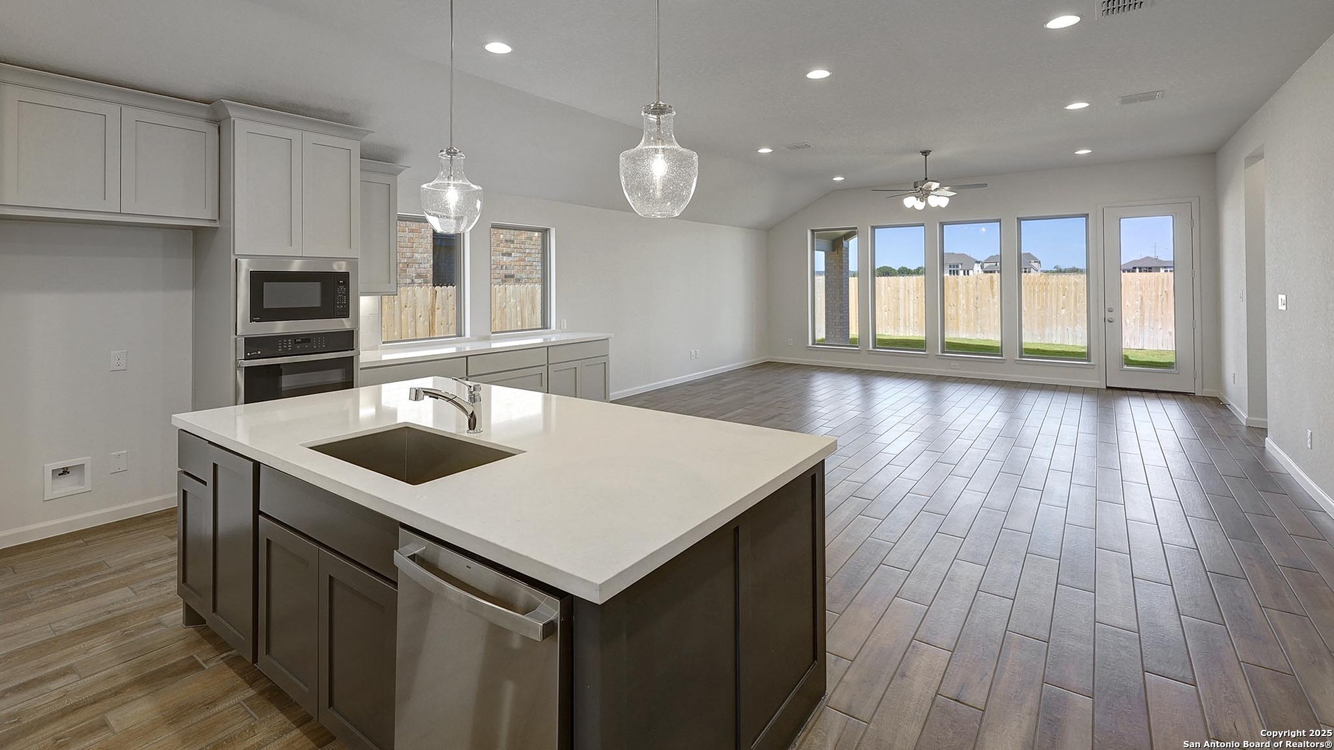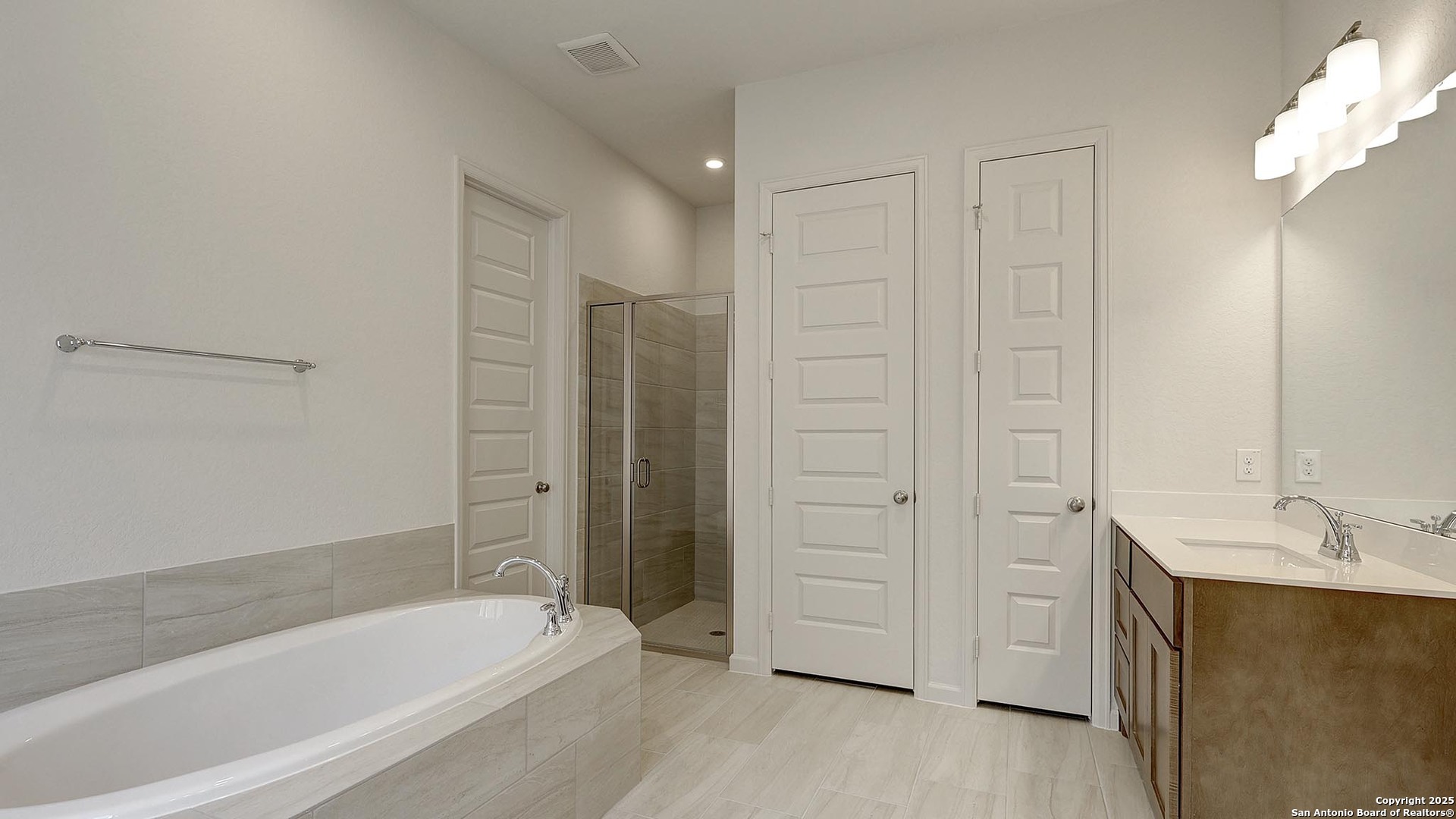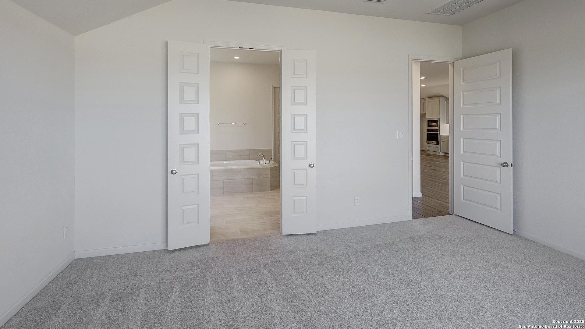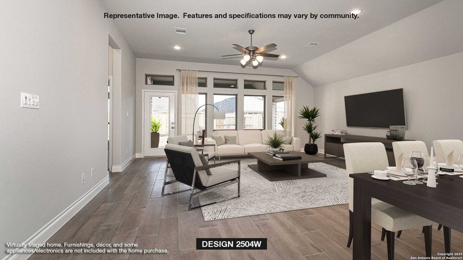 Home office with French doors set at entry with 12-foot ceiling. Extended entry leads to open kitchen, dining area and family room. Kitchen features corner walk-in pantry, generous counter space, 5-burner gas cooktop and island with built-in seating space. Dining area flows into family room with wall of windows. Primary suite includes double-door entry to primary bath with dual vanities, garden tub, separate glass-enclosed shower and two large walk-in closets. A guest suite with private bath adds to this spacious one-story home. Extended covered backyard patio and 5-zone sprinkler system. Mud room off two-car garage.