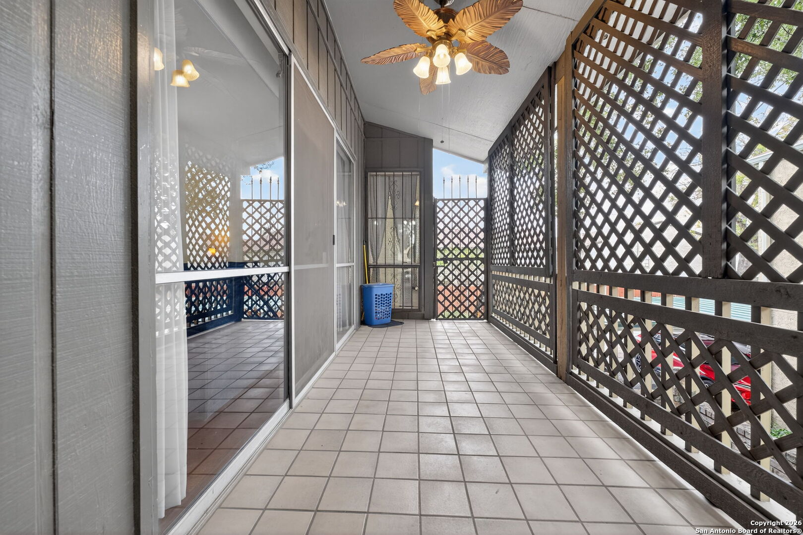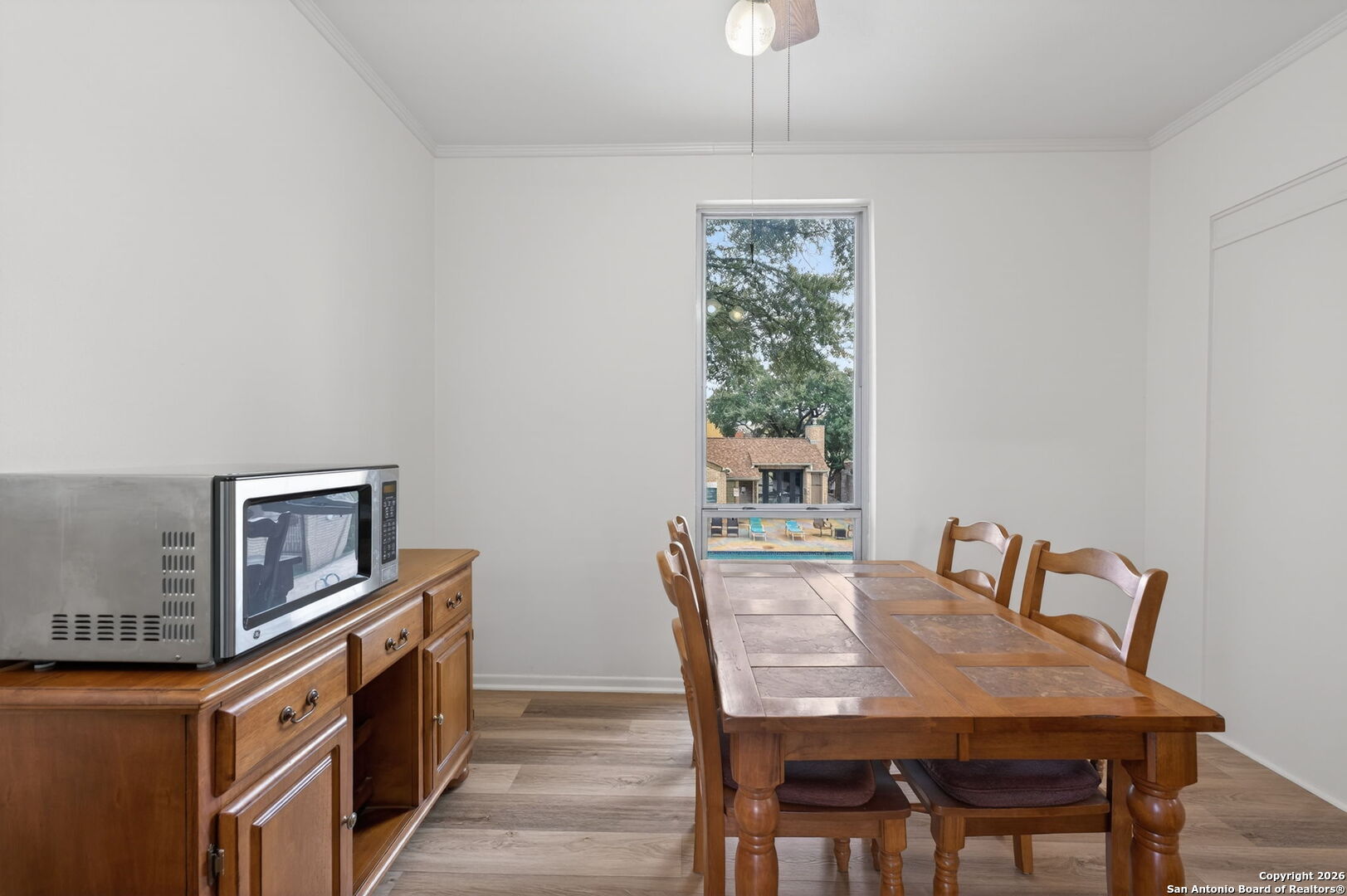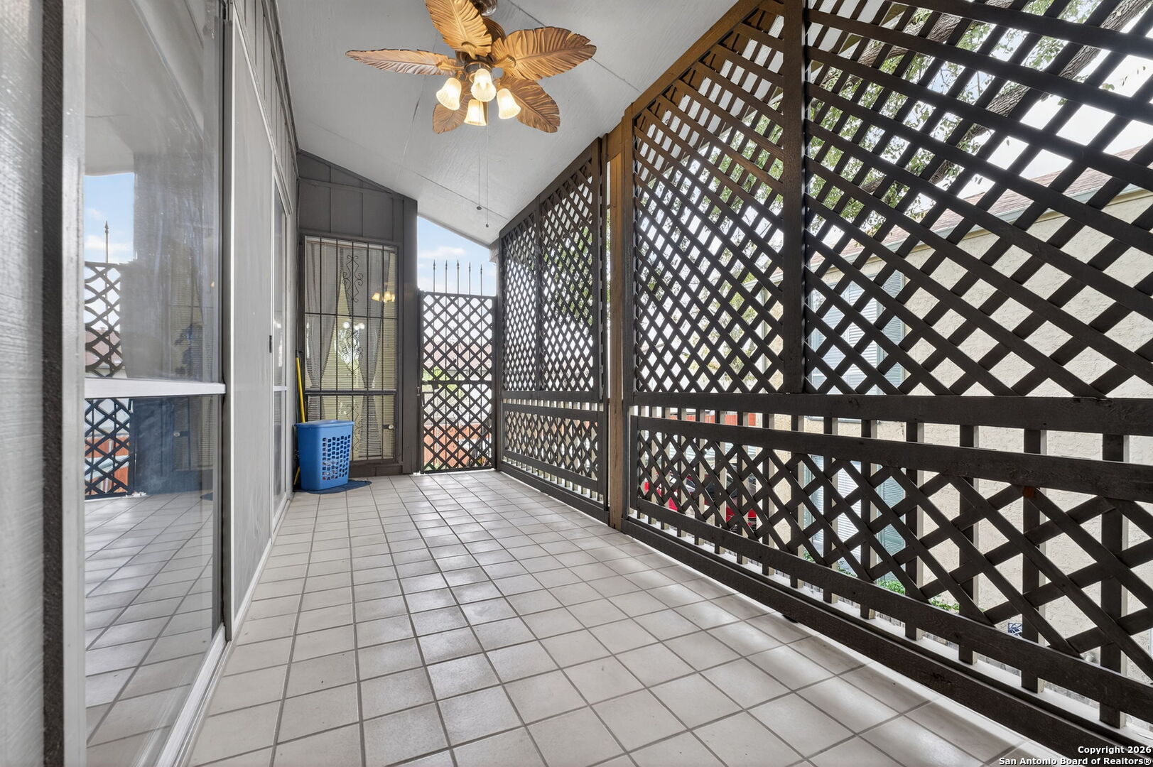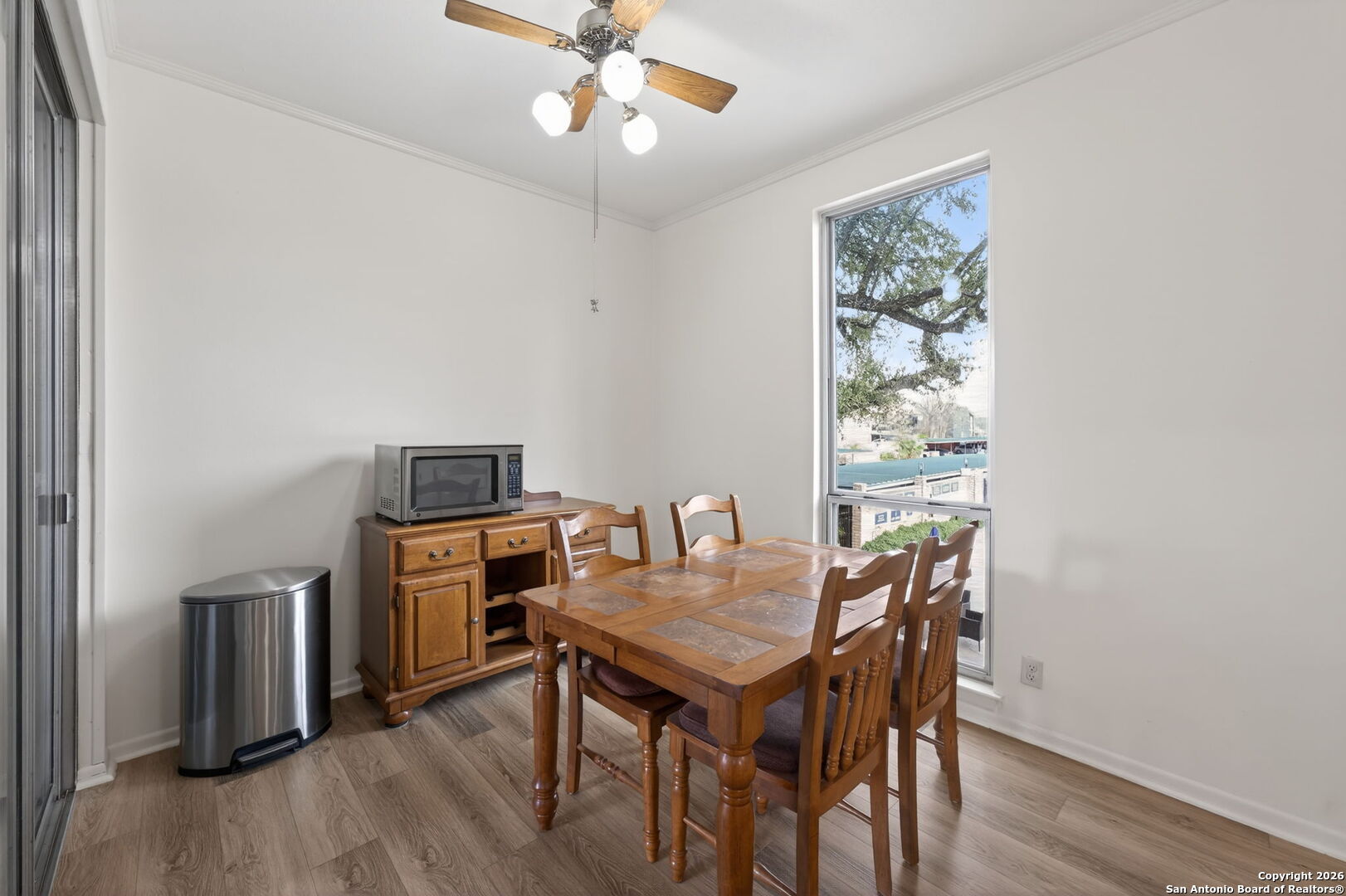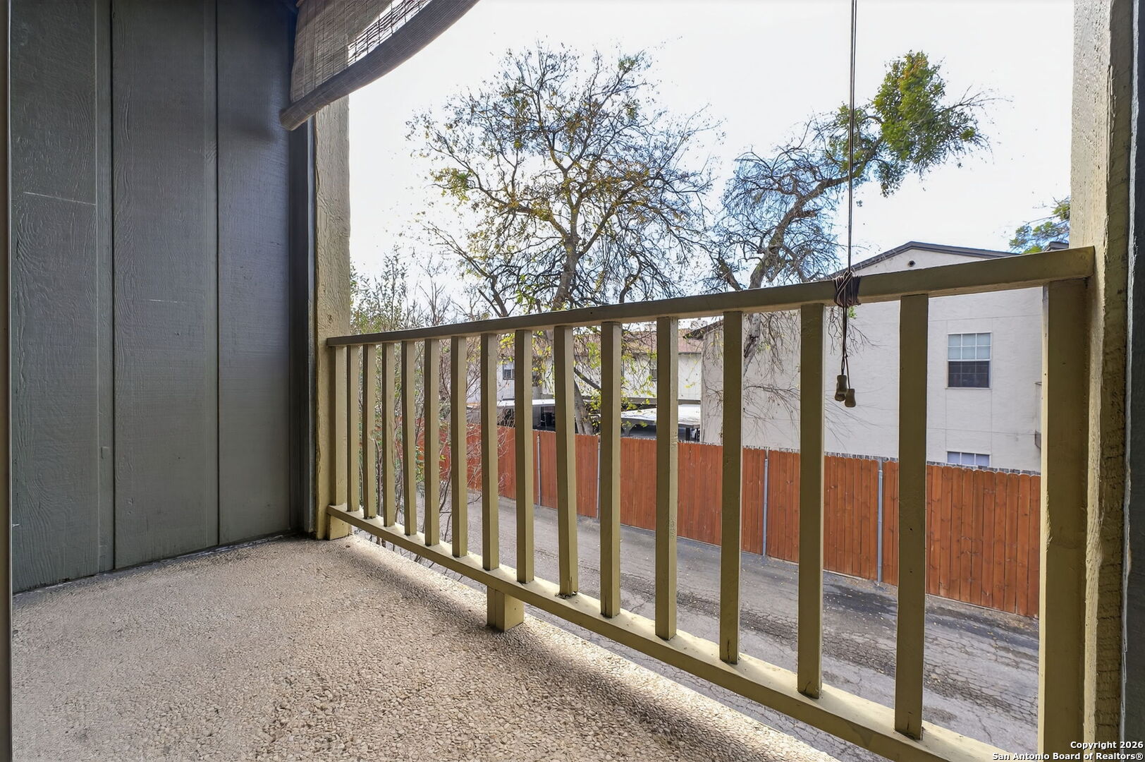 Motivated Sellers, that have taken well care of this 2 bed 2 bath second floor condo featuring rare, direct pool views from both the dining room and breakfast area. Enjoy the luxury of waking up to serene water views that only a handful of units offer. Monthly condo dues of $572 cover water, gas, trash service, four covered parking spaces, exterior insurance including roof and fire, landscaping, pool upkeep, and general maintenance. Residents also benefit from commercial electric service for reduced utility costs. Inside you'll find fresh paint, newly painted kitchen cabinets, European Oak luxury vinyl plank flooring in the kitchen, and a brand new stainless steel dishwasher. The kitchen showcases charming Saltillo tile countertops and flows into a spacious dining area highlighted by a large picture window overlooking the pool. The living space features engineered hardwood floors, while the bedrooms and dining area are comfortably carpeted. Ceiling fans throughout, oversized walk in closets in both bedrooms, and a primary suite with separate tub and walk in shower add to the comfort. Two private patios offer peaceful outdoor living spaces, one off the living room and another off the secondary bedroom, with one featuring tile flooring and a ceiling fan. Additional features include a full size washer and dryer, side by side refrigerator with ice and water, and double pane windows. Located in a gated community within highly desirable Northeast ISD and just minutes from shopping, schools, and major highways. All utilities are included except electricity. Valet trash service included. Schedule your showing today and secure one of the few pool facing units in the community.