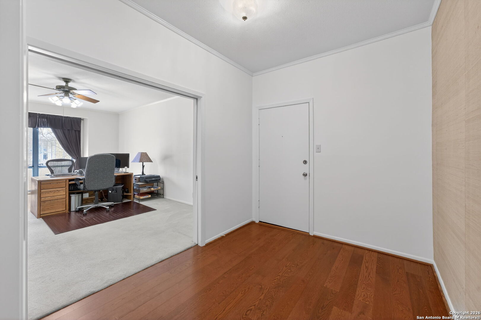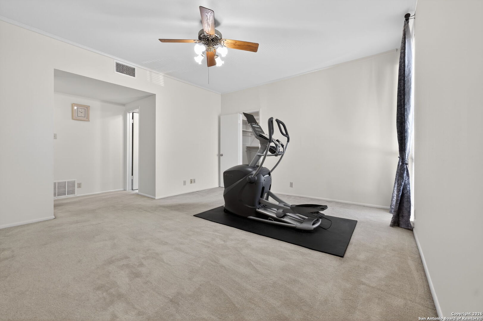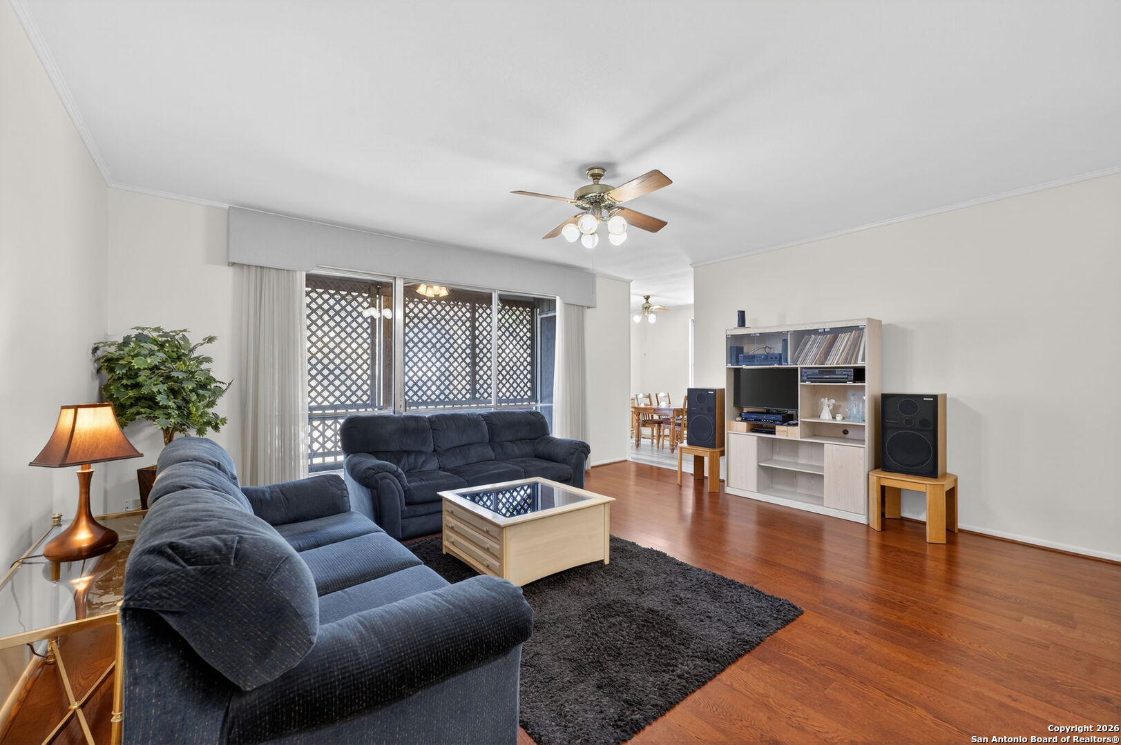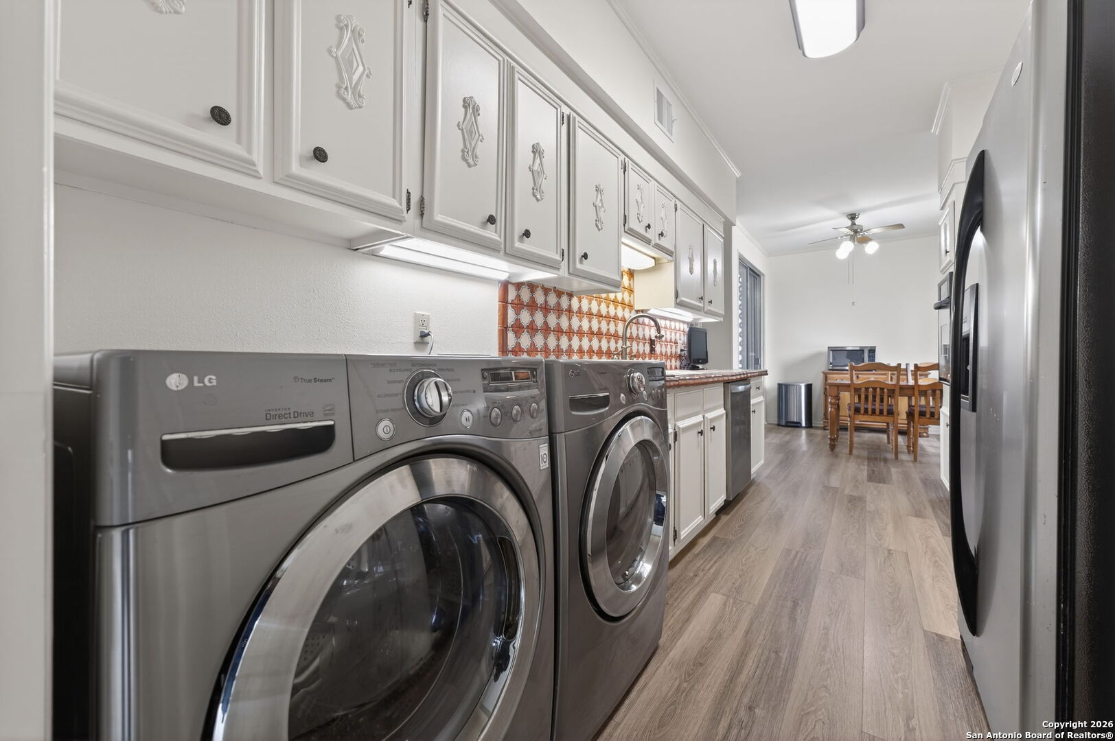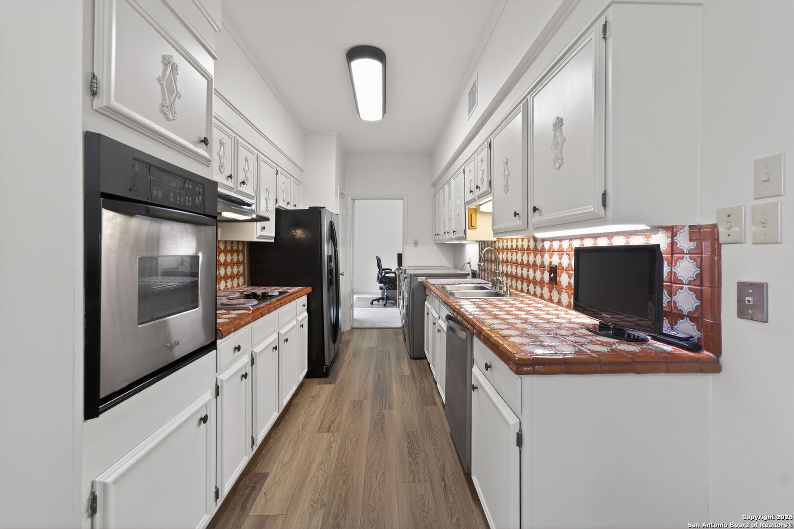 Motivated Sellers, that have taken well care of this 2 bed 2 bath second floor condo featuring rare, direct pool views from both the dining room and breakfast area. Enjoy the luxury of waking up to serene water views that only a handful of units offer. Monthly condo dues of $572 cover water, gas, trash service, four covered parking spaces, exterior insurance including roof and fire, landscaping, pool upkeep, and general maintenance. Residents also benefit from commercial electric service for reduced utility costs. Inside you'll find fresh paint, newly painted kitchen cabinets, European Oak luxury vinyl plank flooring in the kitchen, and a brand new stainless steel dishwasher. The kitchen showcases charming Saltillo tile countertops and flows into a spacious dining area highlighted by a large picture window overlooking the pool. The living space features engineered hardwood floors, while the bedrooms and dining area are comfortably carpeted. Ceiling fans throughout, oversized walk in closets in both bedrooms, and a primary suite with separate tub and walk in shower add to the comfort. Two private patios offer peaceful outdoor living spaces, one off the living room and another off the secondary bedroom, with one featuring tile flooring and a ceiling fan. Additional features include a full size washer and dryer, side by side refrigerator with ice and water, and double pane windows. Located in a gated community within highly desirable Northeast ISD and just minutes from shopping, schools, and major highways. All utilities are included except electricity. Valet trash service included. Schedule your showing today and secure one of the few pool facing units in the community.