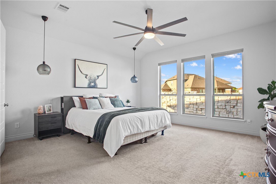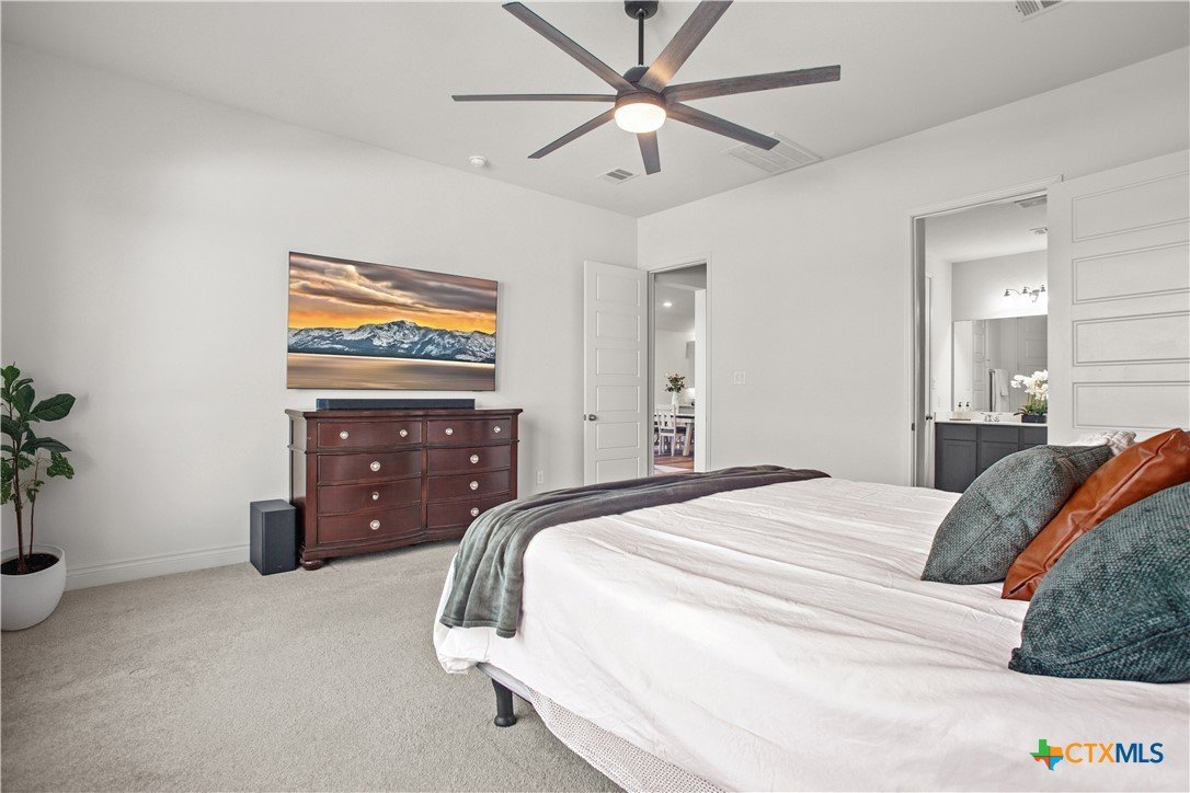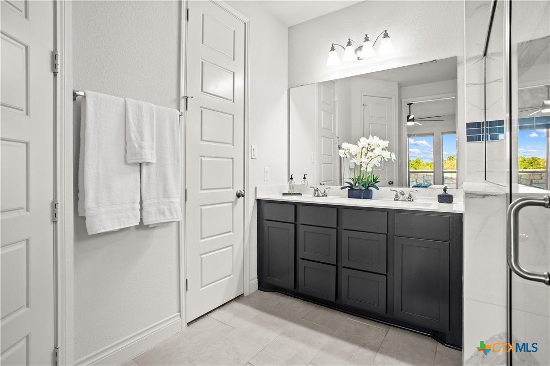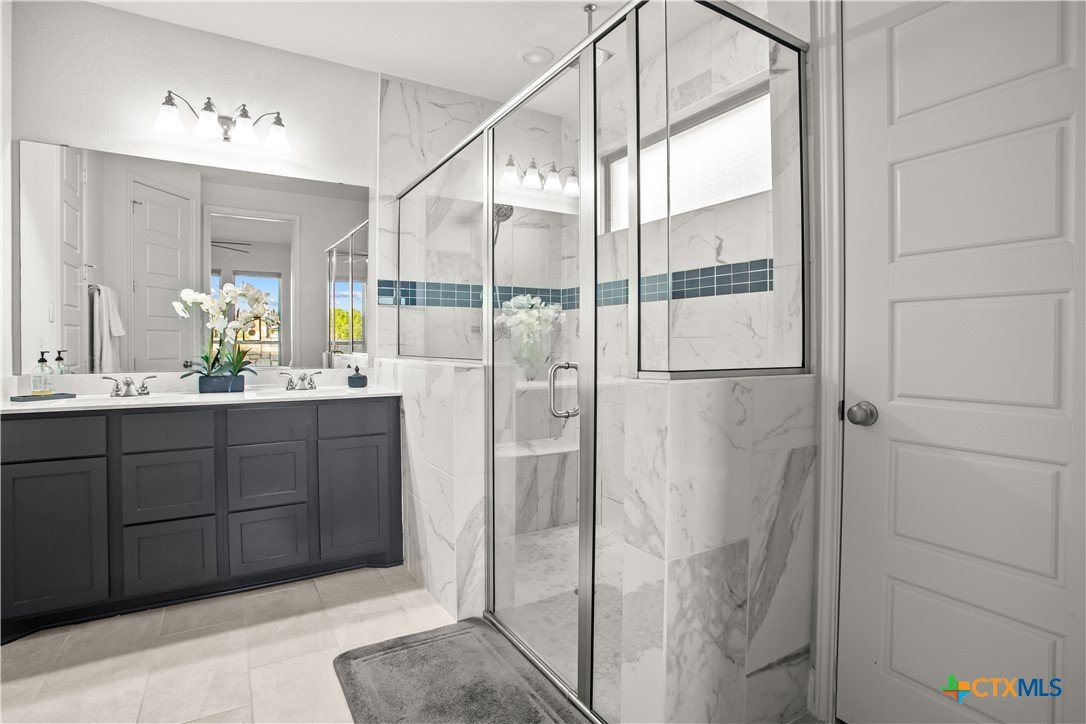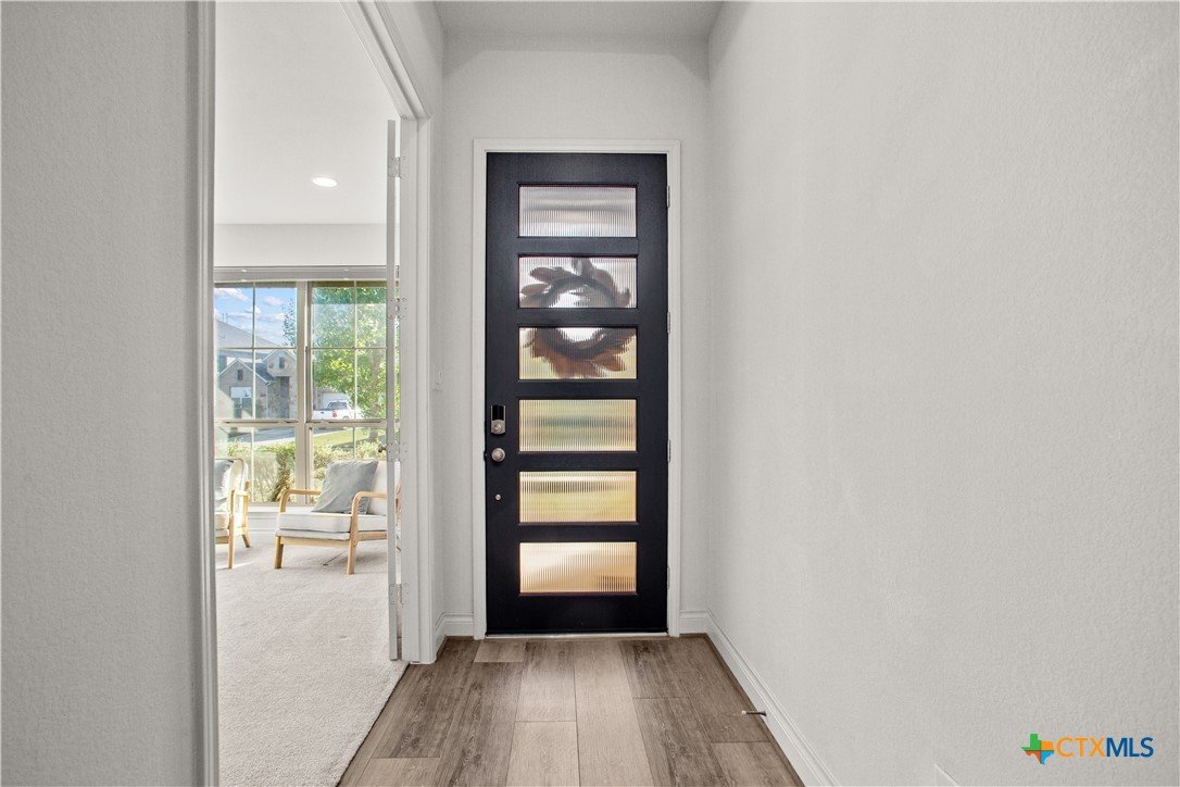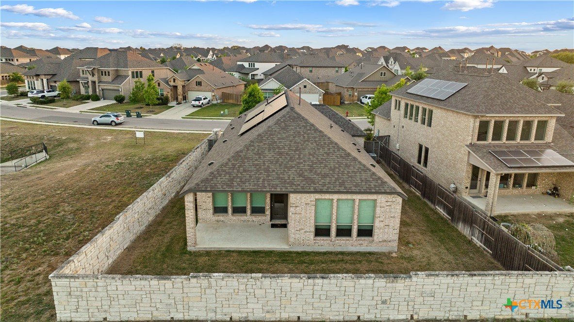 Smart. Efficient. Move-In Ready. Welcome to 369 Cold River Run in Kyle's sought-after 6 Creeks community. This upgraded Perry-built home offers 3 beds, 2 baths, and 1,984 sq ft of single-story living loaded with features you won't find in a standard new build. The kitchen features quartz countertops, a center island, stainless steel appliances, custom backsplash, under-cabinet lighting, and a pantry that lights up when you open the door. Eight-foot interior doors, luxury vinyl tile, and upgraded baseboards flow throughout. The primary suite offers a rainfall shower, quartz countertops, and downlights. What sets this home apart: a 7.2 kW rooftop solar array with Tesla Powerwall battery backup and a Tesla Wall Connector for EV charging. The entire home is wired with coax and ethernet, with a structured media cabinet, in-wall conduit for a cord-free setup, and pre-wired access points inside and on the patio. Control locks, lights, garage, sprinklers, thermostat, fans, and cameras — all from your phone. Outside: covered patio with Bluetooth speaker lights, full soffit lighting, exterior uplights, and weatherproof outlets. The 2.5-car garage has an epoxy floor, bump-out with extra outlets, and a Wi-Fi-enabled door. Corner lot backing to a greenbelt with automatic sprinklers. Ecobee smart thermostat, top/down blinds throughout, and Wi-Fi ceiling fans in every room. Zoned to Hays CISD. This one is a rare find — schedule your showing today!