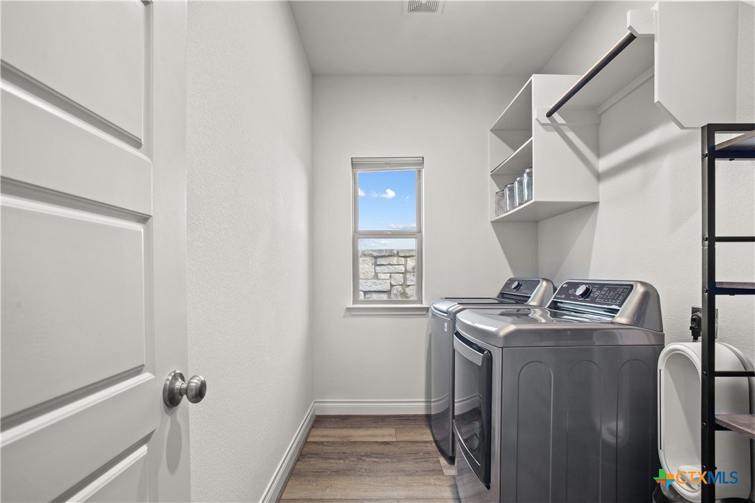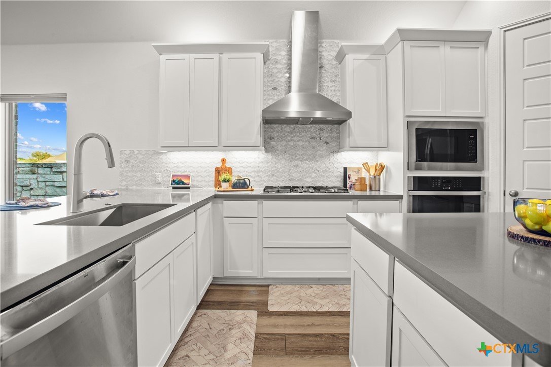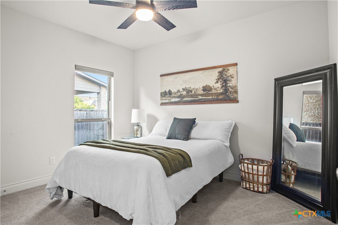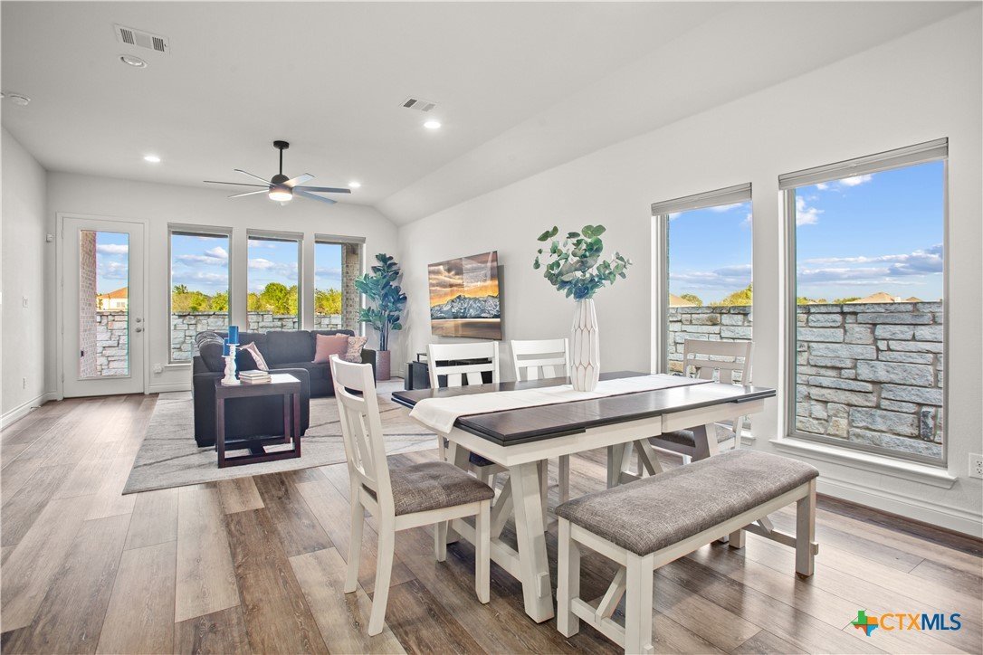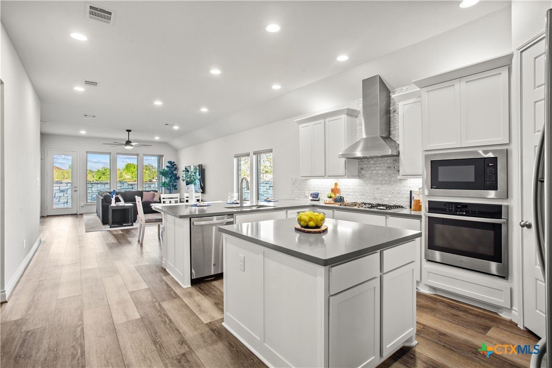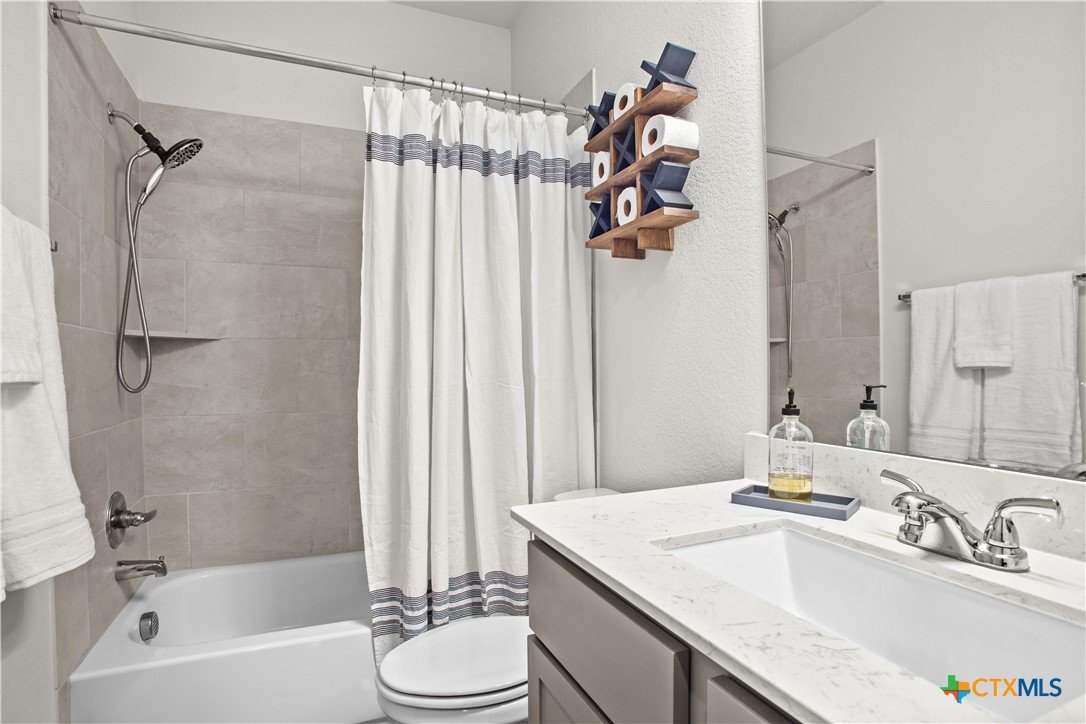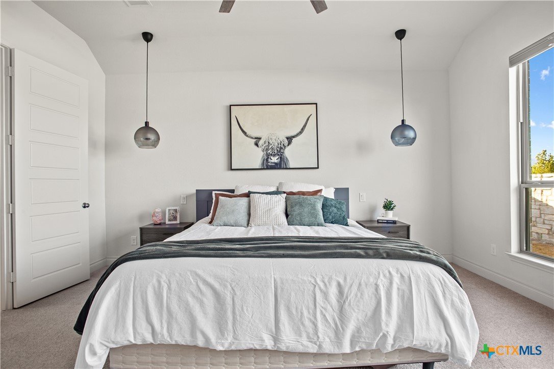 Smart. Efficient. Move-In Ready. Welcome to 369 Cold River Run in Kyle's sought-after 6 Creeks community. This upgraded Perry-built home offers 3 beds, 2 baths, and 1,984 sq ft of single-story living loaded with features you won't find in a standard new build. The kitchen features quartz countertops, a center island, stainless steel appliances, custom backsplash, under-cabinet lighting, and a pantry that lights up when you open the door. Eight-foot interior doors, luxury vinyl tile, and upgraded baseboards flow throughout. The primary suite offers a rainfall shower, quartz countertops, and downlights. What sets this home apart: a 7.2 kW rooftop solar array with Tesla Powerwall battery backup and a Tesla Wall Connector for EV charging. The entire home is wired with coax and ethernet, with a structured media cabinet, in-wall conduit for a cord-free setup, and pre-wired access points inside and on the patio. Control locks, lights, garage, sprinklers, thermostat, fans, and cameras — all from your phone. Outside: covered patio with Bluetooth speaker lights, full soffit lighting, exterior uplights, and weatherproof outlets. The 2.5-car garage has an epoxy floor, bump-out with extra outlets, and a Wi-Fi-enabled door. Corner lot backing to a greenbelt with automatic sprinklers. Ecobee smart thermostat, top/down blinds throughout, and Wi-Fi ceiling fans in every room. Zoned to Hays CISD. This one is a rare find — schedule your showing today!