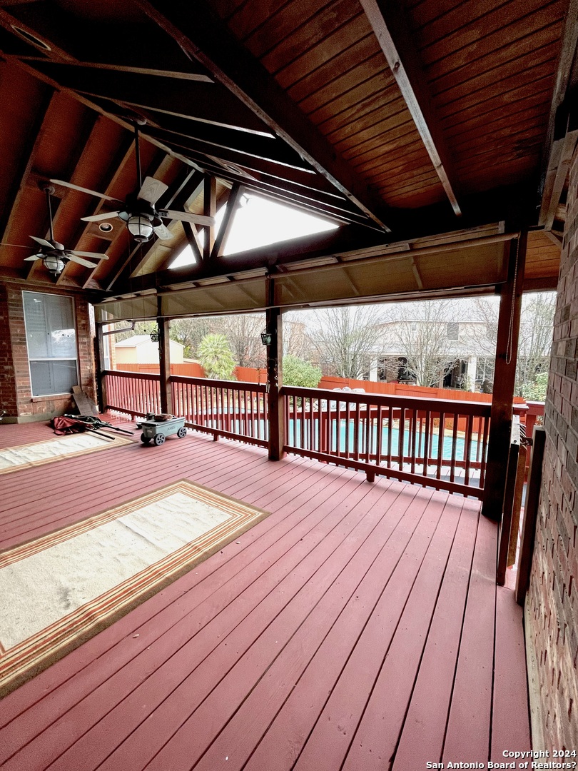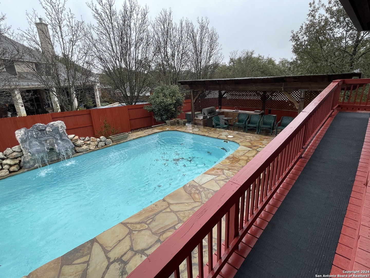 This large home in the Terraces at Encino Park has so much flexibility of space. 4 Full Bedrooms, 4-1/2 Baths! All bedrooms are downstairs and each has a private bath (two are accessible with walk-in showers and grab bars). There is no carpet downstairs. Wood Shutters throughout the home. Upstairs is a flex room with it's own bathroom that could easily be closed off to be an additional bedroom, office, game room... The backyard has a large covered patio with a cathedral ceiling, Outdoor kitchen and a pool with a waterfall. A ramp was built from the deck to the lower level. The home is nicely situated at the top of a hill and is zoned for Johnson High School.