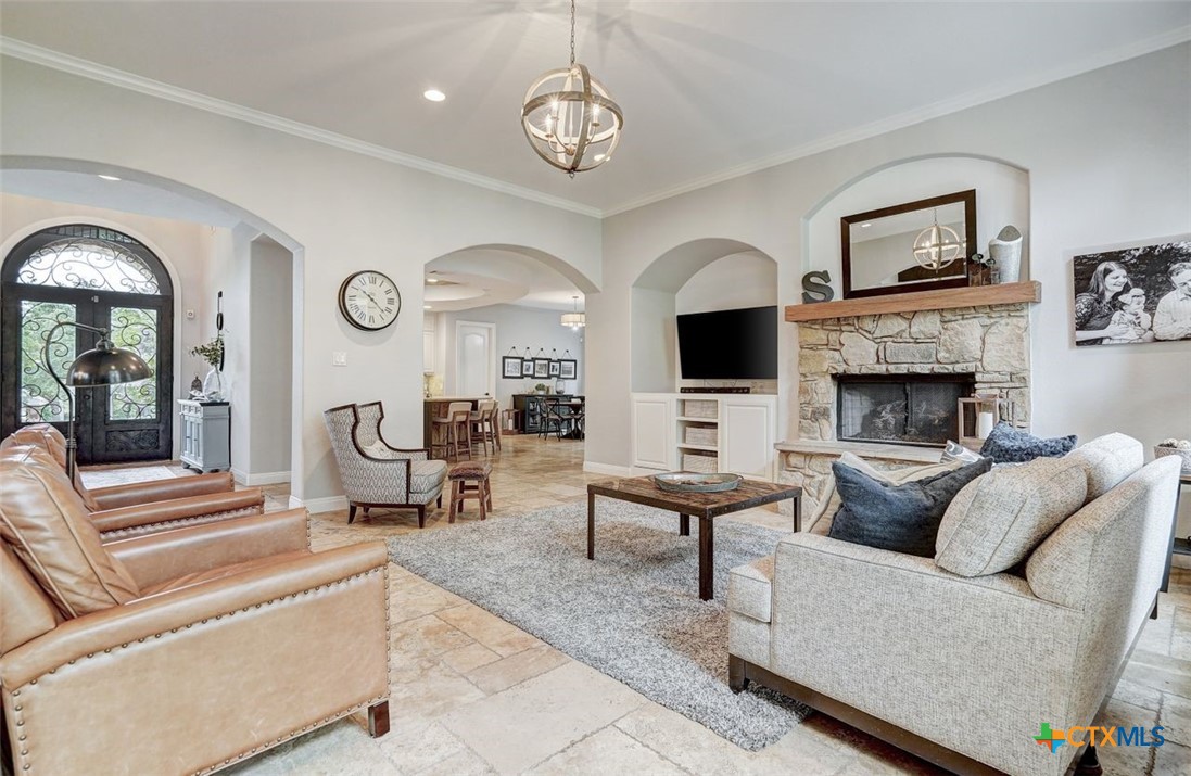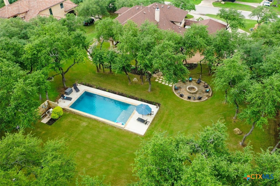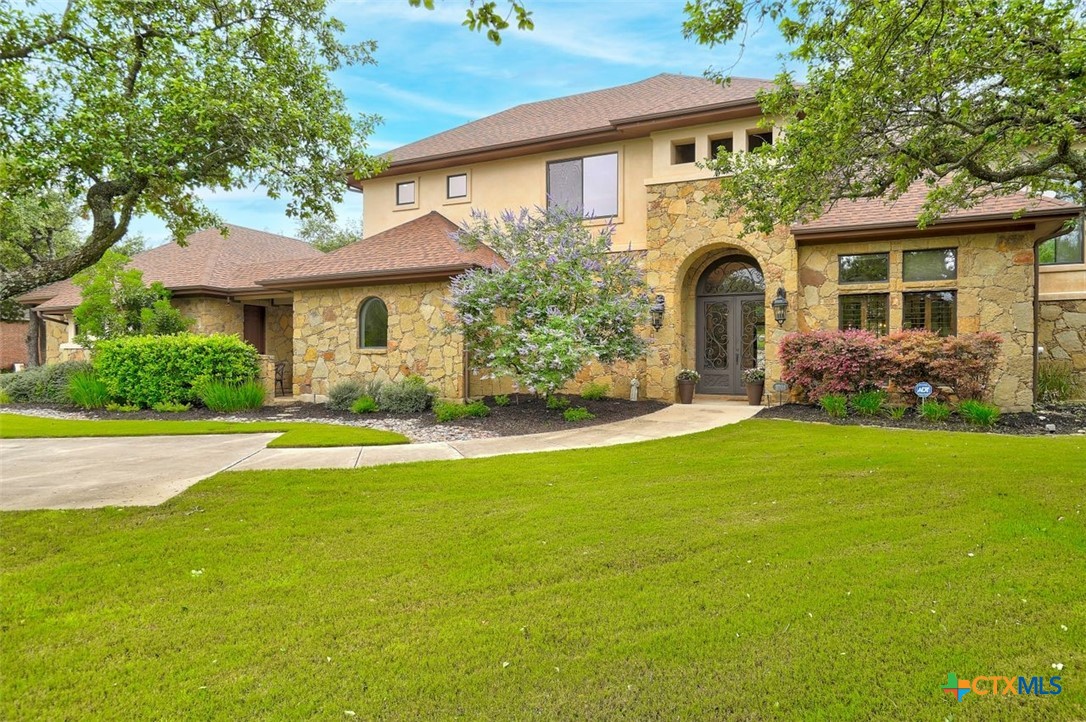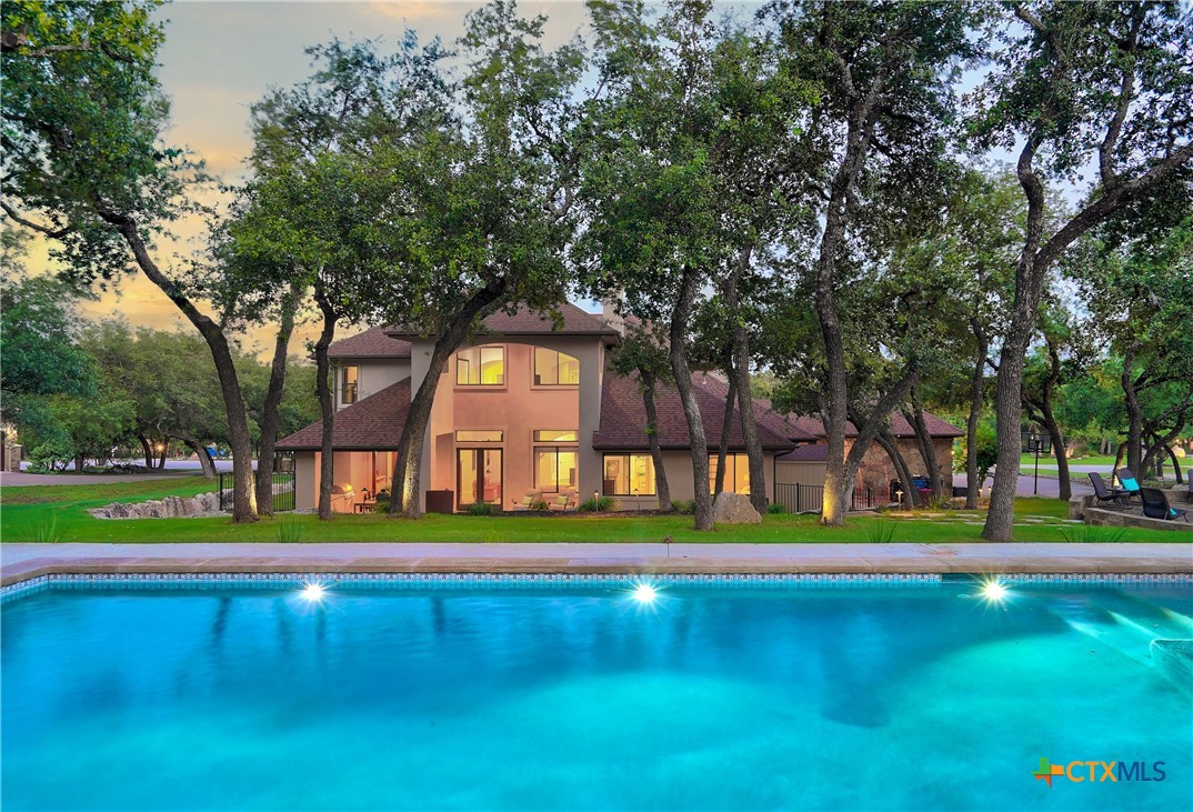 Hill Country luxury awaits in this exquisite custom home set on a beautiful 1.22-acre estate lot in the exclusive gated community of Grand Mesa at Crystal Falls. From the moment you approach the stunning front door with wrought iron accents and step onto the travertine tiles in the grand foyer, you’ll be captivated by the elegance and meticulous attention to detail in this home. The formal living area welcomes you with a striking wall of windows, high ceilings, and an inviting gas fireplace. Adjacent to this space, the formal dining room provides an ideal setting for entertaining guests or hosting intimate dinner parties. The gourmet-style kitchen offers that wow factor with design elements that set it apart from the rest, featuring a curved center island with a breakfast bar, stainless steel appliances, a built-in oven, granite countertops, and ample cabinet space. A cozy breakfast area overlooks the courtyard, adding to the charm of this culinary space. The primary suite, located on the main floor, serves as a private sanctuary complete with a spa-like bath, a large walk-in shower, dual vanities, and a generously sized walk-in closet. Upstairs, the spacious second living/flex room includes a wet bar, making it perfect for entertaining or relaxing. Three additional bedrooms, a full bath, and a Jack and Jill bath provide ample space. Office with a beautiful coffered ceiling and French doors, a convenient first-floor laundry room, and modern, luxurious touches like travertine floors and designer lighting throughout. The backyard oasis features an in-ground pool, a fire pit, and a large covered patio with a built-in outdoor kitchen area. A separate private courtyard offers a serene spot to enjoy soft Texas evenings. The property also includes an oversized attached three-car garage and usable attic storage. This exceptional property blends privacy, luxury, and functionality, making it the perfect place to call home.