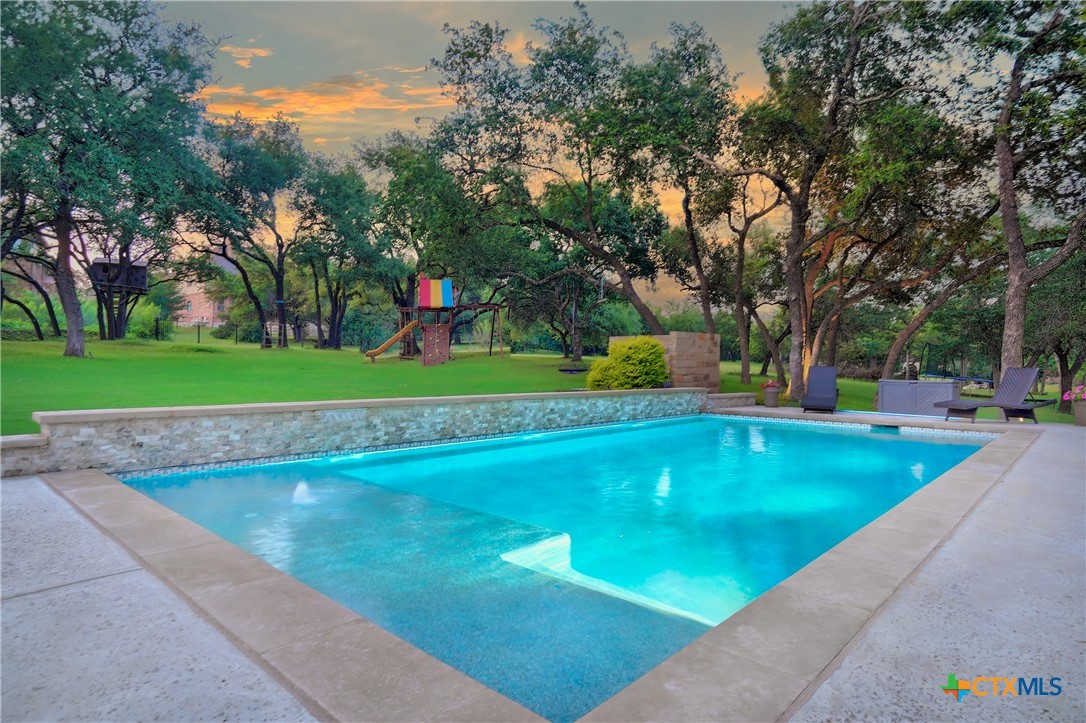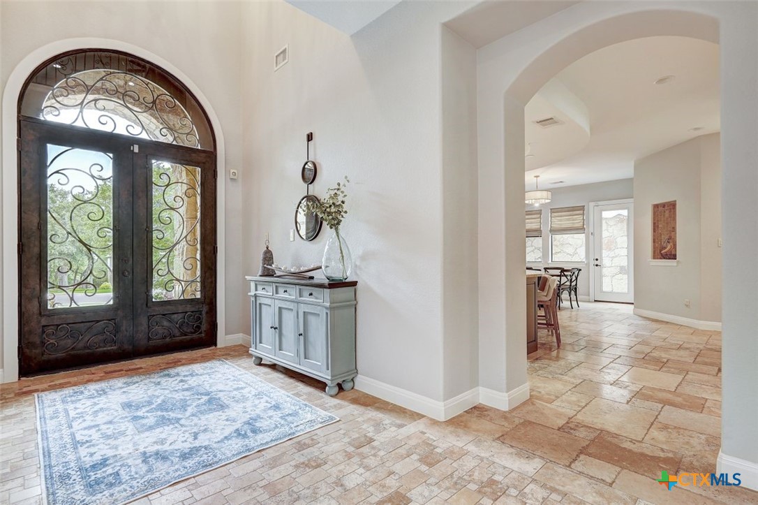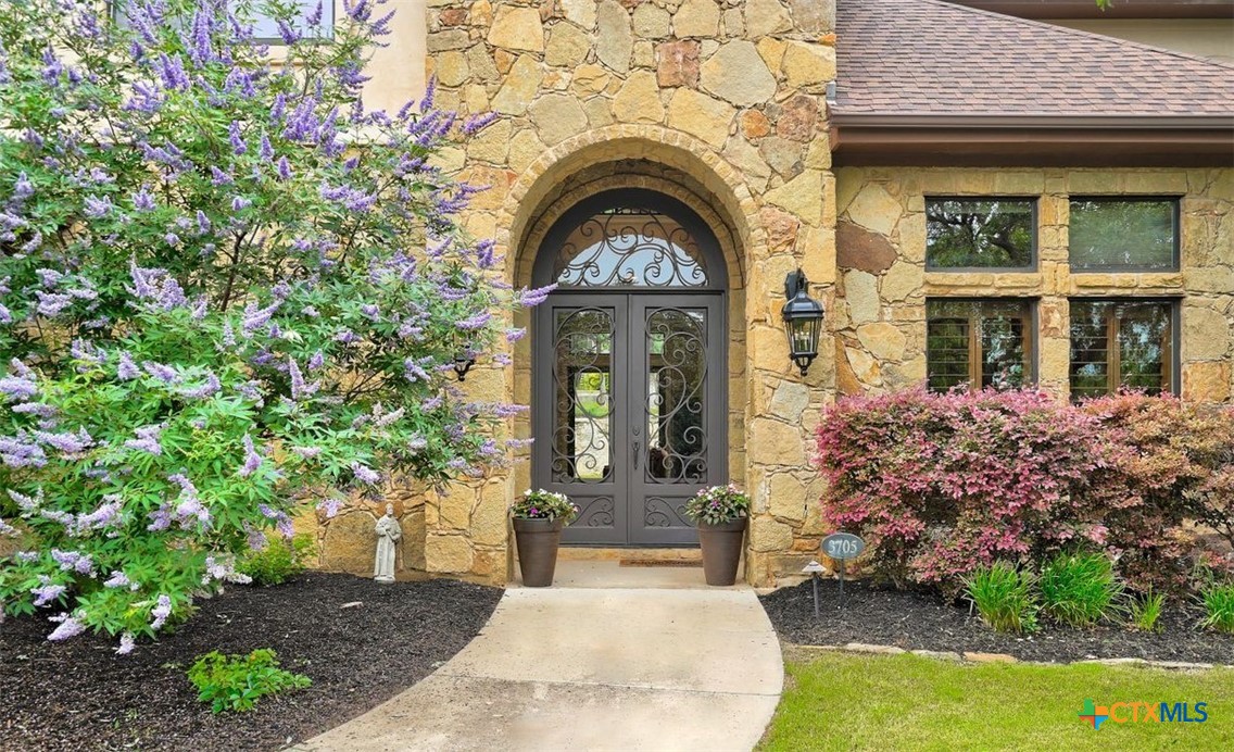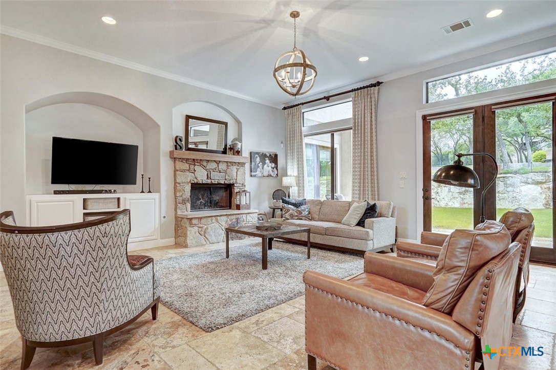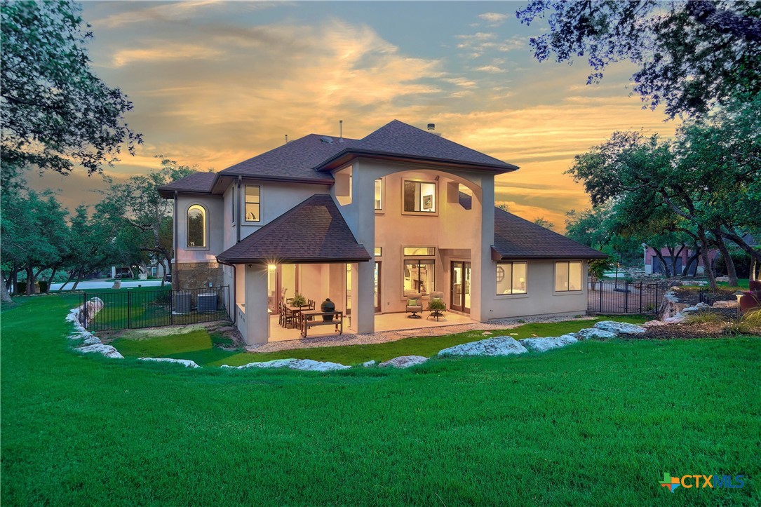 Hill Country luxury awaits in this exquisite custom home set on a beautiful 1.22-acre estate lot in the exclusive gated community of Grand Mesa at Crystal Falls. From the moment you approach the stunning front door with wrought iron accents and step onto the travertine tiles in the grand foyer, you’ll be captivated by the elegance and meticulous attention to detail in this home. The formal living area welcomes you with a striking wall of windows, high ceilings, and an inviting gas fireplace. Adjacent to this space, the formal dining room provides an ideal setting for entertaining guests or hosting intimate dinner parties. The gourmet-style kitchen offers that wow factor with design elements that set it apart from the rest, featuring a curved center island with a breakfast bar, stainless steel appliances, a built-in oven, granite countertops, and ample cabinet space. A cozy breakfast area overlooks the courtyard, adding to the charm of this culinary space. The primary suite, located on the main floor, serves as a private sanctuary complete with a spa-like bath, a large walk-in shower, dual vanities, and a generously sized walk-in closet. Upstairs, the spacious second living/flex room includes a wet bar, making it perfect for entertaining or relaxing. Three additional bedrooms, a full bath, and a Jack and Jill bath provide ample space. Office with a beautiful coffered ceiling and French doors, a convenient first-floor laundry room, and modern, luxurious touches like travertine floors and designer lighting throughout. The backyard oasis features an in-ground pool, a fire pit, and a large covered patio with a built-in outdoor kitchen area. A separate private courtyard offers a serene spot to enjoy soft Texas evenings. The property also includes an oversized attached three-car garage and usable attic storage. This exceptional property blends privacy, luxury, and functionality, making it the perfect place to call home.
