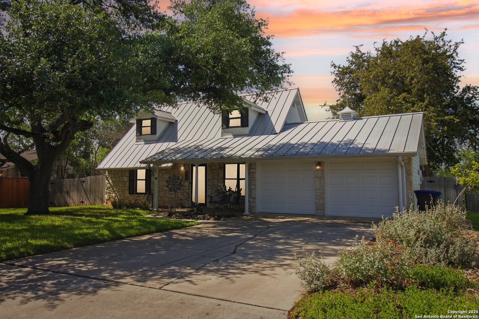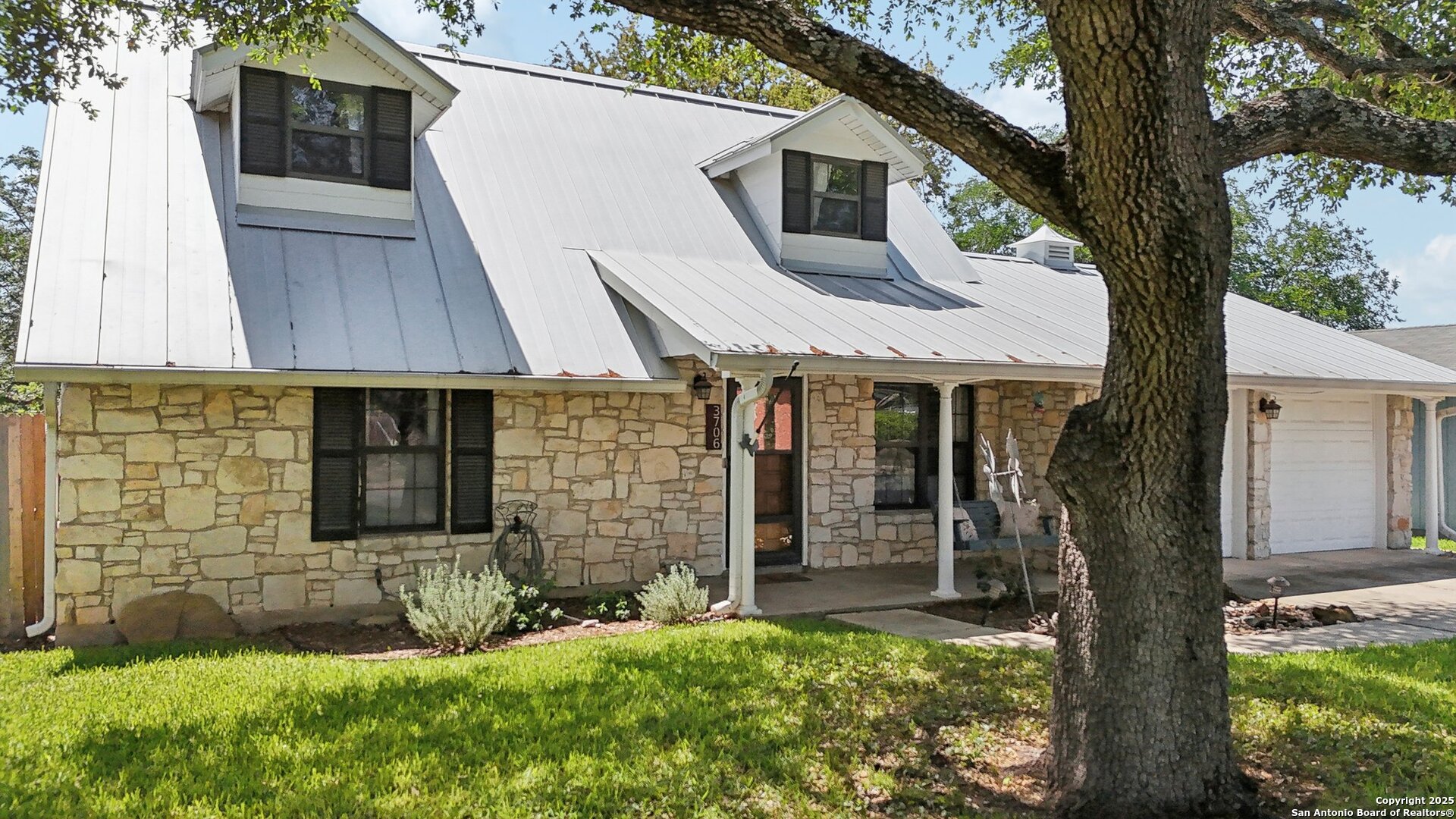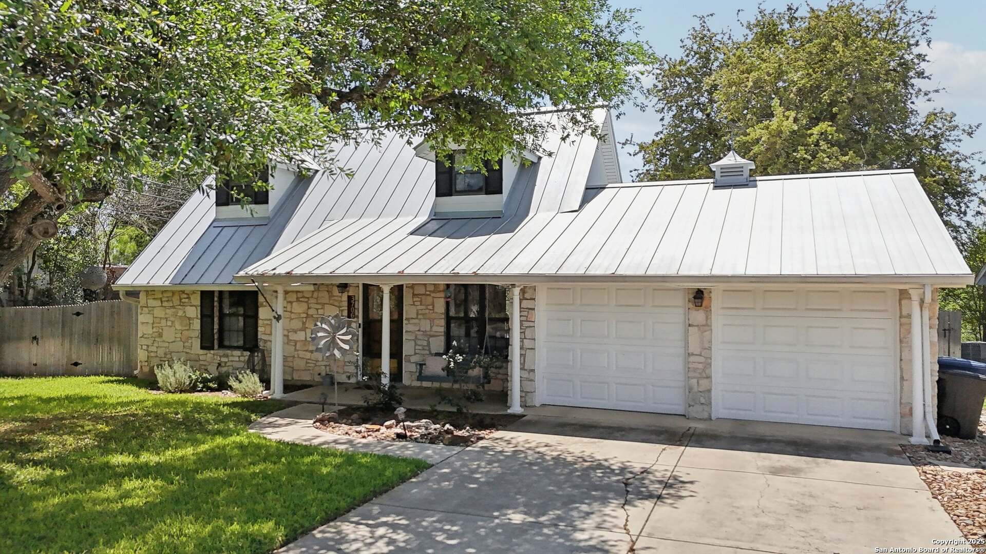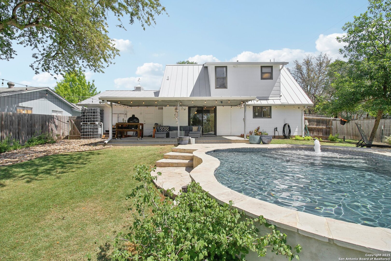Come visit this one-of-a-kind charming ranch-style home, featuring a metal roof and gabled dormers. The inviting front porch and meticulously landscaped lawn, complete with St. Augustine grass, offer exceptional curb appeal. Looking for upgrades? This home has it all! It boasts new tile flooring and a complete kitchen remodel, including an island backsplash, quartz countertops, a chef's range with an induction cooktop, and all appliances, including a beverage fridge, washer, and dryer. The open floor plan, renovated in 2019, features new fixtures and recessed lighting. The primary bedroom is located downstairs, while the other two bedrooms are upstairs, with upgraded bathroom vanities and lighting. Step outside to nearly a 2/3-acre lot that includes a new Keith Zar pool, a spacious covered patio and deck, raised flower beds, outdoor lighting, a new shed, a pollinator garden, and a new exterior fence. Enjoy water-saving plants and fruit trees, as well as an irrigation system. For entertaining, there's even a fire pit! This home overlooks a wooded green belt with steps leading to Salado Creek in an established area close to Alamo Heights and San Antonio Airport. With easy access to highways, dining, and shopping, this home truly presents a perfect opportunity to own your own slice of paradise.
