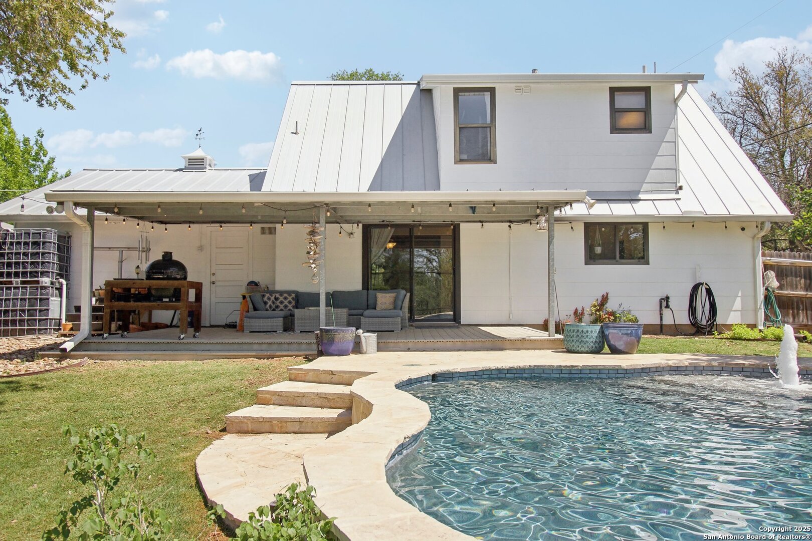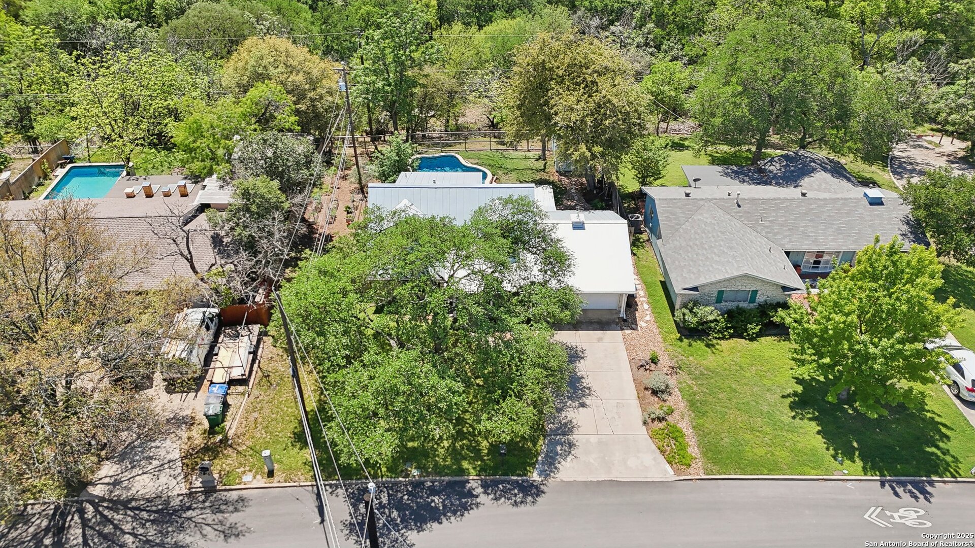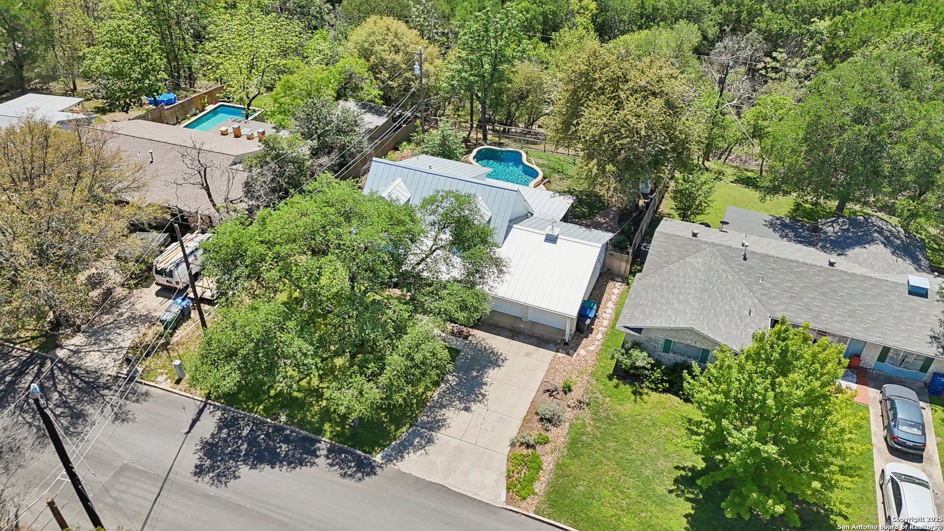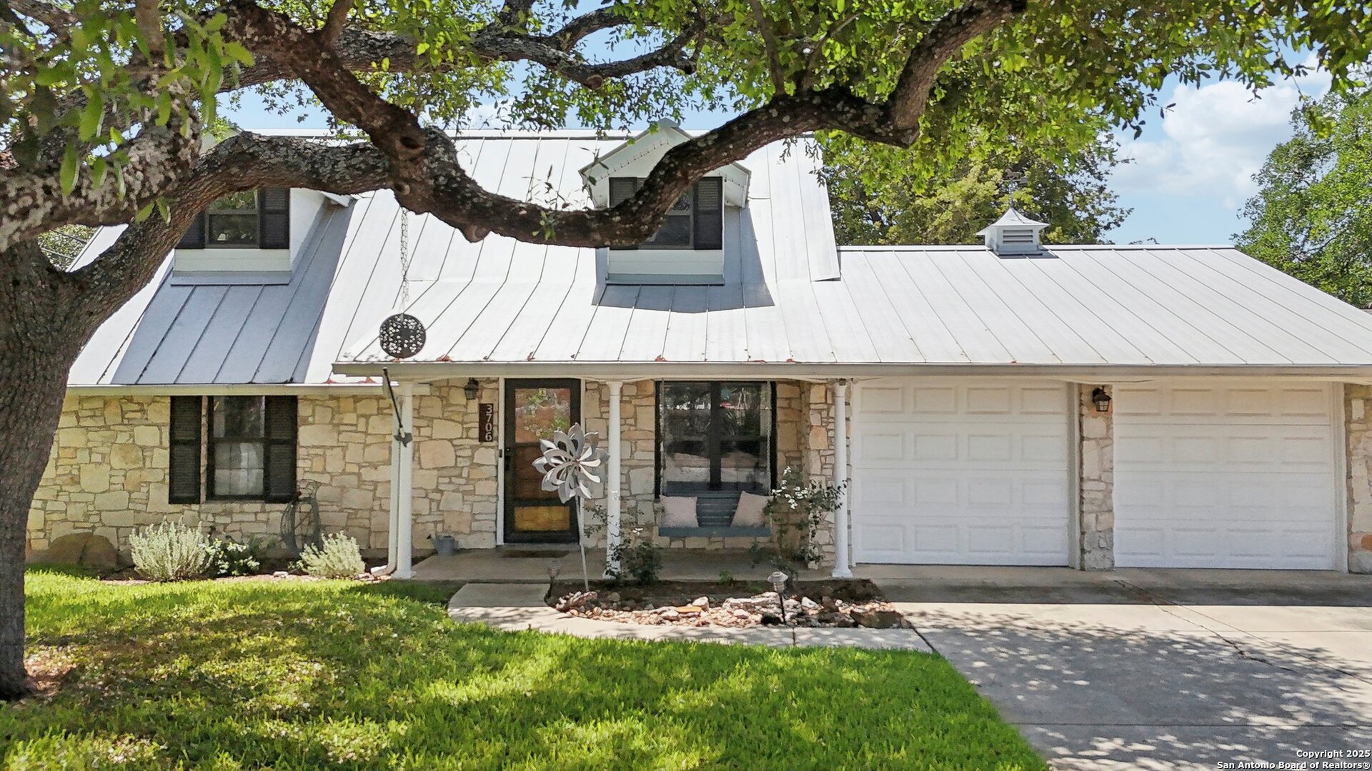 Come visit this one-of-a-kind charming ranch-style home, featuring a metal roof and gabled dormers. The inviting front porch and meticulously landscaped lawn, complete with St. Augustine grass, offer exceptional curb appeal. Looking for upgrades? This home has it all! It boasts new tile flooring and a complete kitchen remodel, including an island backsplash, quartz countertops, a chef's range with an induction cooktop, and all appliances, including a beverage fridge, washer, and dryer. The open floor plan, renovated in 2019, features new fixtures and recessed lighting. The primary bedroom is located downstairs, while the other two bedrooms are upstairs, with upgraded bathroom vanities and lighting. Step outside to nearly a 2/3-acre lot that includes a new Keith Zar pool, a spacious covered patio and deck, raised flower beds, outdoor lighting, a new shed, a pollinator garden, and a new exterior fence. Enjoy water-saving plants and fruit trees, as well as an irrigation system. For entertaining, there's even a fire pit! This home overlooks a wooded green belt with steps leading to Salado Creek in an established area close to Alamo Heights and San Antonio Airport. With easy access to highways, dining, and shopping, this home truly presents a perfect opportunity to own your own slice of paradise.