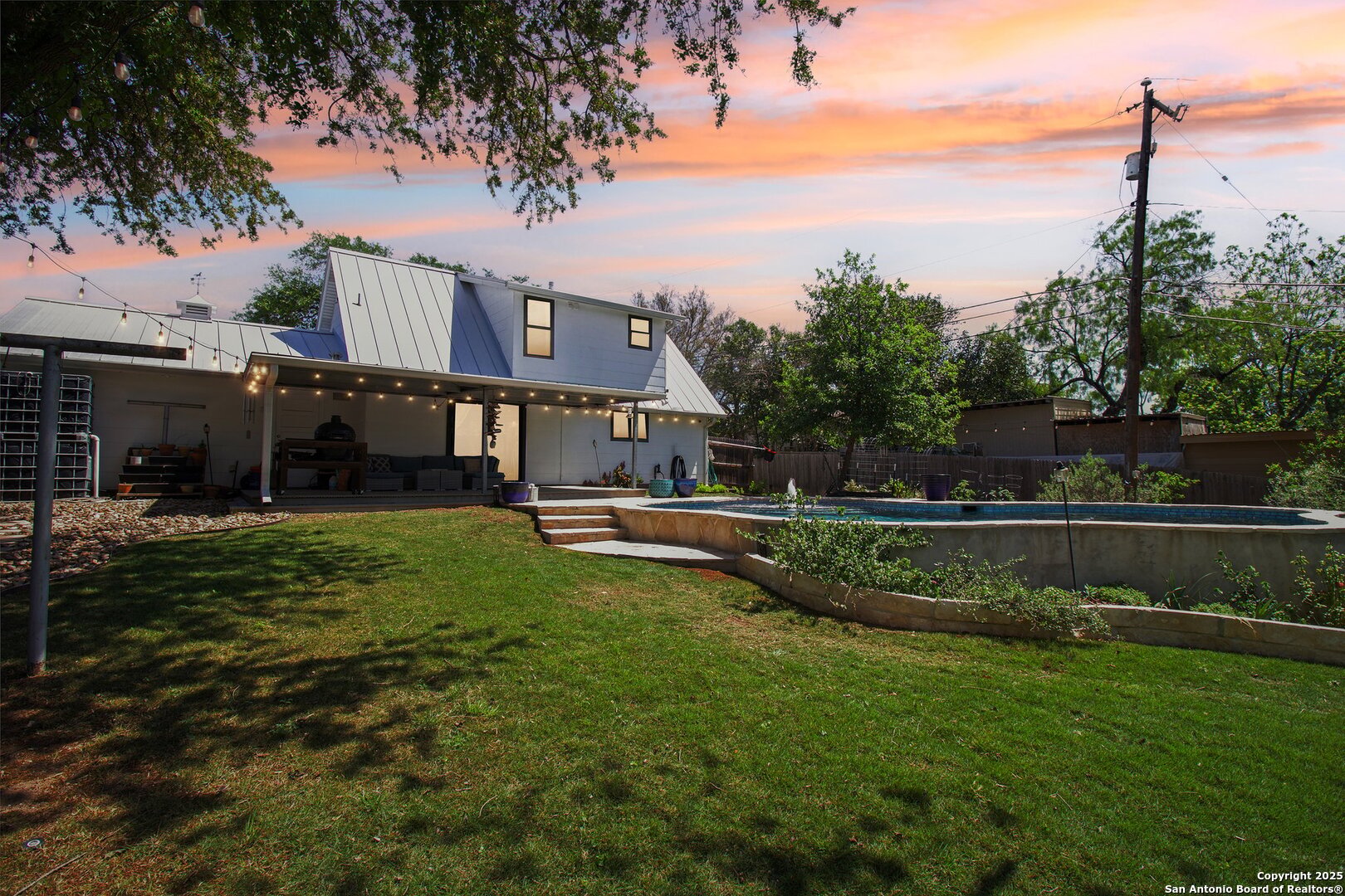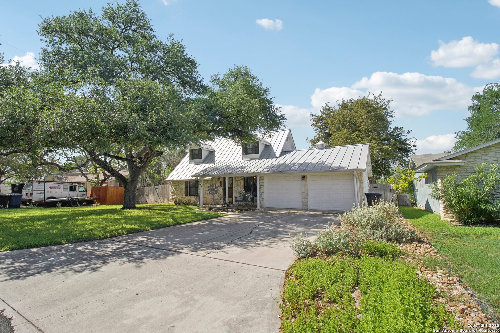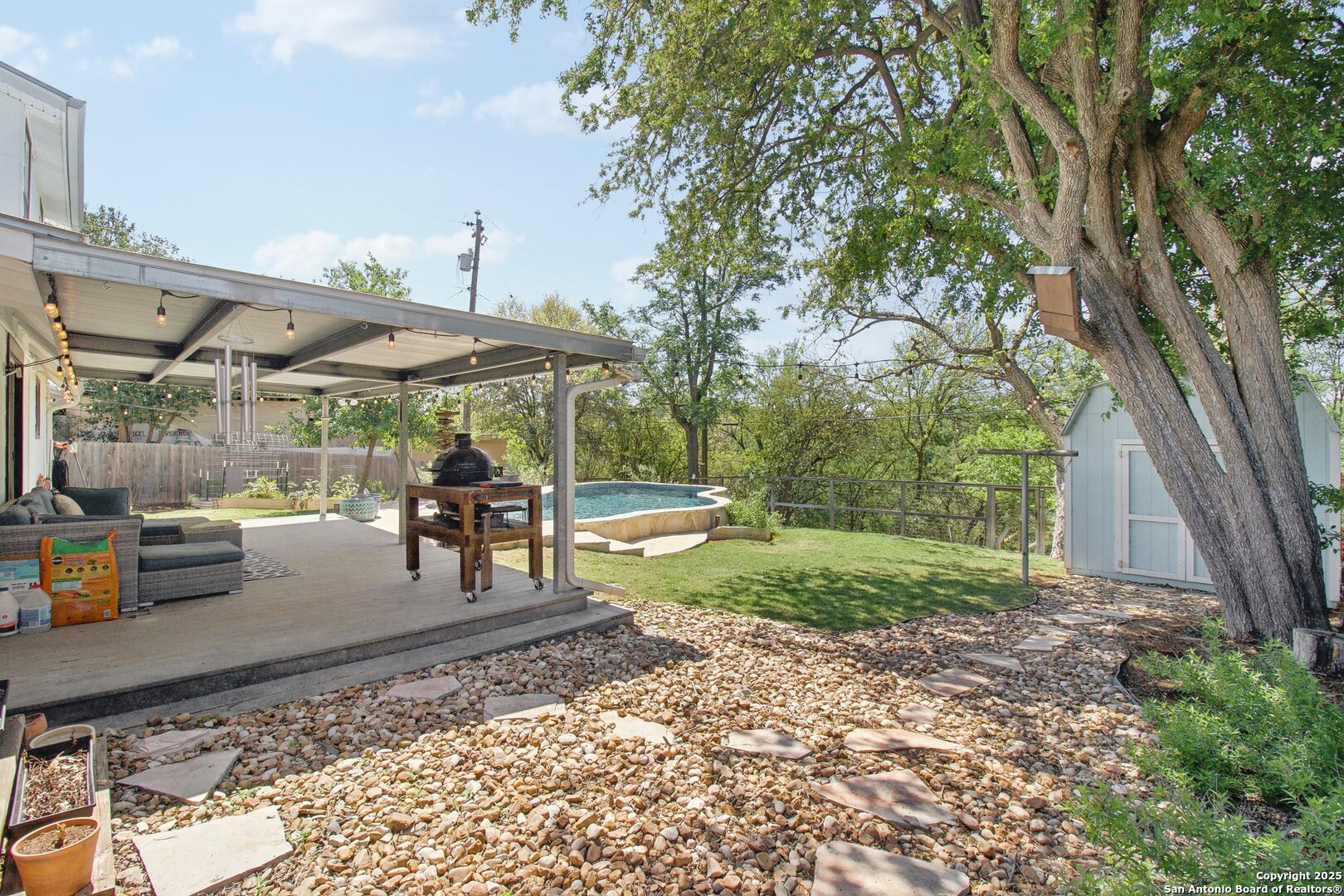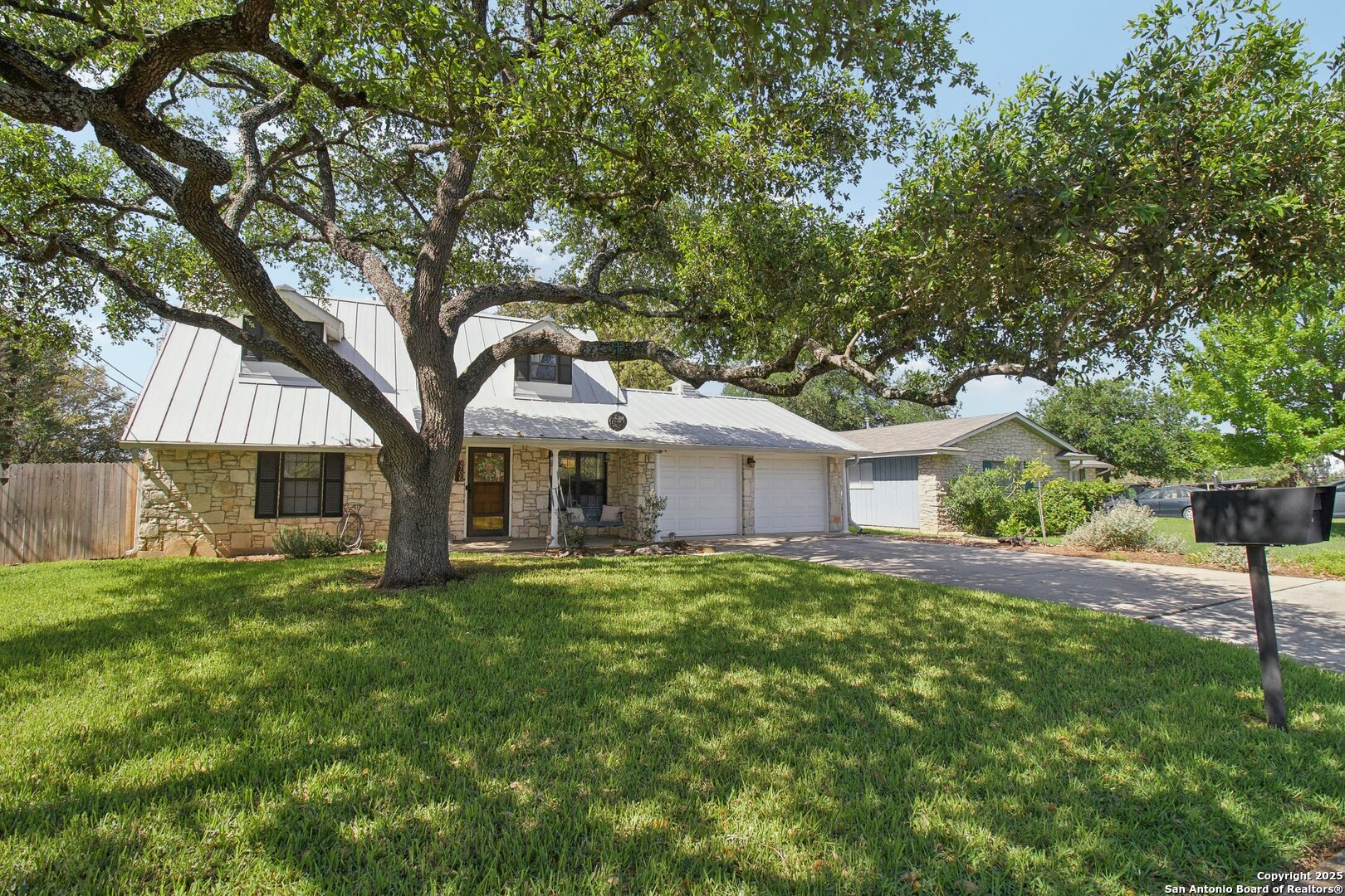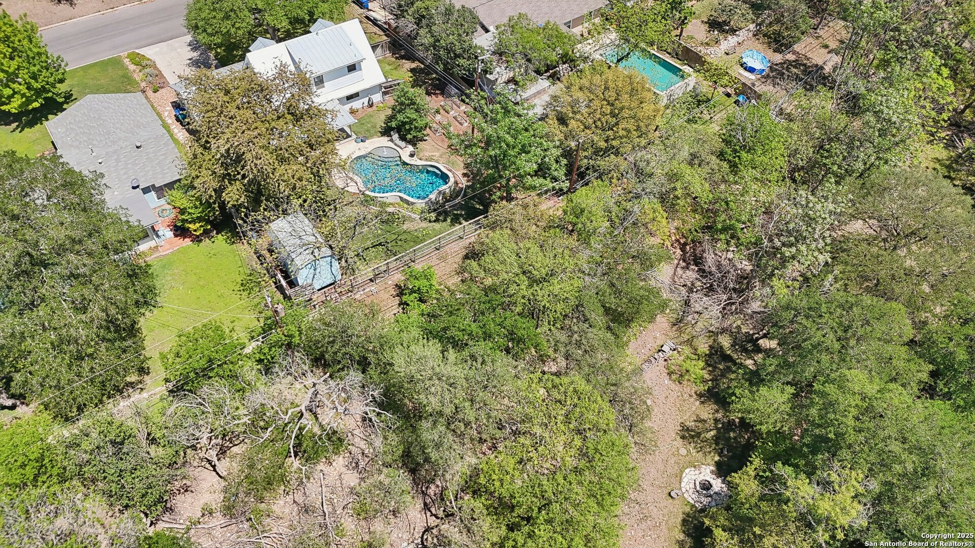 Come visit this one-of-a-kind charming ranch-style home, featuring a metal roof and gabled dormers. The inviting front porch and meticulously landscaped lawn, complete with St. Augustine grass, offer exceptional curb appeal. Looking for upgrades? This home has it all! It boasts new tile flooring and a complete kitchen remodel, including an island backsplash, quartz countertops, a chef's range with an induction cooktop, and all appliances, including a beverage fridge, washer, and dryer. The open floor plan, renovated in 2019, features new fixtures and recessed lighting. The primary bedroom is located downstairs, while the other two bedrooms are upstairs, with upgraded bathroom vanities and lighting. Step outside to nearly a 2/3-acre lot that includes a new Keith Zar pool, a spacious covered patio and deck, raised flower beds, outdoor lighting, a new shed, a pollinator garden, and a new exterior fence. Enjoy water-saving plants and fruit trees, as well as an irrigation system. For entertaining, there's even a fire pit! This home overlooks a wooded green belt with steps leading to Salado Creek in an established area close to Alamo Heights and San Antonio Airport. With easy access to highways, dining, and shopping, this home truly presents a perfect opportunity to own your own slice of paradise.