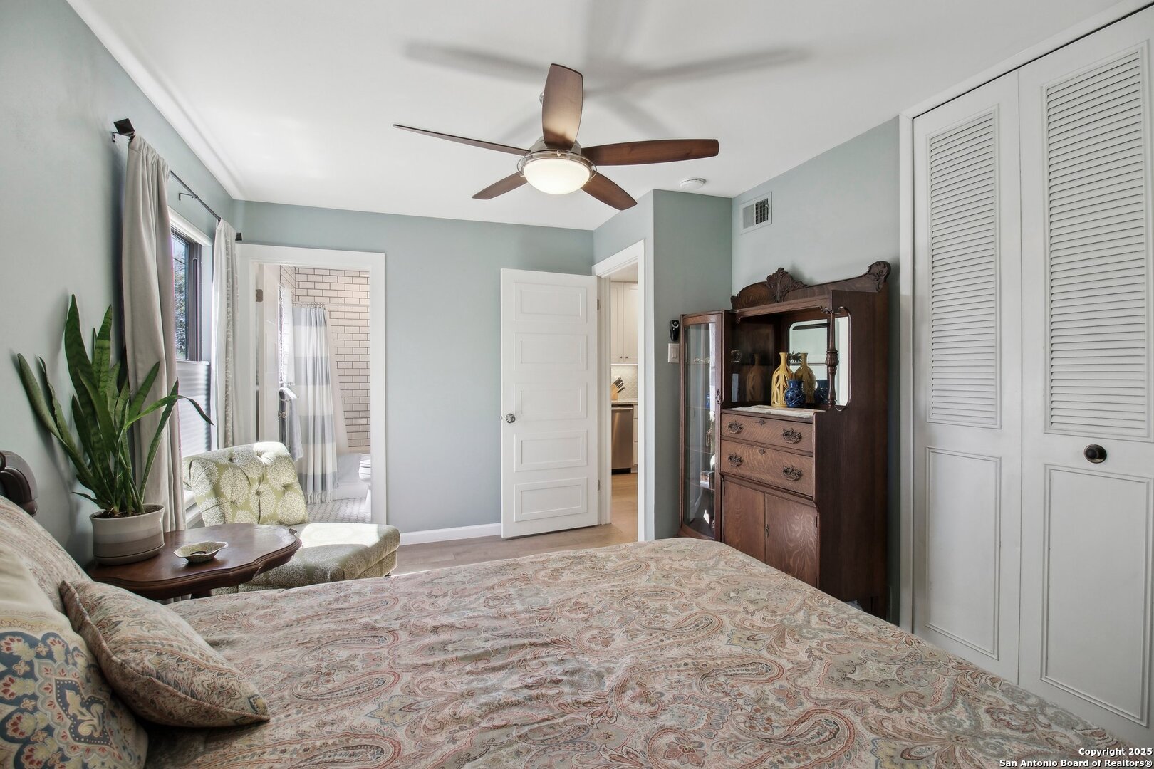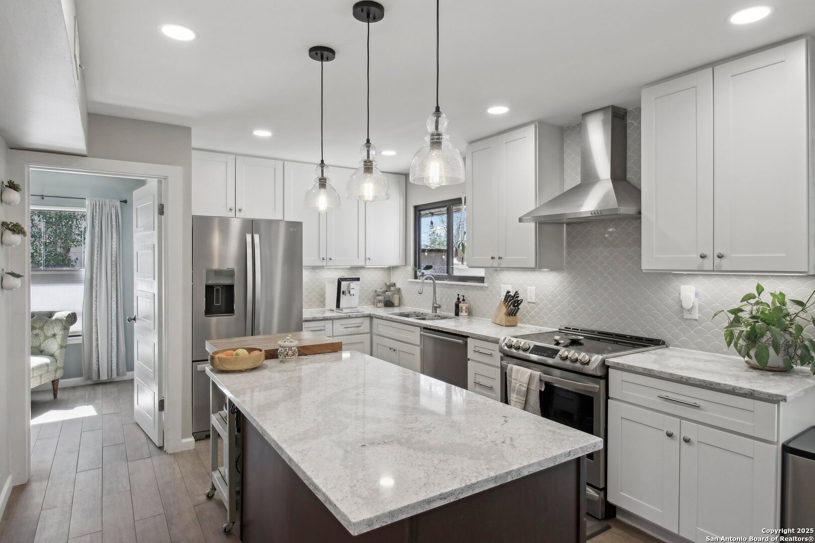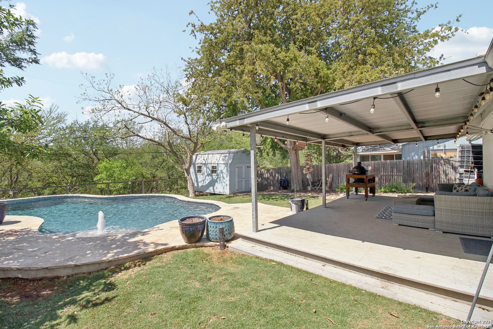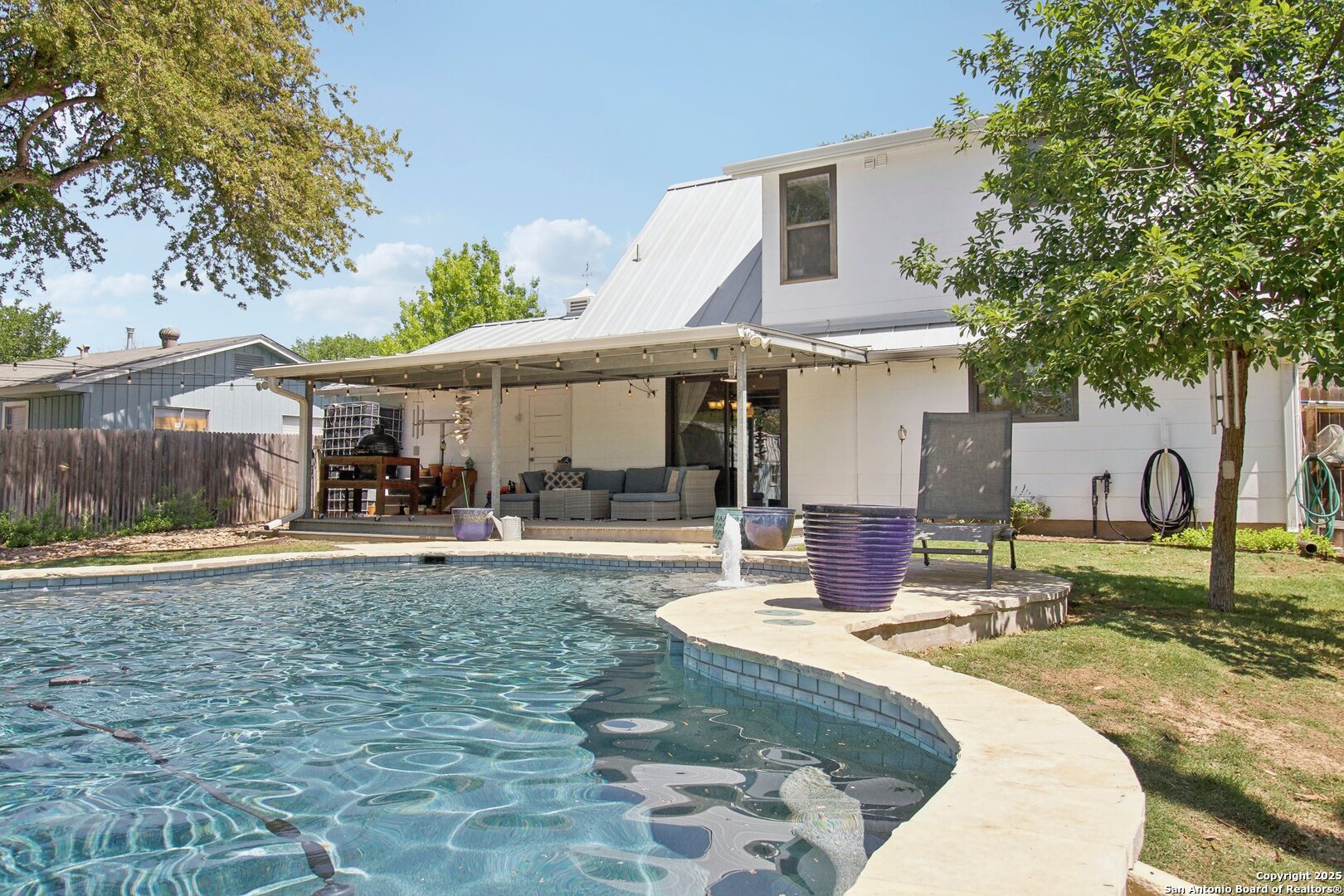 Come visit this one-of-a-kind charming ranch-style home, featuring a metal roof and gabled dormers. The inviting front porch and meticulously landscaped lawn, complete with St. Augustine grass, offer exceptional curb appeal. Looking for upgrades? This home has it all! It boasts new tile flooring and a complete kitchen remodel, including an island backsplash, quartz countertops, a chef's range with an induction cooktop, and all appliances, including a beverage fridge, washer, and dryer. The open floor plan, renovated in 2019, features new fixtures and recessed lighting. The primary bedroom is located downstairs, while the other two bedrooms are upstairs, with upgraded bathroom vanities and lighting. Step outside to nearly a 2/3-acre lot that includes a new Keith Zar pool, a spacious covered patio and deck, raised flower beds, outdoor lighting, a new shed, a pollinator garden, and a new exterior fence. Enjoy water-saving plants and fruit trees, as well as an irrigation system. For entertaining, there's even a fire pit! This home overlooks a wooded green belt with steps leading to Salado Creek in an established area close to Alamo Heights and San Antonio Airport. With easy access to highways, dining, and shopping, this home truly presents a perfect opportunity to own your own slice of paradise.