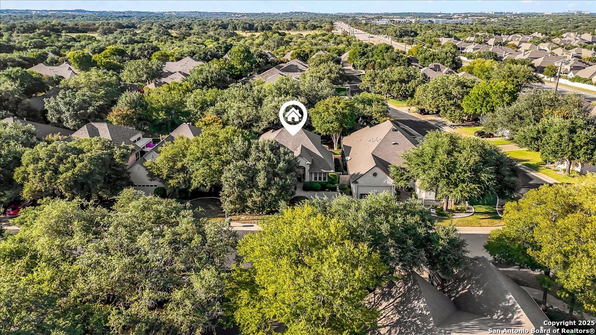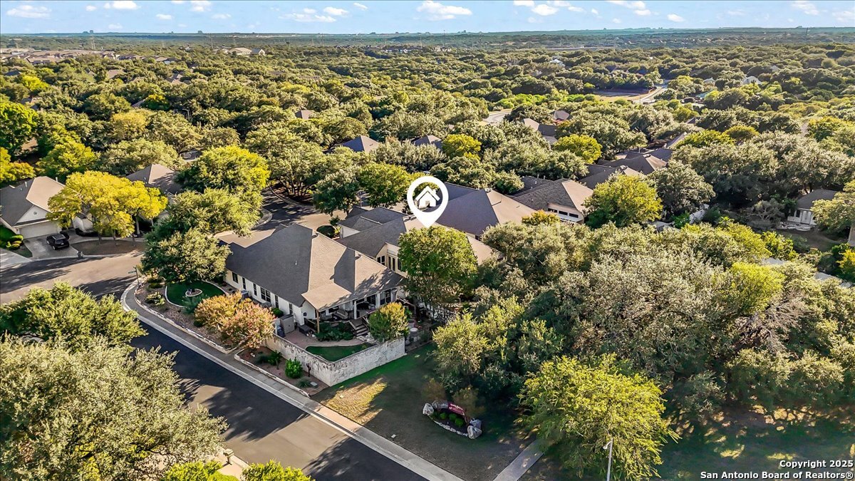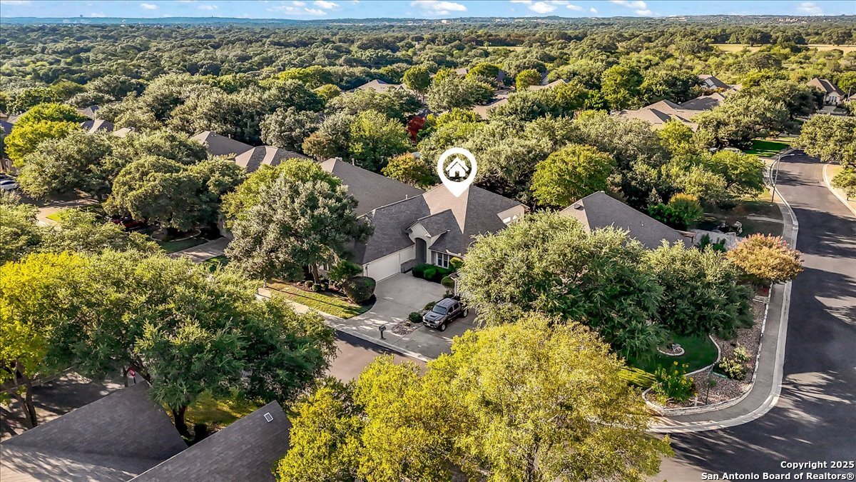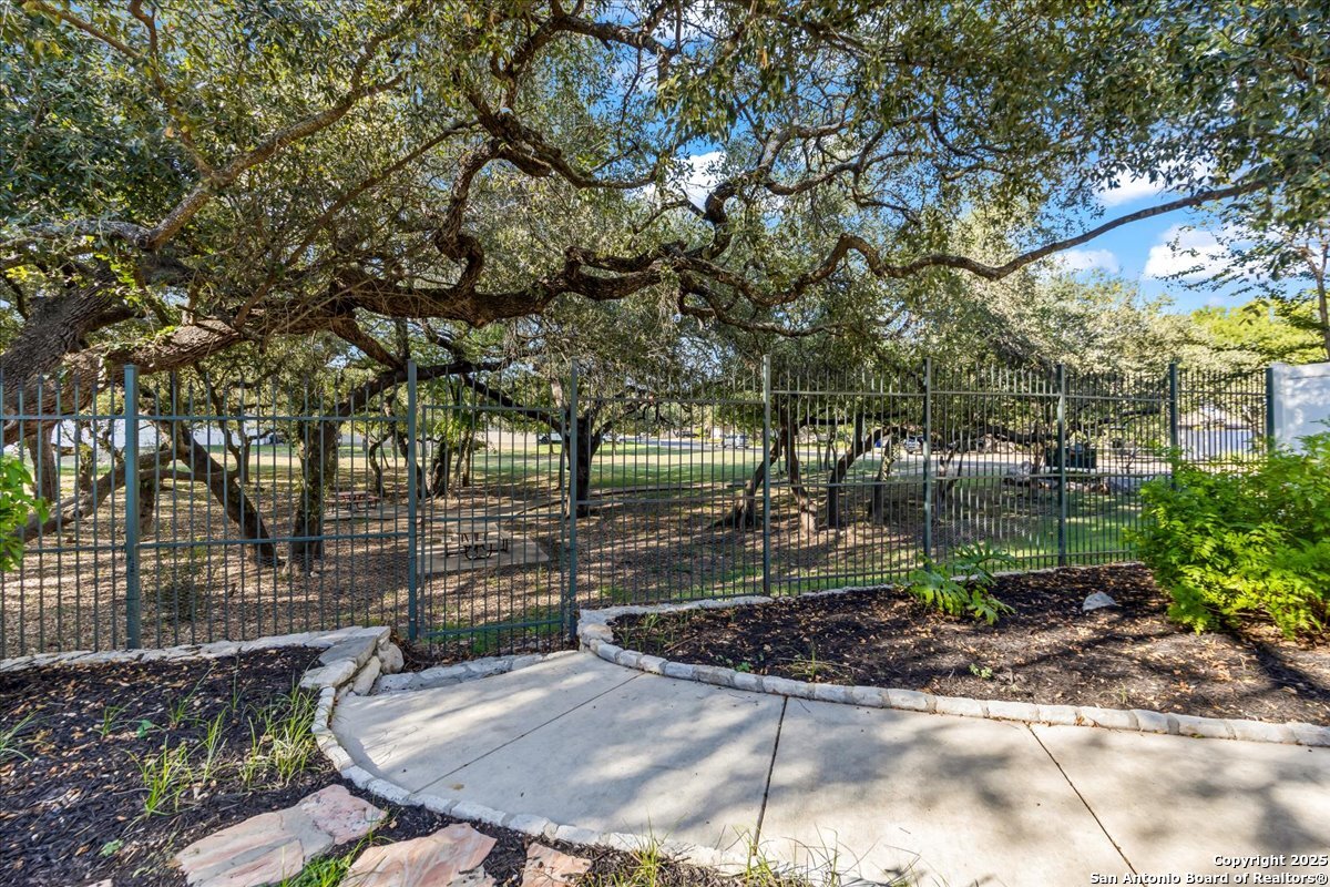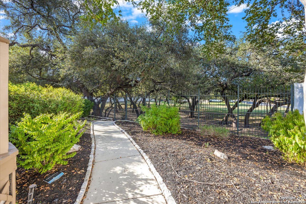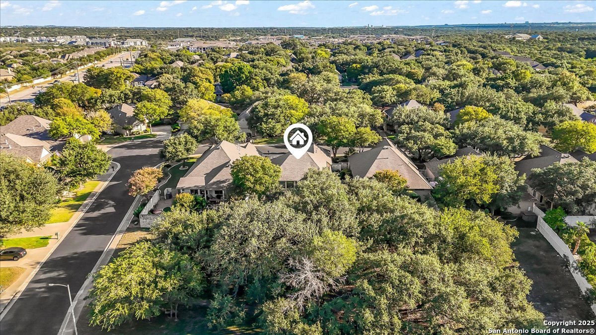 Located in the garden home section of Emerald Forest, this one-story residence offers comfort, privacy, and a low-maintenance lifestyle. Backing to a park with no neighbors behind, the home enjoys peaceful greenbelt views and natural surroundings. Inside, natural light fills the living spaces, highlighted by a fireplace in the family room that adds warmth and charm. A dedicated dining room is perfect for gatherings, while the separate office or studio provides flexibility for work or hobbies. The kitchen connects seamlessly with the living areas, making daily life both easy and enjoyable. The bedrooms are generously sized, and the primary suite offers a private retreat with plenty of space. There is no carpet anywhere in the home, and fresh paint throughout gives it a clean, updated feel. Recent improvements include a new water heater in 2025. The oversized garage is another standout, complete with built-ins that appeal to car enthusiasts, hobbyists, or anyone needing extra storage. Outside, the garden-sized yard is easy to maintain yet offers room to relax and enjoy the natural setting. Emerald Forest is a gated community known for its tree-lined streets, pool, sports courts, and abundant green space. Families appreciate the convenience of feeding into the prestigious North East Independent School District, along with easy access to shopping, dining, and major highways. This Emerald Forest garden home blends a practical layout with community amenities and a private backdrop, ready to welcome its next owner.