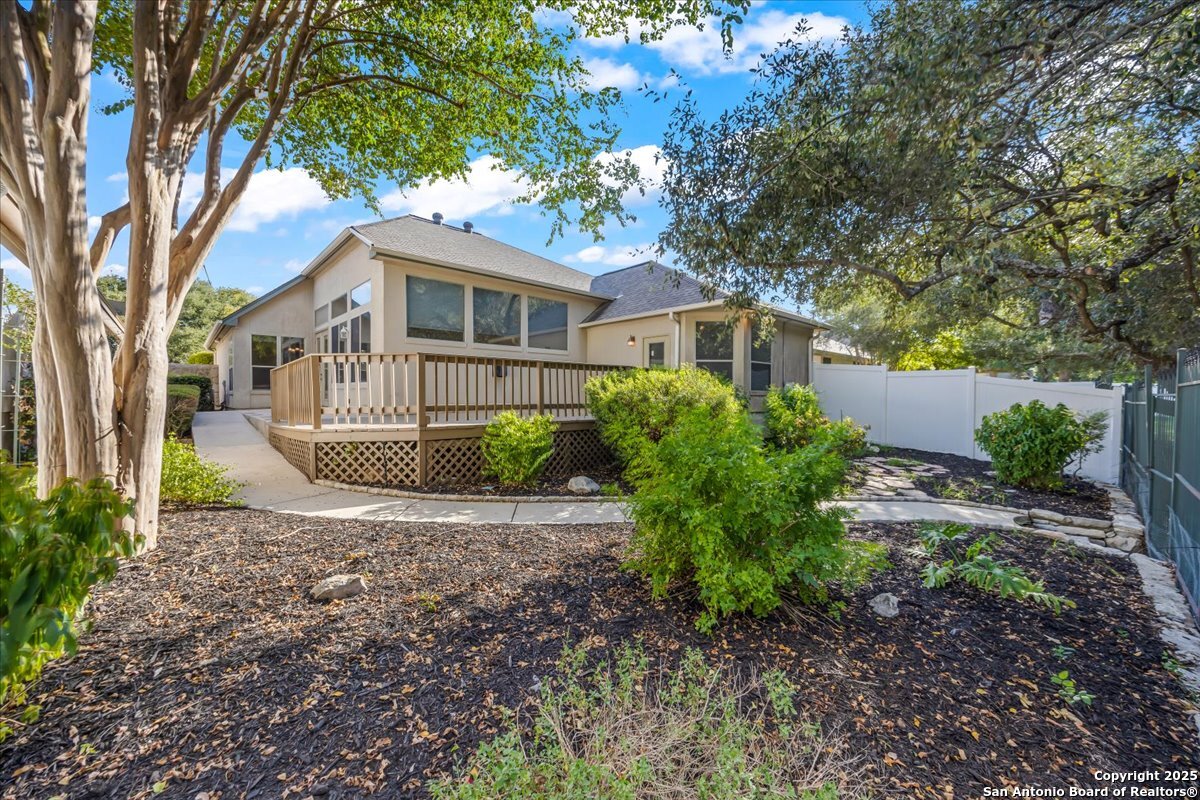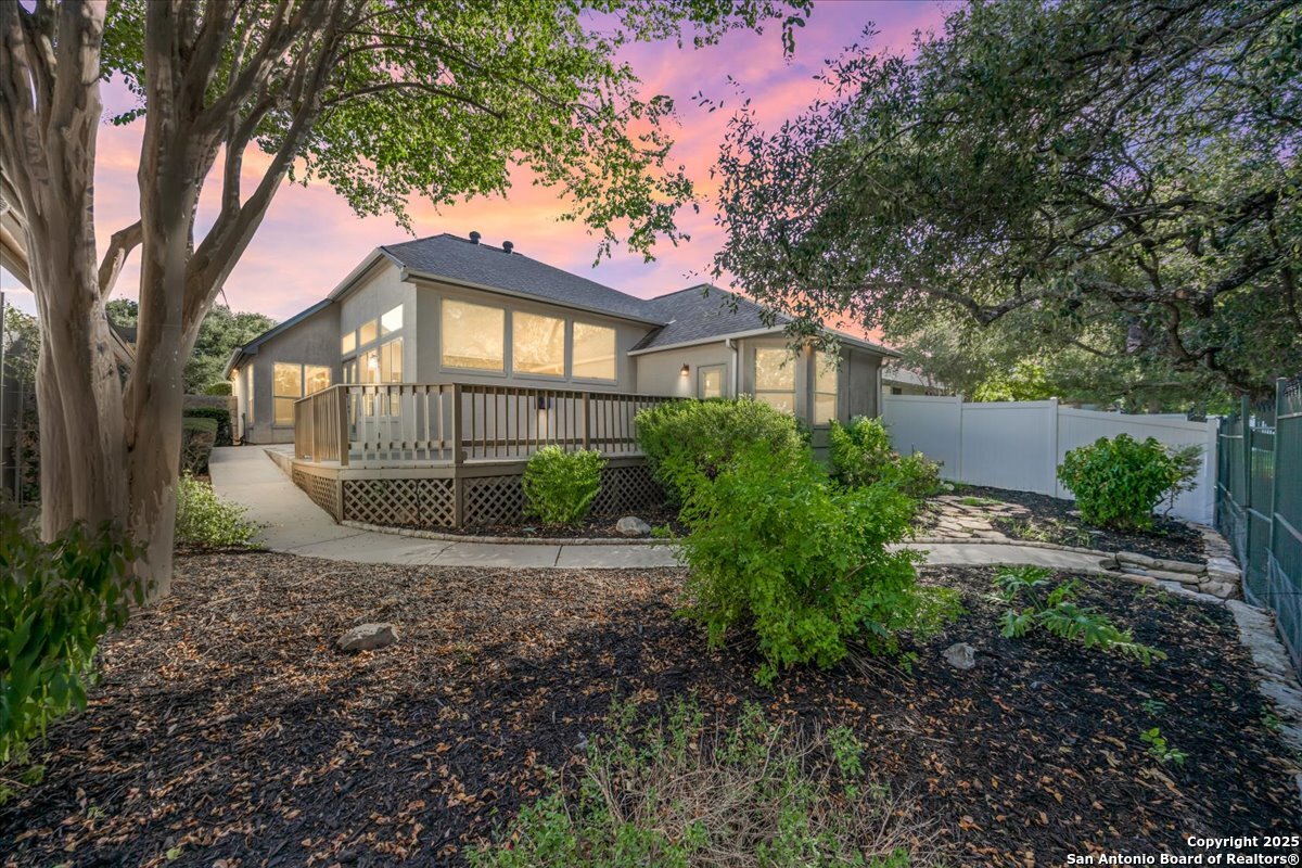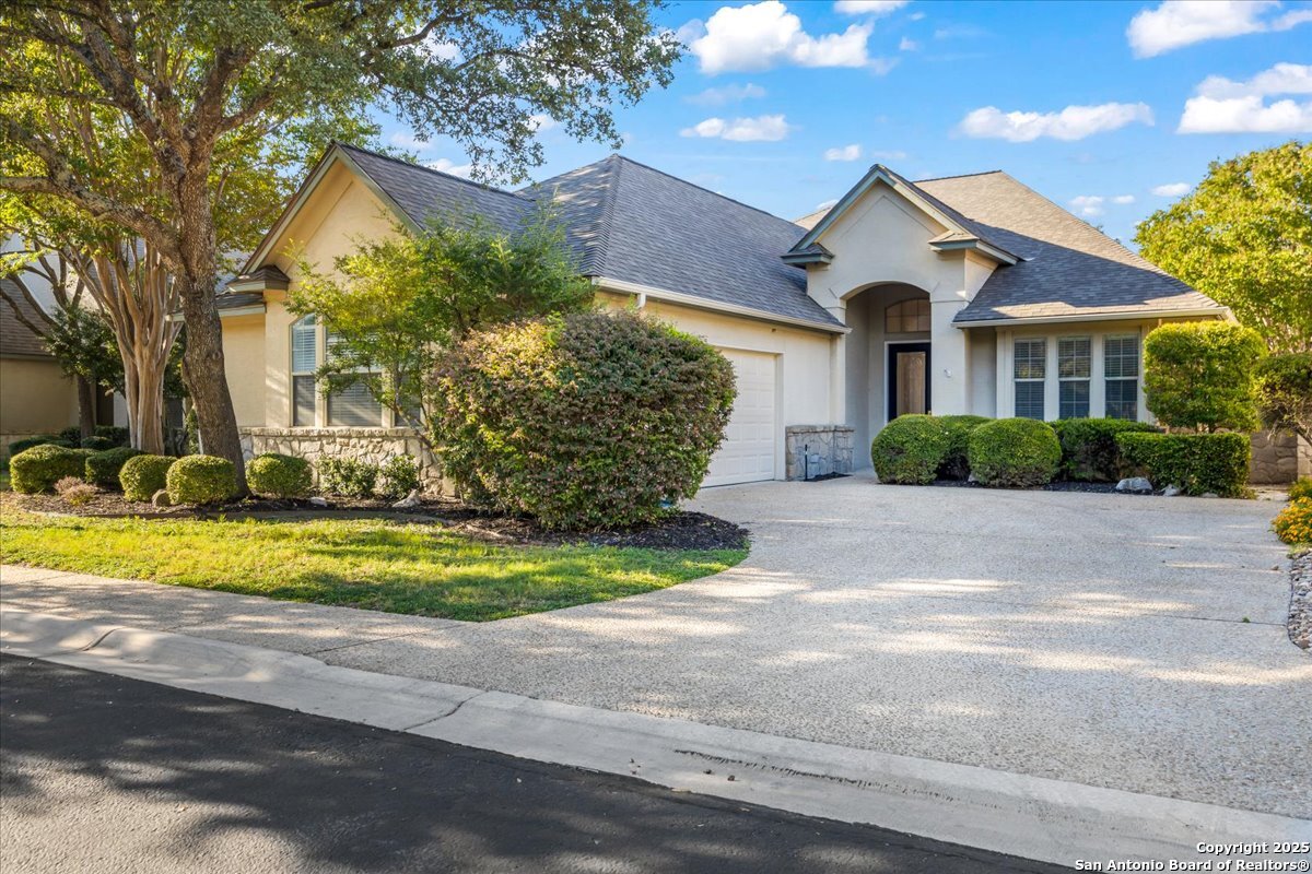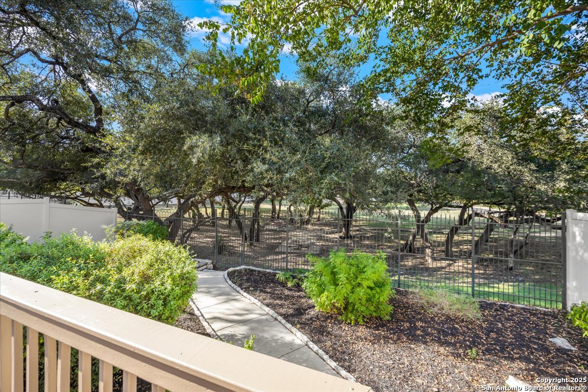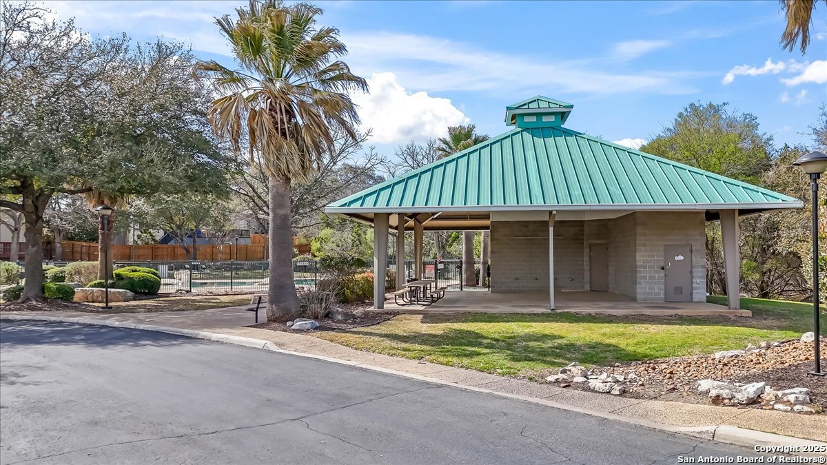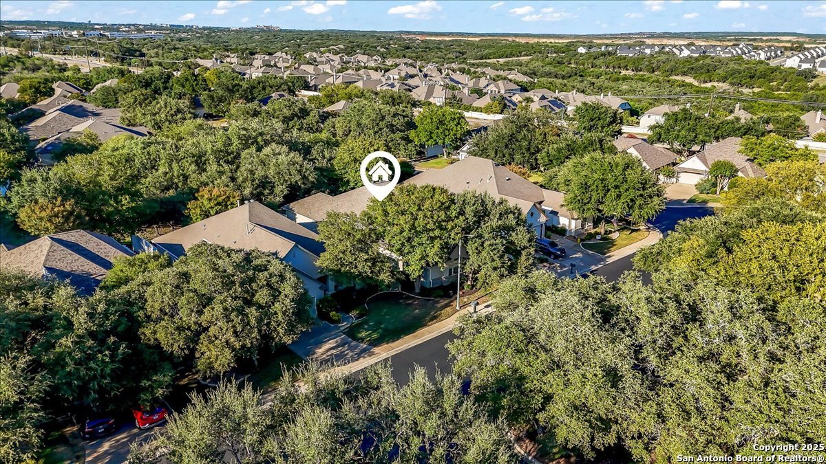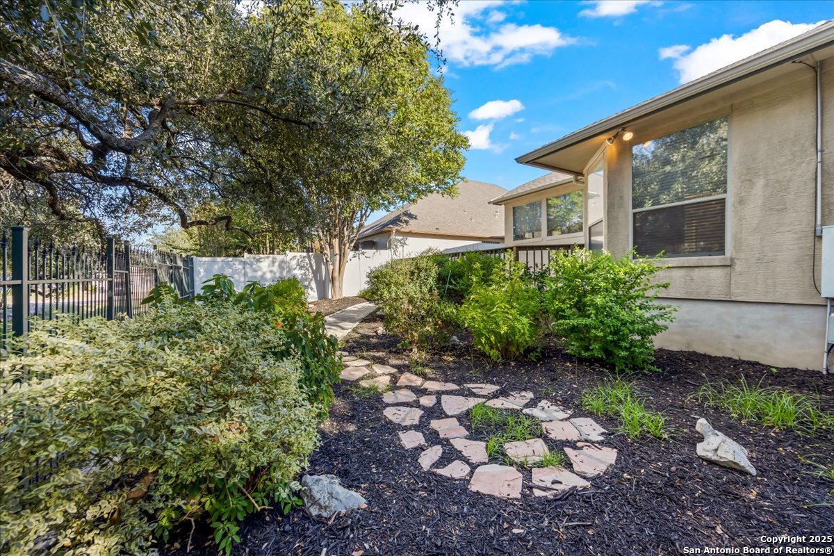 Located in the garden home section of Emerald Forest, this one-story residence offers comfort, privacy, and a low-maintenance lifestyle. Backing to a park with no neighbors behind, the home enjoys peaceful greenbelt views and natural surroundings. Inside, natural light fills the living spaces, highlighted by a fireplace in the family room that adds warmth and charm. A dedicated dining room is perfect for gatherings, while the separate office or studio provides flexibility for work or hobbies. The kitchen connects seamlessly with the living areas, making daily life both easy and enjoyable. The bedrooms are generously sized, and the primary suite offers a private retreat with plenty of space. There is no carpet anywhere in the home, and fresh paint throughout gives it a clean, updated feel. Recent improvements include a new water heater in 2025. The oversized garage is another standout, complete with built-ins that appeal to car enthusiasts, hobbyists, or anyone needing extra storage. Outside, the garden-sized yard is easy to maintain yet offers room to relax and enjoy the natural setting. Emerald Forest is a gated community known for its tree-lined streets, pool, sports courts, and abundant green space. Families appreciate the convenience of feeding into the prestigious North East Independent School District, along with easy access to shopping, dining, and major highways. This Emerald Forest garden home blends a practical layout with community amenities and a private backdrop, ready to welcome its next owner.