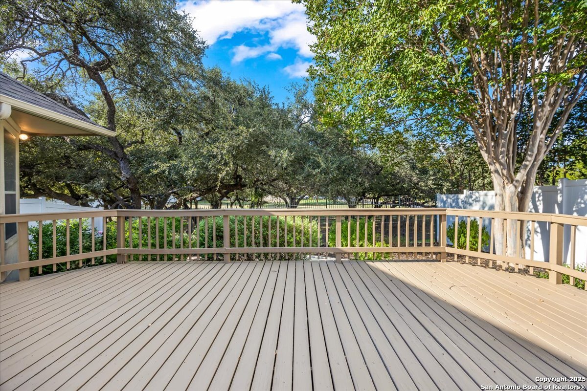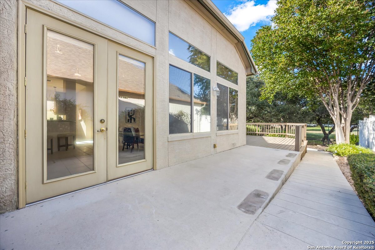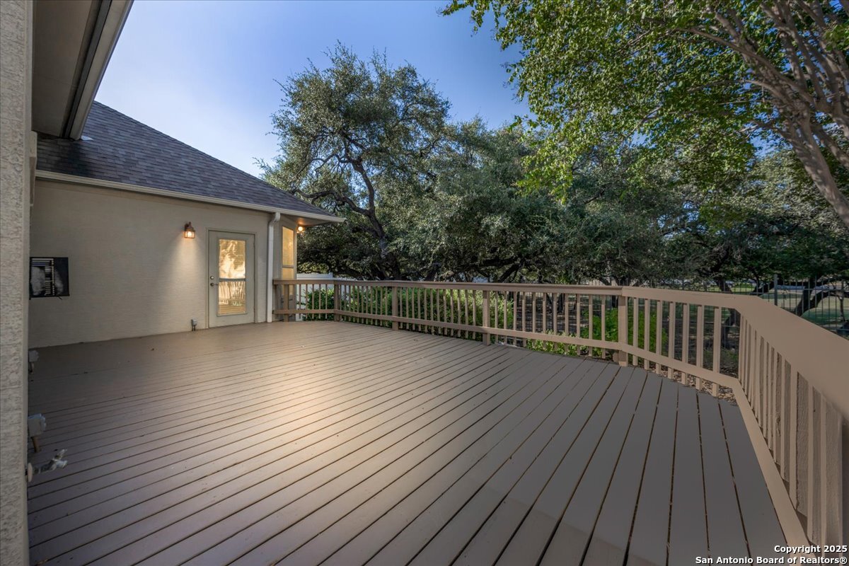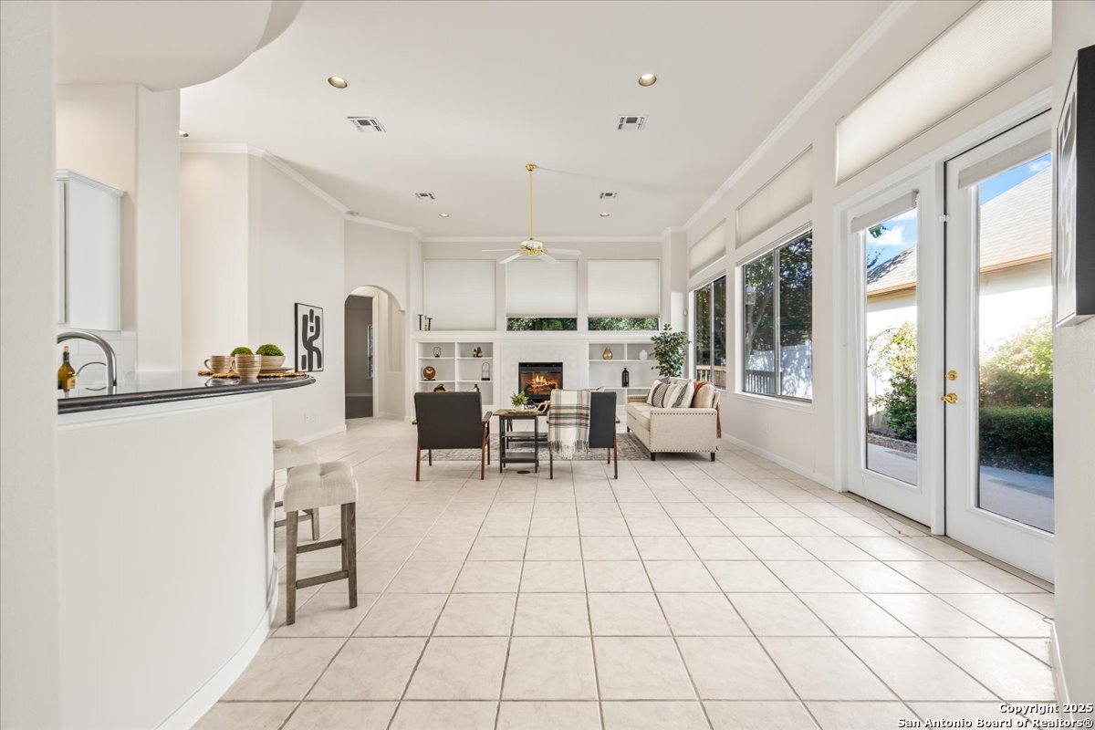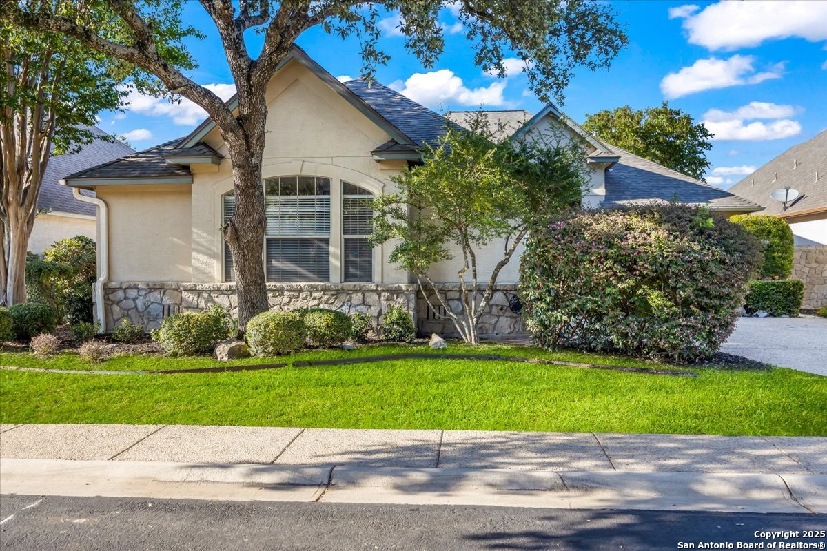 Located in the garden home section of Emerald Forest, this one-story residence offers comfort, privacy, and a low-maintenance lifestyle. Backing to a park with no neighbors behind, the home enjoys peaceful greenbelt views and natural surroundings. Inside, natural light fills the living spaces, highlighted by a fireplace in the family room that adds warmth and charm. A dedicated dining room is perfect for gatherings, while the separate office or studio provides flexibility for work or hobbies. The kitchen connects seamlessly with the living areas, making daily life both easy and enjoyable. The bedrooms are generously sized, and the primary suite offers a private retreat with plenty of space. There is no carpet anywhere in the home, and fresh paint throughout gives it a clean, updated feel. Recent improvements include a new water heater in 2025. The oversized garage is another standout, complete with built-ins that appeal to car enthusiasts, hobbyists, or anyone needing extra storage. Outside, the garden-sized yard is easy to maintain yet offers room to relax and enjoy the natural setting. Emerald Forest is a gated community known for its tree-lined streets, pool, sports courts, and abundant green space. Families appreciate the convenience of feeding into the prestigious North East Independent School District, along with easy access to shopping, dining, and major highways. This Emerald Forest garden home blends a practical layout with community amenities and a private backdrop, ready to welcome its next owner.