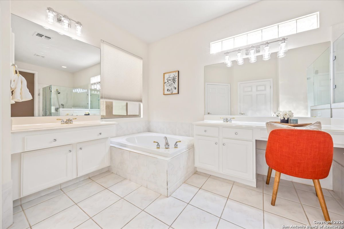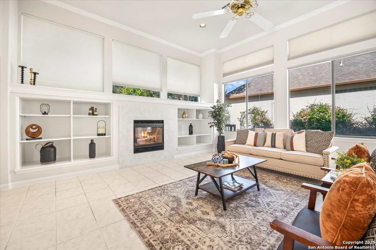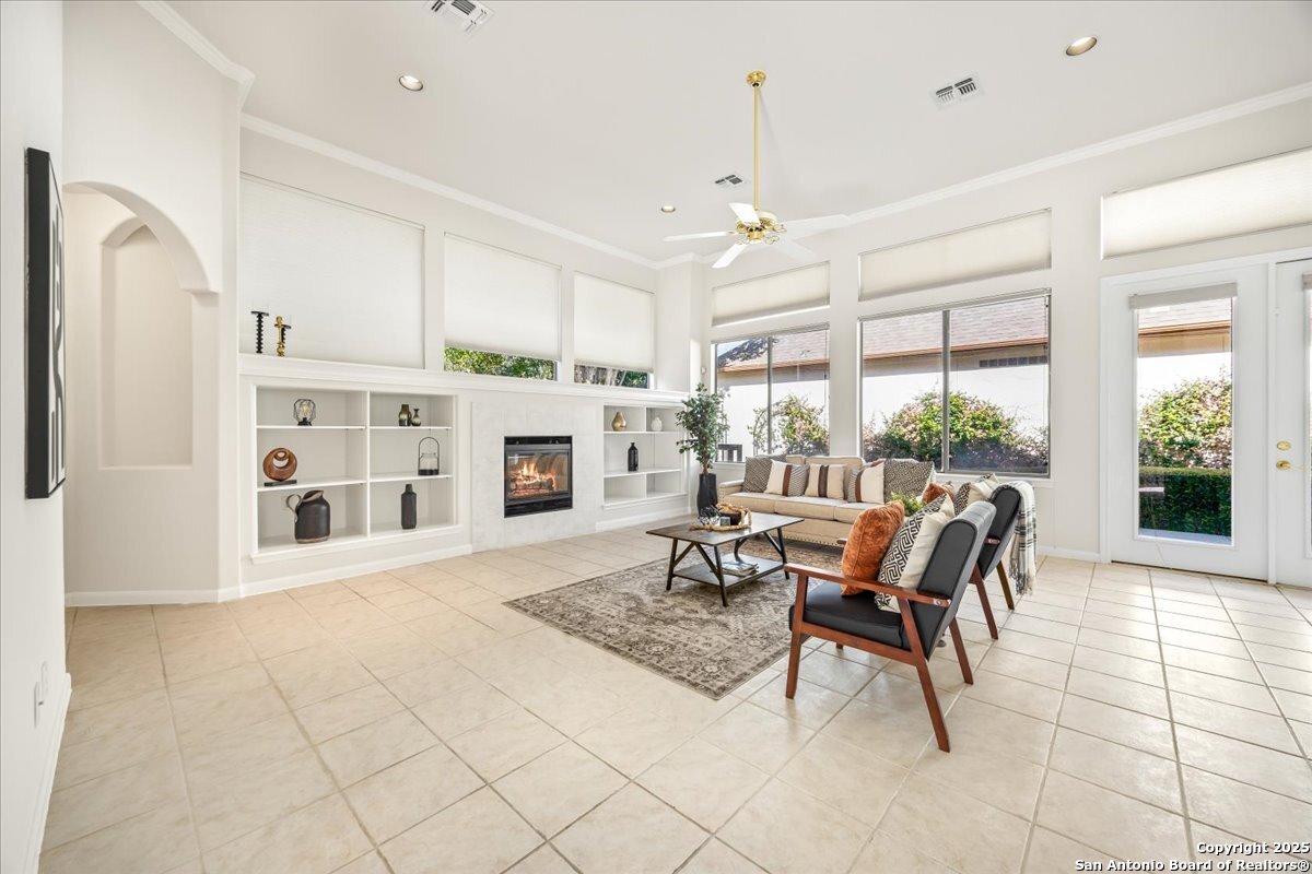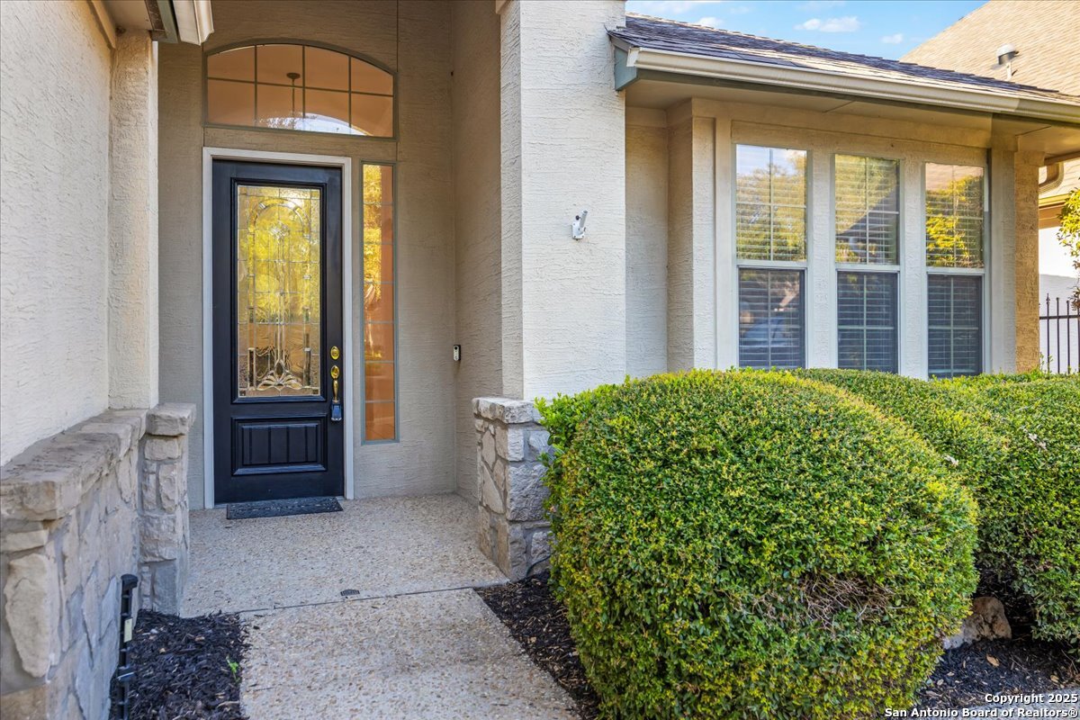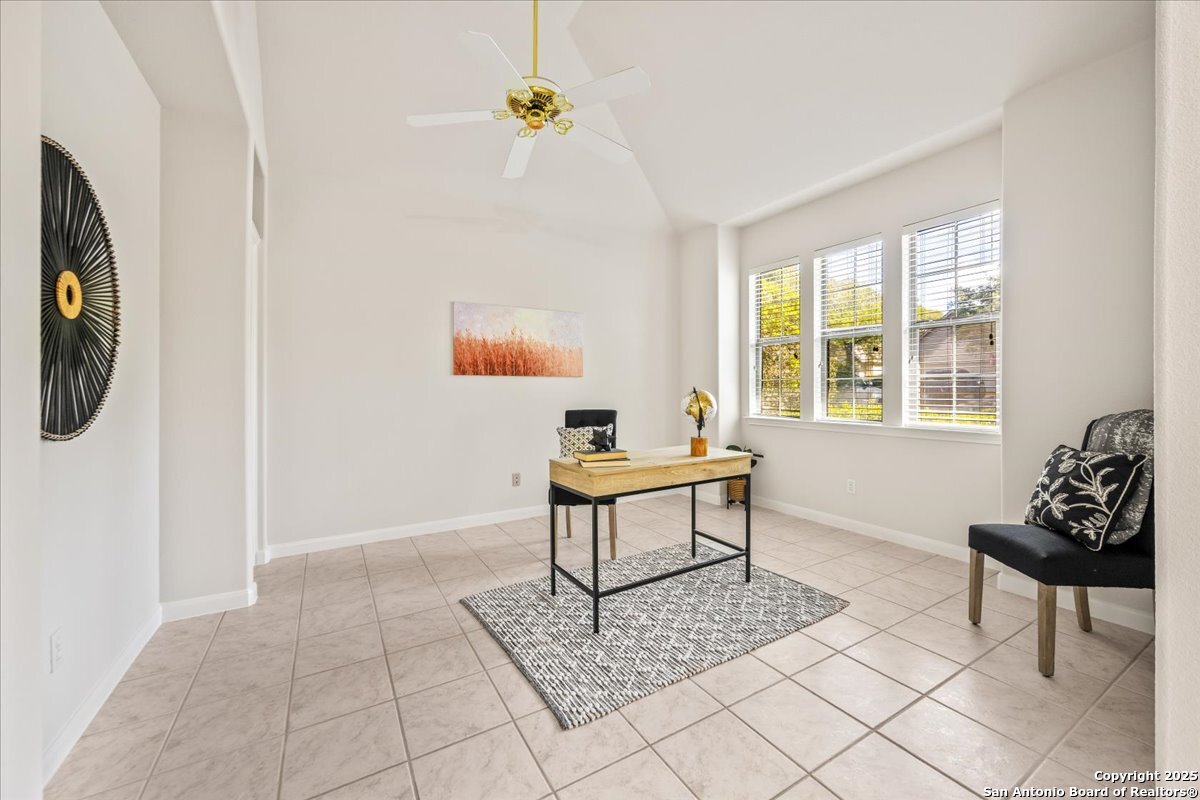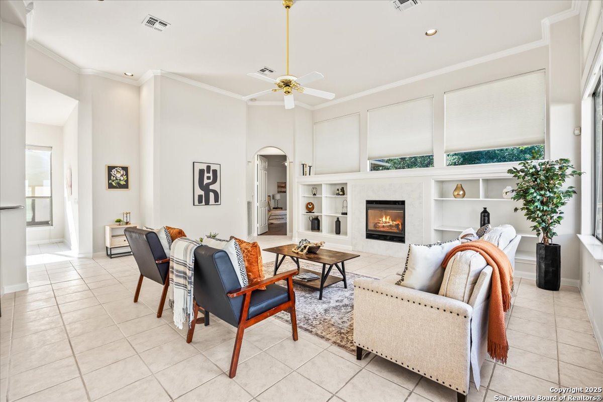 Located in the garden home section of Emerald Forest, this one-story residence offers comfort, privacy, and a low-maintenance lifestyle. Backing to a park with no neighbors behind, the home enjoys peaceful greenbelt views and natural surroundings. Inside, natural light fills the living spaces, highlighted by a fireplace in the family room that adds warmth and charm. A dedicated dining room is perfect for gatherings, while the separate office or studio provides flexibility for work or hobbies. The kitchen connects seamlessly with the living areas, making daily life both easy and enjoyable. The bedrooms are generously sized, and the primary suite offers a private retreat with plenty of space. There is no carpet anywhere in the home, and fresh paint throughout gives it a clean, updated feel. Recent improvements include a new water heater in 2025. The oversized garage is another standout, complete with built-ins that appeal to car enthusiasts, hobbyists, or anyone needing extra storage. Outside, the garden-sized yard is easy to maintain yet offers room to relax and enjoy the natural setting. Emerald Forest is a gated community known for its tree-lined streets, pool, sports courts, and abundant green space. Families appreciate the convenience of feeding into the prestigious North East Independent School District, along with easy access to shopping, dining, and major highways. This Emerald Forest garden home blends a practical layout with community amenities and a private backdrop, ready to welcome its next owner.