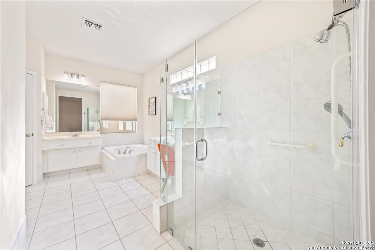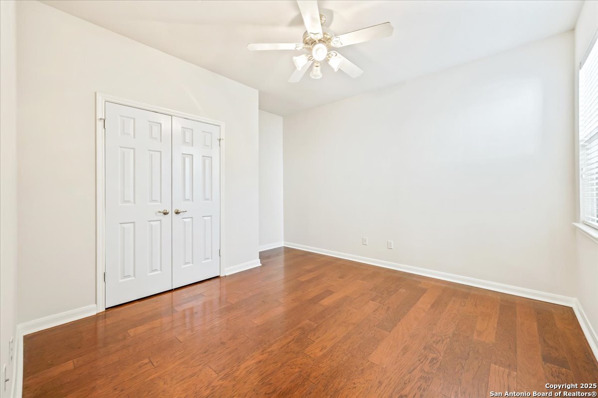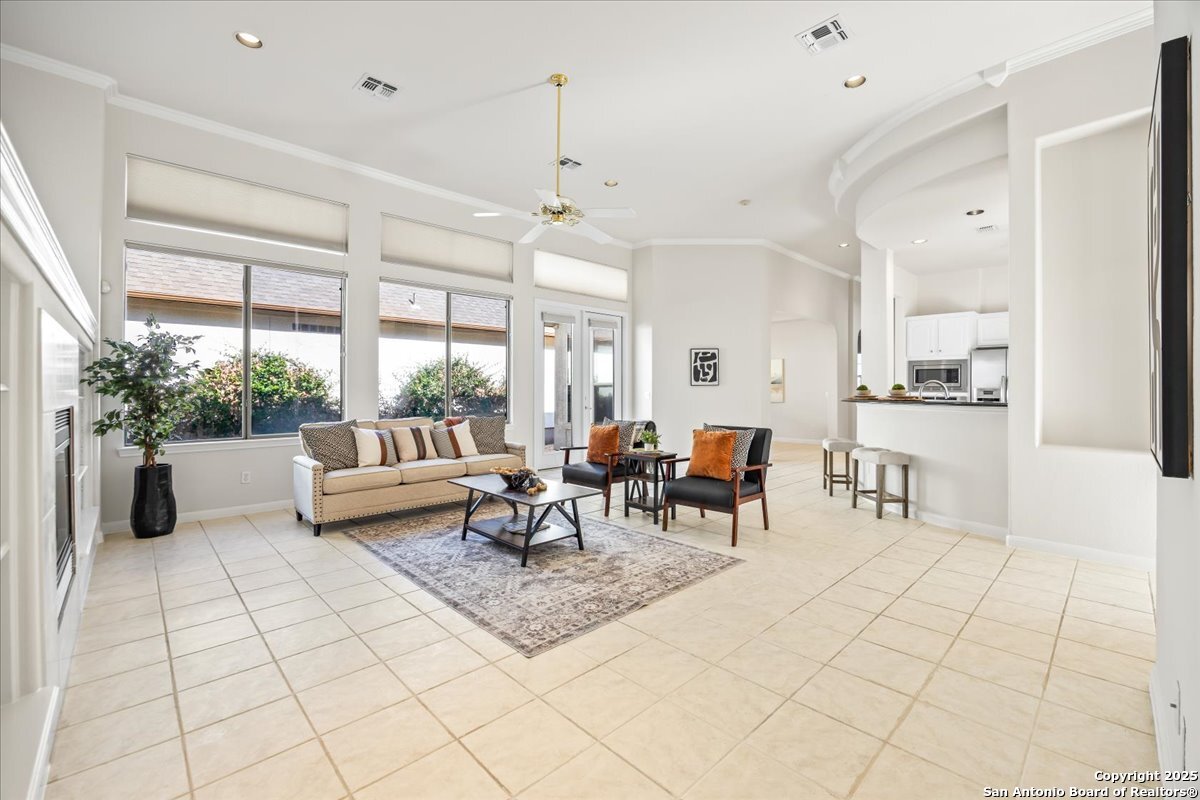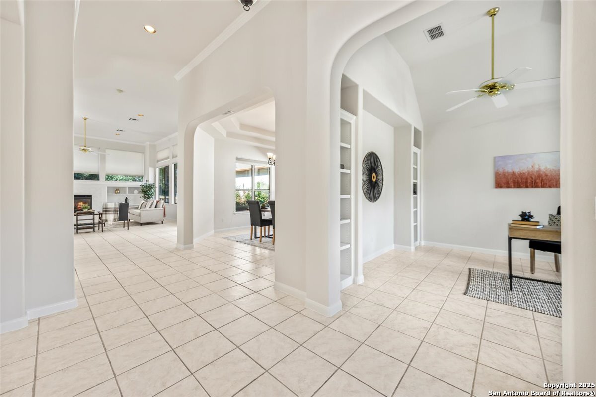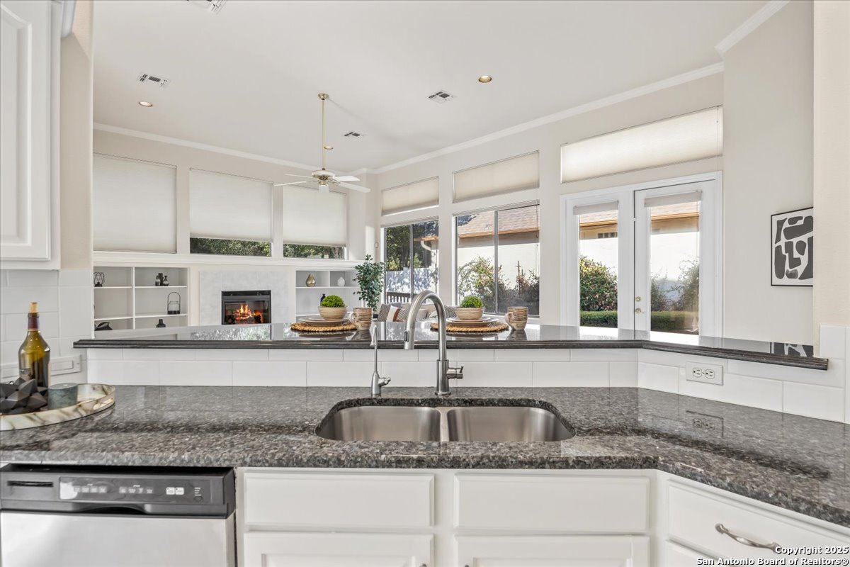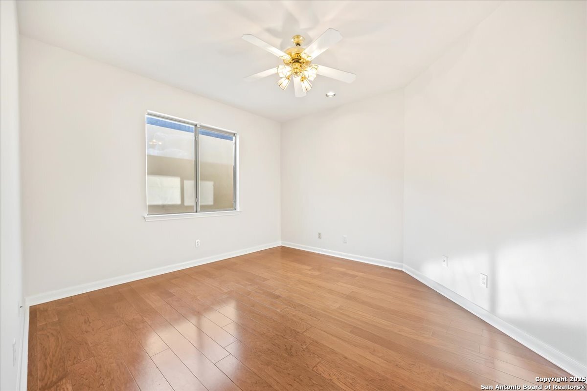 Located in the garden home section of Emerald Forest, this one-story residence offers comfort, privacy, and a low-maintenance lifestyle. Backing to a park with no neighbors behind, the home enjoys peaceful greenbelt views and natural surroundings. Inside, natural light fills the living spaces, highlighted by a fireplace in the family room that adds warmth and charm. A dedicated dining room is perfect for gatherings, while the separate office or studio provides flexibility for work or hobbies. The kitchen connects seamlessly with the living areas, making daily life both easy and enjoyable. The bedrooms are generously sized, and the primary suite offers a private retreat with plenty of space. There is no carpet anywhere in the home, and fresh paint throughout gives it a clean, updated feel. Recent improvements include a new water heater in 2025. The oversized garage is another standout, complete with built-ins that appeal to car enthusiasts, hobbyists, or anyone needing extra storage. Outside, the garden-sized yard is easy to maintain yet offers room to relax and enjoy the natural setting. Emerald Forest is a gated community known for its tree-lined streets, pool, sports courts, and abundant green space. Families appreciate the convenience of feeding into the prestigious North East Independent School District, along with easy access to shopping, dining, and major highways. This Emerald Forest garden home blends a practical layout with community amenities and a private backdrop, ready to welcome its next owner.