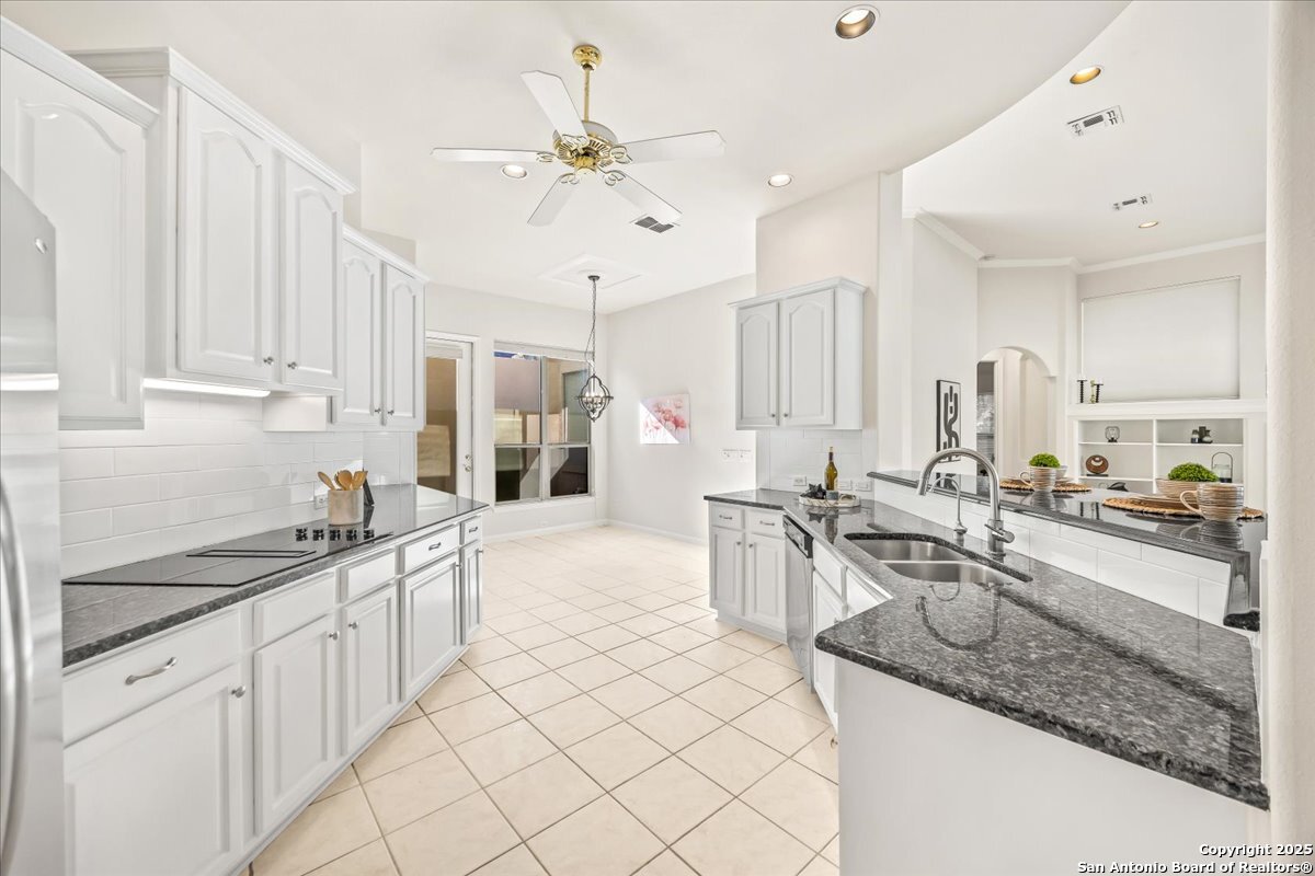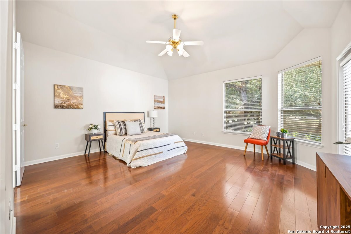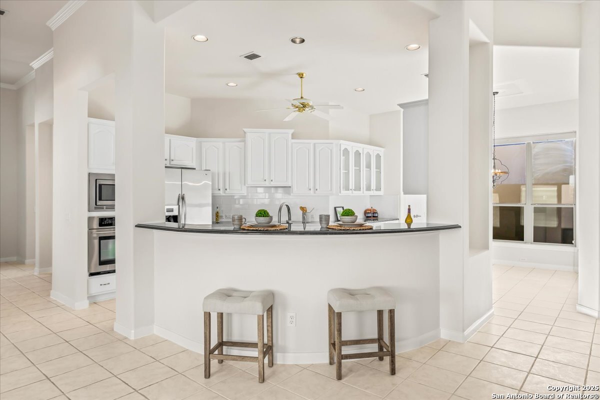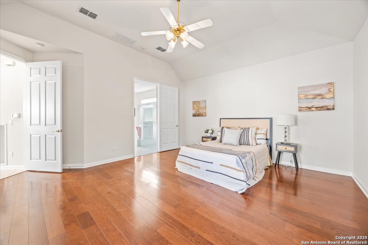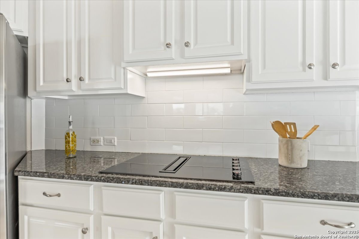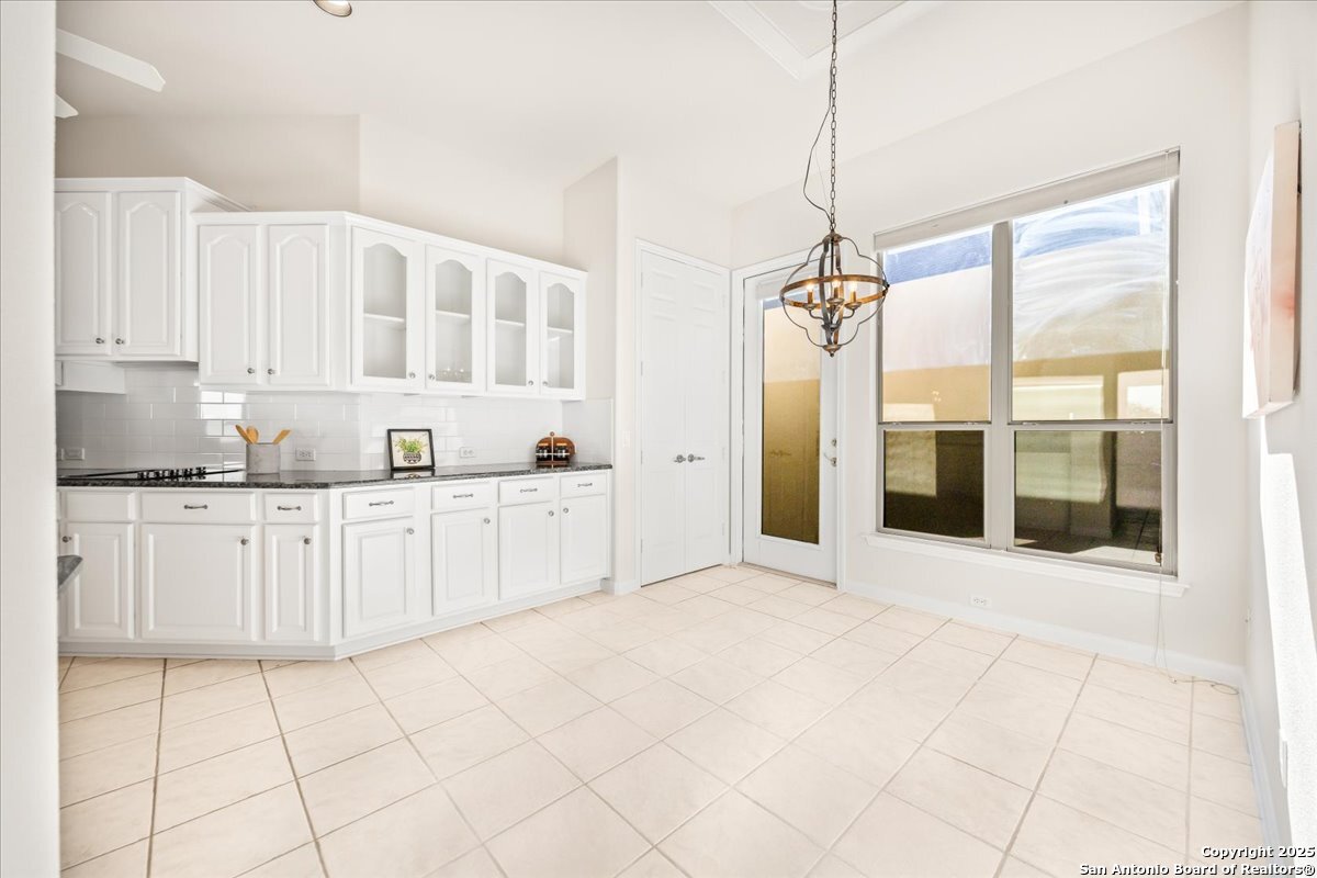Located in the garden home section of Emerald Forest, this one-story residence offers comfort, privacy, and a low-maintenance lifestyle. Backing to a park with no neighbors behind, the home enjoys peaceful greenbelt views and natural surroundings. Inside, natural light fills the living spaces, highlighted by a fireplace in the family room that adds warmth and charm. A dedicated dining room is perfect for gatherings, while the separate office or studio provides flexibility for work or hobbies. The kitchen connects seamlessly with the living areas, making daily life both easy and enjoyable. The bedrooms are generously sized, and the primary suite offers a private retreat with plenty of space. There is no carpet anywhere in the home, and fresh paint throughout gives it a clean, updated feel. Recent improvements include a new water heater in 2025. The oversized garage is another standout, complete with built-ins that appeal to car enthusiasts, hobbyists, or anyone needing extra storage. Outside, the garden-sized yard is easy to maintain yet offers room to relax and enjoy the natural setting. Emerald Forest is a gated community known for its tree-lined streets, pool, sports courts, and abundant green space. Families appreciate the convenience of feeding into the prestigious North East Independent School District, along with easy access to shopping, dining, and major highways. This Emerald Forest garden home blends a practical layout with community amenities and a private backdrop, ready to welcome its next owner.