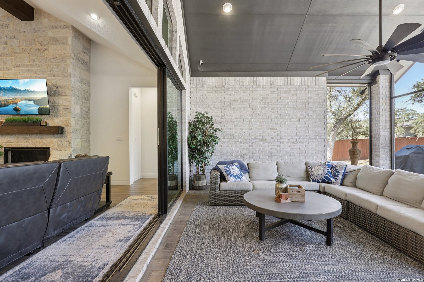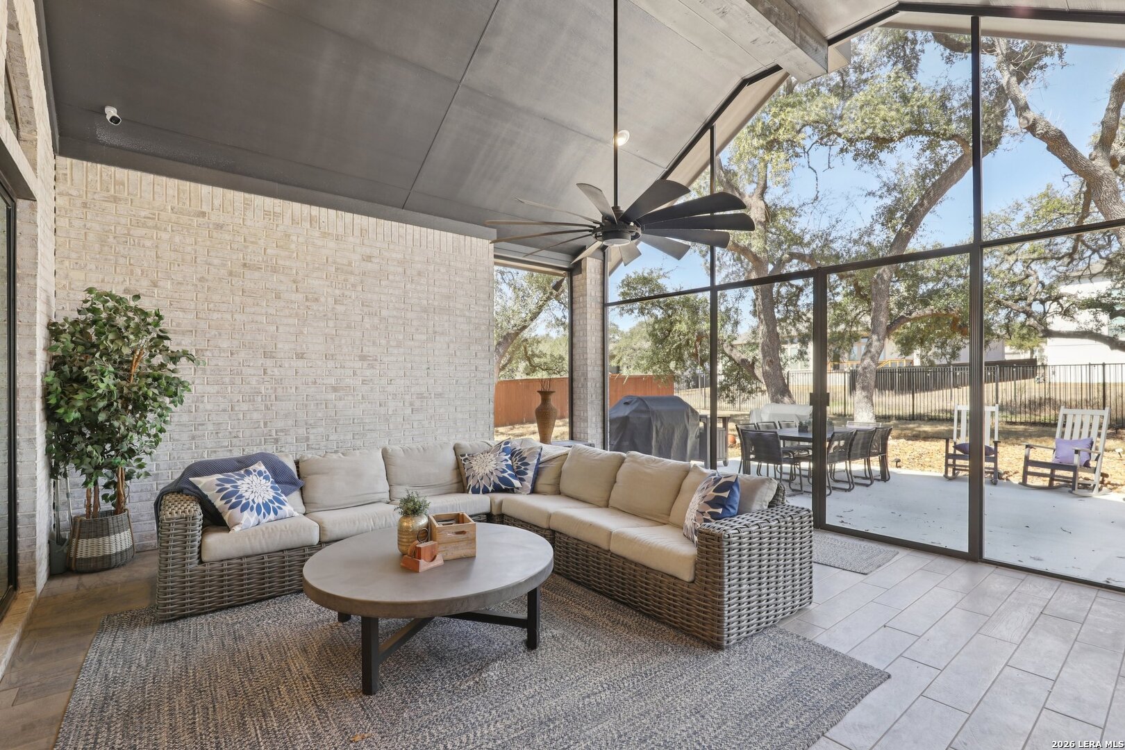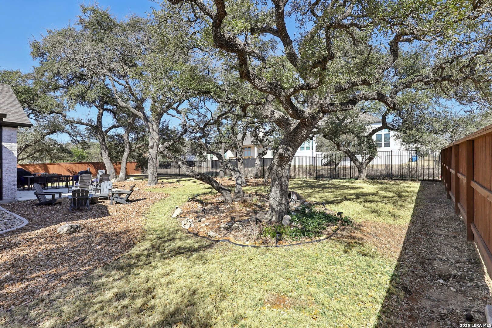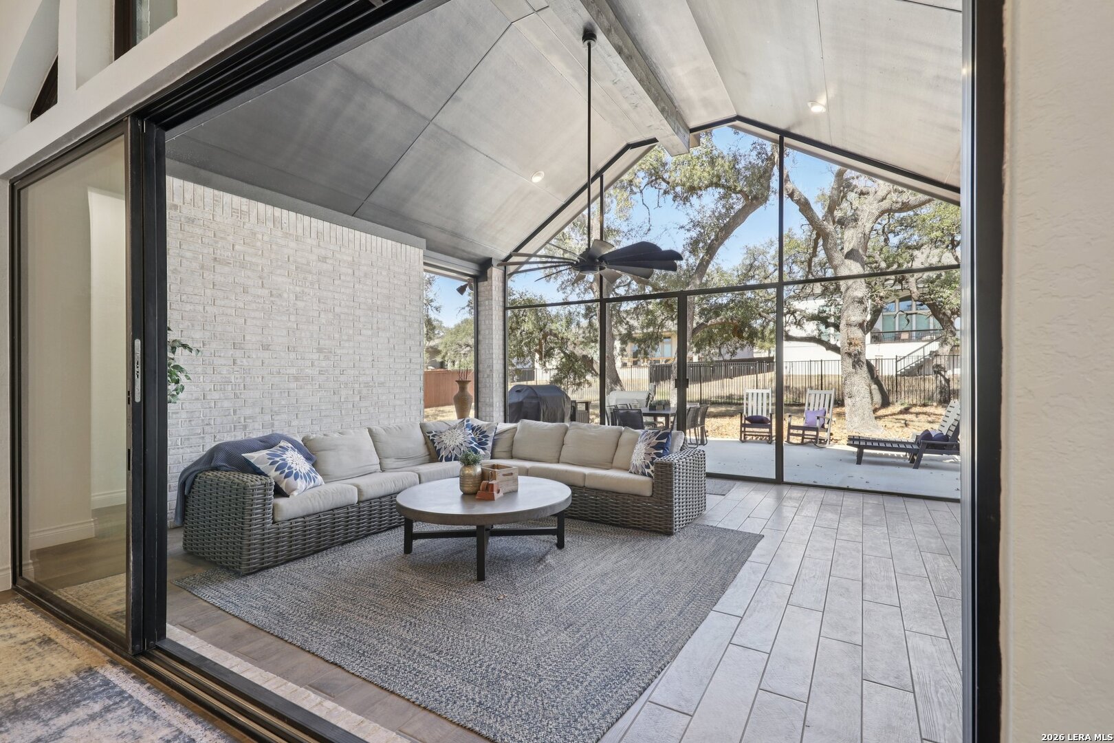 Welcome to one of the most upgraded homes you will find on the market in Bulverde, TX. This stunning one story luxury home offers more than 3,300 square feet of thoughtfully designed living space and features 4 spacious bedrooms, 3 full bathrooms, a private study, a dedicated media room, and a breathtaking screened in outdoor living area that allows you to enjoy the beauty of Texas Hill Country living year round. From the moment you walk inside, the attention to detail and high end upgrades immediately stand out. The open concept living room features soaring vaulted ceilings with beautiful wood wrapped beams and a dramatic floor to ceiling stone fireplace that creates a warm and inviting centerpiece for the home. Gorgeous wood look tile flows throughout the main living areas and the primary suite, offering both durability and style, while plush carpet is reserved for the secondary bedrooms for added comfort. The kitchen is truly a showstopper and designed for both entertaining and everyday living. Beautiful upgraded granite countertops pair perfectly with the striking two tone cabinetry, featuring crisp white upper cabinets and rich natural wood lowers. Cooking enthusiasts will love the built in double ovens, microwave, upgraded five burner gas cooktop, pot filler, and the incredible amount of cabinet storage including an additional row of upper cabinets for maximum functionality. Massive sliding glass doors open from the living room to one of the most impressive outdoor living spaces you will find. The vaulted covered patio leads into a large screened in porch that allows you to enjoy the outdoors while staying comfortable in every season. A gas stub out is already in place for a future outdoor kitchen, and an additional patio slab provides even more room for entertaining. Mature oak trees in the backyard create a peaceful and private setting that truly captures the charm of Texas living. The primary suite is a private retreat featuring vaulted ceilings, beautiful wood beam accents, and large windows that bring in abundant natural light and relaxing views of the backyard. The spa inspired primary bathroom is designed to impress with a freestanding soaking tub positioned against a custom tiled accent wall, double vanities, a dedicated makeup vanity, and an oversized walk in shower tiled to the ceiling with multiple shower heads including a luxurious rain shower. Even better, the suite includes two spacious walk in closets. Movie nights will never be the same thanks to the incredible media room, complete with a projector, surround sound system, and remote controlled blackout shades that convey with the home to create a true in home theater experience. The secondary bedrooms are generously sized and offer walk in closets and upgraded ceiling fans, while the secondary bathrooms feature beautifully designed walk in showers tiled to the ceiling for a truly luxurious feel. For those who work from home or need a quiet space, the private study features double door entry, a decorative shiplap accent wall, and beautiful views of the surrounding Hill Country landscape. Additional upgrades continue throughout the home including a whole home in wall vacuum system for added convenience and a spacious three car garage featuring epoxy flooring, built in storage racks, and a water softener system. This extraordinary property combines luxury finishes, thoughtful design, and incredible indoor outdoor living spaces to create a home that truly stands out from the rest. Homes with this level of upgrades and attention to detail rarely come available. Why build when you can have it all - Move In Ready!!