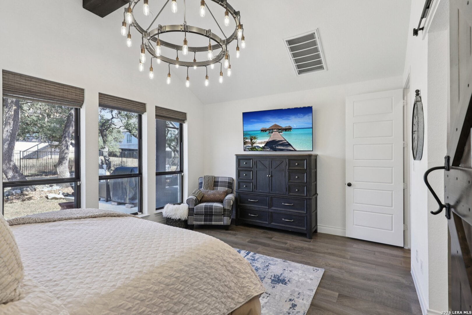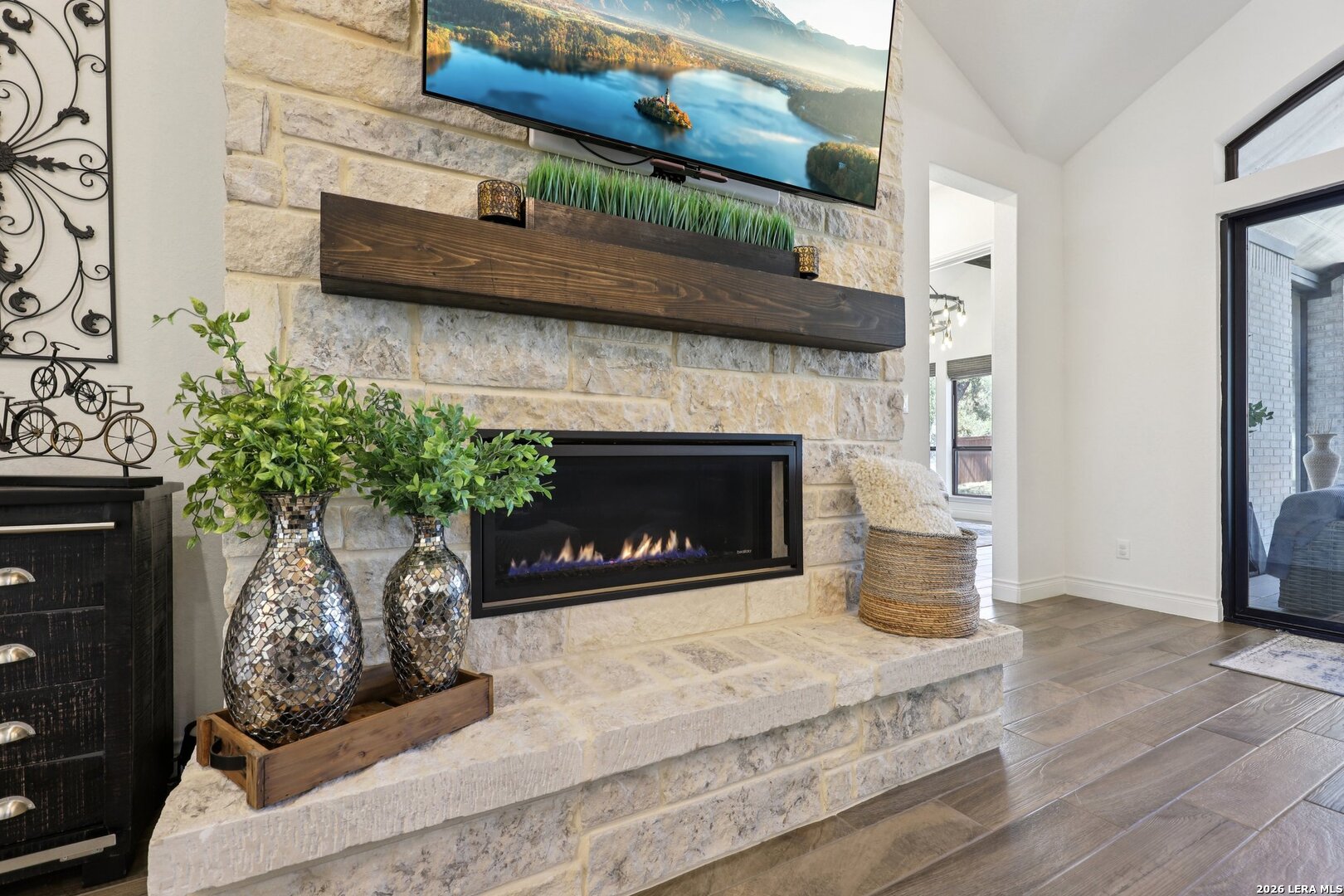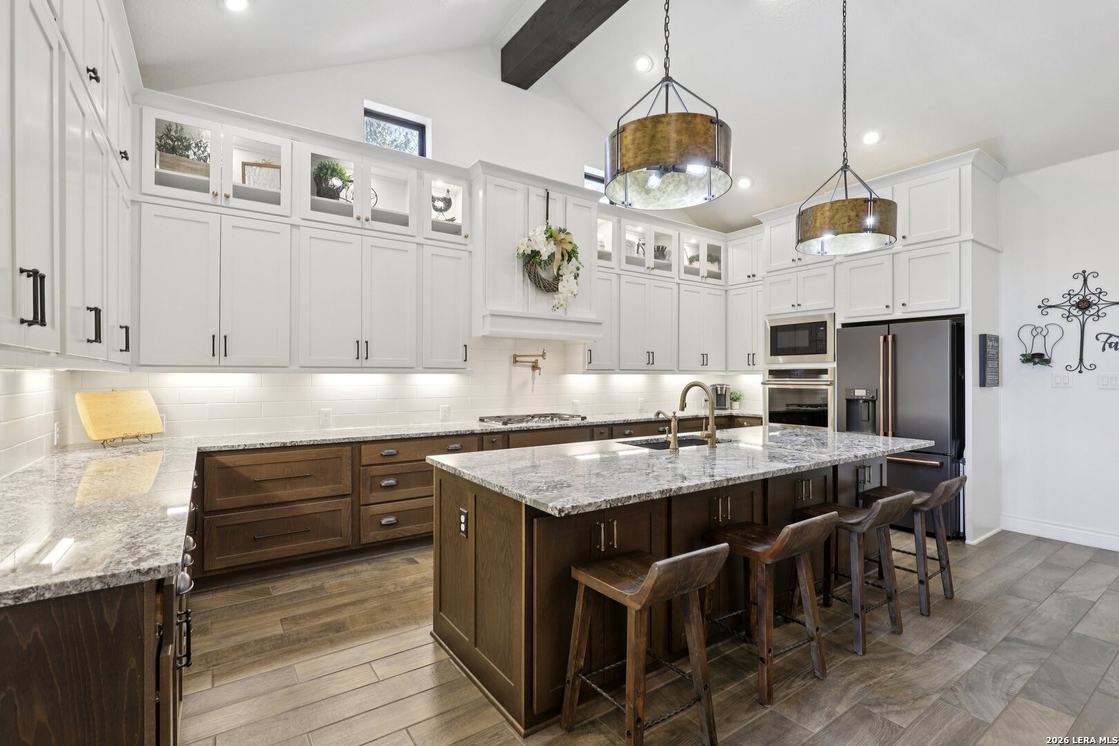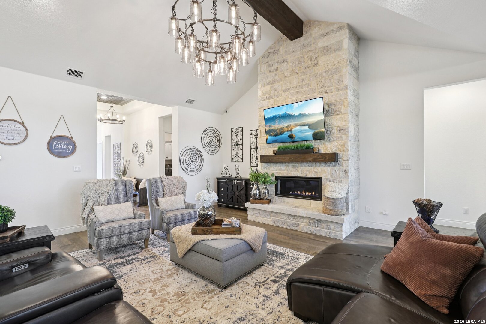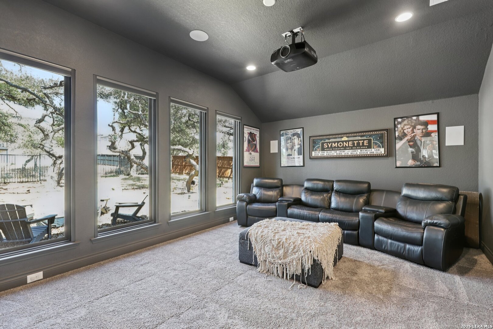 Welcome to one of the most upgraded homes you will find on the market in Bulverde, TX. This stunning one story luxury home offers more than 3,300 square feet of thoughtfully designed living space and features 4 spacious bedrooms, 3 full bathrooms, a private study, a dedicated media room, and a breathtaking screened in outdoor living area that allows you to enjoy the beauty of Texas Hill Country living year round. From the moment you walk inside, the attention to detail and high end upgrades immediately stand out. The open concept living room features soaring vaulted ceilings with beautiful wood wrapped beams and a dramatic floor to ceiling stone fireplace that creates a warm and inviting centerpiece for the home. Gorgeous wood look tile flows throughout the main living areas and the primary suite, offering both durability and style, while plush carpet is reserved for the secondary bedrooms for added comfort. The kitchen is truly a showstopper and designed for both entertaining and everyday living. Beautiful upgraded granite countertops pair perfectly with the striking two tone cabinetry, featuring crisp white upper cabinets and rich natural wood lowers. Cooking enthusiasts will love the built in double ovens, microwave, upgraded five burner gas cooktop, pot filler, and the incredible amount of cabinet storage including an additional row of upper cabinets for maximum functionality. Massive sliding glass doors open from the living room to one of the most impressive outdoor living spaces you will find. The vaulted covered patio leads into a large screened in porch that allows you to enjoy the outdoors while staying comfortable in every season. A gas stub out is already in place for a future outdoor kitchen, and an additional patio slab provides even more room for entertaining. Mature oak trees in the backyard create a peaceful and private setting that truly captures the charm of Texas living. The primary suite is a private retreat featuring vaulted ceilings, beautiful wood beam accents, and large windows that bring in abundant natural light and relaxing views of the backyard. The spa inspired primary bathroom is designed to impress with a freestanding soaking tub positioned against a custom tiled accent wall, double vanities, a dedicated makeup vanity, and an oversized walk in shower tiled to the ceiling with multiple shower heads including a luxurious rain shower. Even better, the suite includes two spacious walk in closets. Movie nights will never be the same thanks to the incredible media room, complete with a projector, surround sound system, and remote controlled blackout shades that convey with the home to create a true in home theater experience. The secondary bedrooms are generously sized and offer walk in closets and upgraded ceiling fans, while the secondary bathrooms feature beautifully designed walk in showers tiled to the ceiling for a truly luxurious feel. For those who work from home or need a quiet space, the private study features double door entry, a decorative shiplap accent wall, and beautiful views of the surrounding Hill Country landscape. Additional upgrades continue throughout the home including a whole home in wall vacuum system for added convenience and a spacious three car garage featuring epoxy flooring, built in storage racks, and a water softener system. This extraordinary property combines luxury finishes, thoughtful design, and incredible indoor outdoor living spaces to create a home that truly stands out from the rest. Homes with this level of upgrades and attention to detail rarely come available. Why build when you can have it all - Move In Ready!!