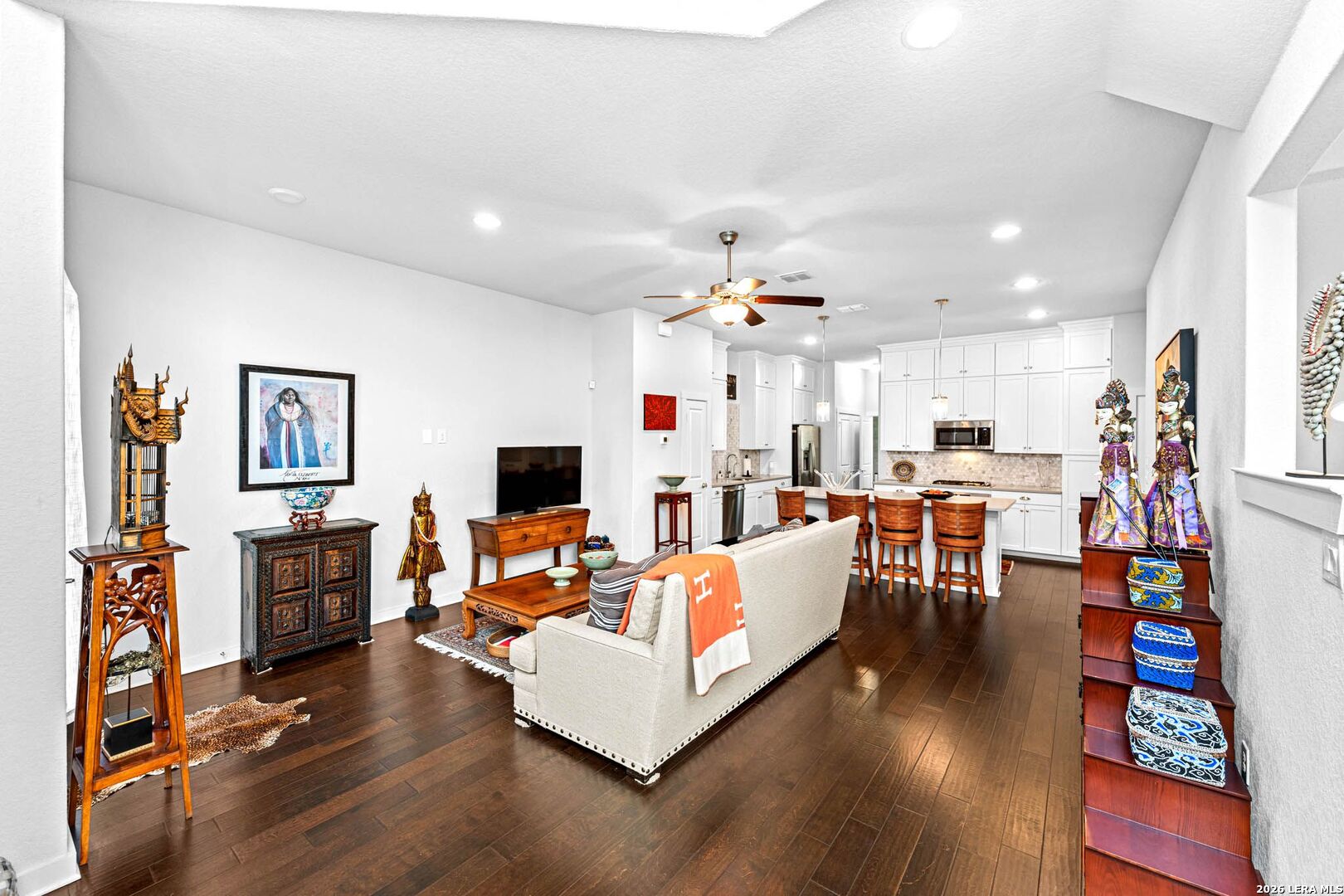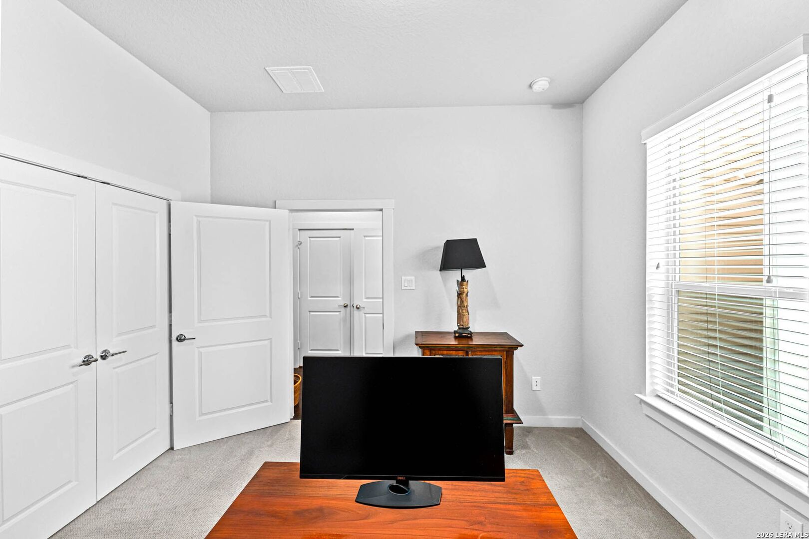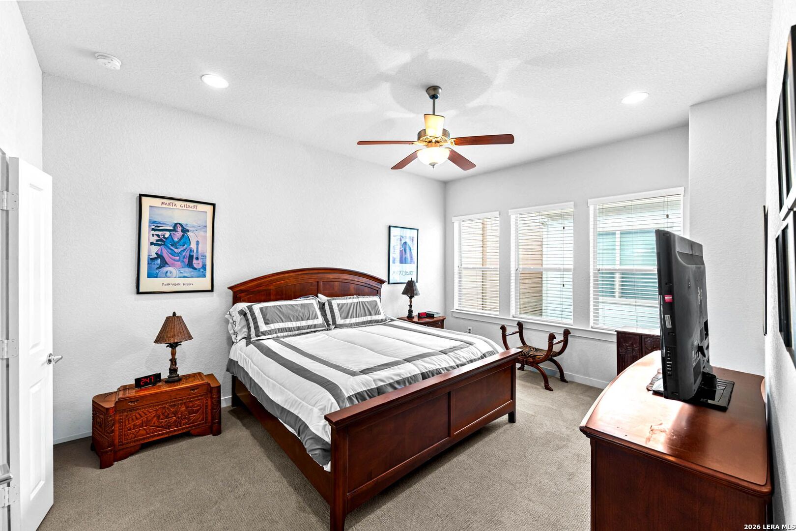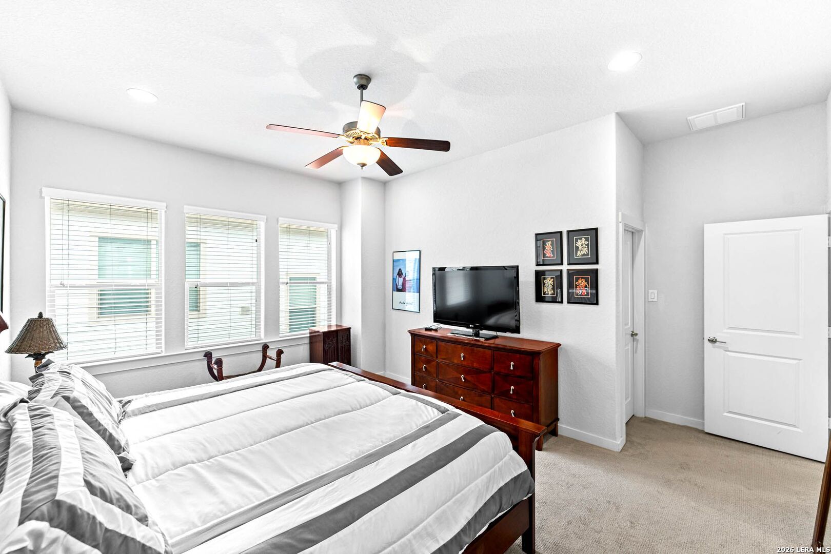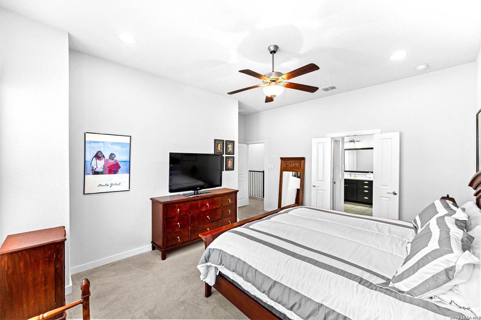 Experience modern city living in this thoughtfully designed three-story residence at The Gardens at Urban Crest, perfect for a lock-and-leave lifestyle. This home offers three bedrooms and three full bathrooms, with a flexible layout that provides privacy and functionality on every level. The first floor features a guest suite with direct access to a private patio, while the second level showcases a bright, open kitchen and living space ideal for entertaining, along with an additional guest bedroom. The top floor is reserved for the primary retreat, offering three closets, a spacious bathroom, and a private loft area that can be used as a sitting room, office, or media space. Media room furniture is available with the home, and the garage is equipped with a Level 2 EV charger for added convenience. The location offers easy access to Fort Sam Houston and surrounding amenities.
