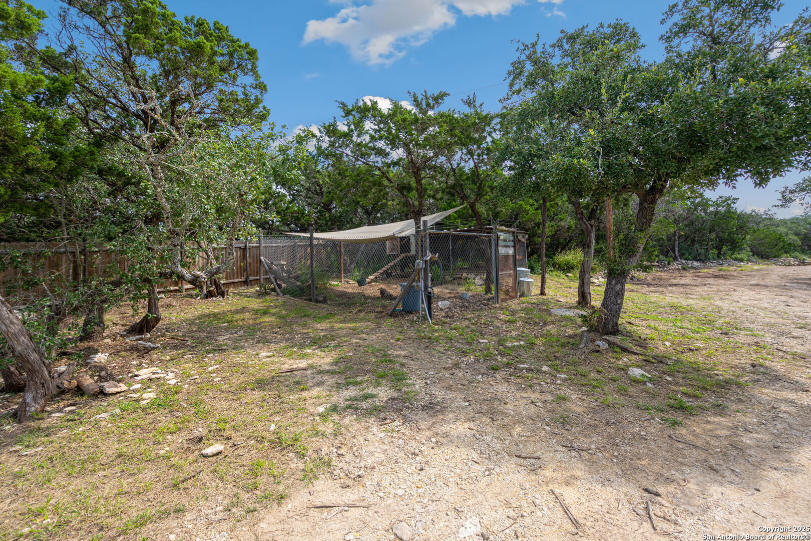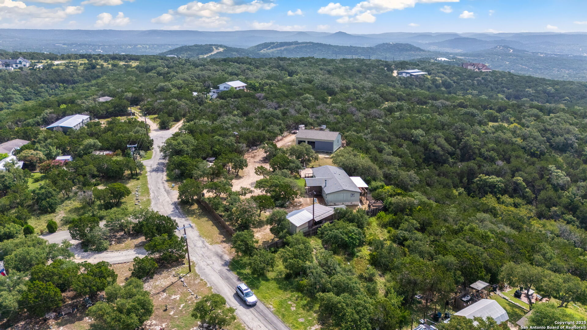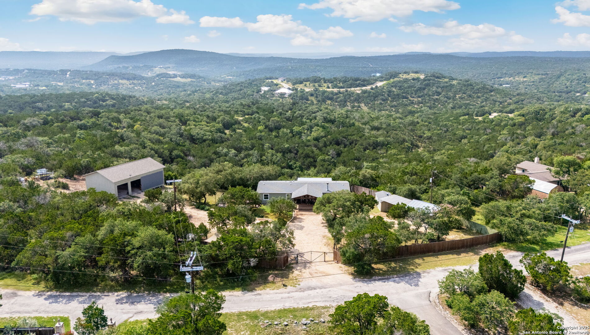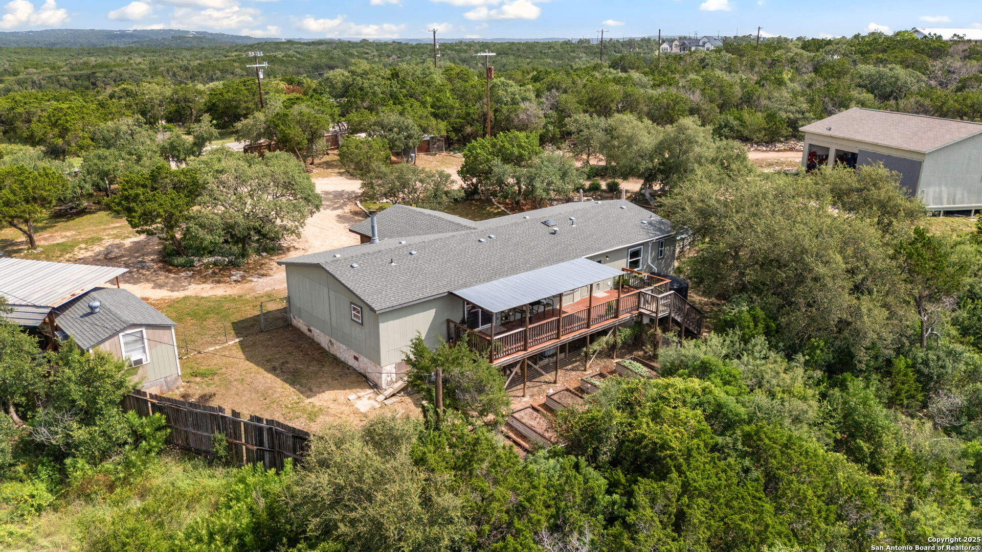 Welcome to a micro homesteader's dream in the Texas Hill Country. Set on 2.2 acres inside the gated community of Big Valley, just a short drive from Helotes, Lakehills, Bandera, and Boerne, this peaceful property offers the perfect blend of sustainable living and comfort. The 4-bedroom, 2.5-bath home sits perched to capture stunning views from a sprawling back deck-partially covered and perfect for sunrise coffee or evening wind-downs. Enjoy the serene Hill Country landscape from your above-ground pool with a wraparound deck, or tend to the raised garden beds, safely fenced to protect your harvest. Bring your animals-there's a chicken coop ready for fresh eggs and two sheds for all your storage needs. A massive detached workshop with oversized sliding doors offers endless possibilities for hobbies, projects, or business use. Inside, the home has been thoughtfully updated with durable laminate plank flooring throughout, recessed lighting, freshly painted interiors, and bathrooms that blend rustic touches with modern style. The kitchen features an updated solid-surface countertop and a stunning custom live-edge wood bar that opens into the living area-ideal for hosting or quiet nights at home. Additional highlights include a large rainwater catchment system, electric gate entry, and an incredible covered front porch with cedar accents-welcoming and warm year-round. Located in the Northside ISD district but far enough out to enjoy starry skies, this property offers a rare opportunity to live simply, grow your own food, and unplug-without giving up access to town. The sellers have priced this one with intention-making sustainable Hill Country living truly attainable for those who've been dreaming of space, chickens, gardens, and fresh air.