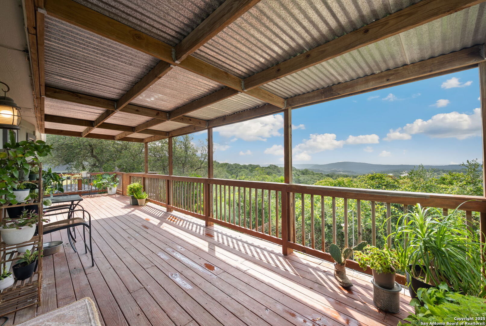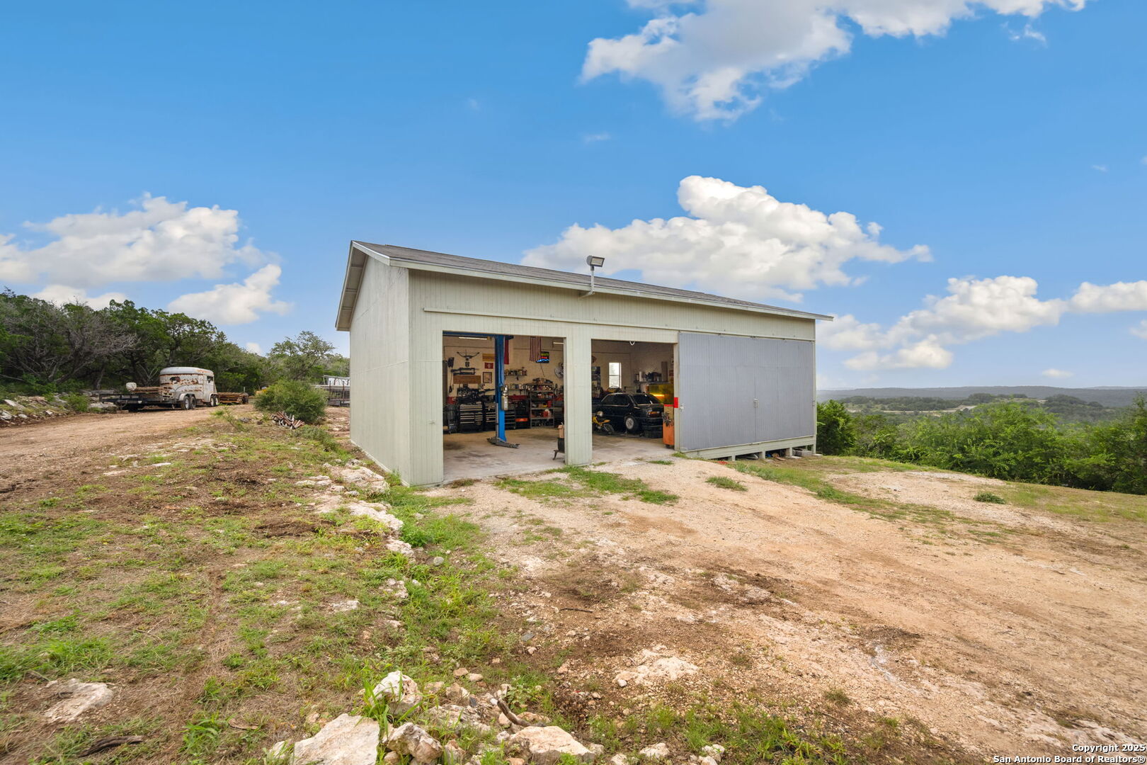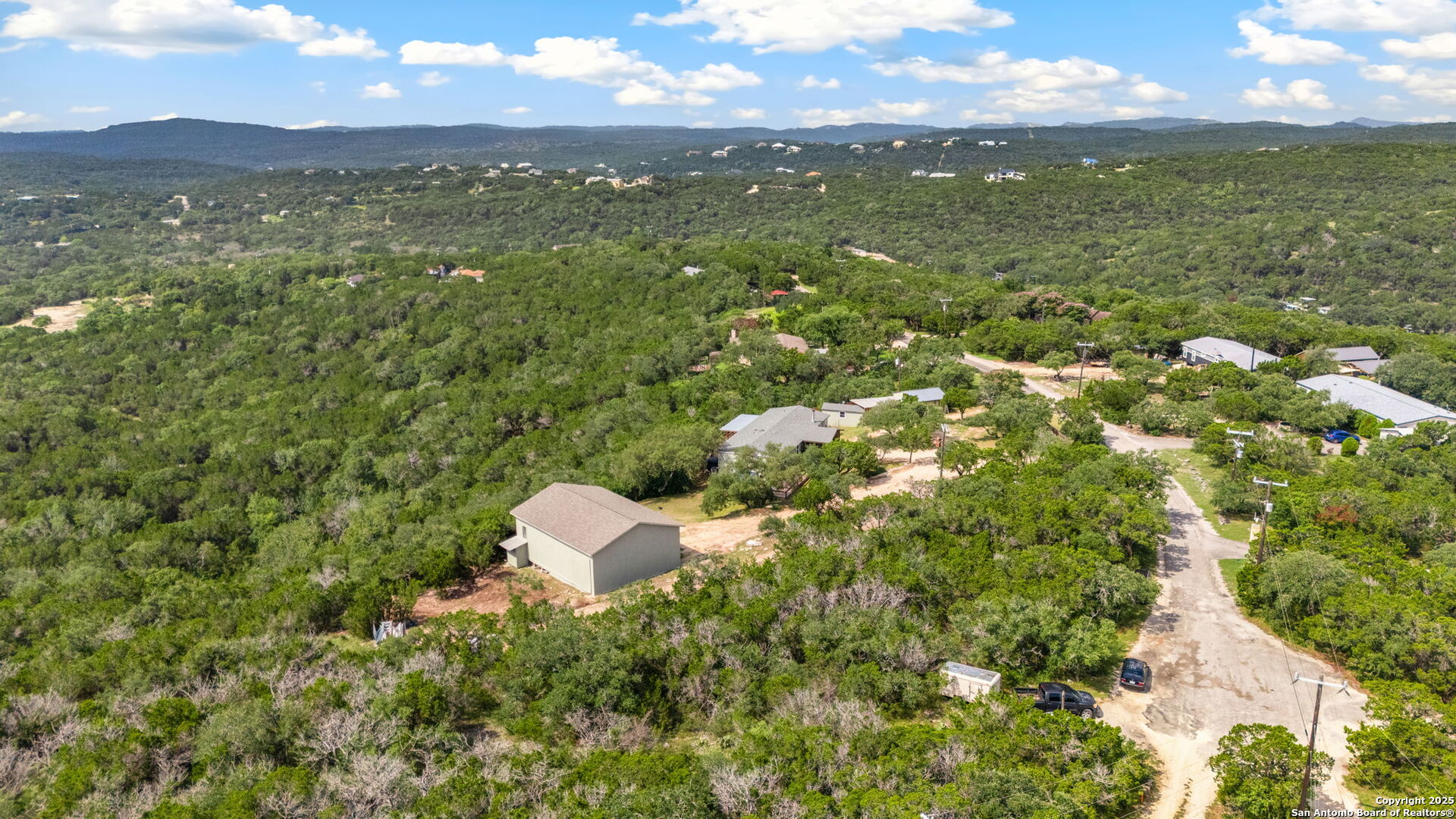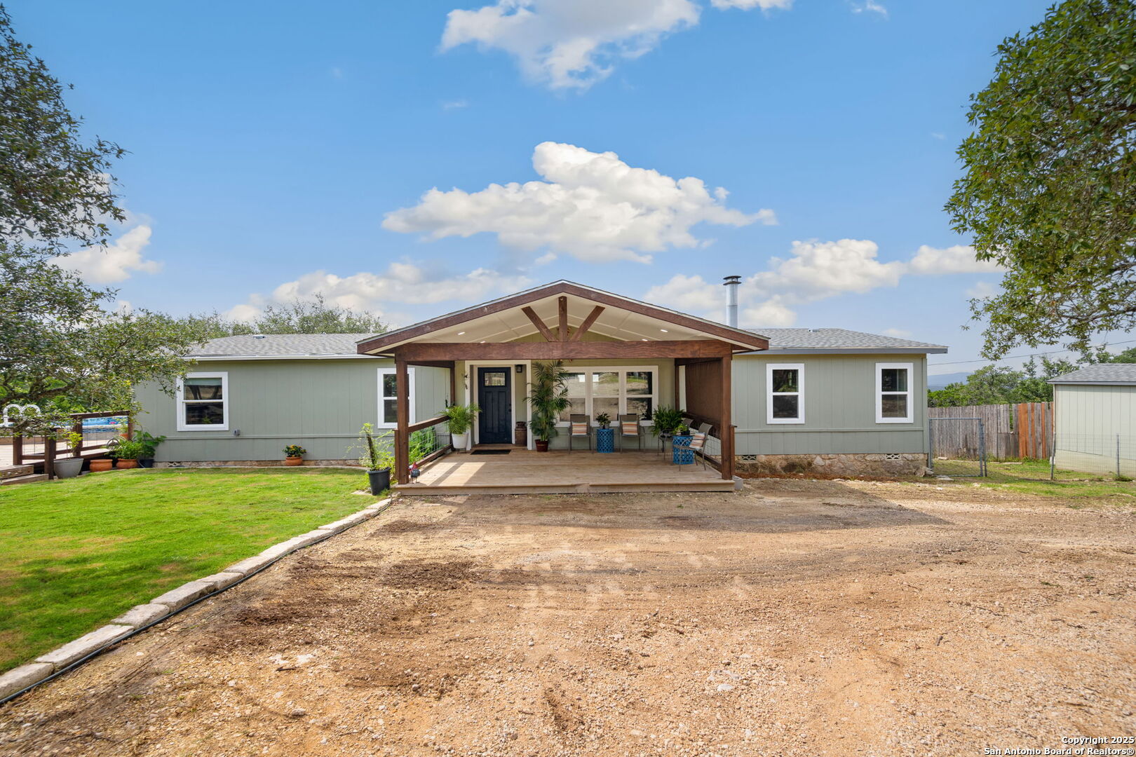 Welcome to a micro homesteader's dream in the Texas Hill Country. Set on 2.2 acres inside the gated community of Big Valley, just a short drive from Helotes, Lakehills, Bandera, and Boerne, this peaceful property offers the perfect blend of sustainable living and comfort. The 4-bedroom, 2.5-bath home sits perched to capture stunning views from a sprawling back deck-partially covered and perfect for sunrise coffee or evening wind-downs. Enjoy the serene Hill Country landscape from your above-ground pool with a wraparound deck, or tend to the raised garden beds, safely fenced to protect your harvest. Bring your animals-there's a chicken coop ready for fresh eggs and two sheds for all your storage needs. A massive detached workshop with oversized sliding doors offers endless possibilities for hobbies, projects, or business use. Inside, the home has been thoughtfully updated with durable laminate plank flooring throughout, recessed lighting, freshly painted interiors, and bathrooms that blend rustic touches with modern style. The kitchen features an updated solid-surface countertop and a stunning custom live-edge wood bar that opens into the living area-ideal for hosting or quiet nights at home. Additional highlights include a large rainwater catchment system, electric gate entry, and an incredible covered front porch with cedar accents-welcoming and warm year-round. Located in the Northside ISD district but far enough out to enjoy starry skies, this property offers a rare opportunity to live simply, grow your own food, and unplug-without giving up access to town. The sellers have priced this one with intention-making sustainable Hill Country living truly attainable for those who've been dreaming of space, chickens, gardens, and fresh air.