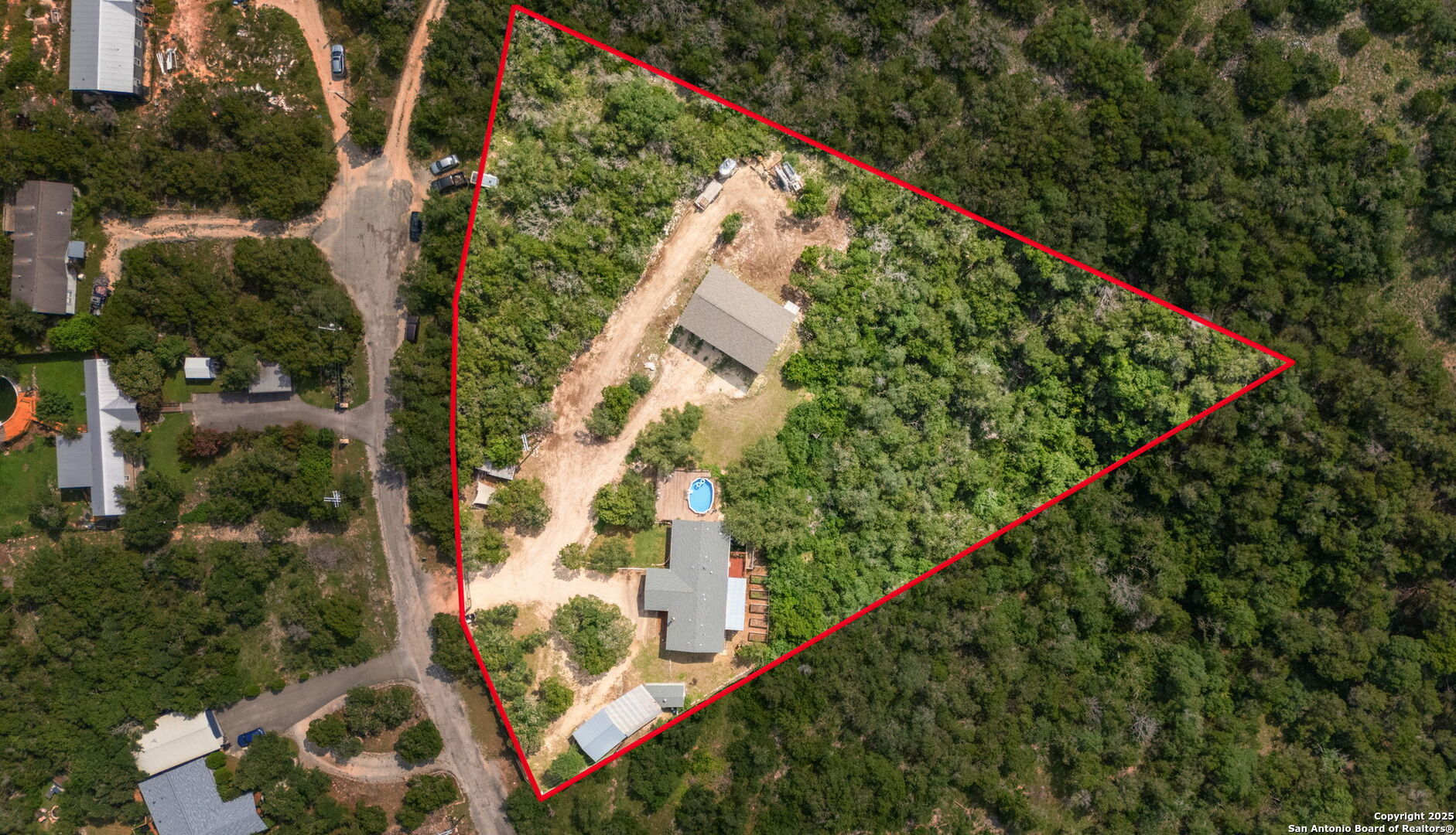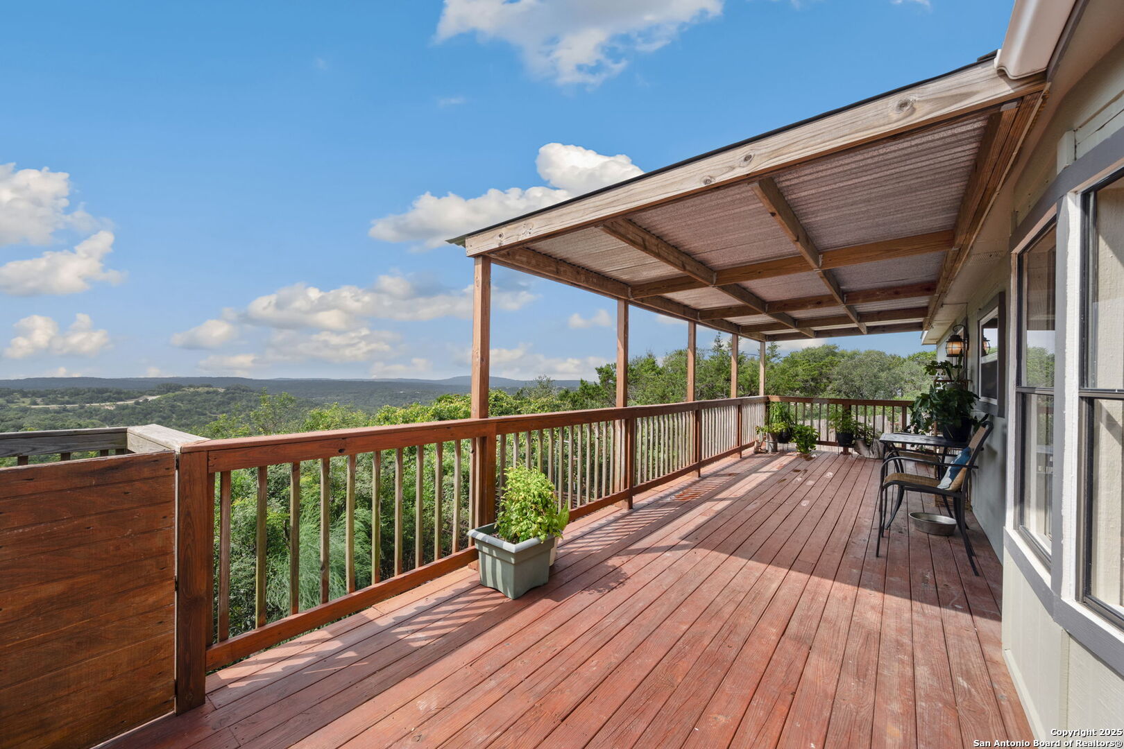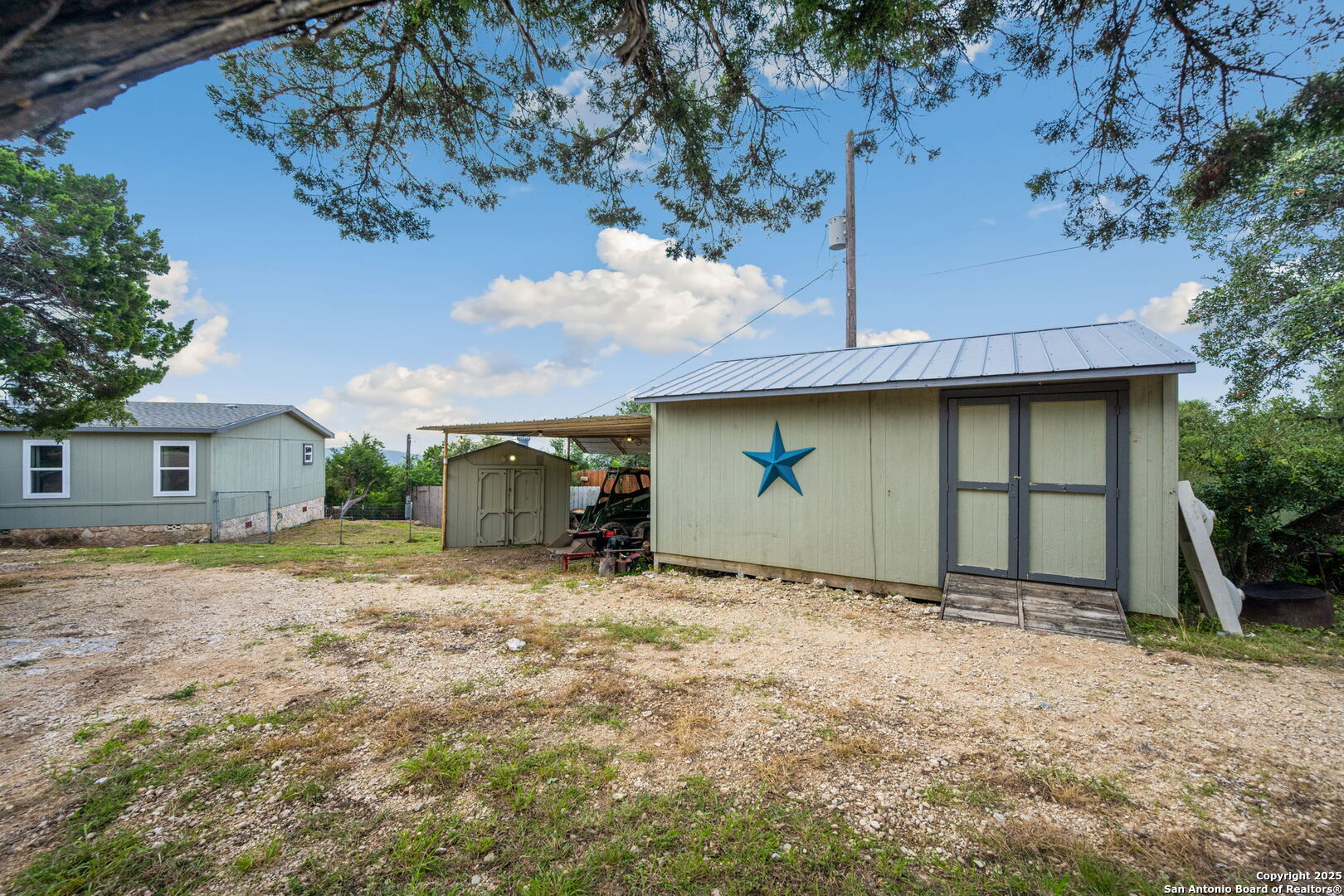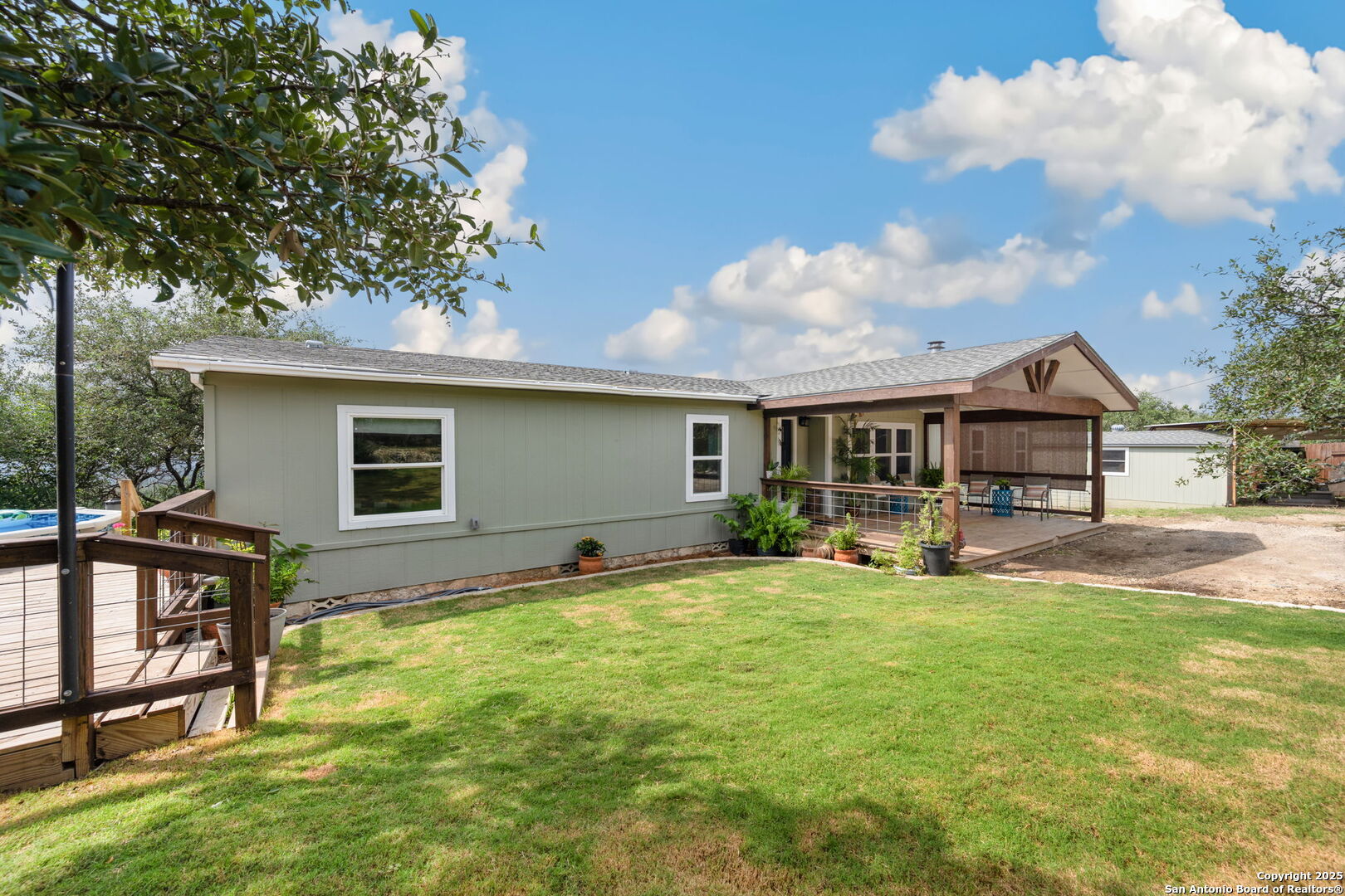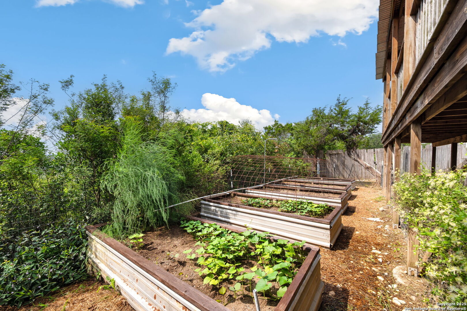 Welcome to a micro homesteader's dream in the Texas Hill Country. Set on 2.2 acres inside the gated community of Big Valley, just a short drive from Helotes, Lakehills, Bandera, and Boerne, this peaceful property offers the perfect blend of sustainable living and comfort. The 4-bedroom, 2.5-bath home sits perched to capture stunning views from a sprawling back deck-partially covered and perfect for sunrise coffee or evening wind-downs. Enjoy the serene Hill Country landscape from your above-ground pool with a wraparound deck, or tend to the raised garden beds, safely fenced to protect your harvest. Bring your animals-there's a chicken coop ready for fresh eggs and two sheds for all your storage needs. A massive detached workshop with oversized sliding doors offers endless possibilities for hobbies, projects, or business use. Inside, the home has been thoughtfully updated with durable laminate plank flooring throughout, recessed lighting, freshly painted interiors, and bathrooms that blend rustic touches with modern style. The kitchen features an updated solid-surface countertop and a stunning custom live-edge wood bar that opens into the living area-ideal for hosting or quiet nights at home. Additional highlights include a large rainwater catchment system, electric gate entry, and an incredible covered front porch with cedar accents-welcoming and warm year-round. Located in the Northside ISD district but far enough out to enjoy starry skies, this property offers a rare opportunity to live simply, grow your own food, and unplug-without giving up access to town. The sellers have priced this one with intention-making sustainable Hill Country living truly attainable for those who've been dreaming of space, chickens, gardens, and fresh air.