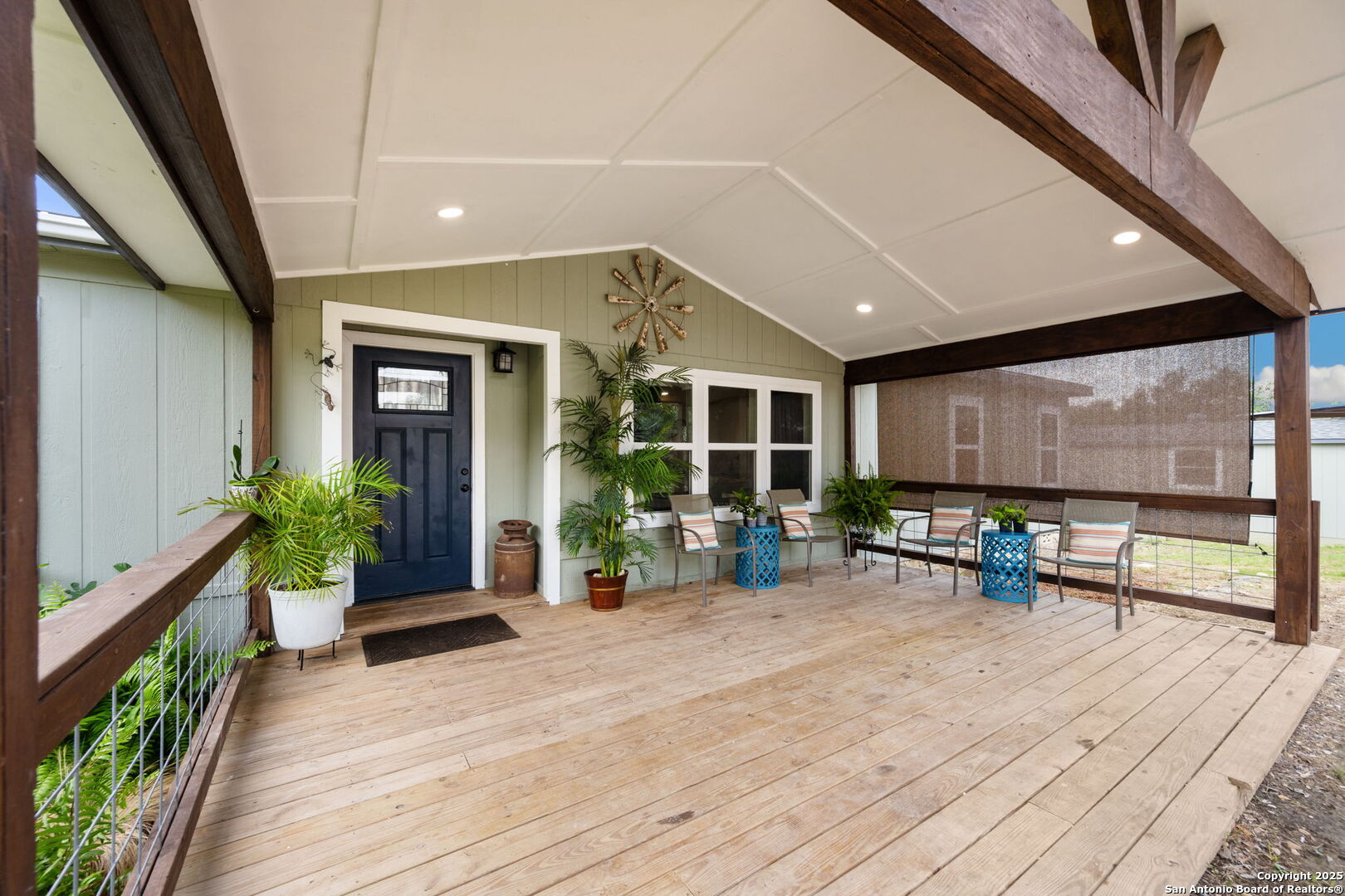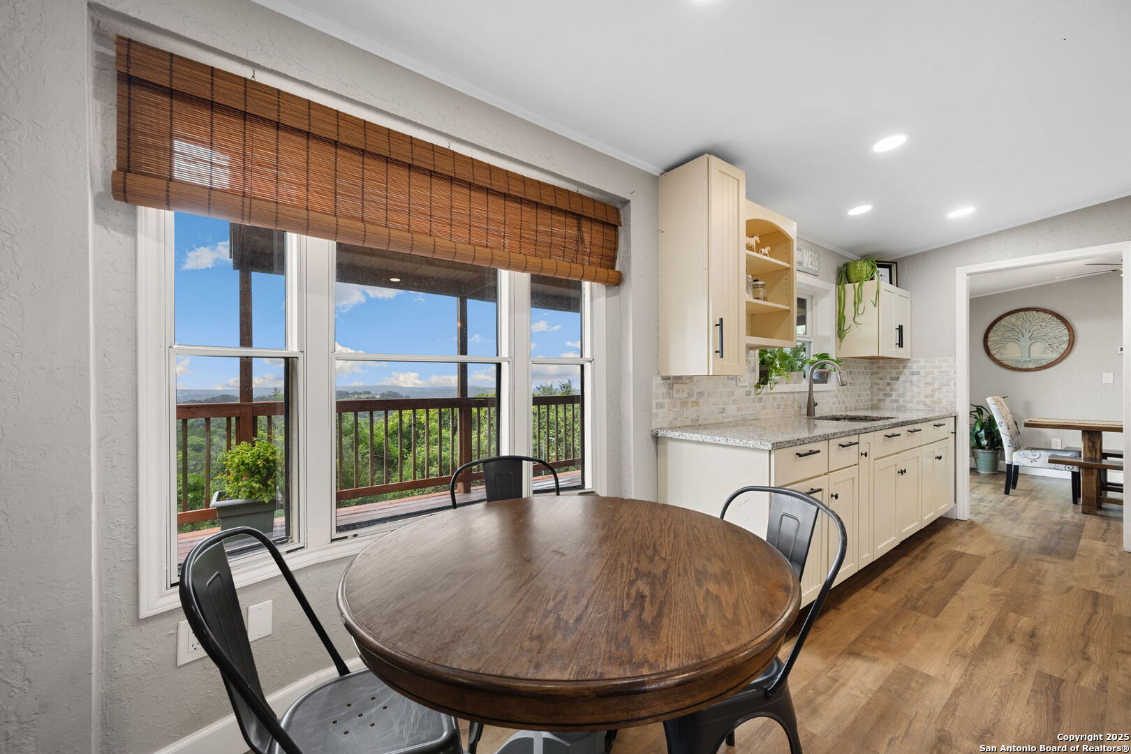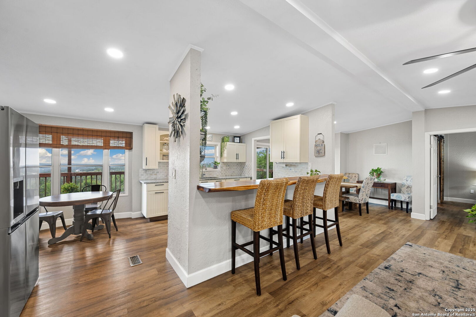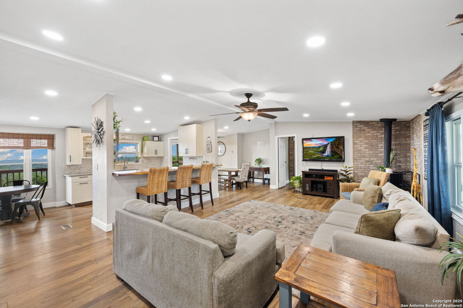 Welcome to a micro homesteader's dream in the Texas Hill Country. Set on 2.2 acres inside the gated community of Big Valley, just a short drive from Helotes, Lakehills, Bandera, and Boerne, this peaceful property offers the perfect blend of sustainable living and comfort. The 4-bedroom, 2.5-bath home sits perched to capture stunning views from a sprawling back deck-partially covered and perfect for sunrise coffee or evening wind-downs. Enjoy the serene Hill Country landscape from your above-ground pool with a wraparound deck, or tend to the raised garden beds, safely fenced to protect your harvest. Bring your animals-there's a chicken coop ready for fresh eggs and two sheds for all your storage needs. A massive detached workshop with oversized sliding doors offers endless possibilities for hobbies, projects, or business use. Inside, the home has been thoughtfully updated with durable laminate plank flooring throughout, recessed lighting, freshly painted interiors, and bathrooms that blend rustic touches with modern style. The kitchen features an updated solid-surface countertop and a stunning custom live-edge wood bar that opens into the living area-ideal for hosting or quiet nights at home. Additional highlights include a large rainwater catchment system, electric gate entry, and an incredible covered front porch with cedar accents-welcoming and warm year-round. Located in the Northside ISD district but far enough out to enjoy starry skies, this property offers a rare opportunity to live simply, grow your own food, and unplug-without giving up access to town. The sellers have priced this one with intention-making sustainable Hill Country living truly attainable for those who've been dreaming of space, chickens, gardens, and fresh air.