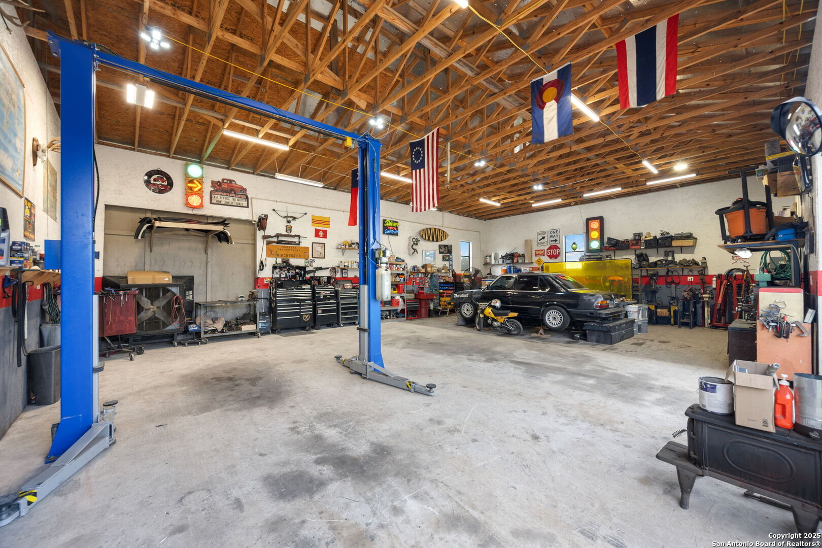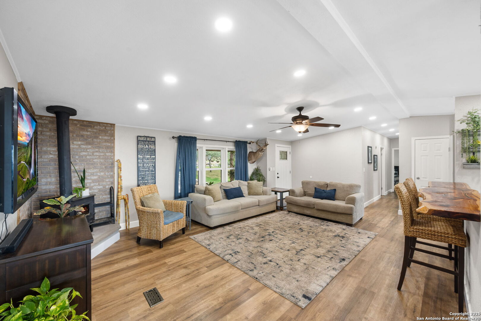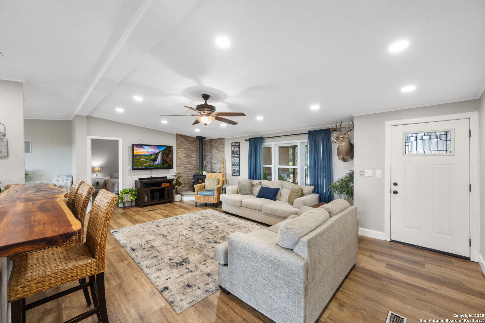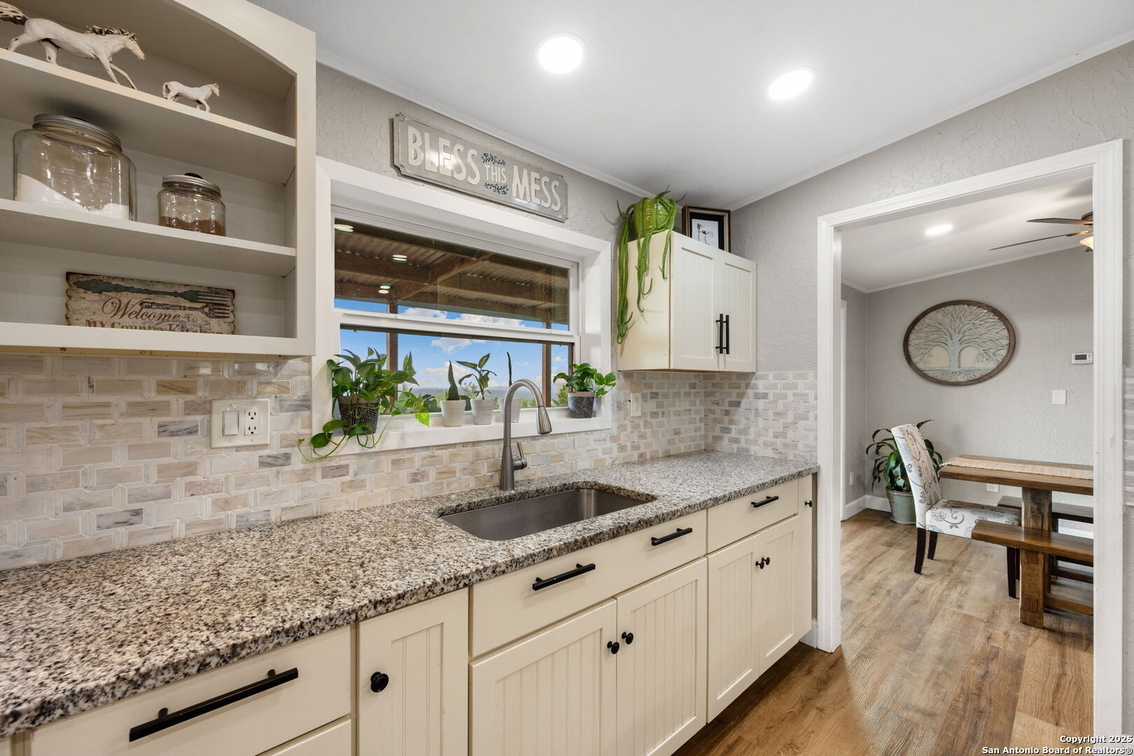 Welcome to a micro homesteader's dream in the Texas Hill Country. Set on 2.2 acres inside the gated community of Big Valley, just a short drive from Helotes, Lakehills, Bandera, and Boerne, this peaceful property offers the perfect blend of sustainable living and comfort. The 4-bedroom, 2.5-bath home sits perched to capture stunning views from a sprawling back deck-partially covered and perfect for sunrise coffee or evening wind-downs. Enjoy the serene Hill Country landscape from your above-ground pool with a wraparound deck, or tend to the raised garden beds, safely fenced to protect your harvest. Bring your animals-there's a chicken coop ready for fresh eggs and two sheds for all your storage needs. A massive detached workshop with oversized sliding doors offers endless possibilities for hobbies, projects, or business use. Inside, the home has been thoughtfully updated with durable laminate plank flooring throughout, recessed lighting, freshly painted interiors, and bathrooms that blend rustic touches with modern style. The kitchen features an updated solid-surface countertop and a stunning custom live-edge wood bar that opens into the living area-ideal for hosting or quiet nights at home. Additional highlights include a large rainwater catchment system, electric gate entry, and an incredible covered front porch with cedar accents-welcoming and warm year-round. Located in the Northside ISD district but far enough out to enjoy starry skies, this property offers a rare opportunity to live simply, grow your own food, and unplug-without giving up access to town. The sellers have priced this one with intention-making sustainable Hill Country living truly attainable for those who've been dreaming of space, chickens, gardens, and fresh air.